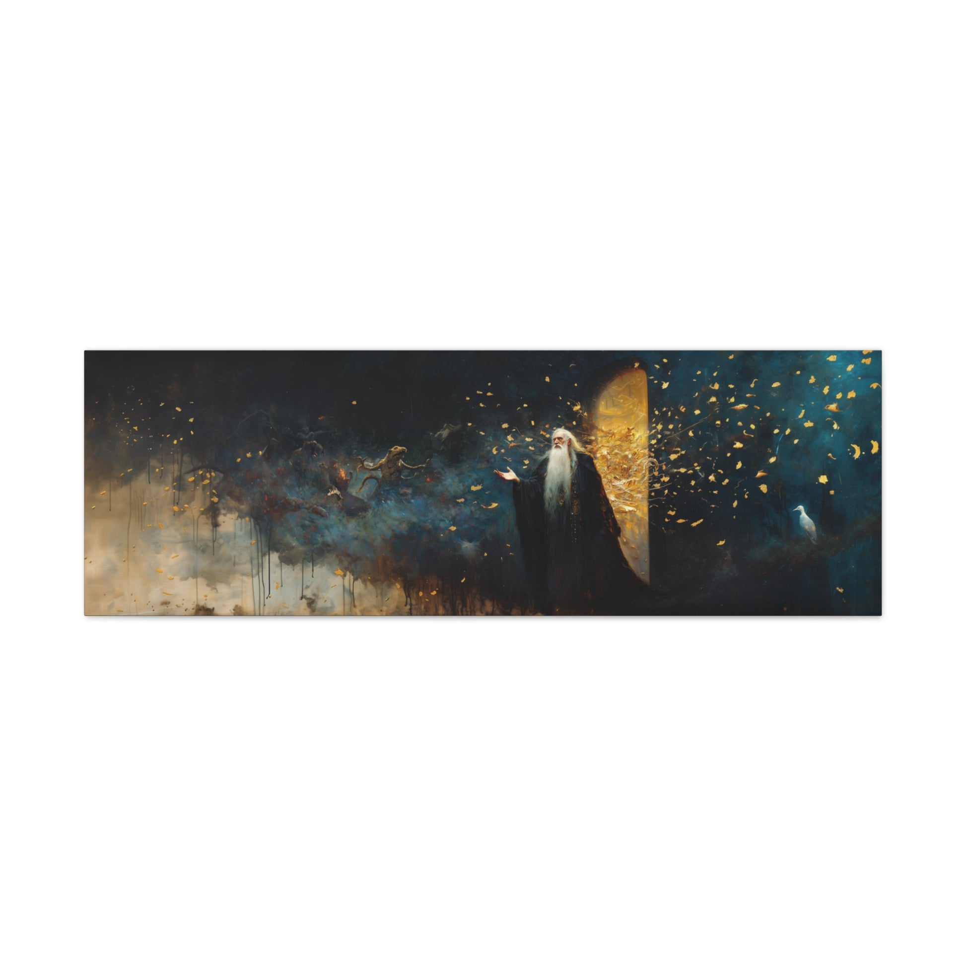 Amidst swirling shadows and golden whispers, an ancient figure beckons from a glowing threshold. This enigmatic gateway invites you to ponder the mysteries of time, where every leaf is a secret waiting to unfold.