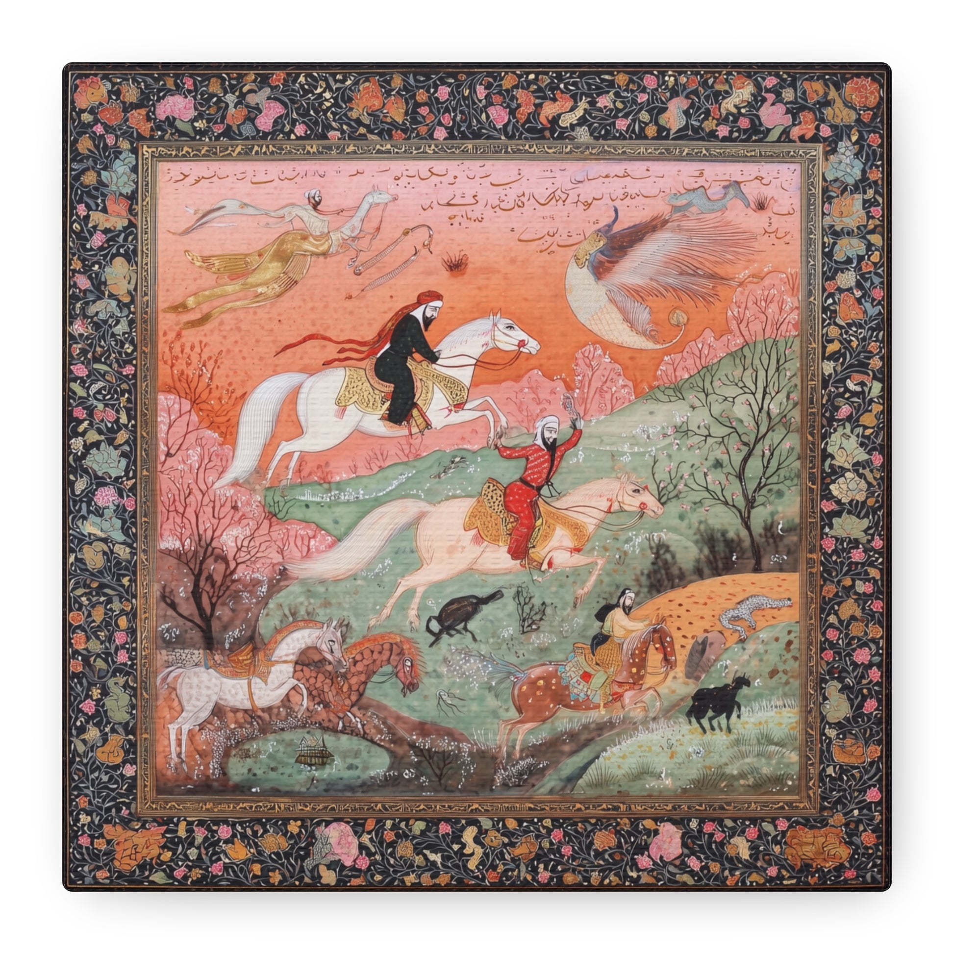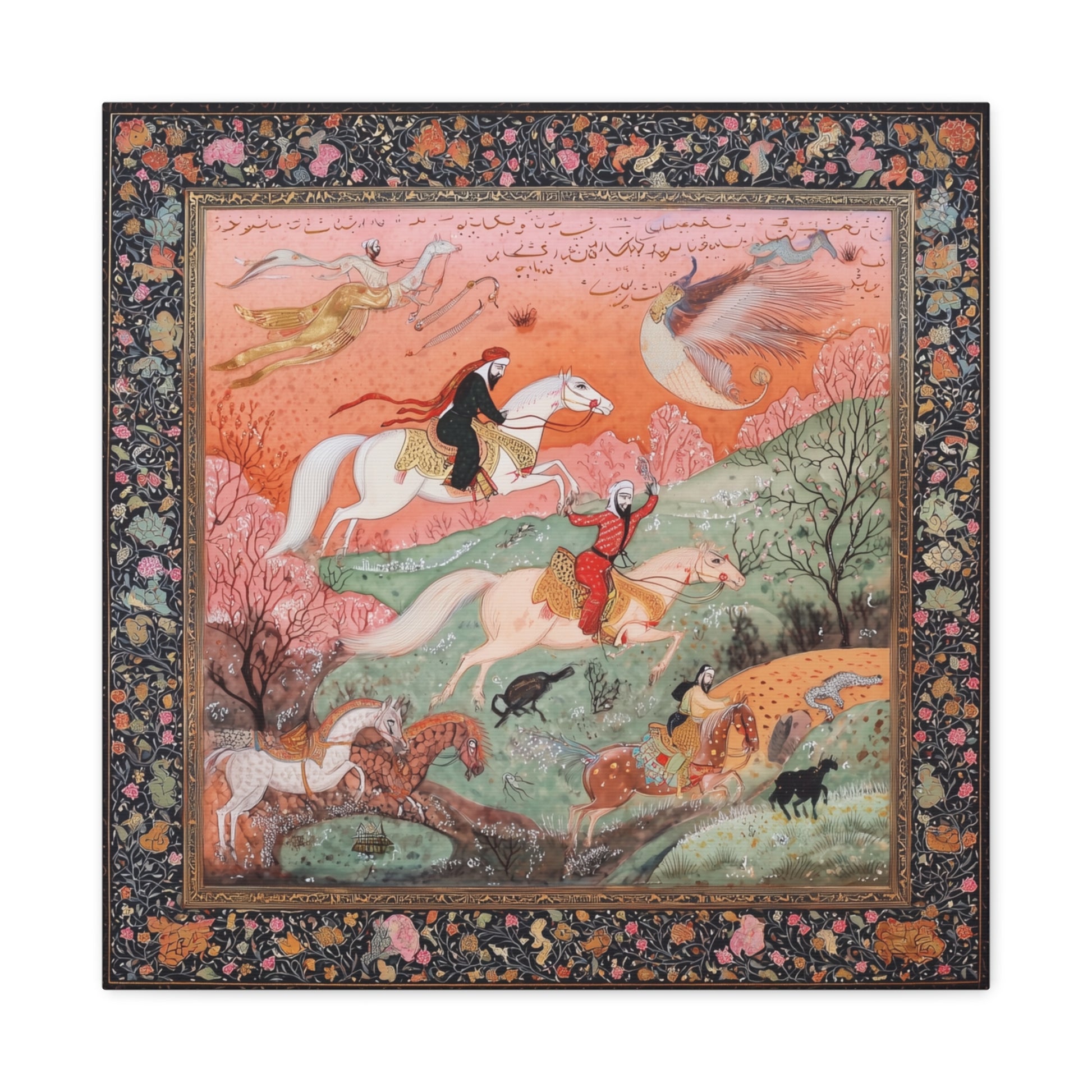 In a world where whispers of the past embrace the vibrant hues of the dawn, riders traverse a dreamscape painted with ethereal grace. The scene pulses with life, inviting a journey beyond the visible.
