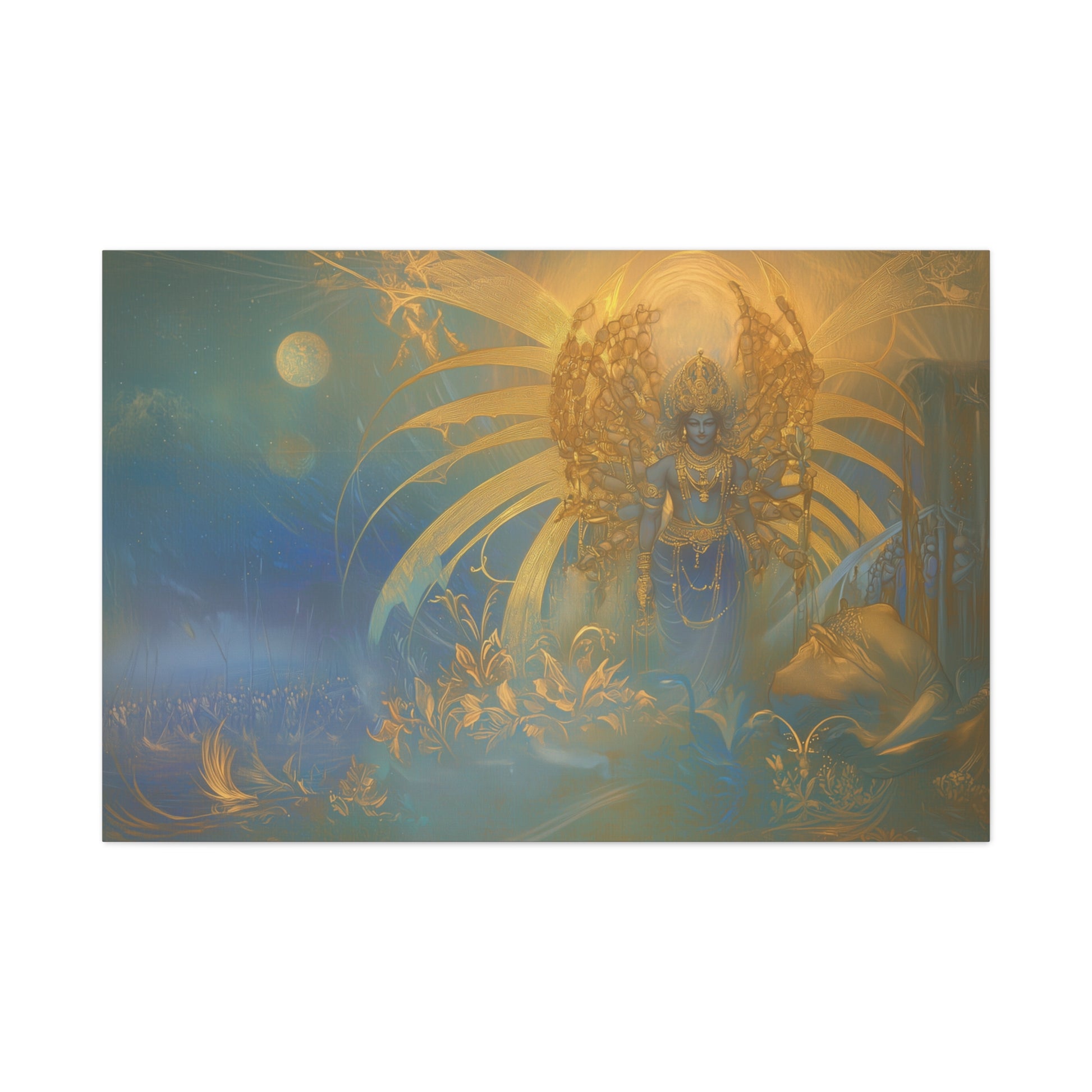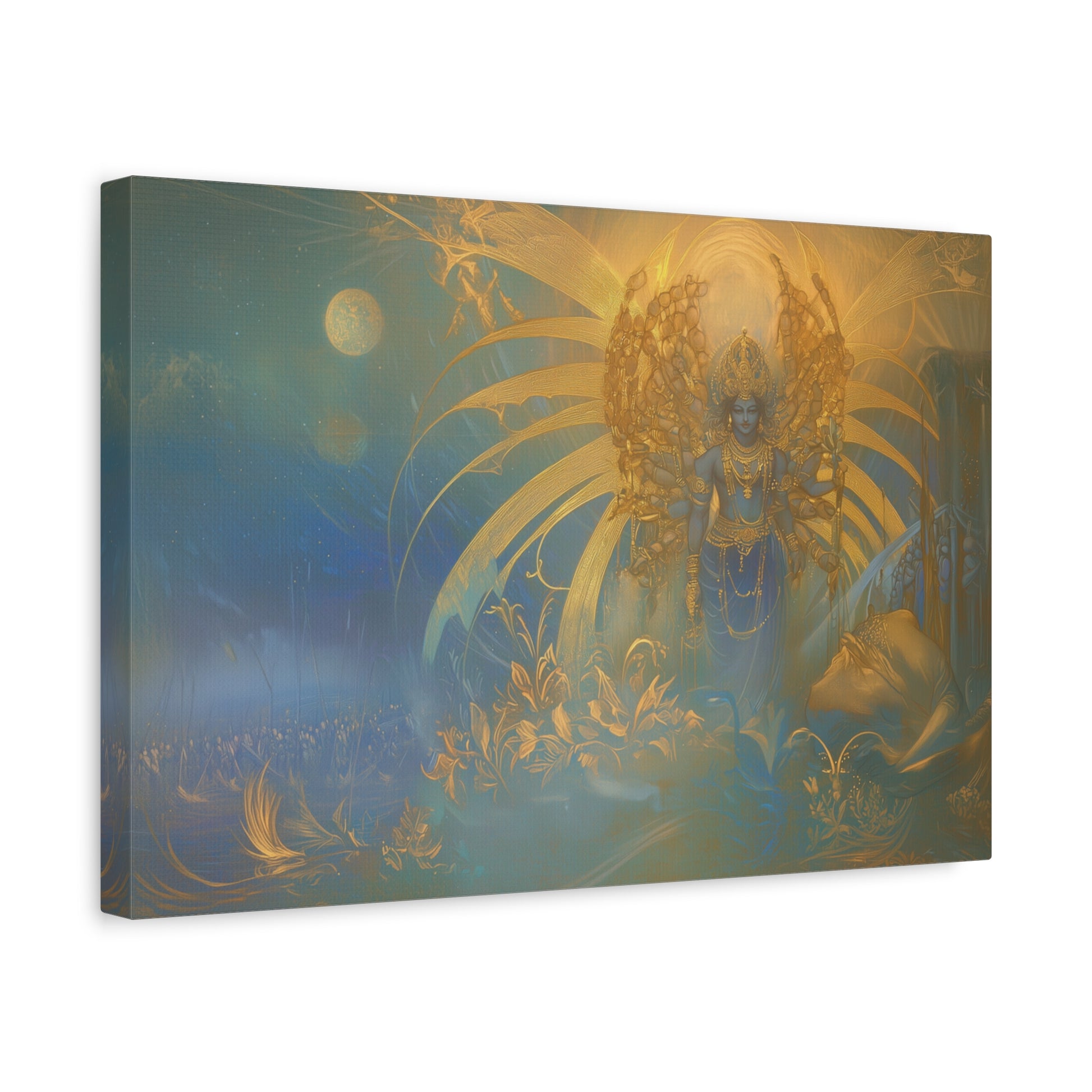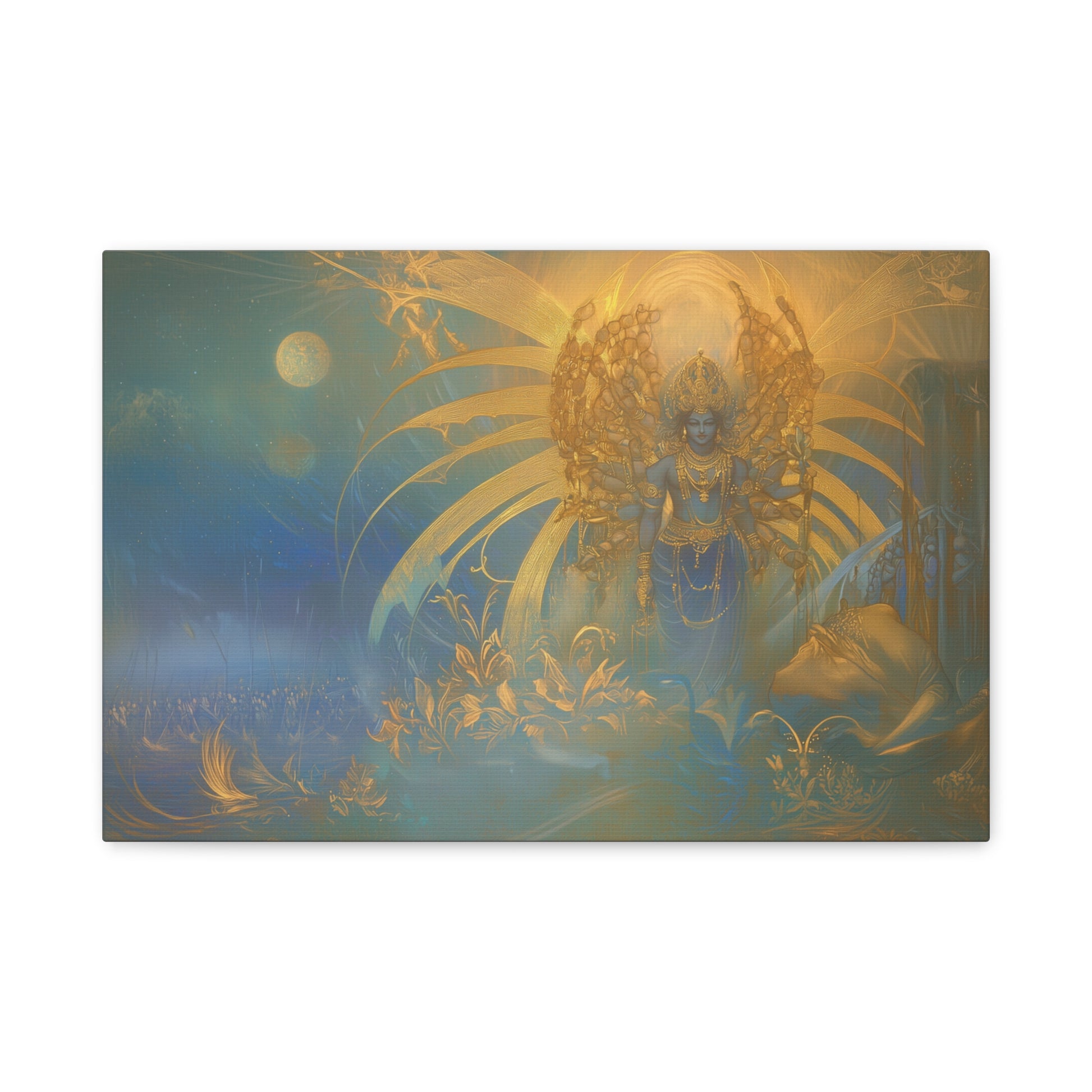Bathed in ethereal glow, the divine figure stands amidst a cosmic tapestry, weaving dreams into the fabric of the universe. The golden aura radiates serenity, inviting contemplation of the eternal dance of light and shadow.