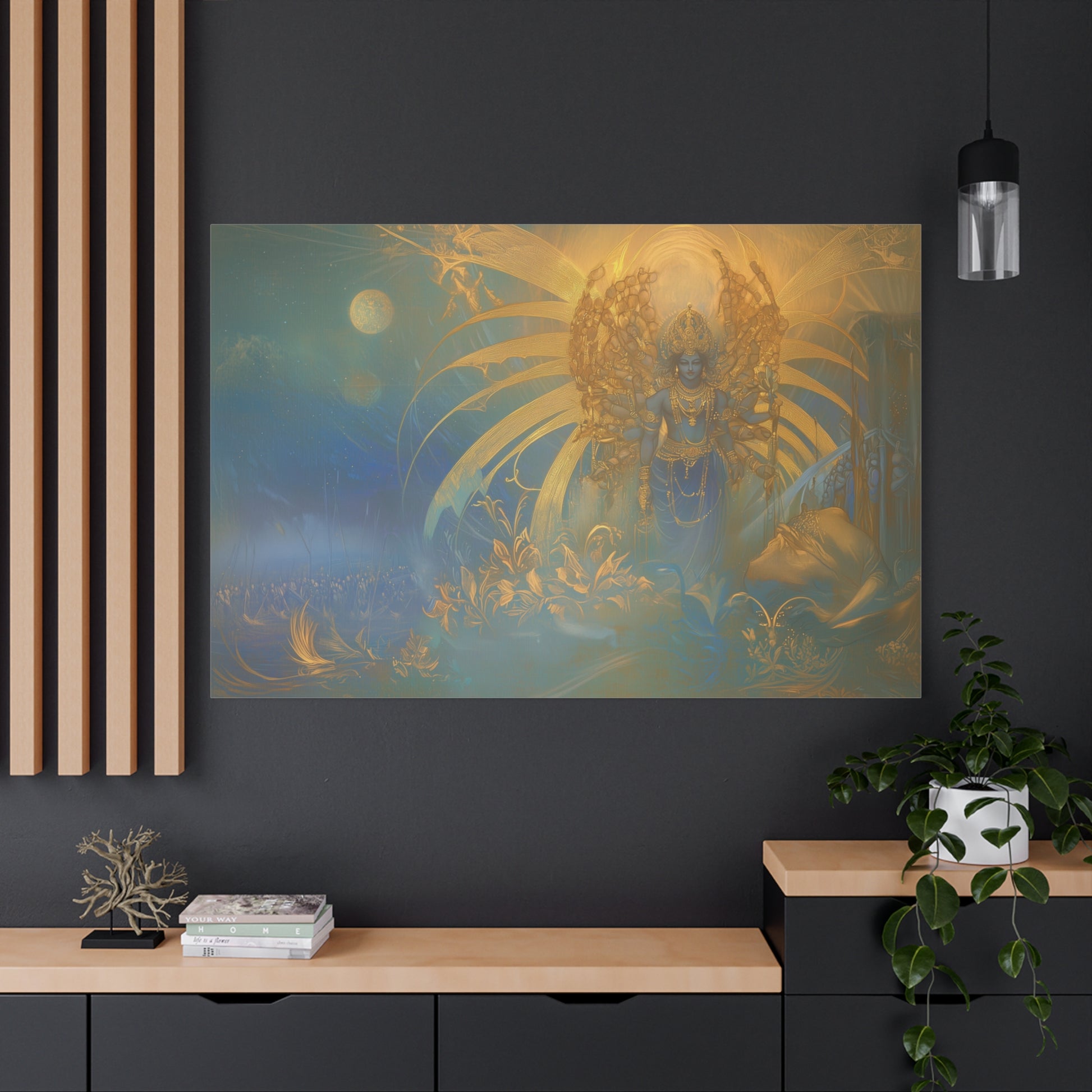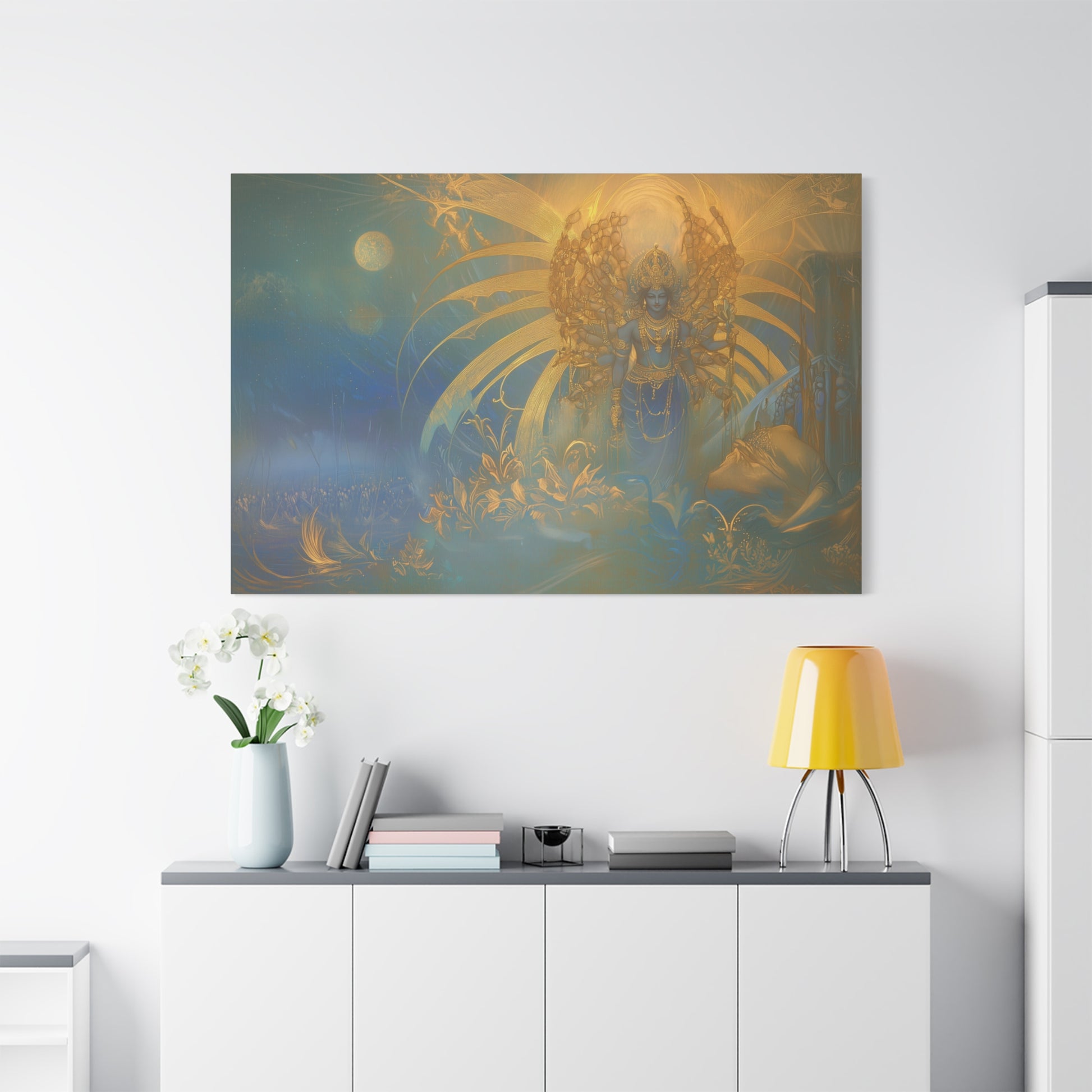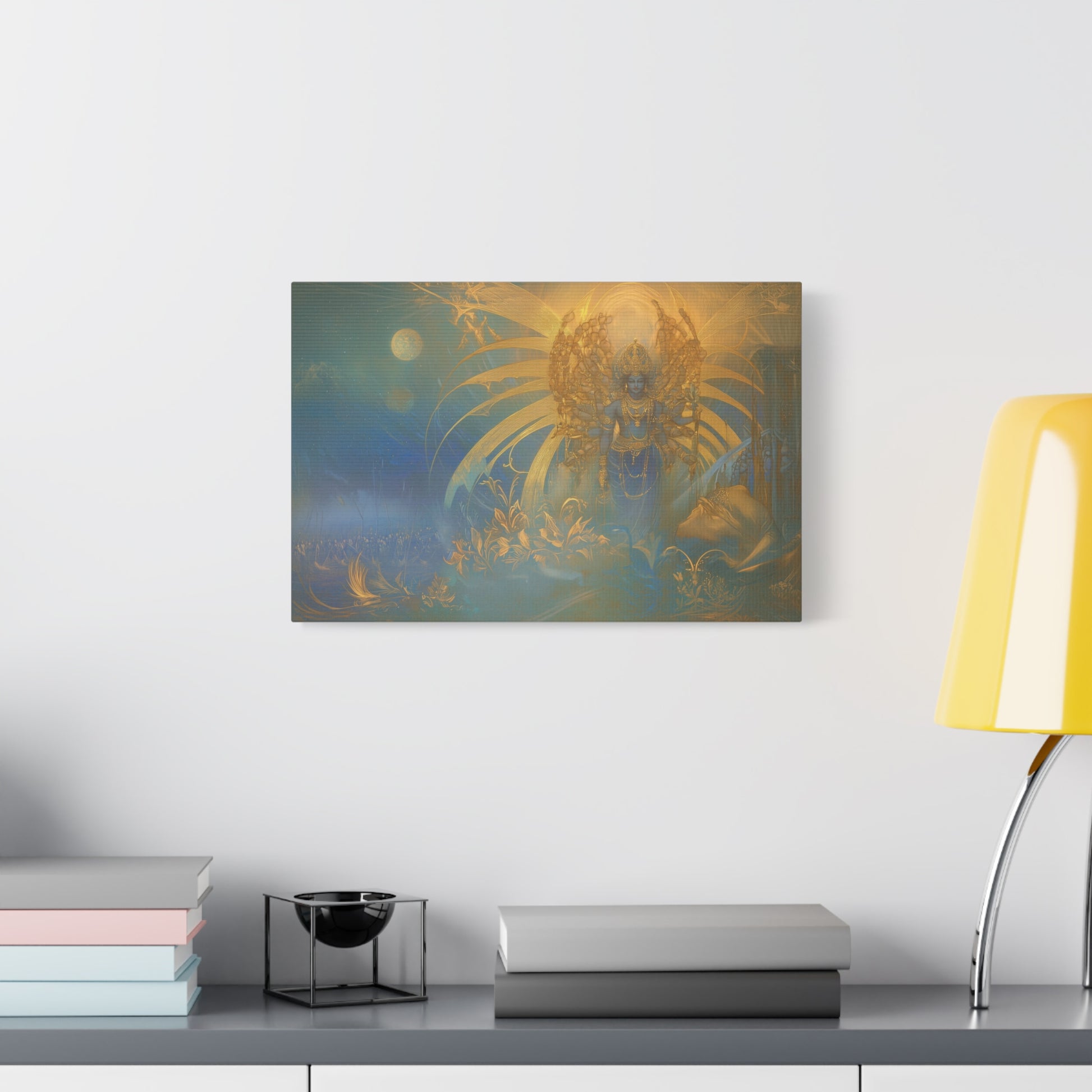 Bathed in ethereal glow, the divine figure stands amidst a cosmic tapestry, weaving dreams into the fabric of the universe. The golden aura radiates serenity, inviting contemplation of the eternal dance of light and shadow.