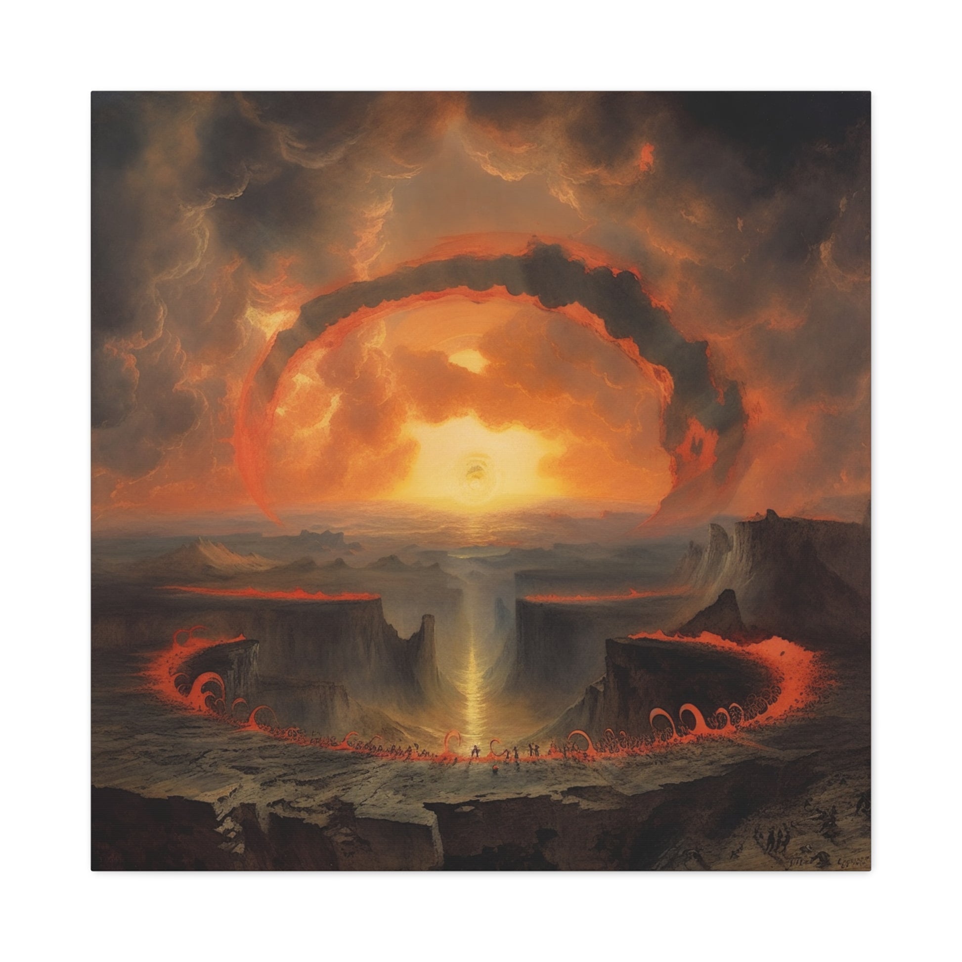 A crimson arc envelops the horizon, where the earth splits and the sky blazes. In this dance of fire and shadow, the world teeters on the brink of revelation and destruction.