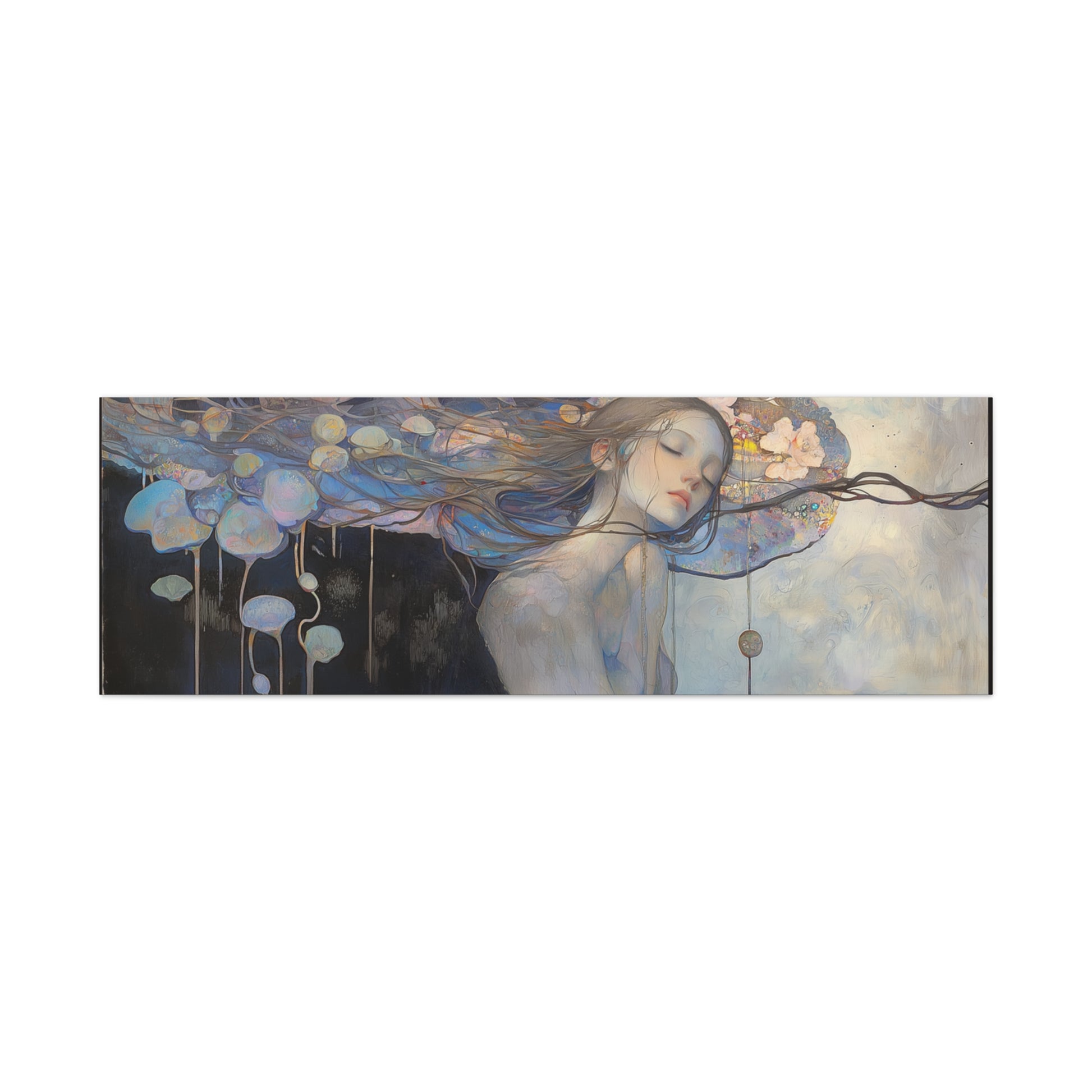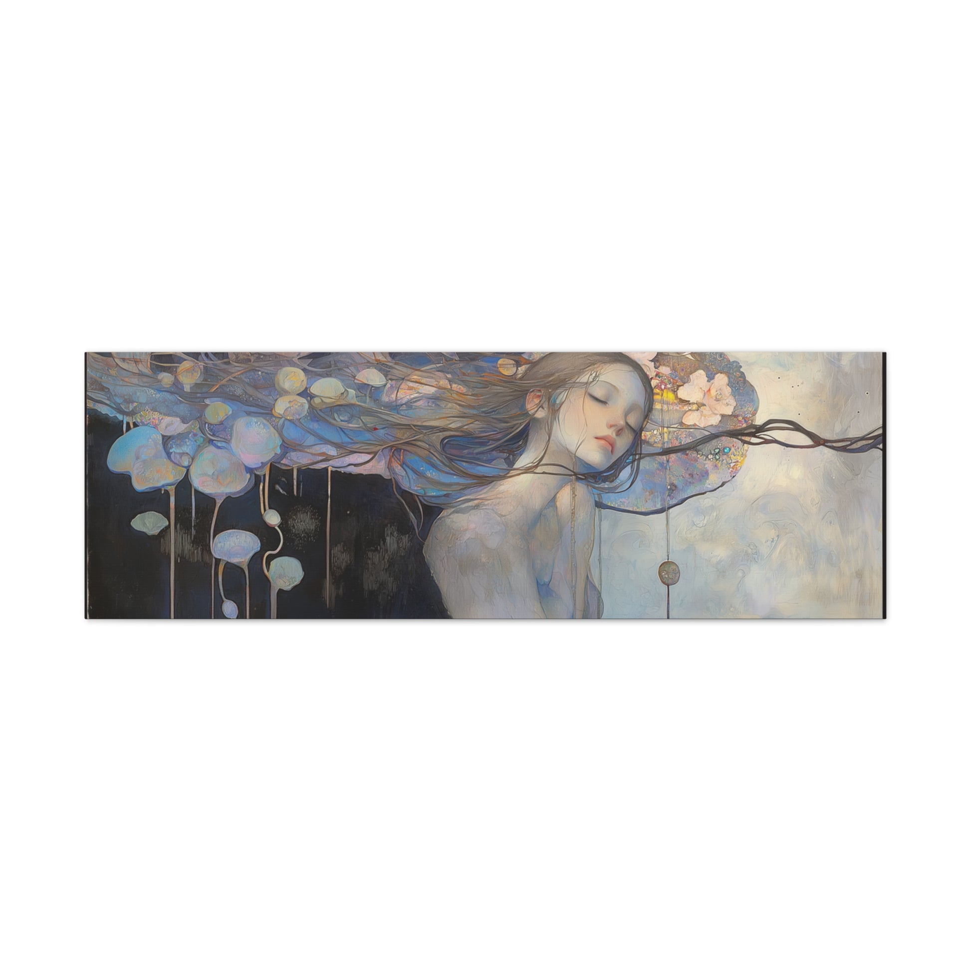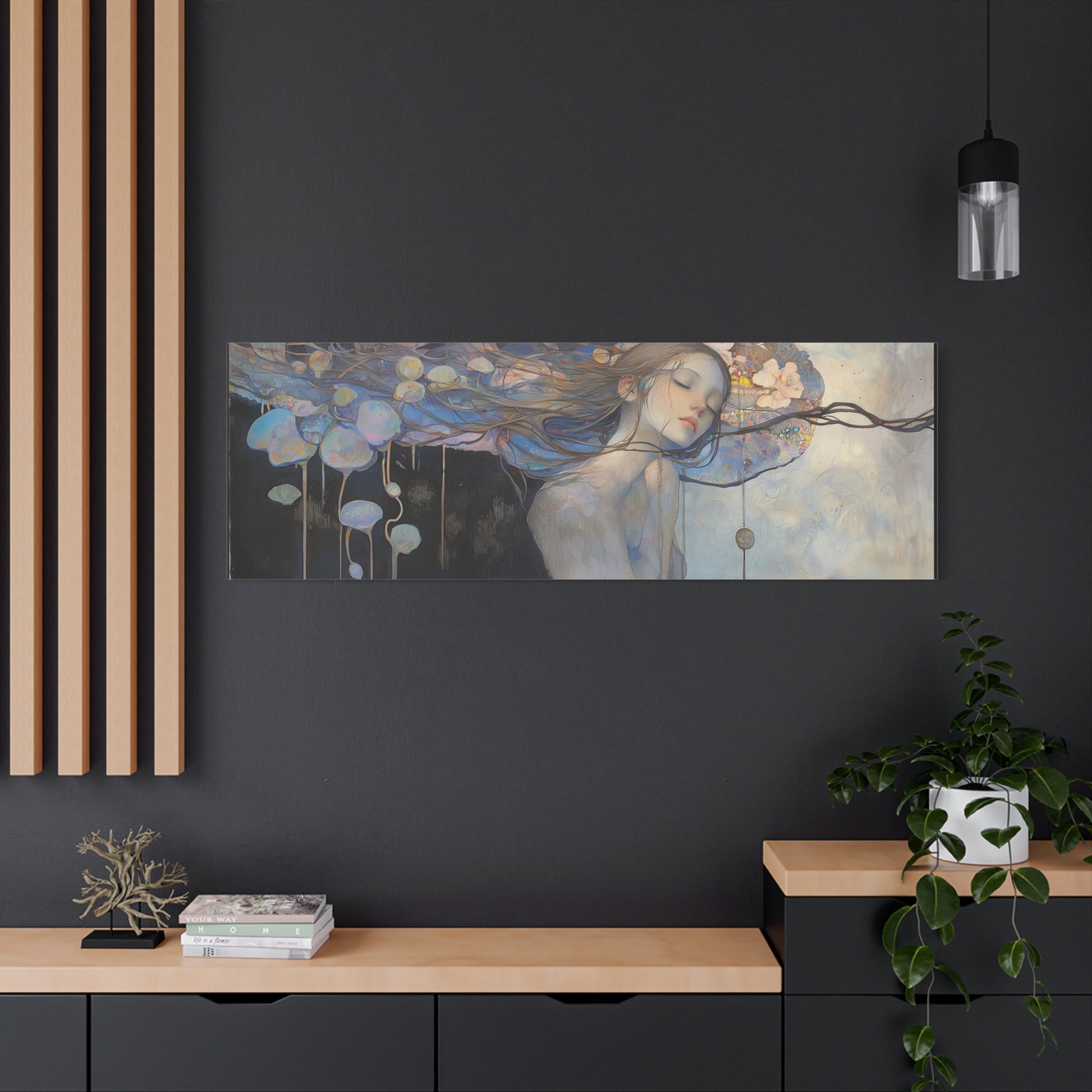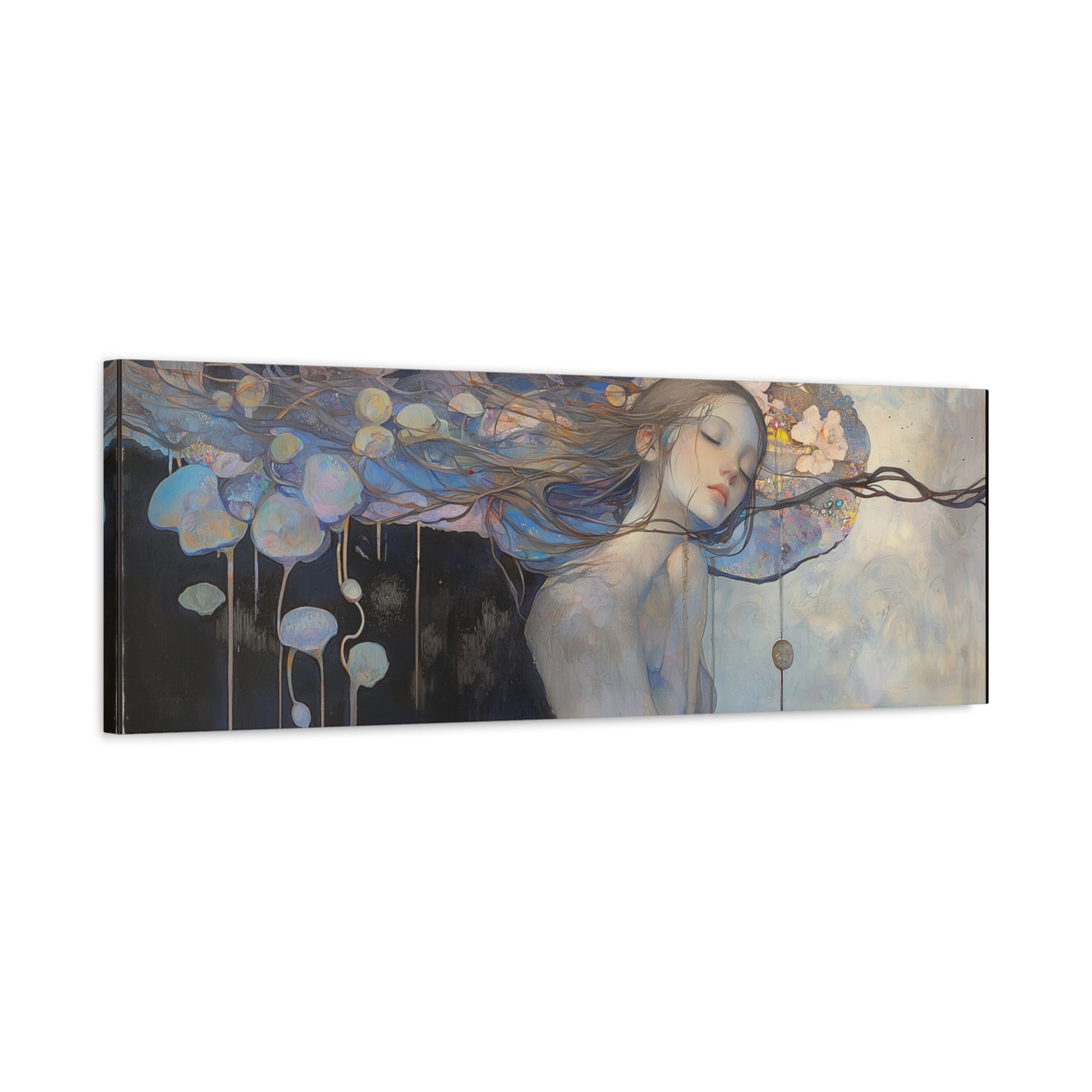 In a tranquil cascade of colors, she floats between realms, her essence woven with cosmic threads. The gentle interplay of light and shadow whispers of dreams untold, inviting the soul to wander and wonder.