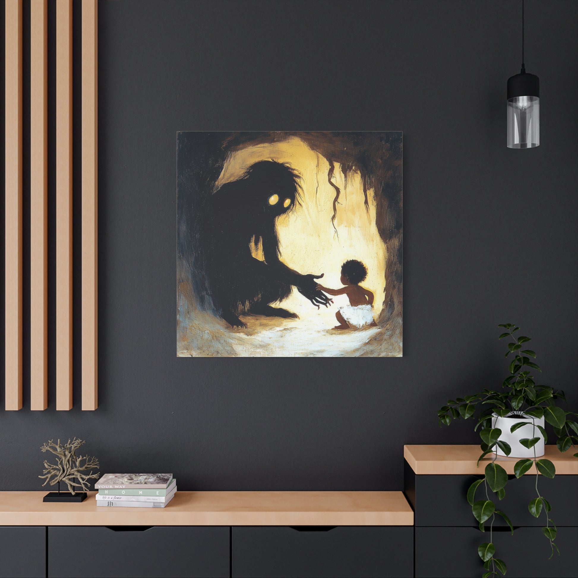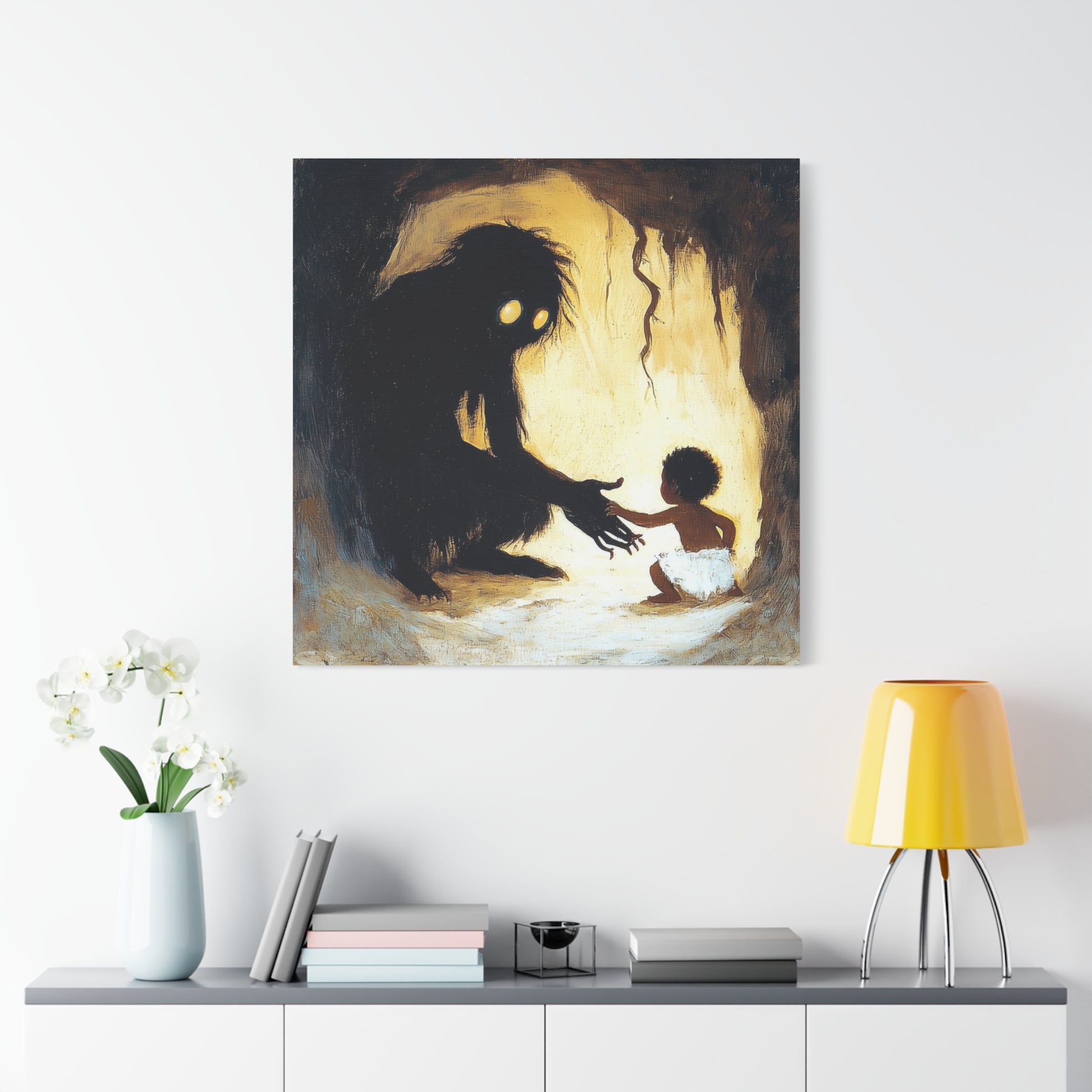 In a luminous cavern, the innocent reaches towards the unknown, where shadows and light entwine in an ethereal dance. An encounter teetering on the edge of fear and wonder, bridging realms unseen.