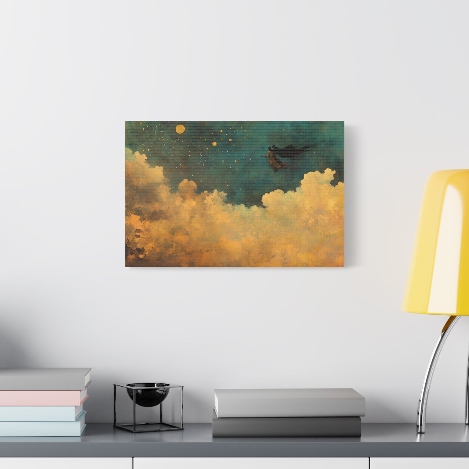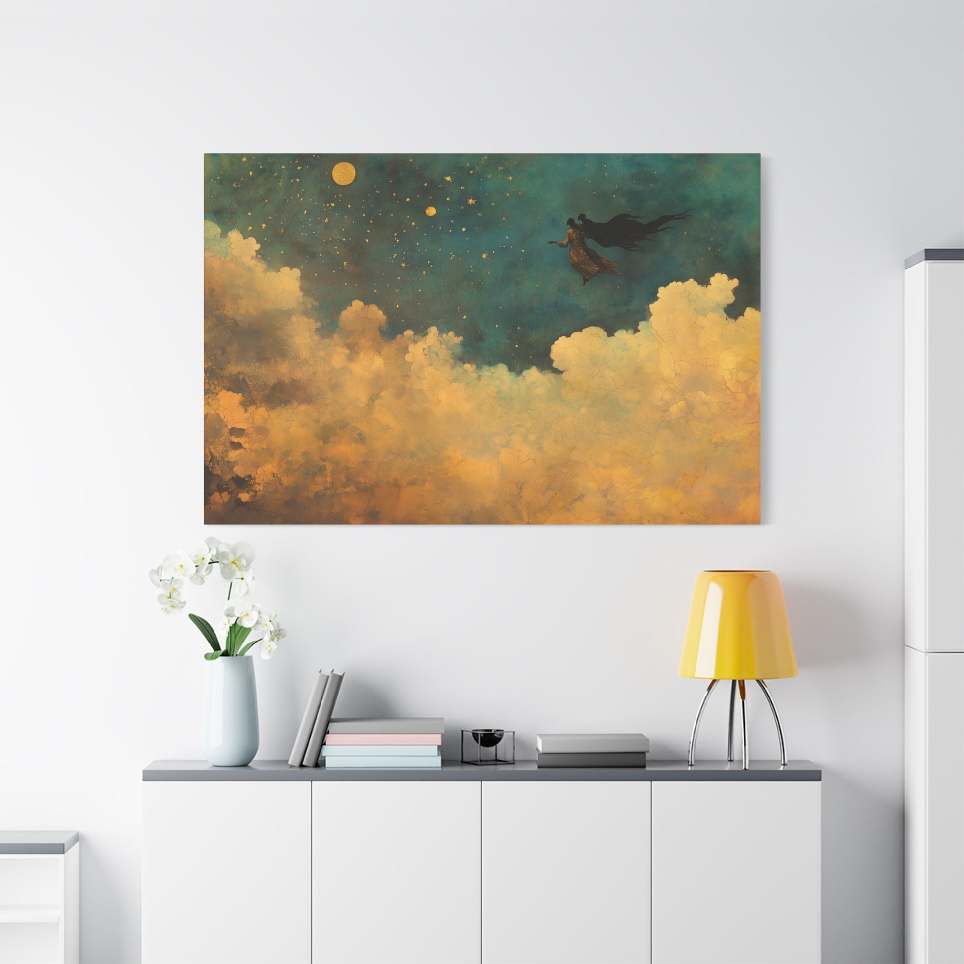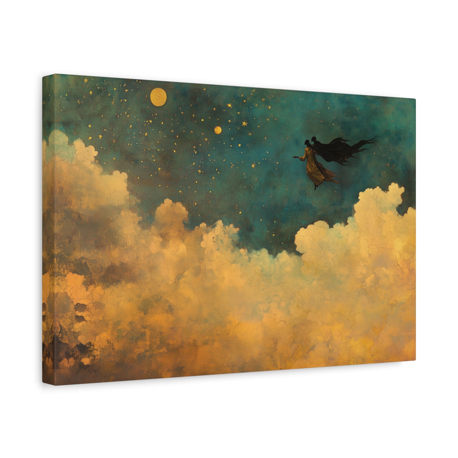 A figure glides through an ocean of stars, whispering secrets to the cosmos. Clouds swirl below, golden in the moon’s embrace, as dreams weave ethereal tapestries in the night’s vast expanse.