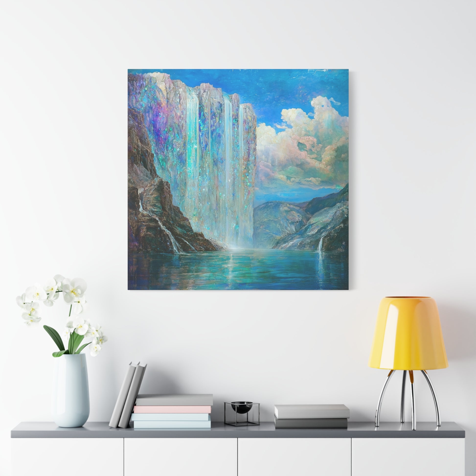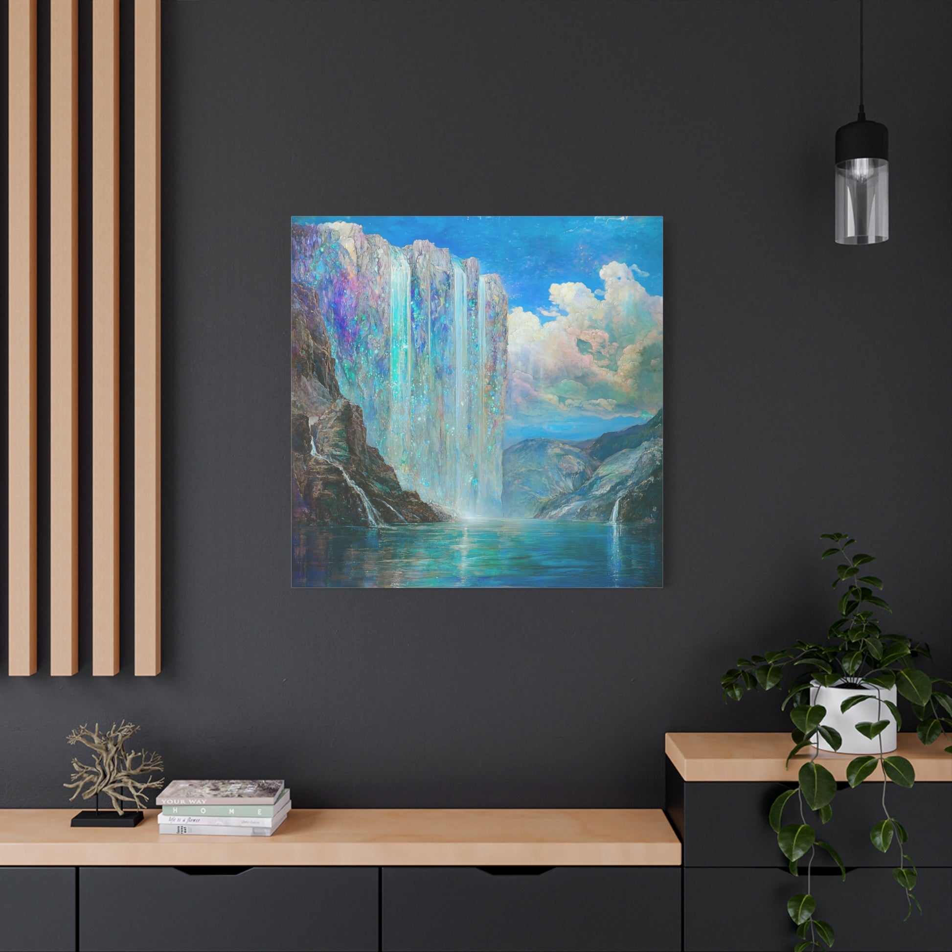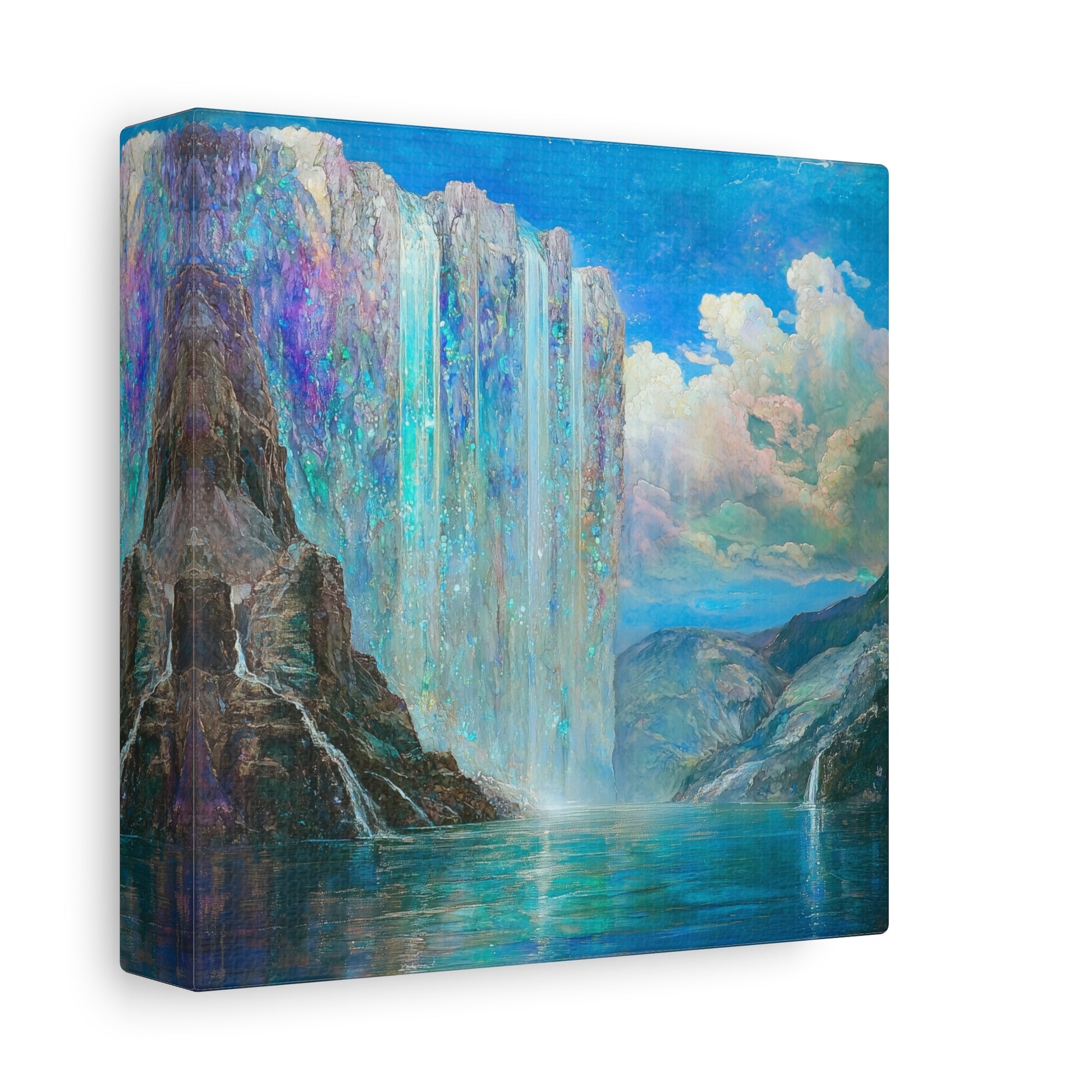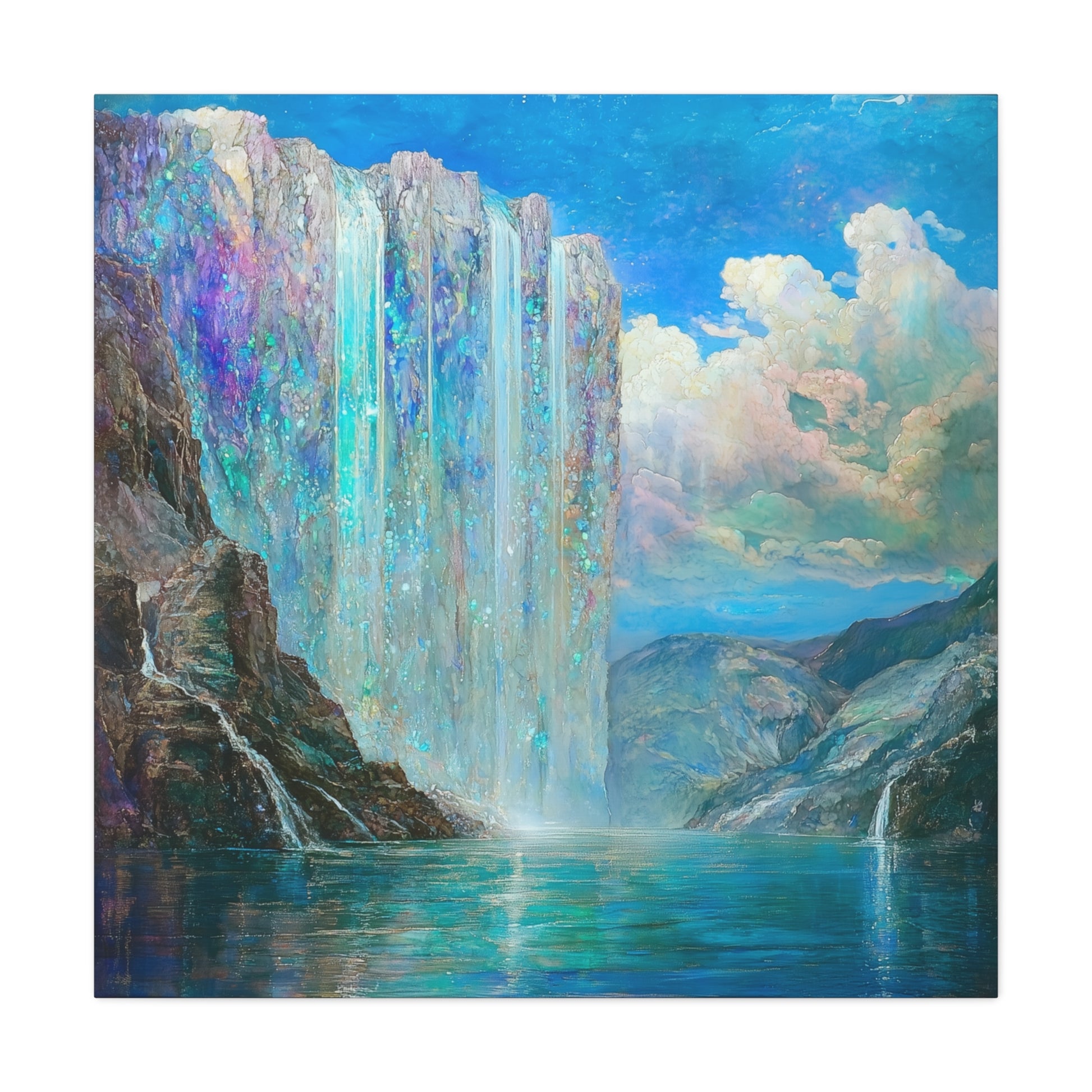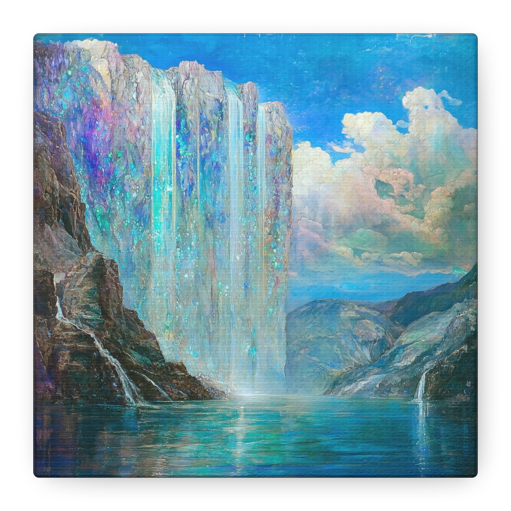 A luminous waterfall descends from the skies, its iridescent streams merging with the tranquil expanse below. Clouds whisper secrets of ancient realms, inviting the soul to wander amidst the serene enchantment of this ethereal sanctuary.