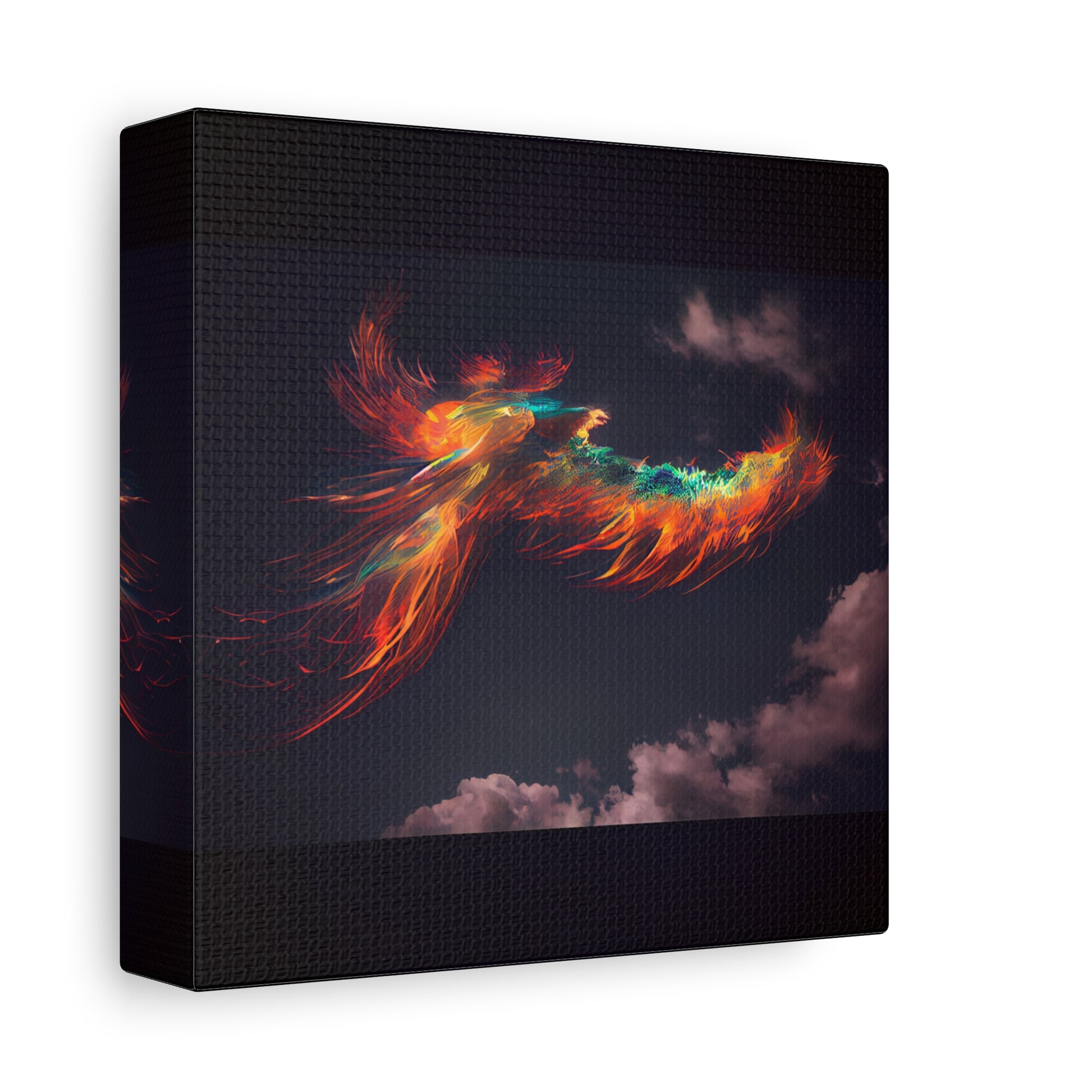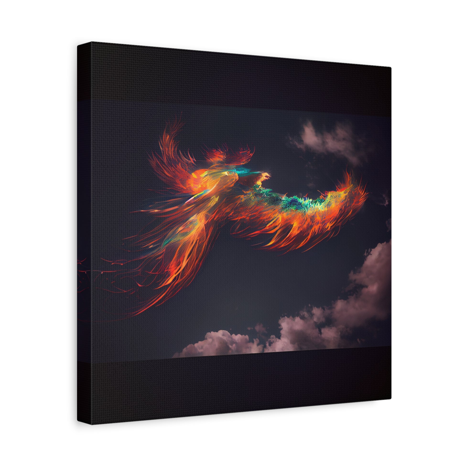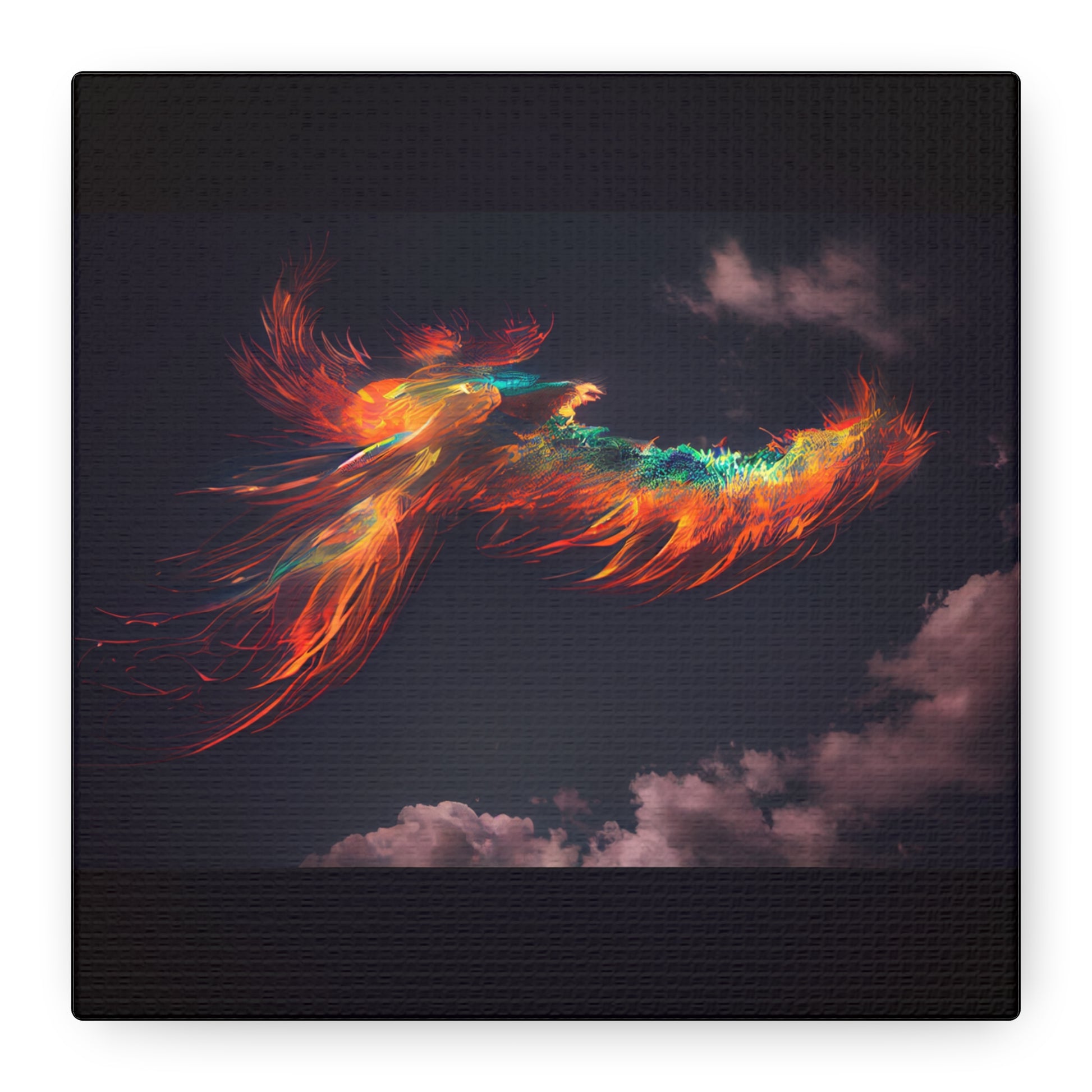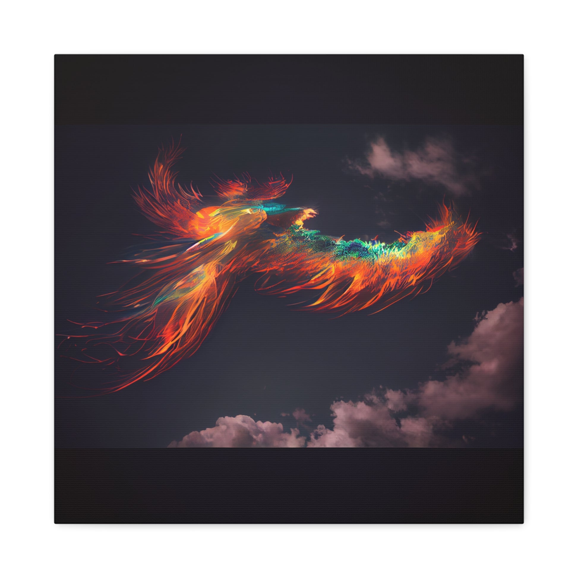A vibrant phoenix soars across a twilight sky, its fiery plumage igniting the heavens with a dance of vivid hues. It embodies rebirth and resilience, a beacon of light against the encroaching night.