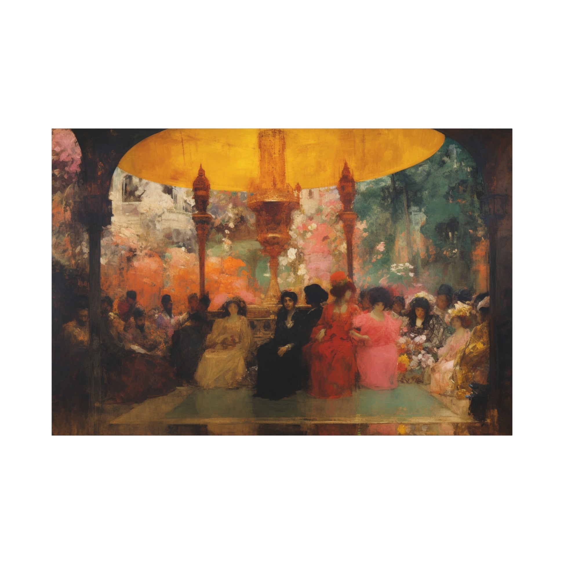 Beneath a canopy of golden dreams, figures lounge in a timeless dance of color and shadow. Their whispers blend with the vibrant blooms, crafting a tapestry of memories and forgotten tales, suspended in serene harmony.