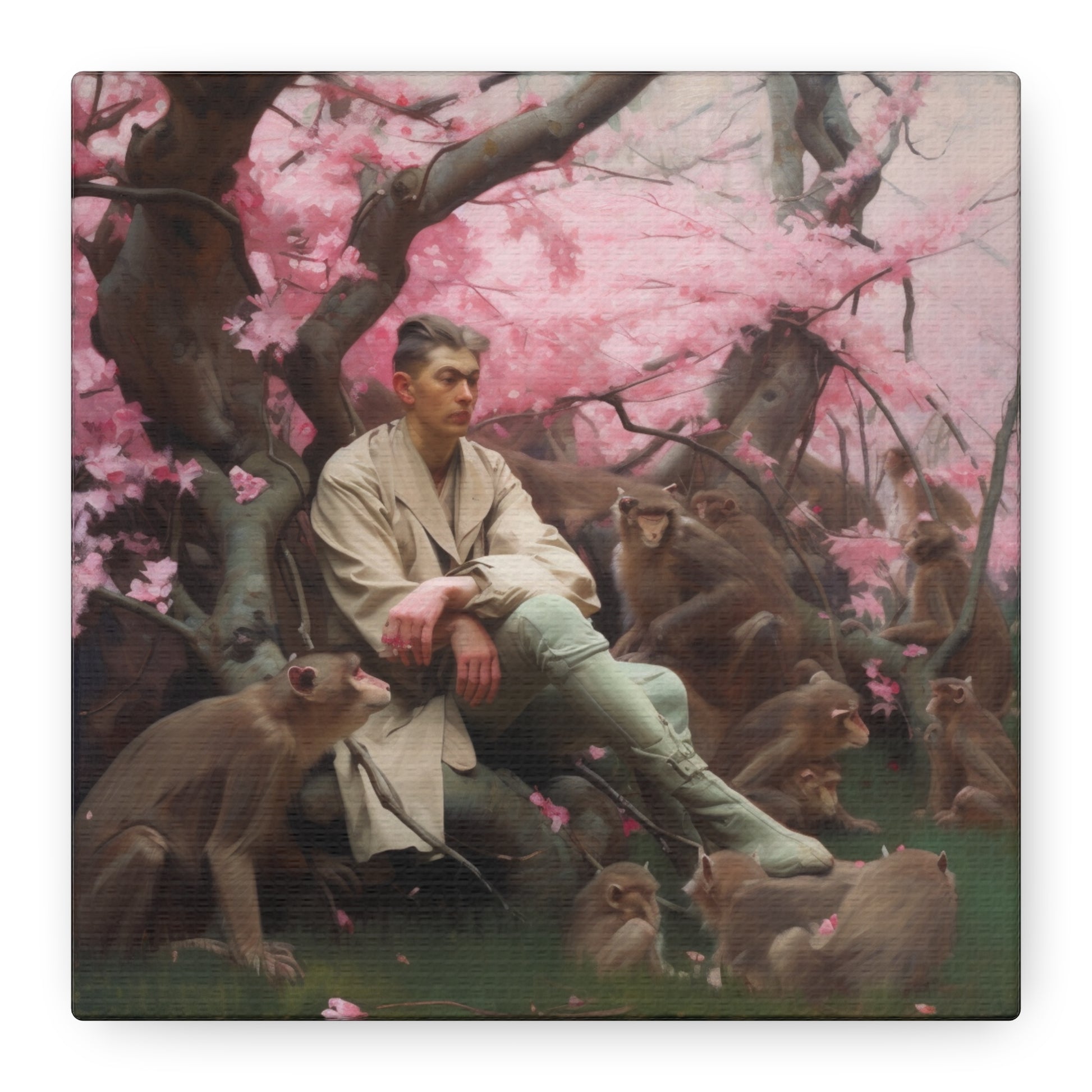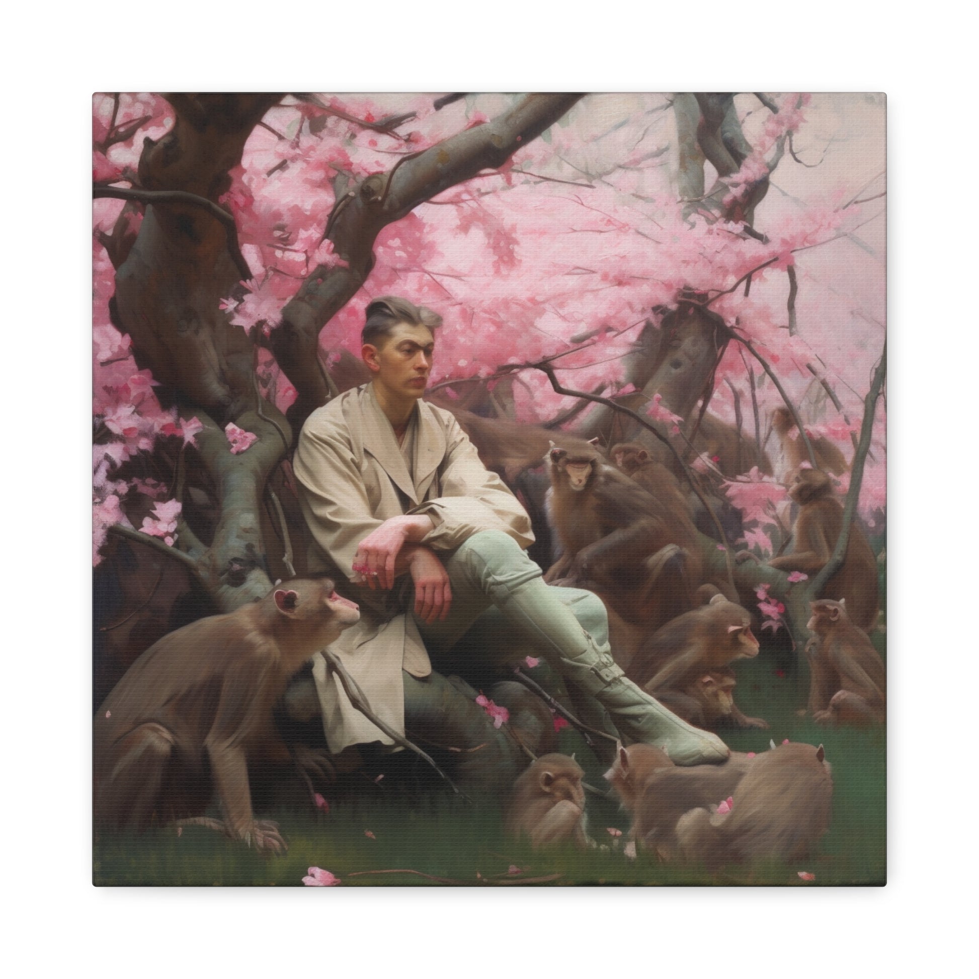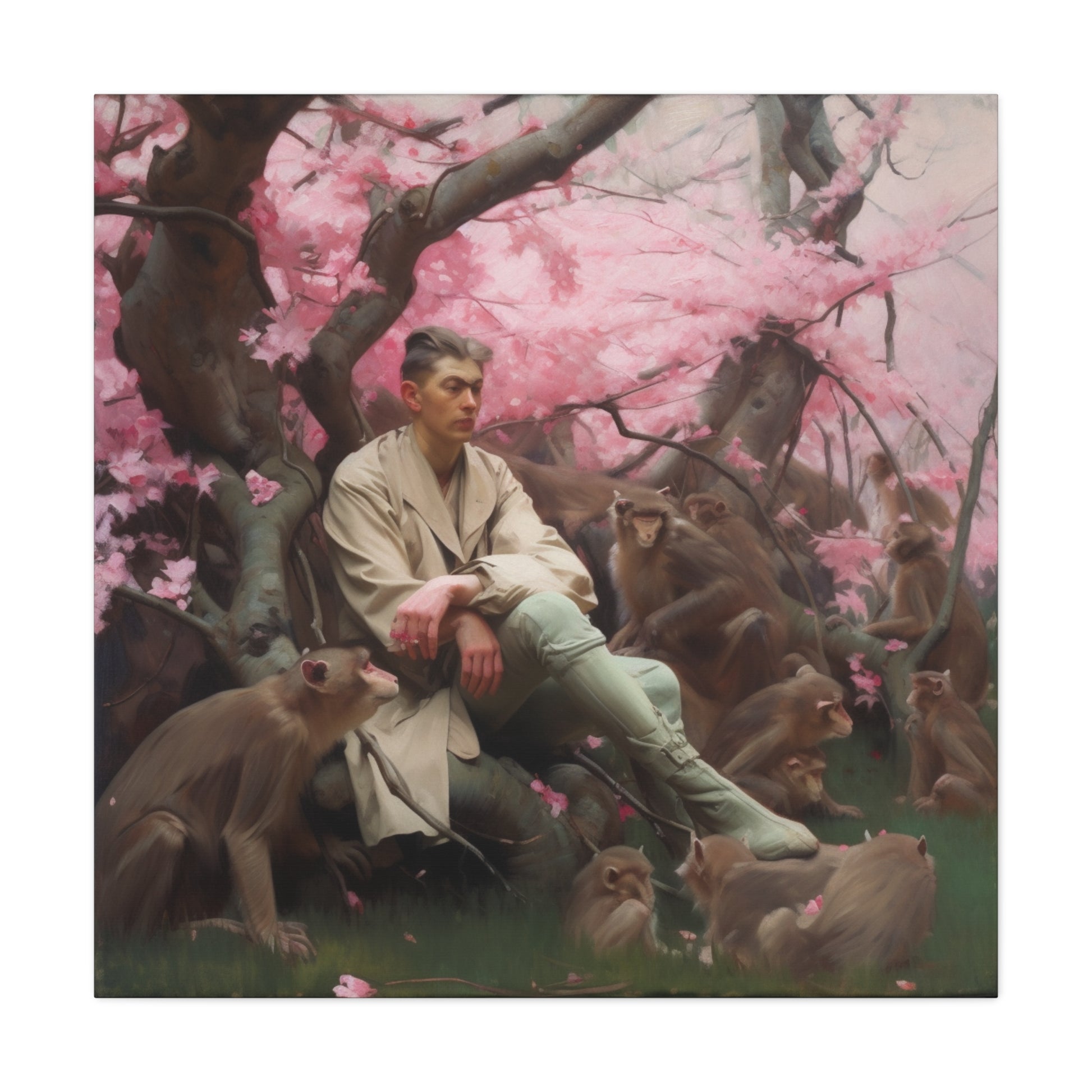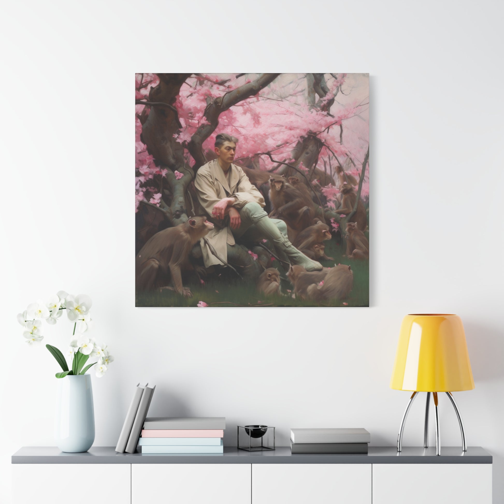 Amidst a tapestry of pink blossoms, a serene figure finds solace among the watchful gaze of nature's companions. The scene resonates with harmony, inviting contemplation of humanity’s gentle bond with the wild.