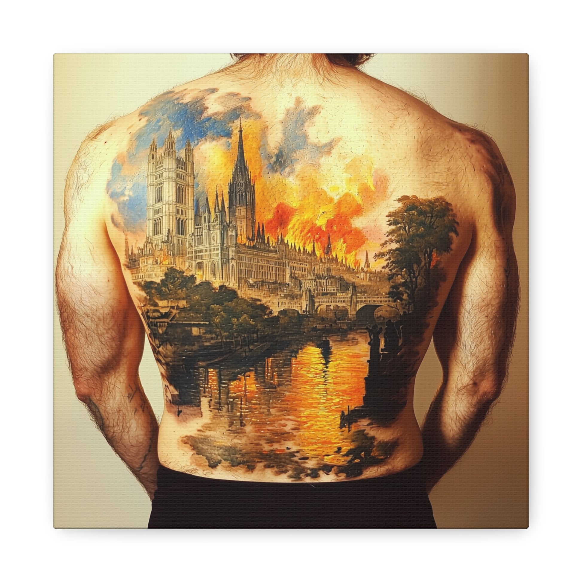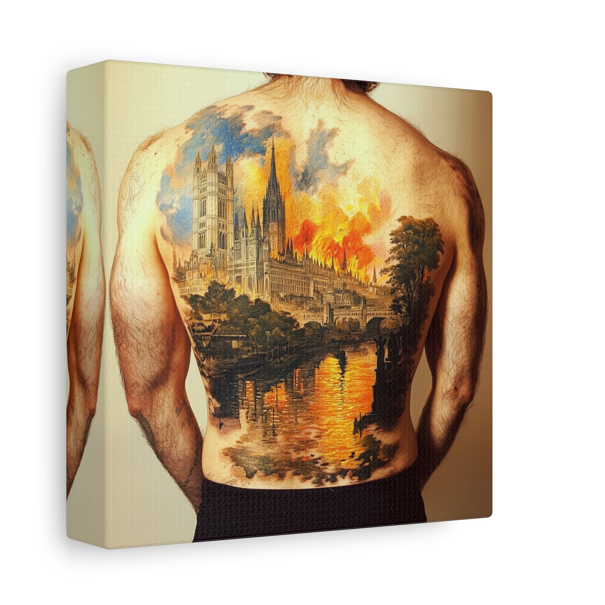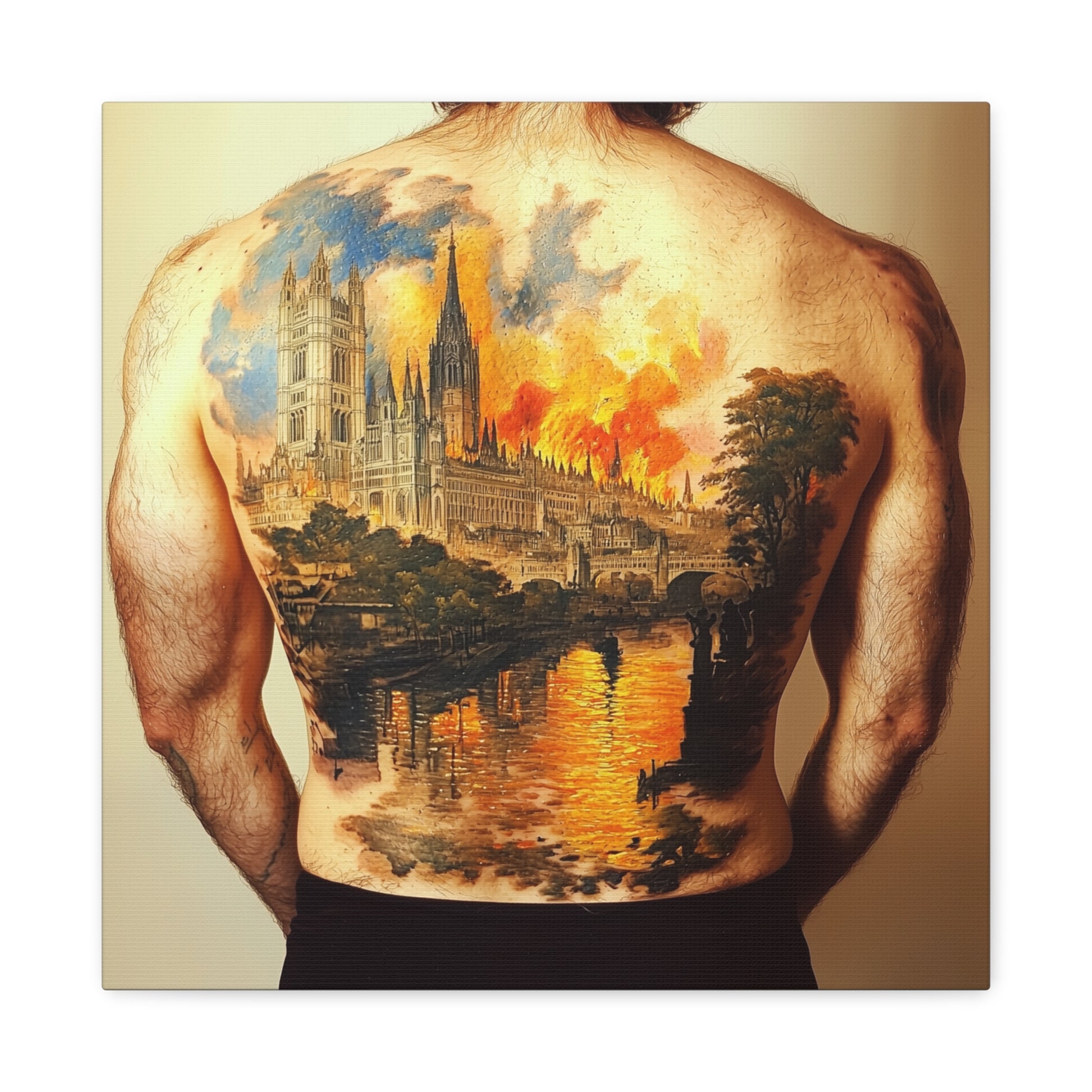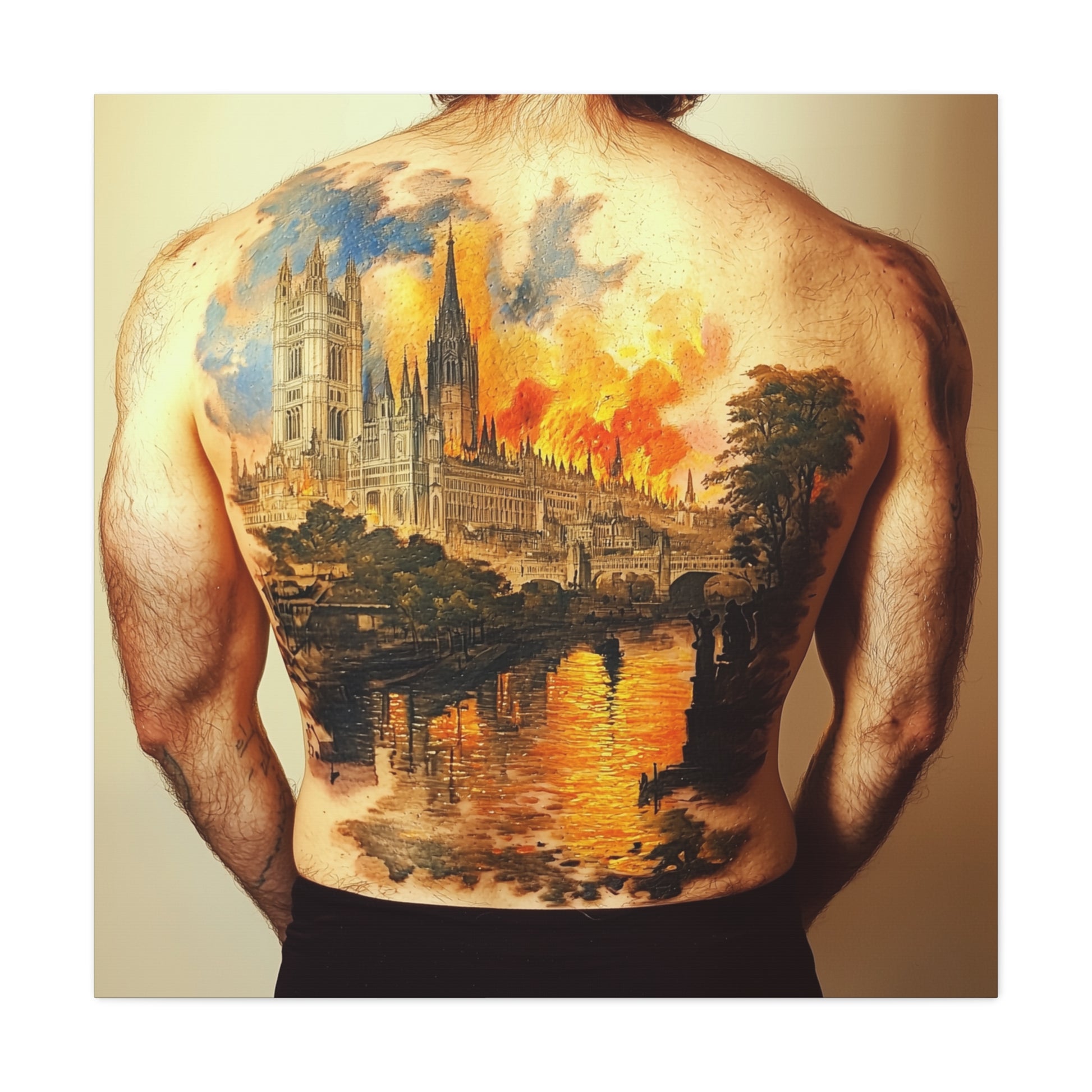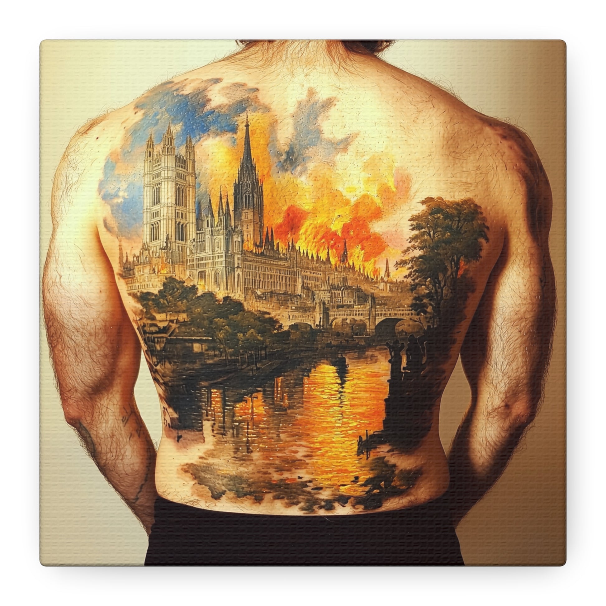 An ethereal city rises, etched in skin, where golden spires meet the fiery embrace of twilight. The reflection dances like whispered secrets, capturing the timeless allure of dreams interwoven with reality.