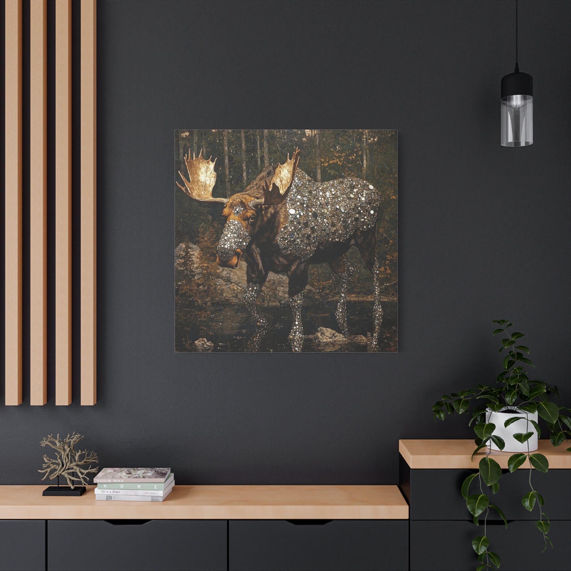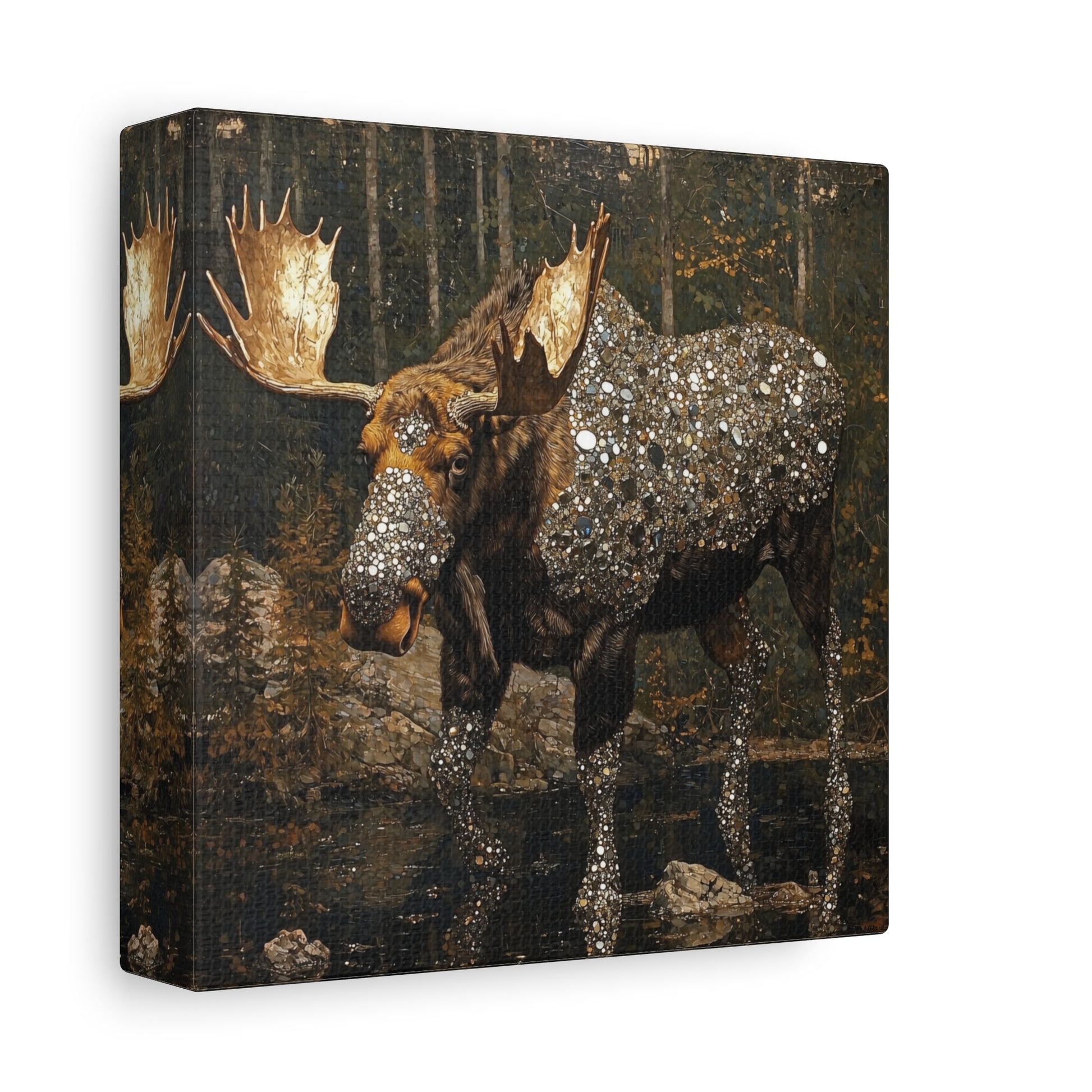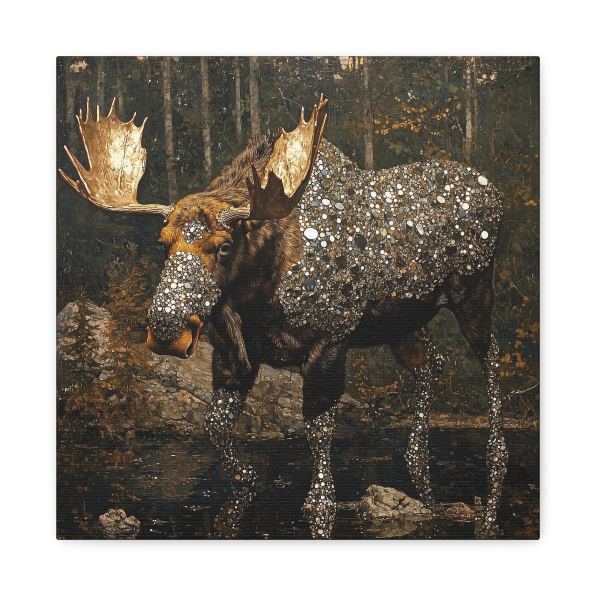 In the quiet embrace of the forest, a moose adorned with celestial jewels roams, merging earth's strength with cosmic mystery. Its presence commands reverence, a guardian of both nature's secrets and the universe's wonders.