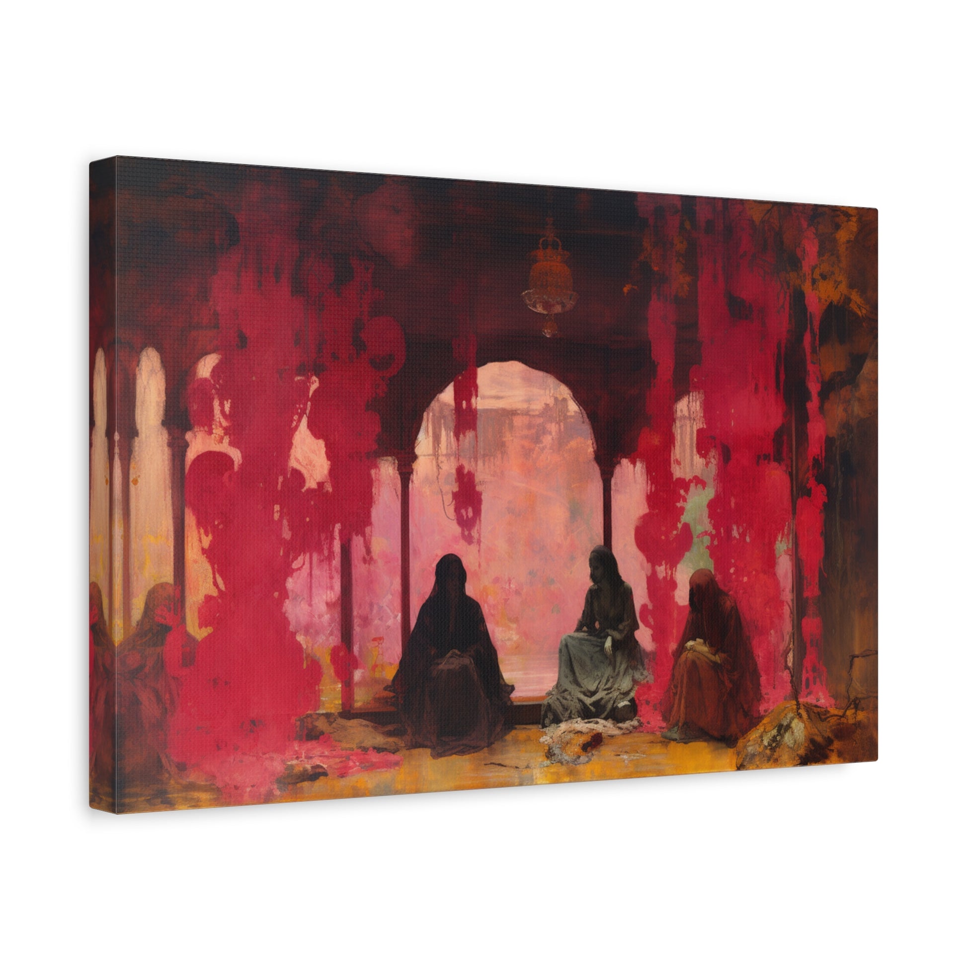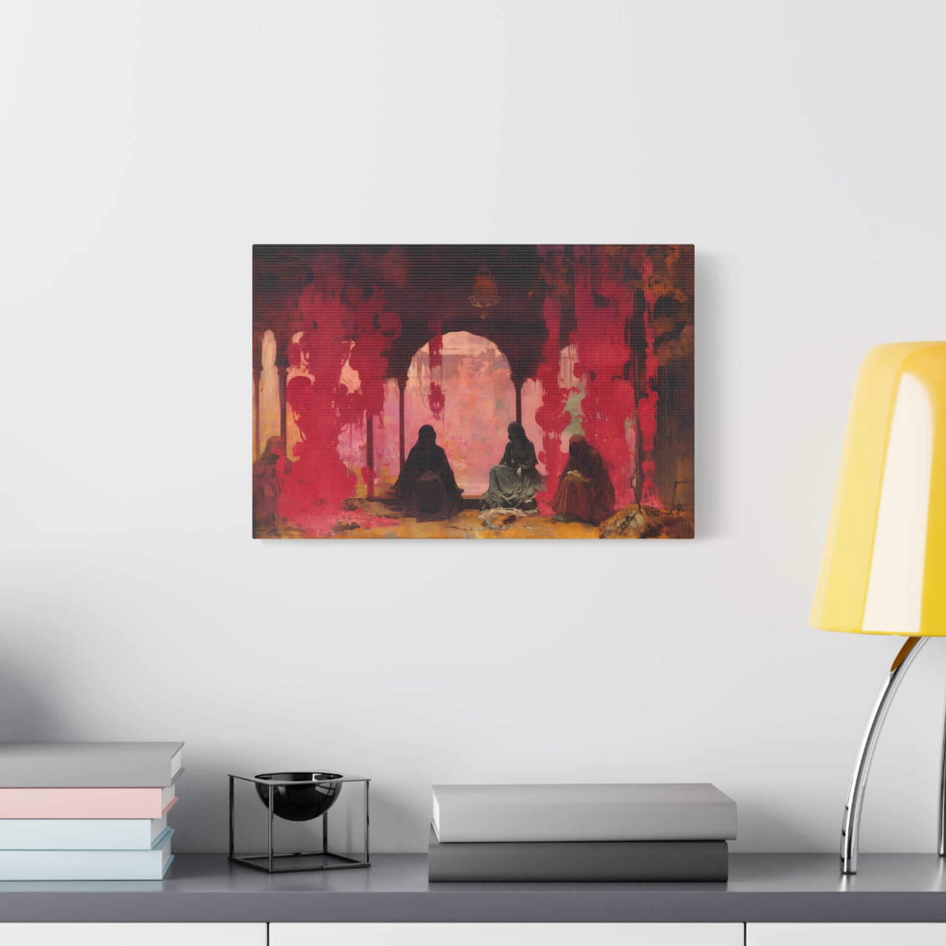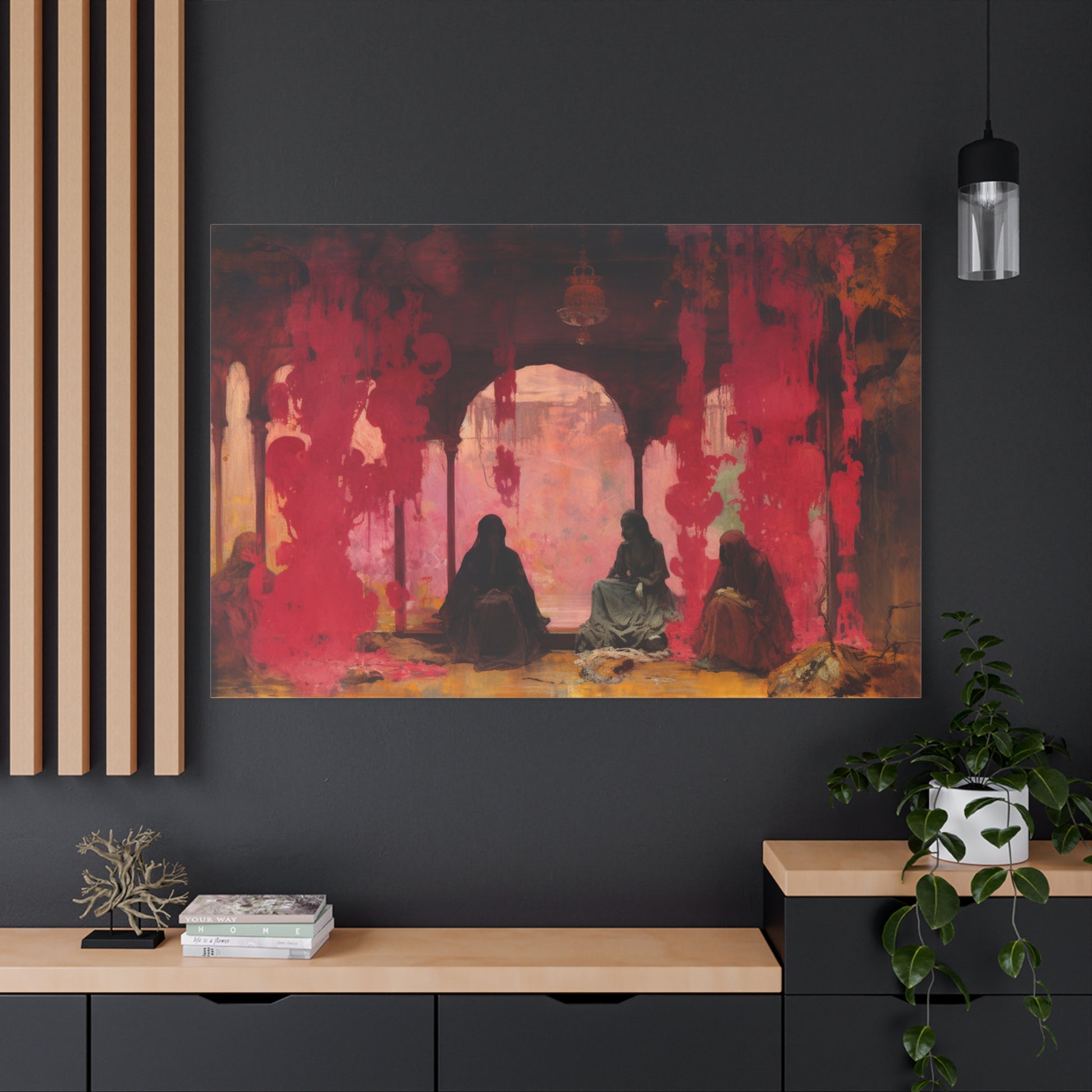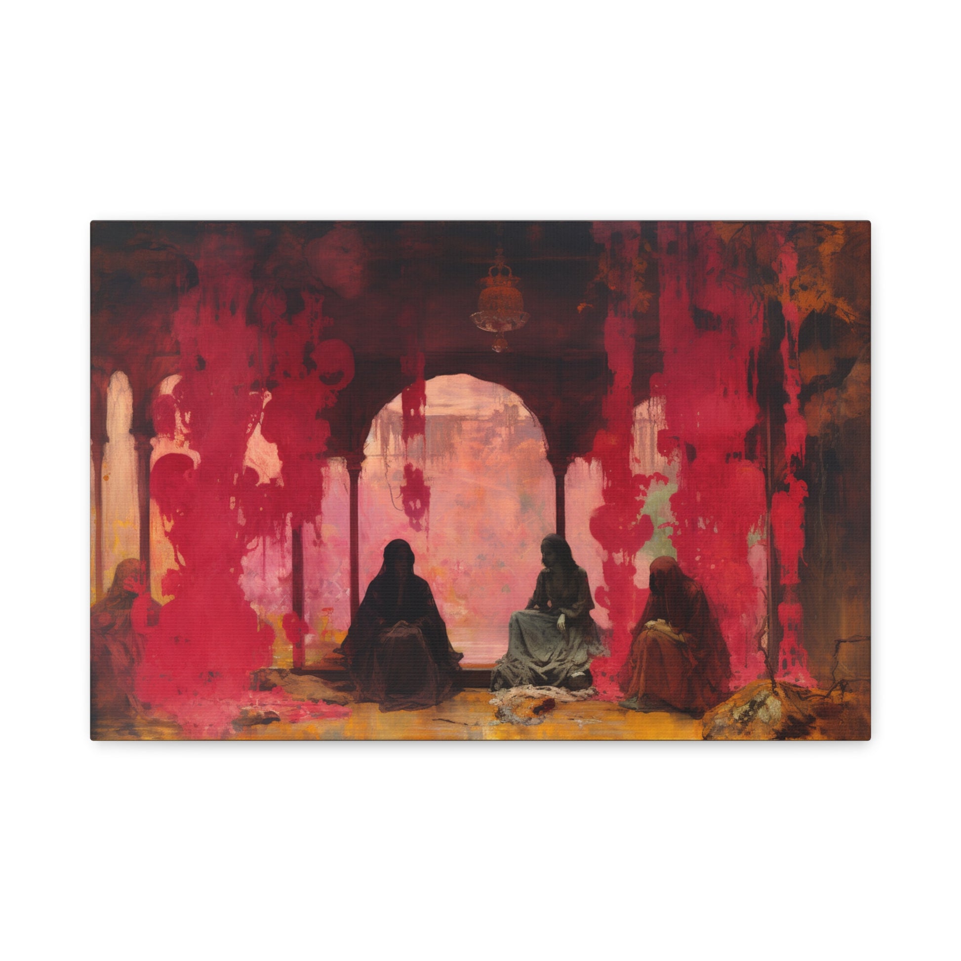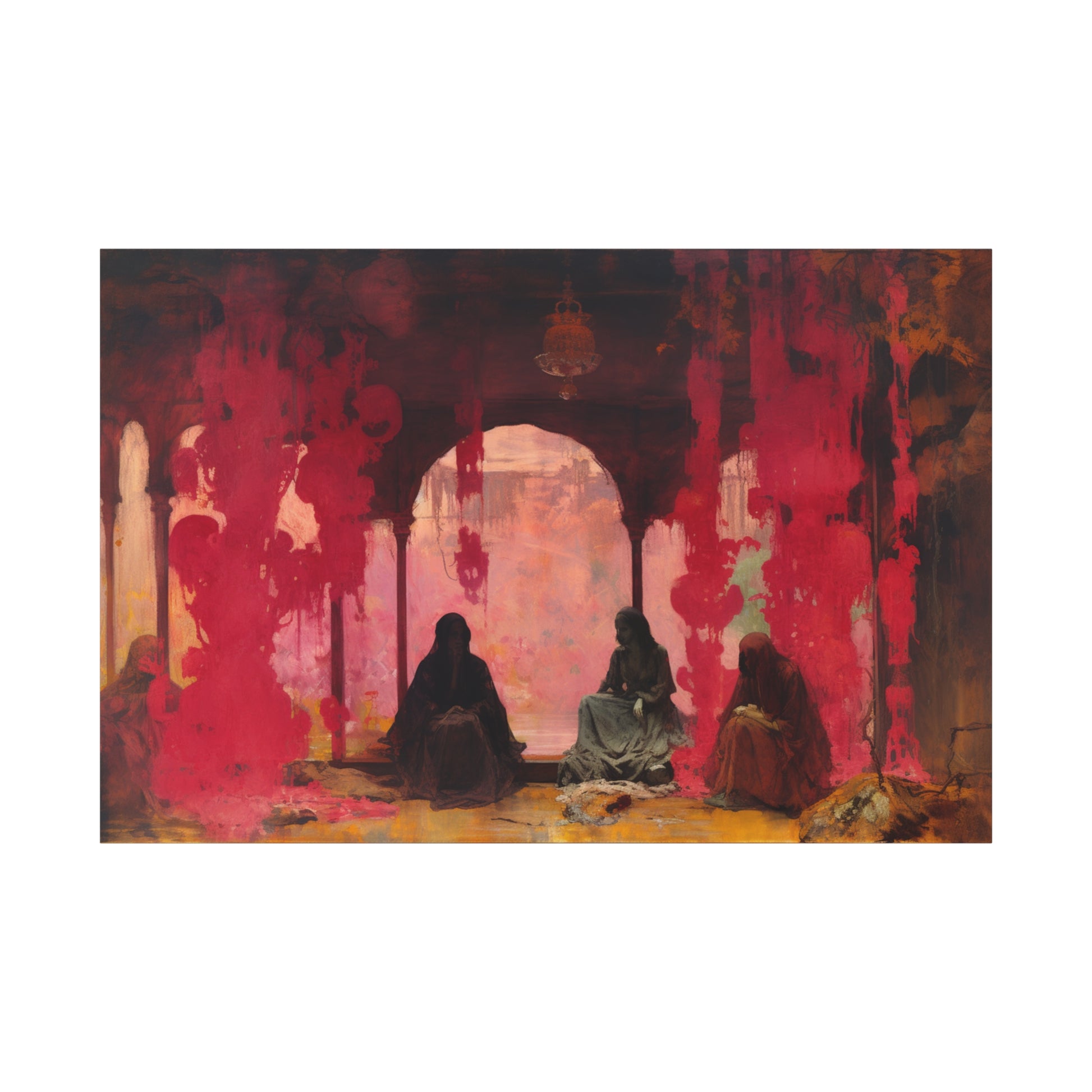 In a realm draped in crimson, figures sit cloaked in mystery and contemplation. The air is thick with unspoken stories, weaving a tapestry of shadows and light, where silence reigns and secrets linger.