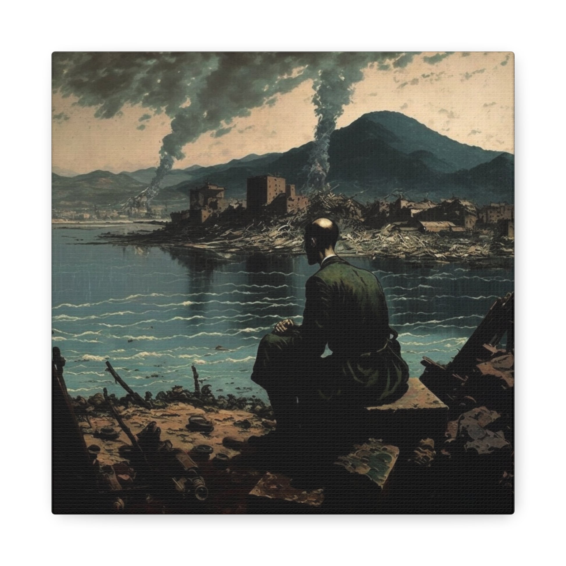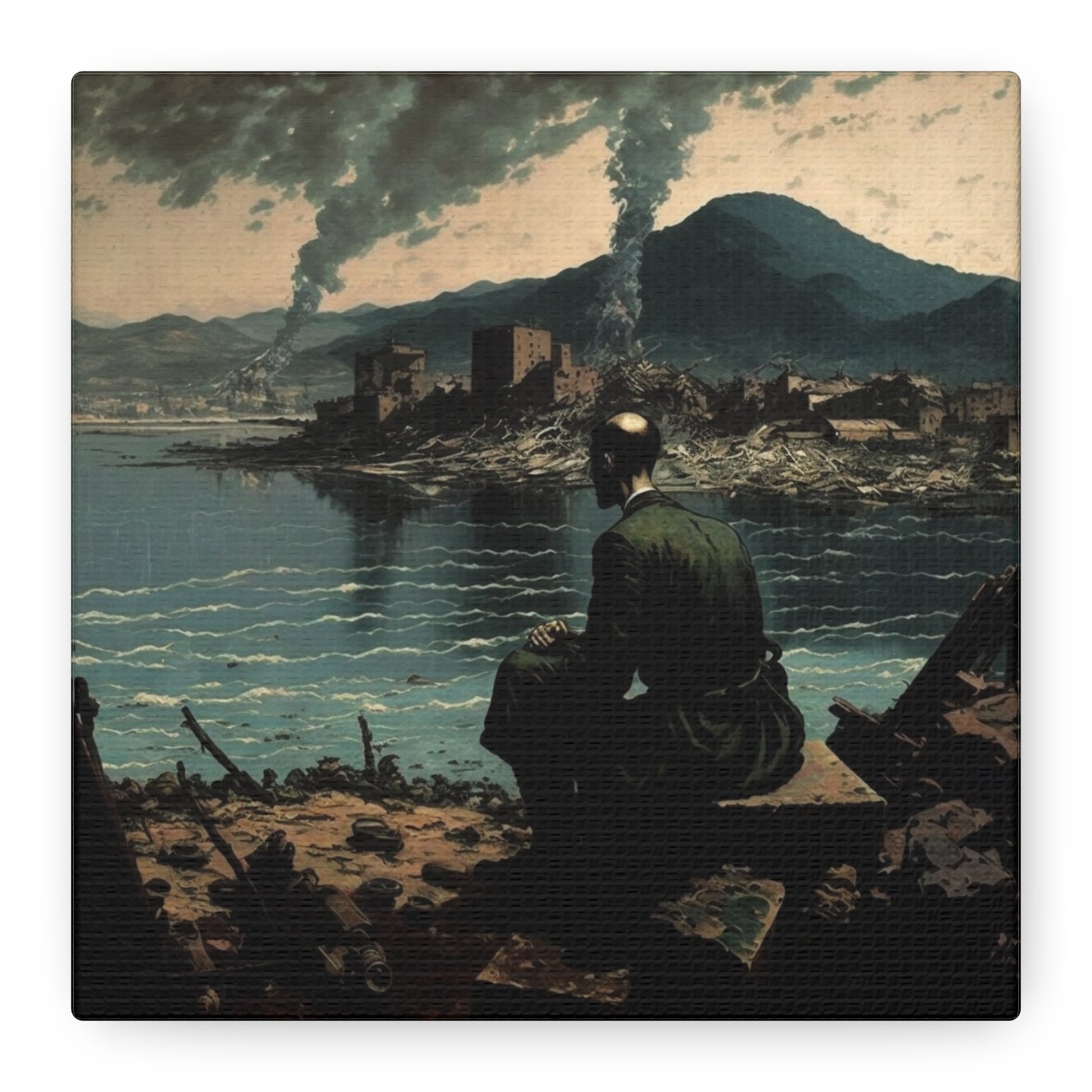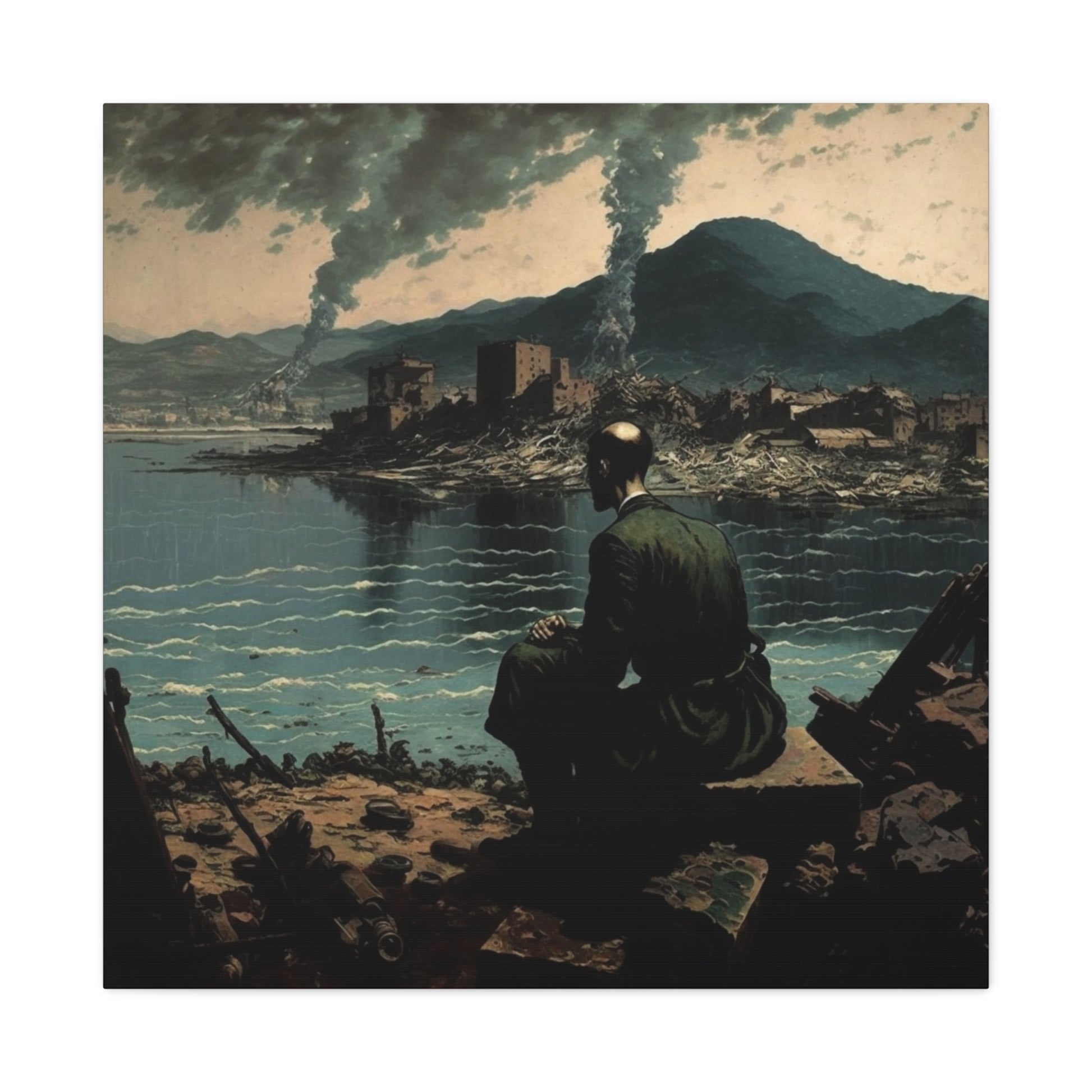 A lone figure contemplates a landscape torn between memory and reality, where smoke rises like whispered secrets. The silence is profound, yet pregnant with stories untold, inviting reflection upon the fragility of existence.