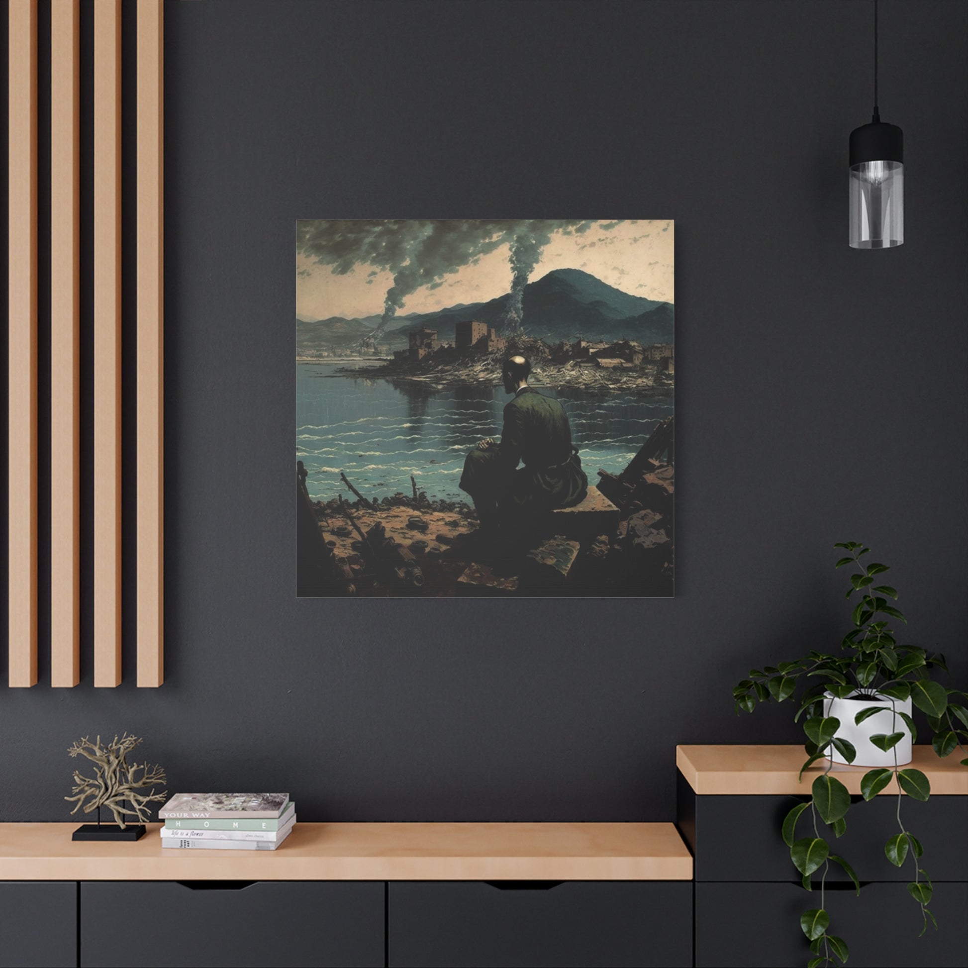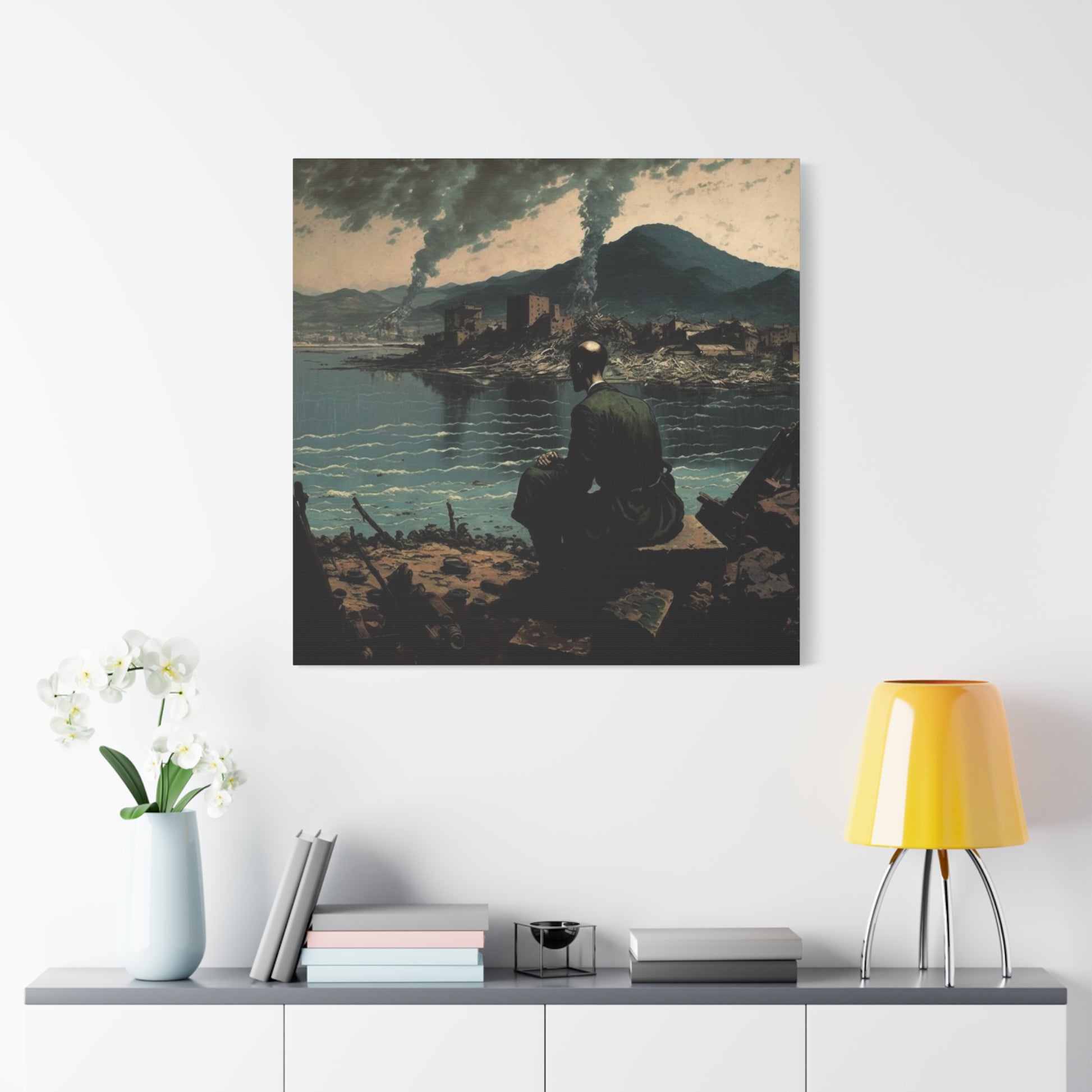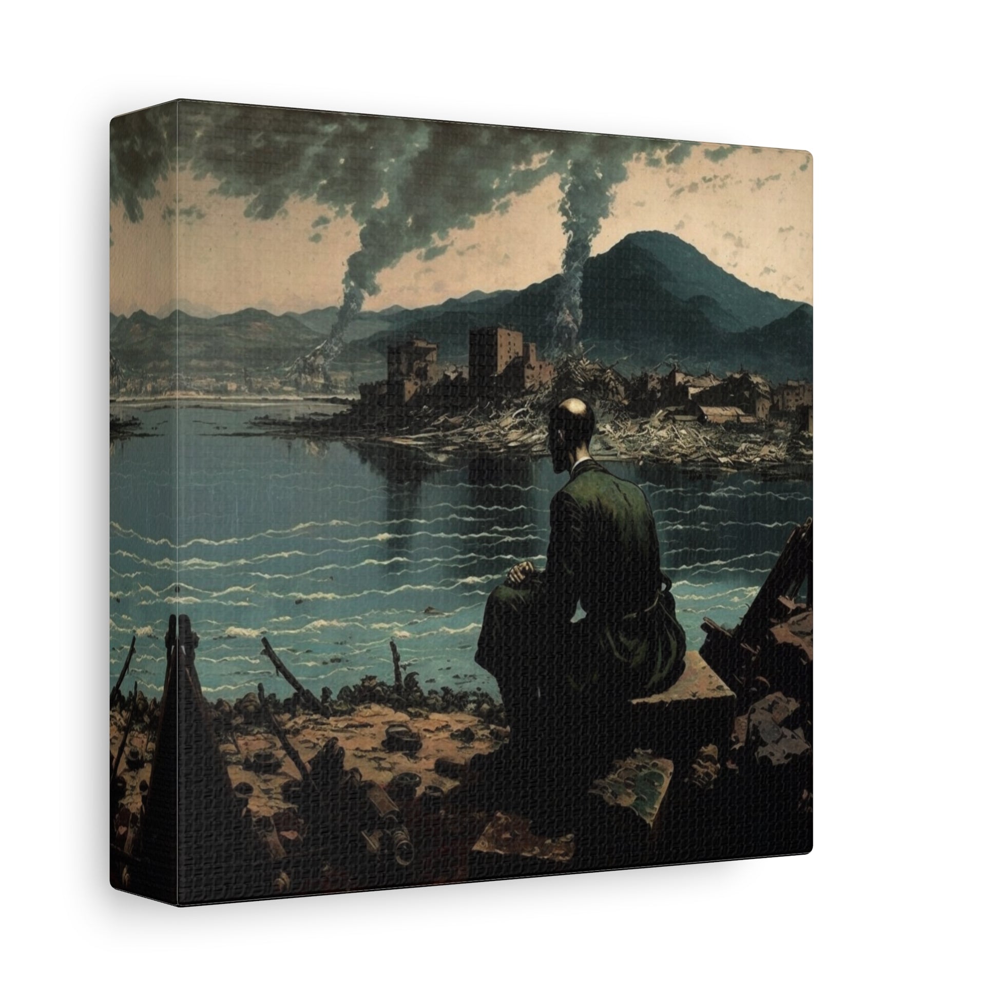 A lone figure contemplates a landscape torn between memory and reality, where smoke rises like whispered secrets. The silence is profound, yet pregnant with stories untold, inviting reflection upon the fragility of existence.