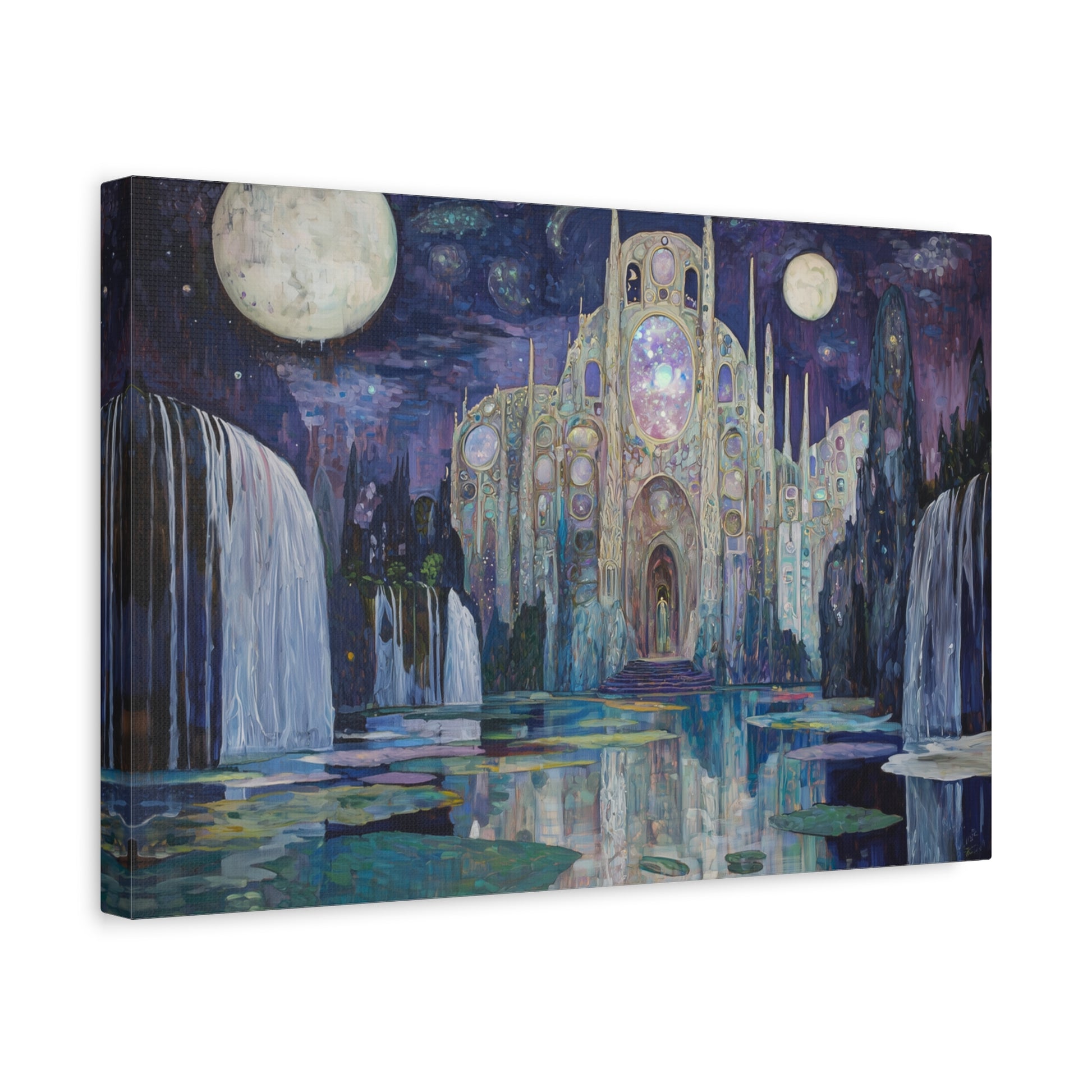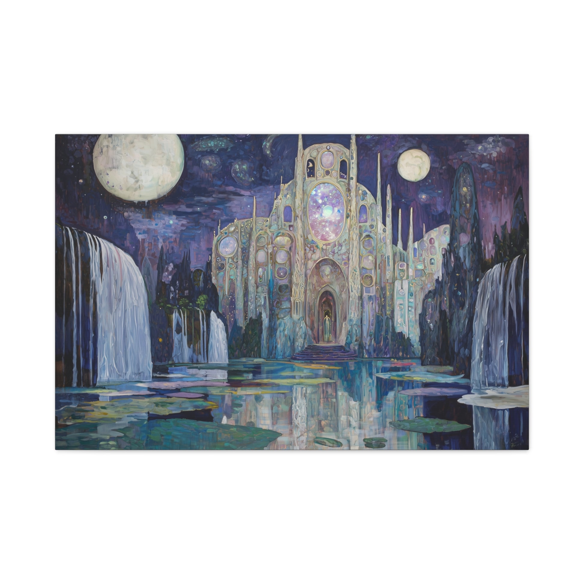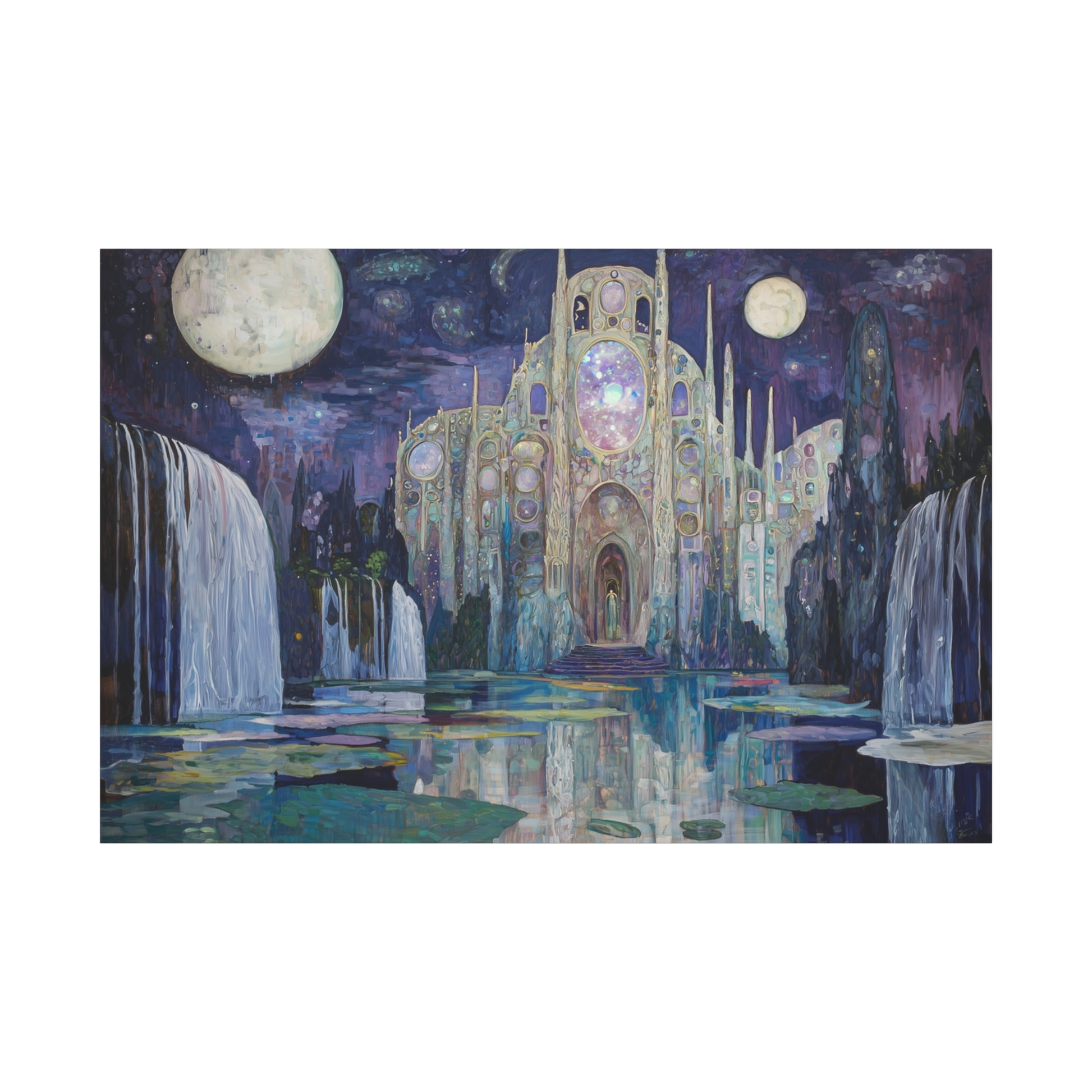 Bathed in moonlight, a luminous sanctuary beckons from the depths of a dreamscape, its whispers echoing through cascading waters. The celestial architecture draws you into a realm where time and space dissolve into wonder.