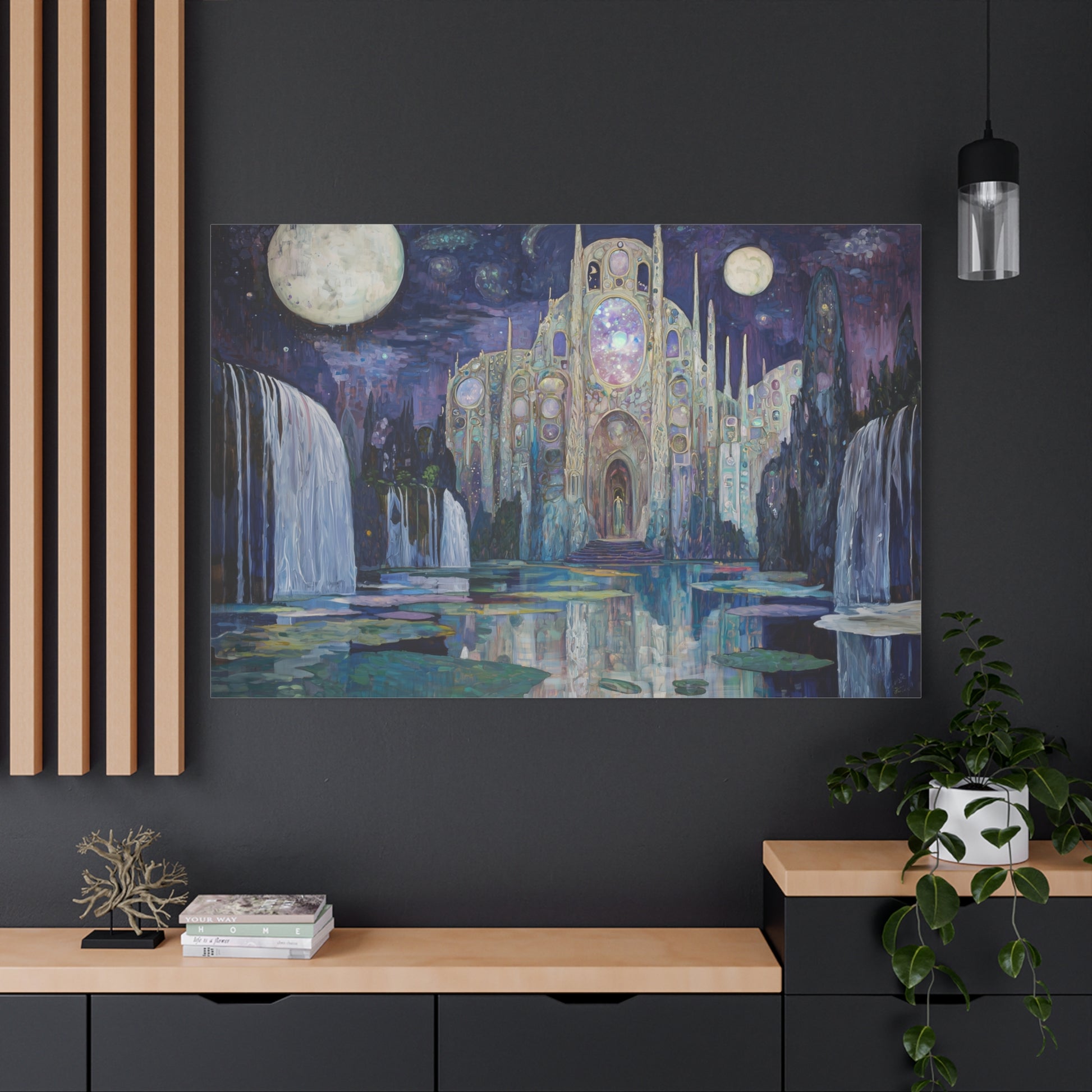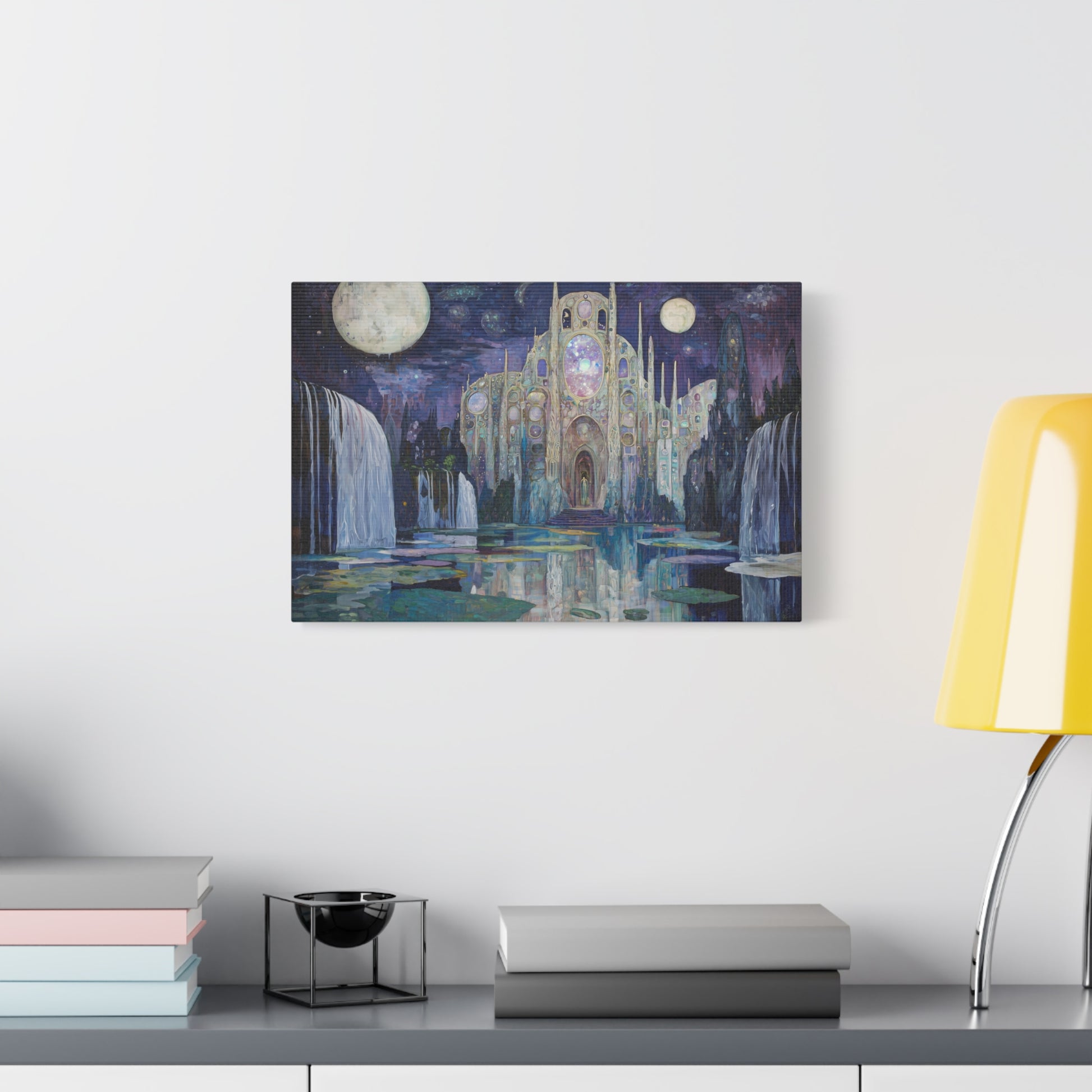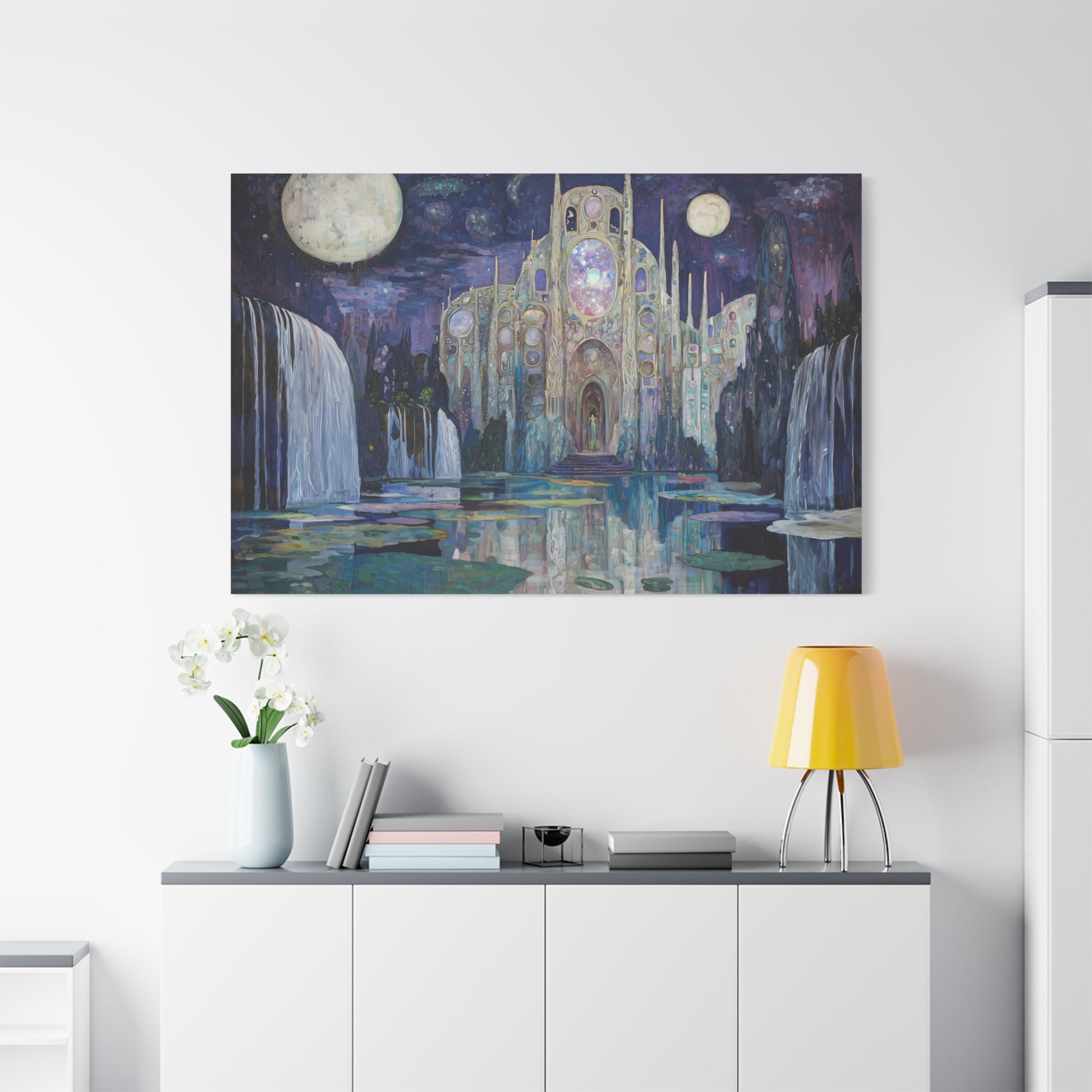 Bathed in moonlight, a luminous sanctuary beckons from the depths of a dreamscape, its whispers echoing through cascading waters. The celestial architecture draws you into a realm where time and space dissolve into wonder.
