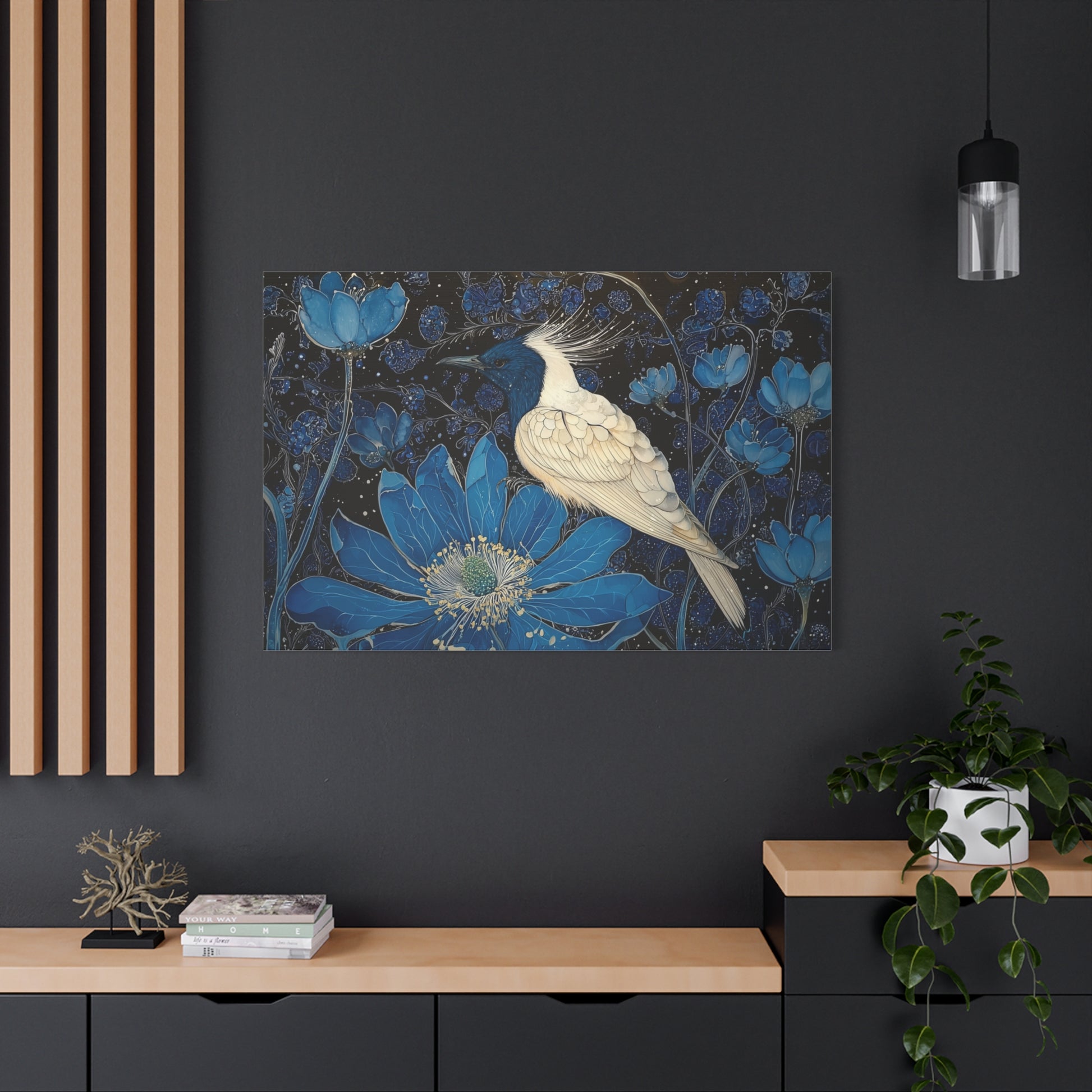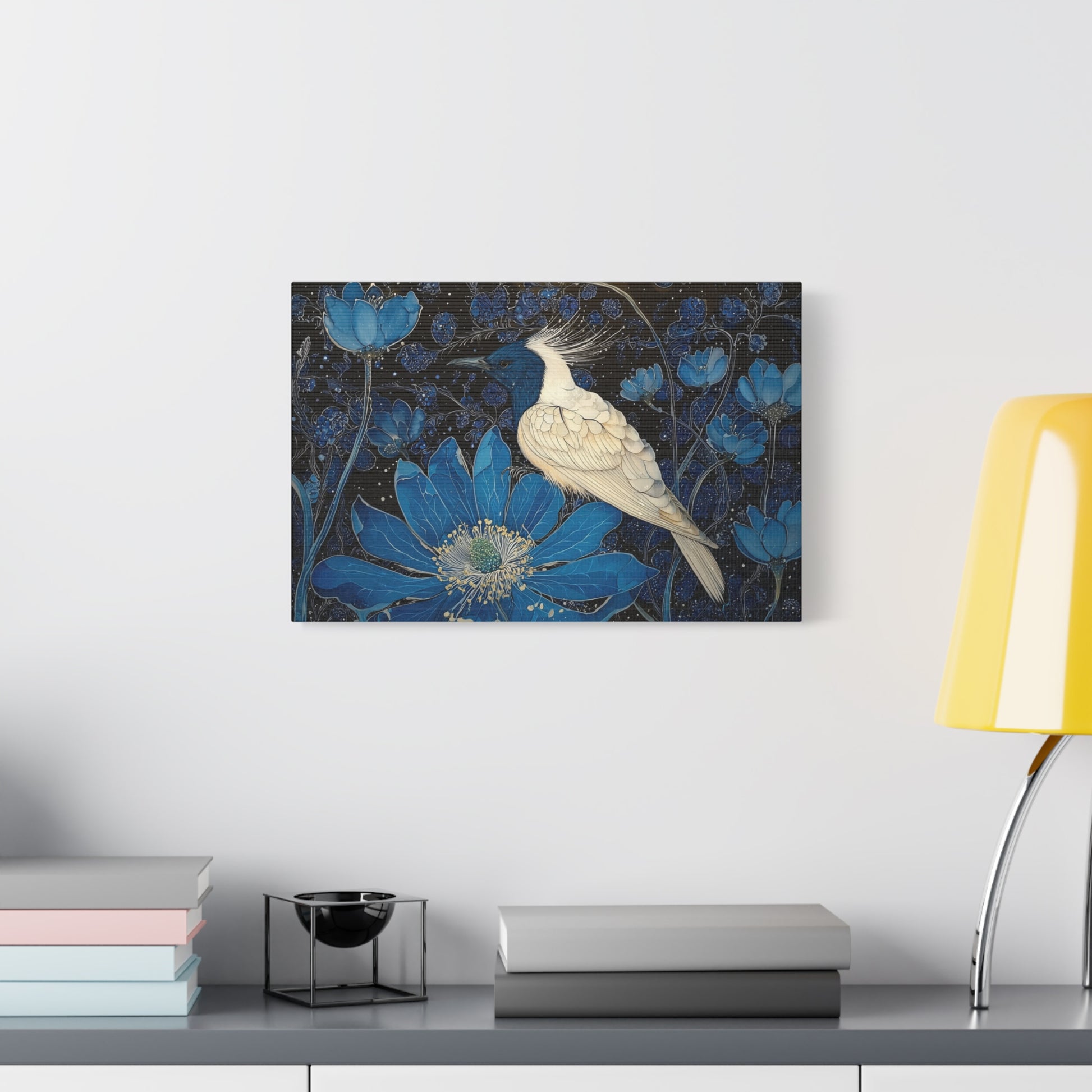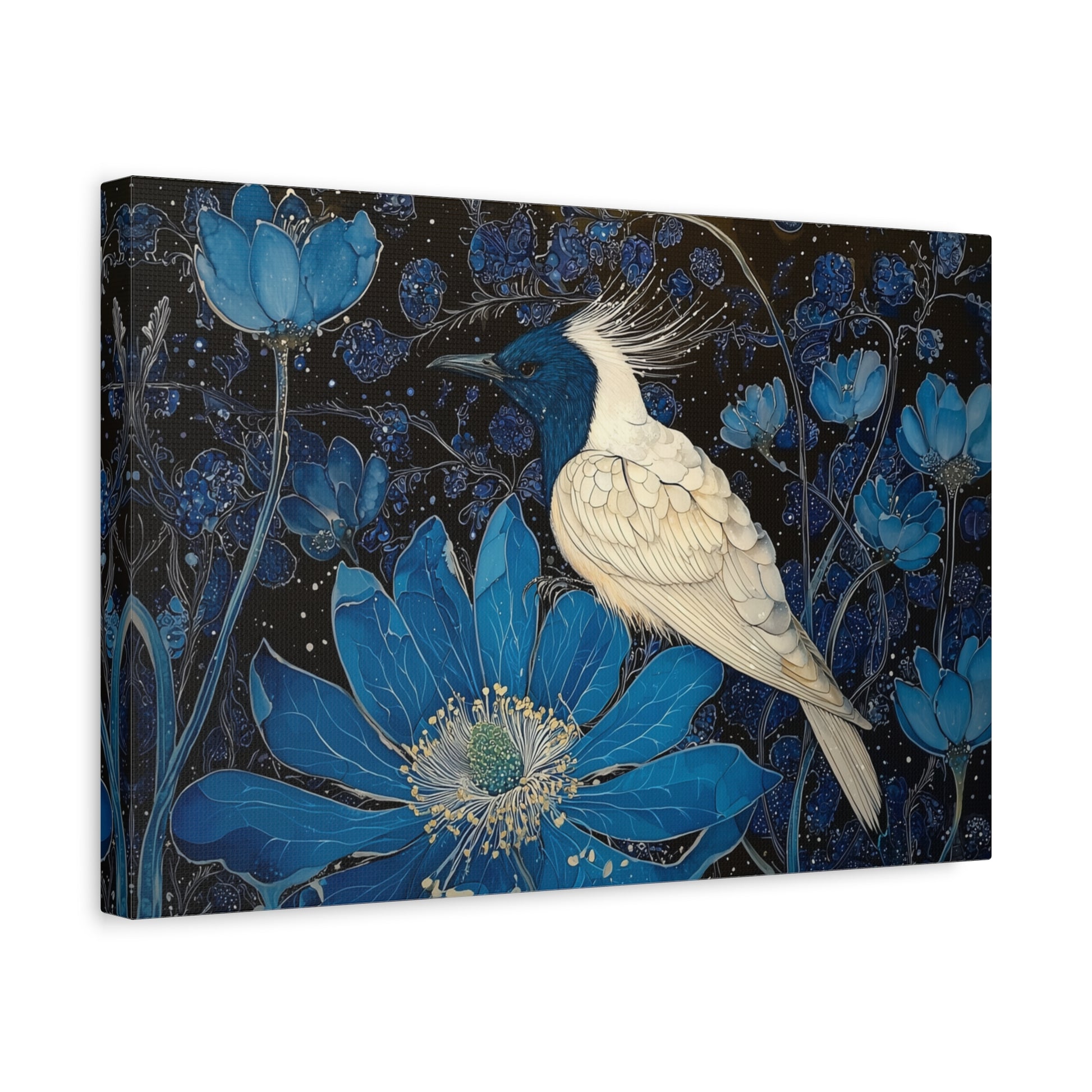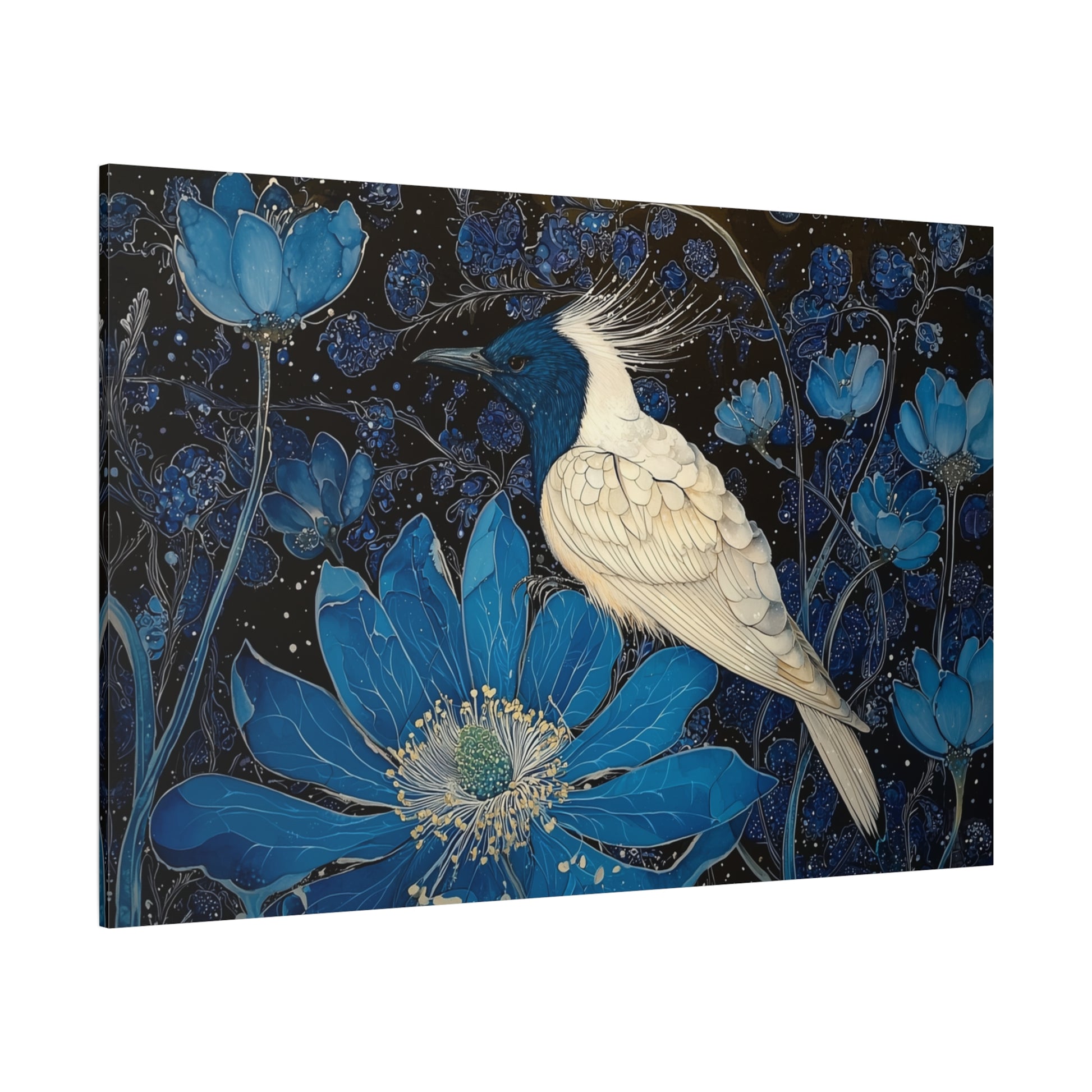In a realm where dreams weave through midnight blossoms, a celestial bird rests, embodying the silence of the cosmos. Its plumage glistens like stars amidst a tapestry of azure petals, whispering secrets to the night.
