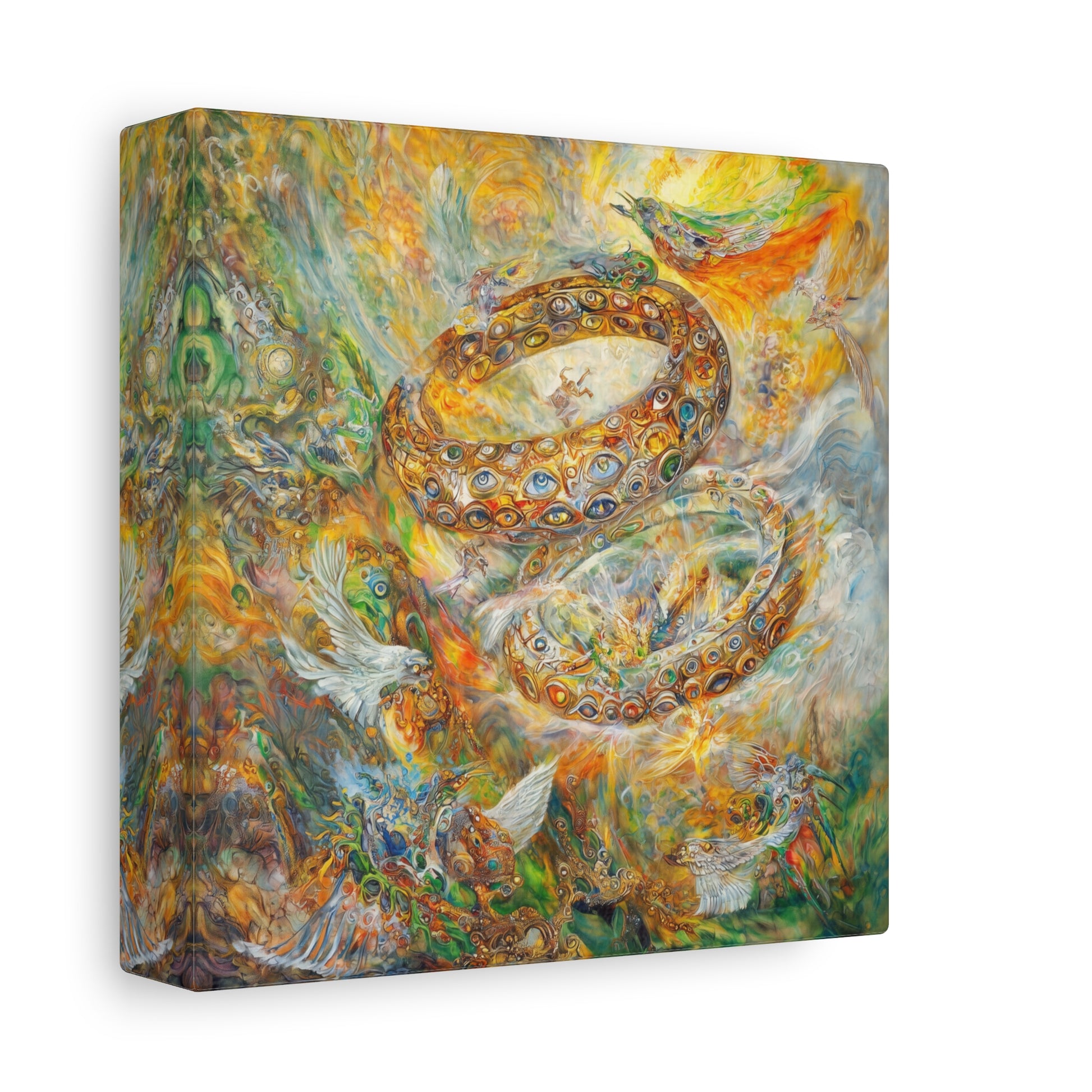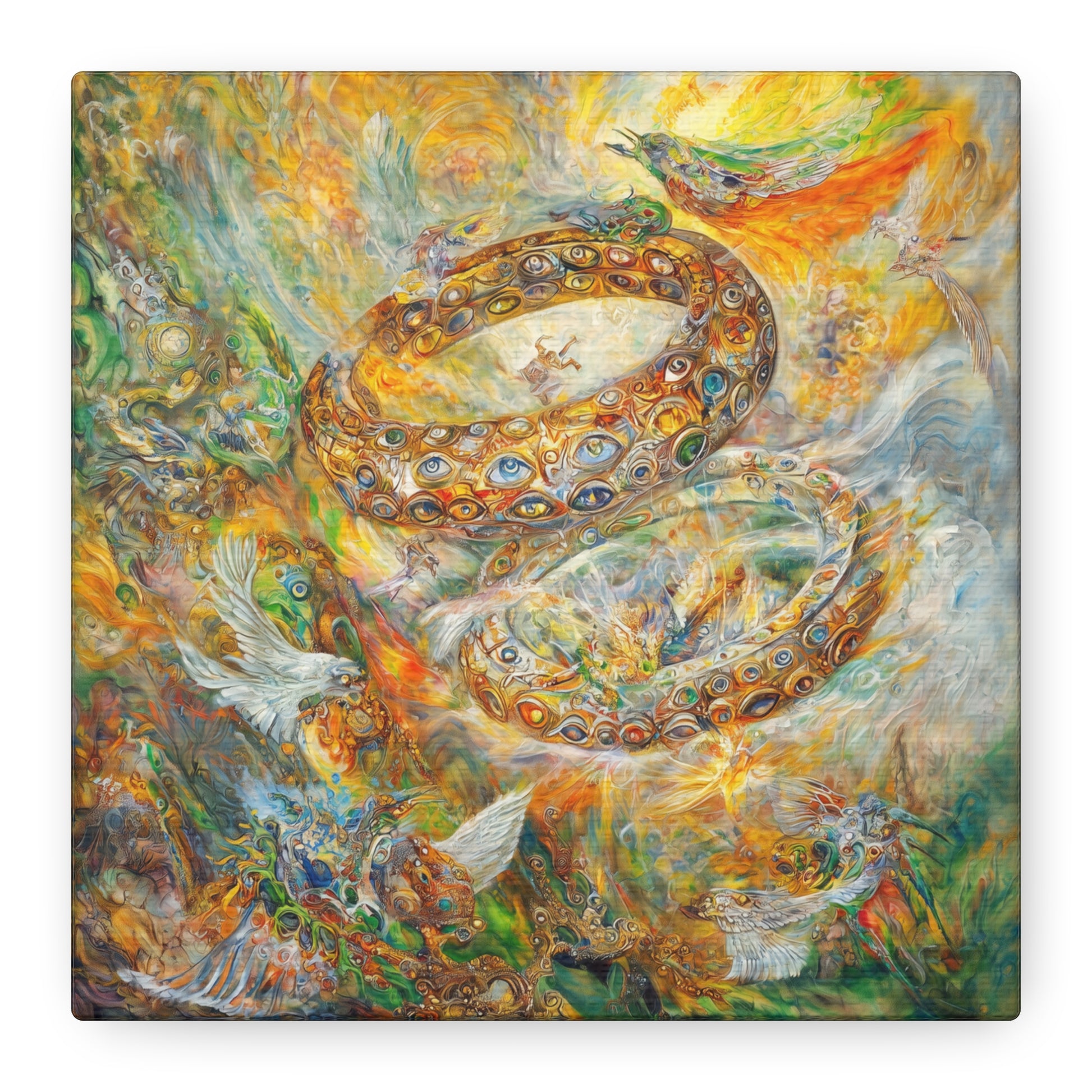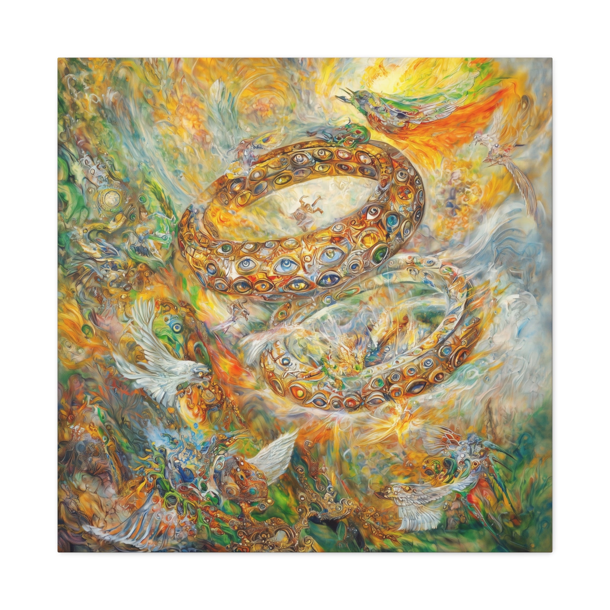 A celestial dance of golden rings and vibrant wings, where eyes watch over the swirling tapestry of life. This ethereal scene invites the soul to explore realms of wonder and flight.