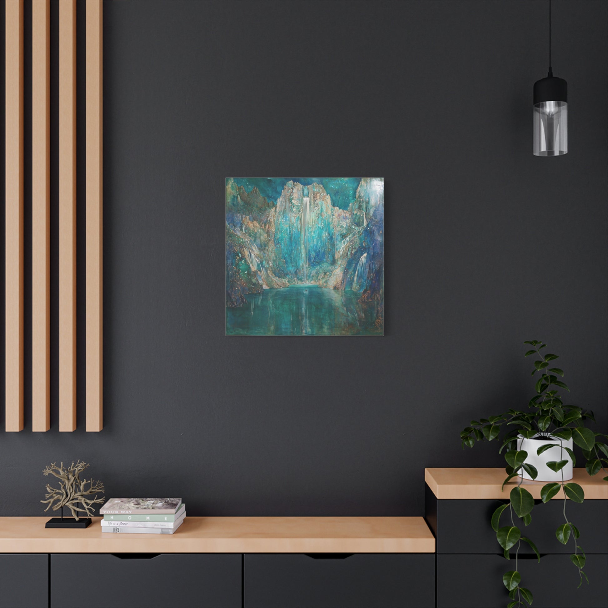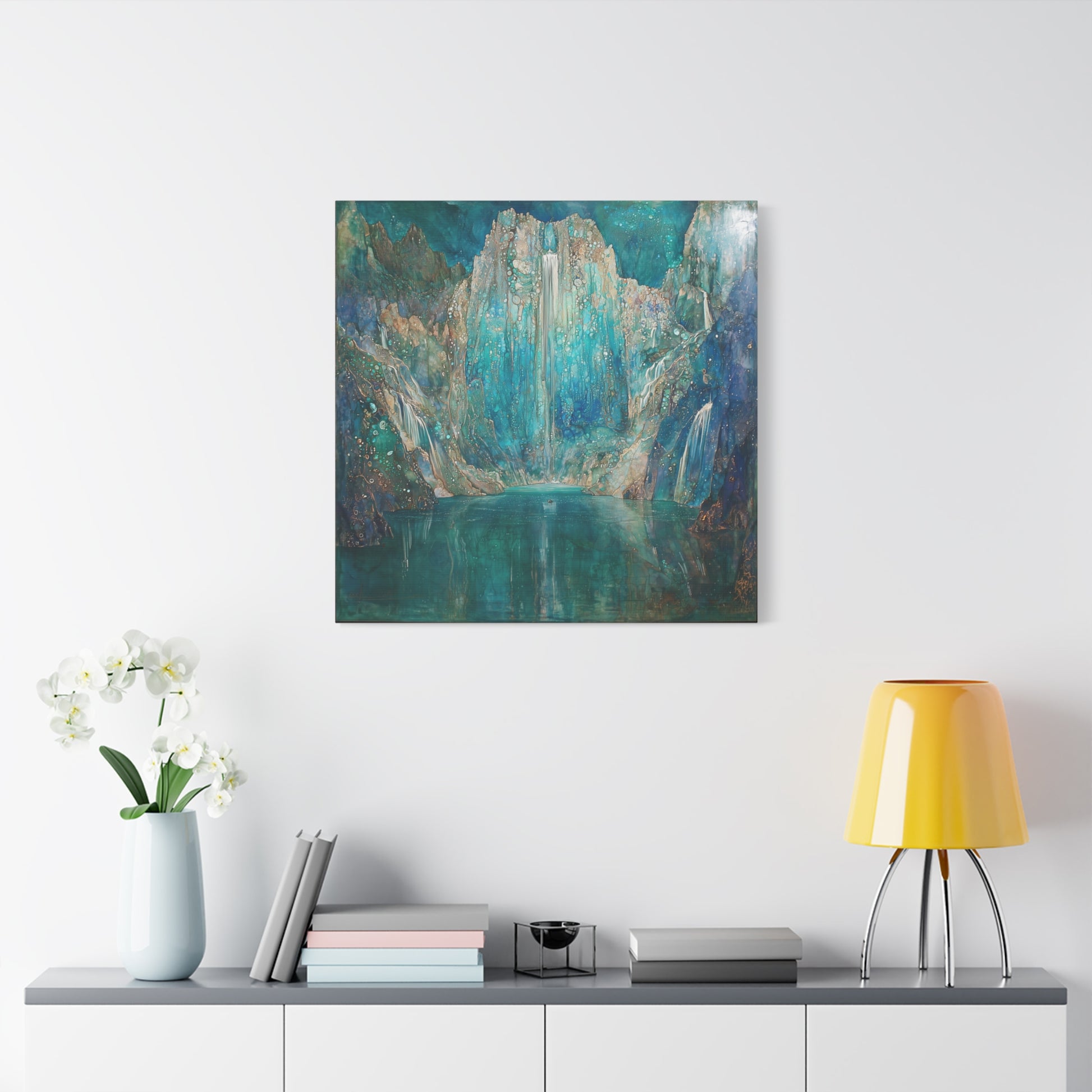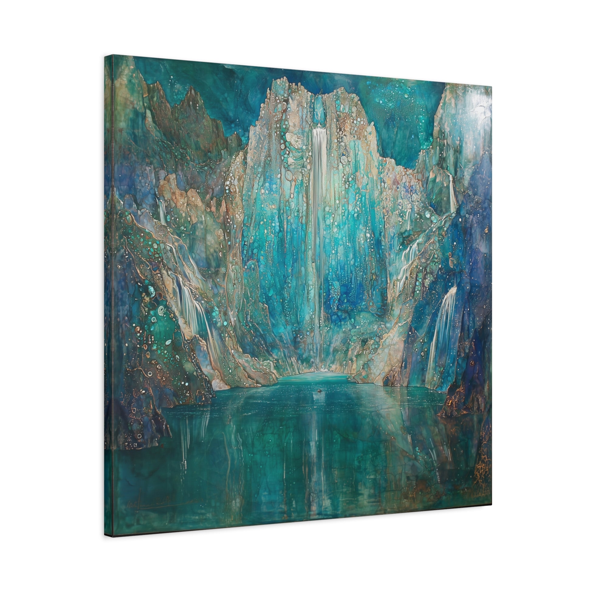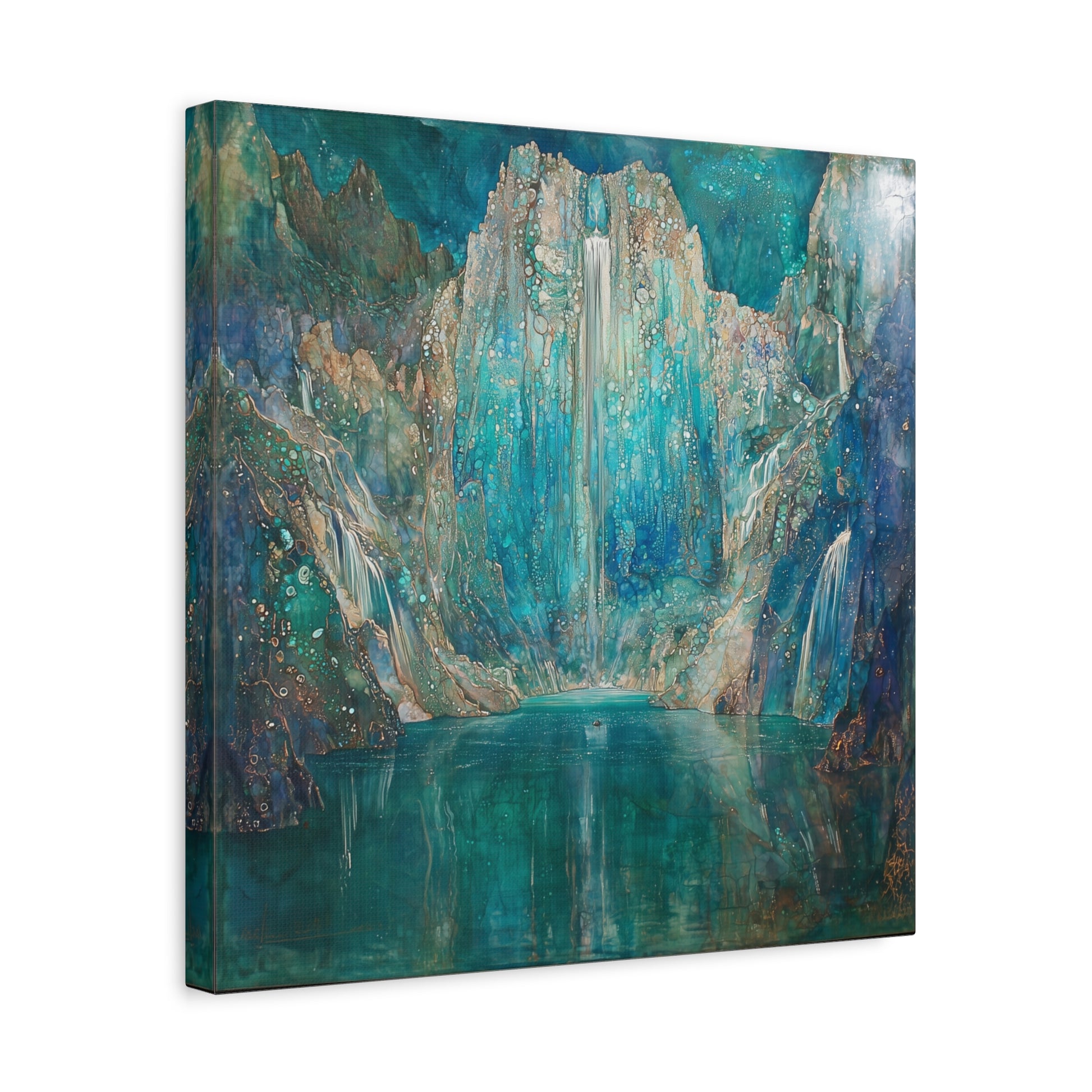 A shimmering cascade descends into a tranquil lake, inviting you to lose yourself in its depthless hues. The scene whispers secrets of forgotten worlds, where time halts and dreams unfold in liquid serenity.