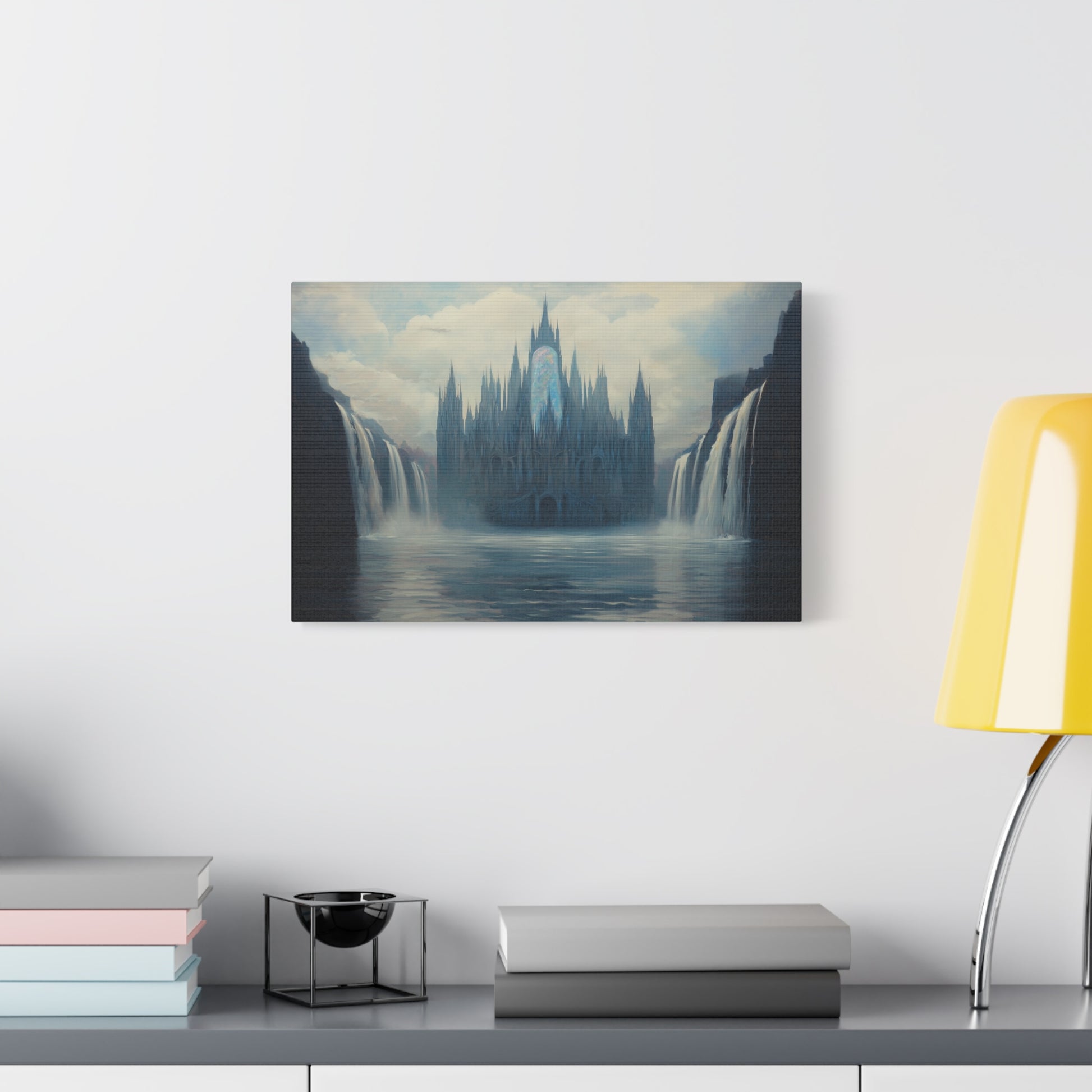 A majestic fortress rises amidst cascading waterfalls, shrouded in mist and mystery. It stands as a testament to ancient dreams and whispers of forgotten realms, inviting the soul to wander through its ethereal echoes.