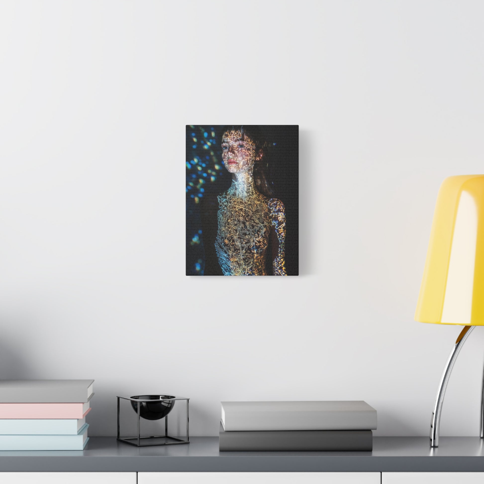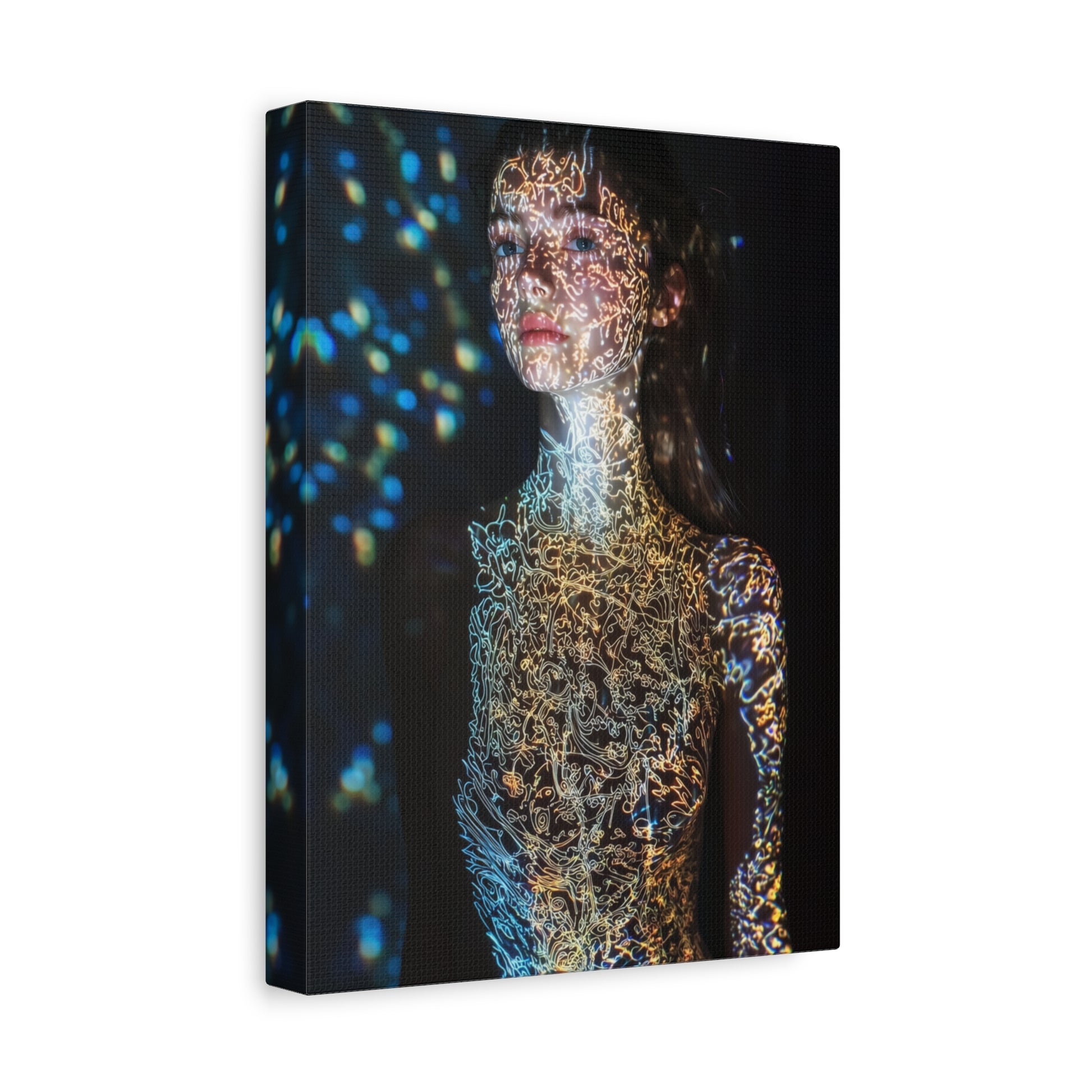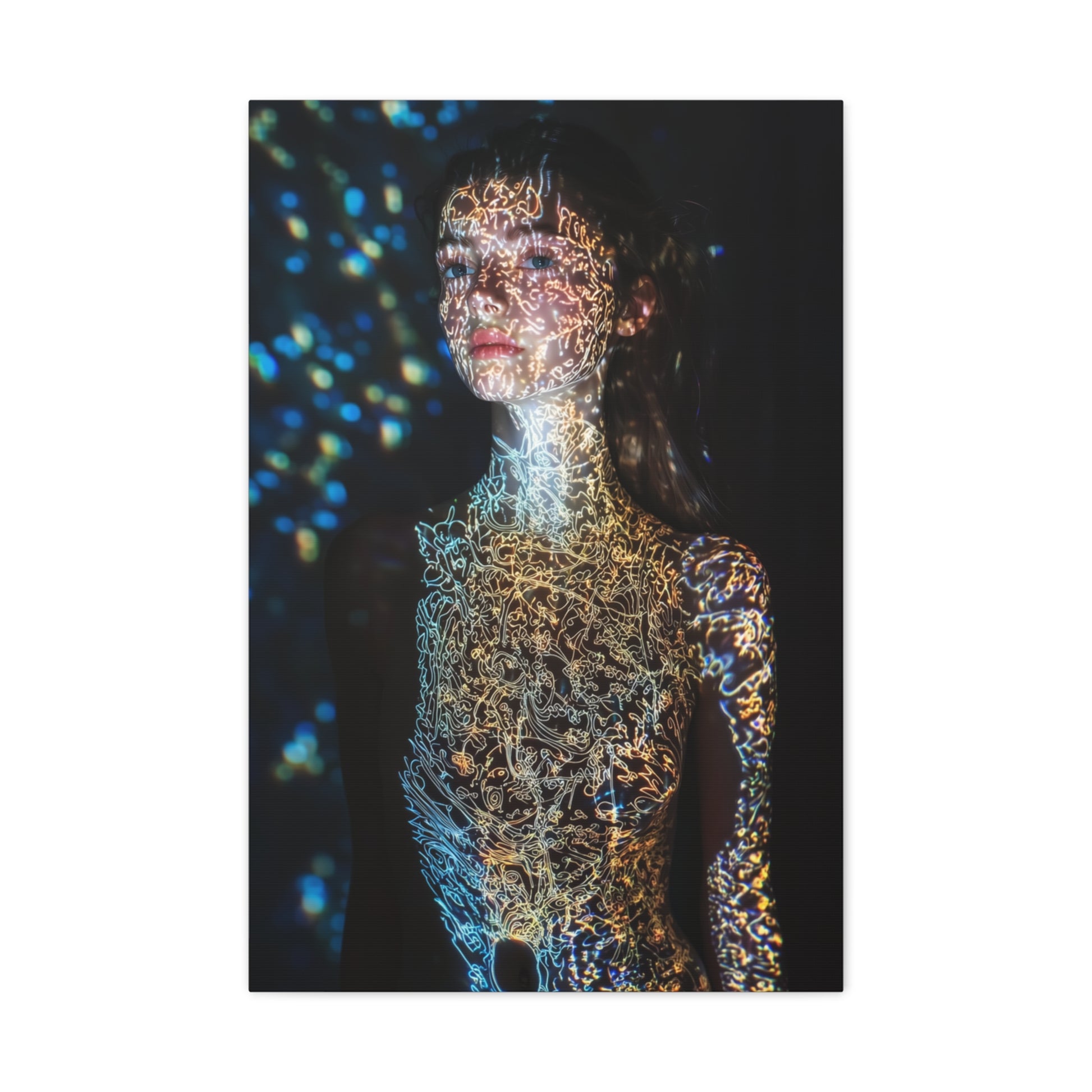 Bathed in a luminous tapestry, she stands as a living constellation, where light dances upon her skin, creating a celestial symphony. The patterns reveal a universe within, whispering secrets of the cosmos.