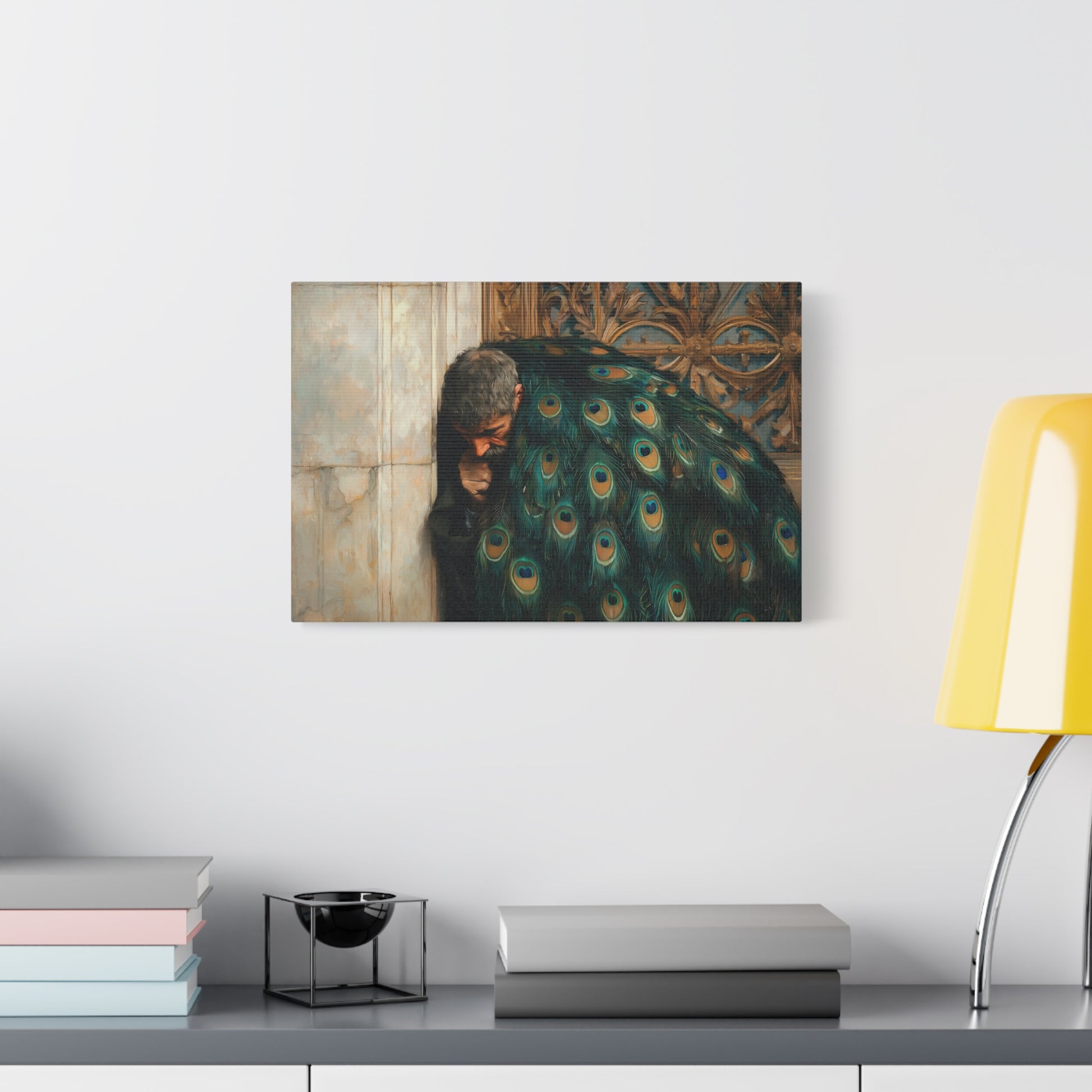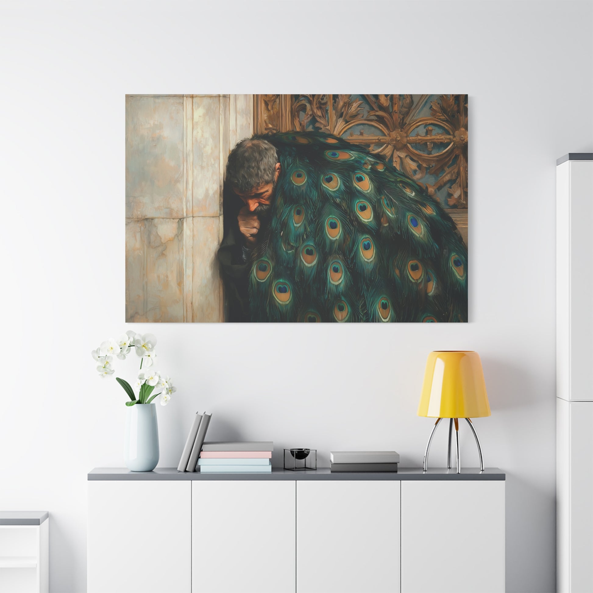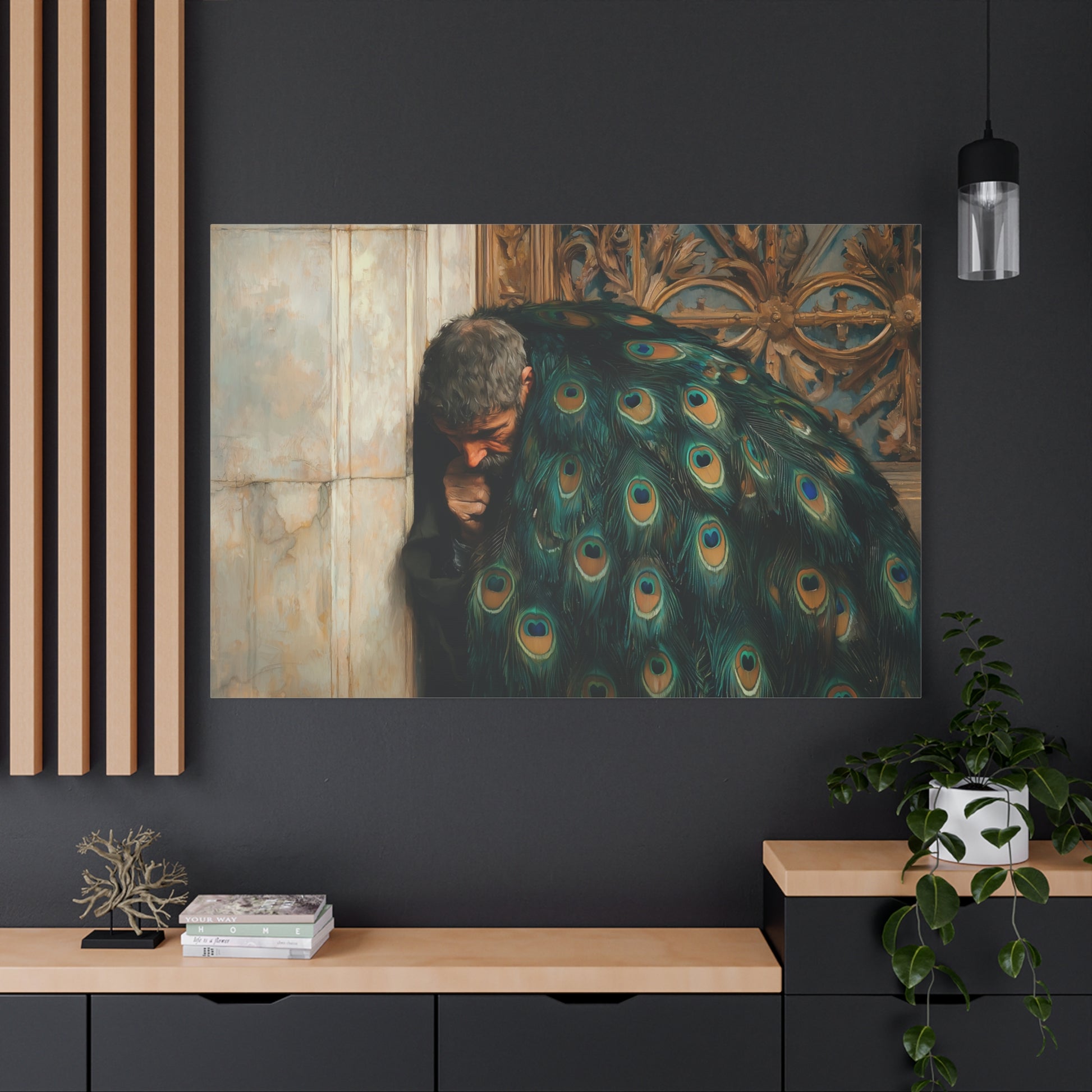 Beneath a cascade of resplendent feathers, a man seeks solace in quiet contemplation. The peacock's cloak envelops him, a vibrant shield against the world, whispering tales of hidden strength and introspection.