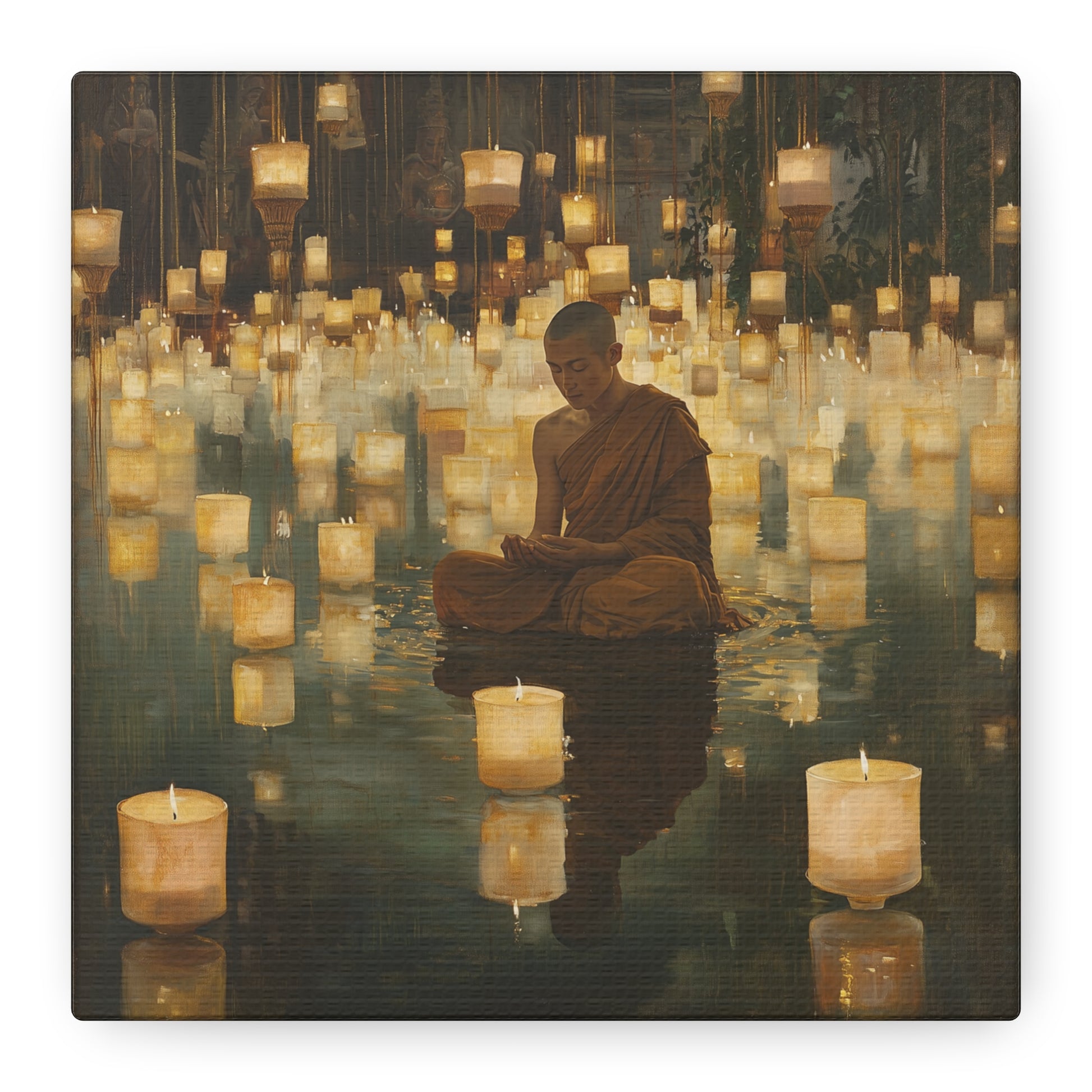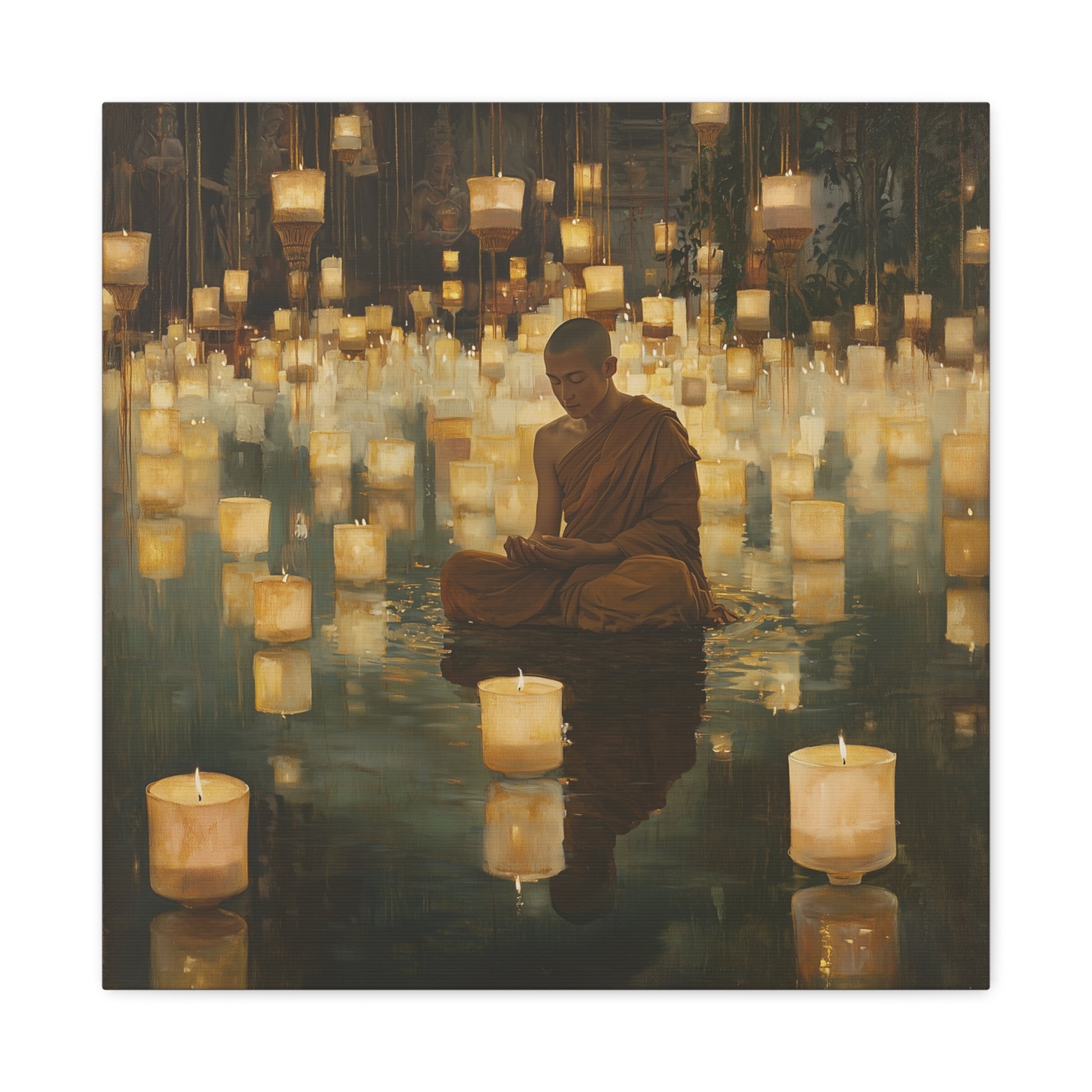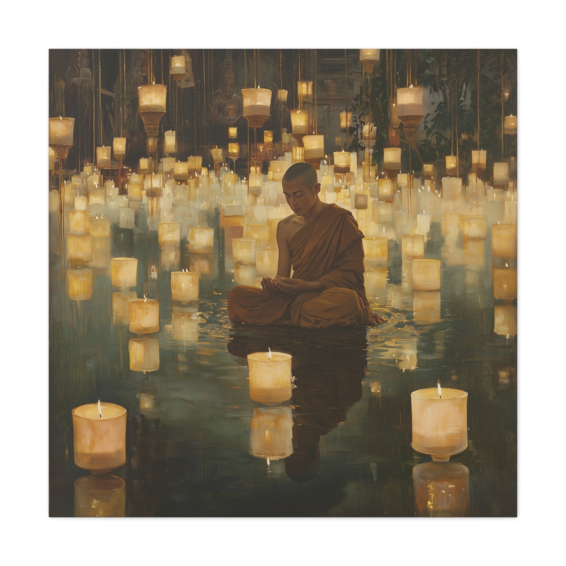 In a realm where light floats like whispered secrets, a monk finds peace amidst a sea of glowing lanterns. The gentle illumination reflects an inner journey, inviting contemplation and serenity within the heart's quiet depths.