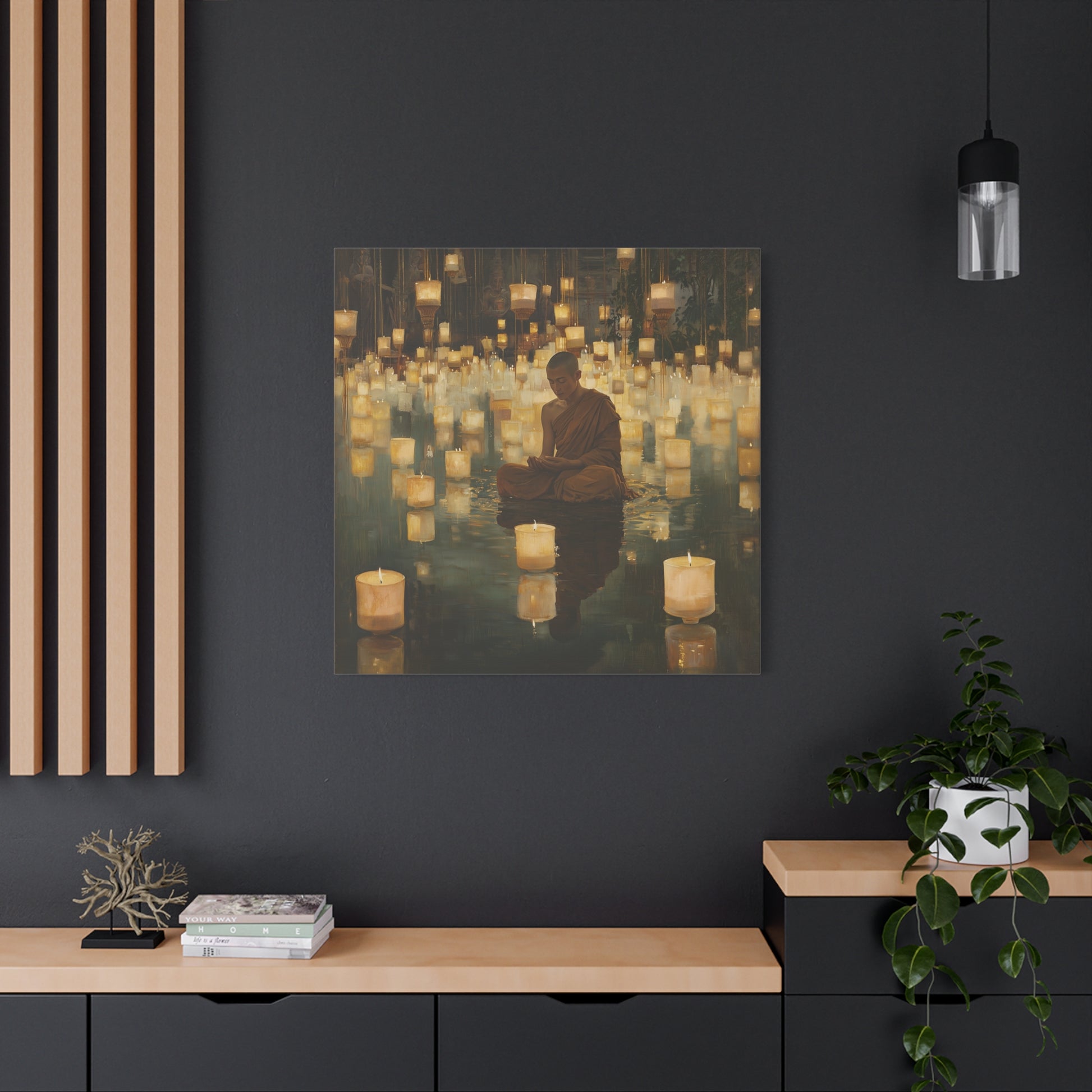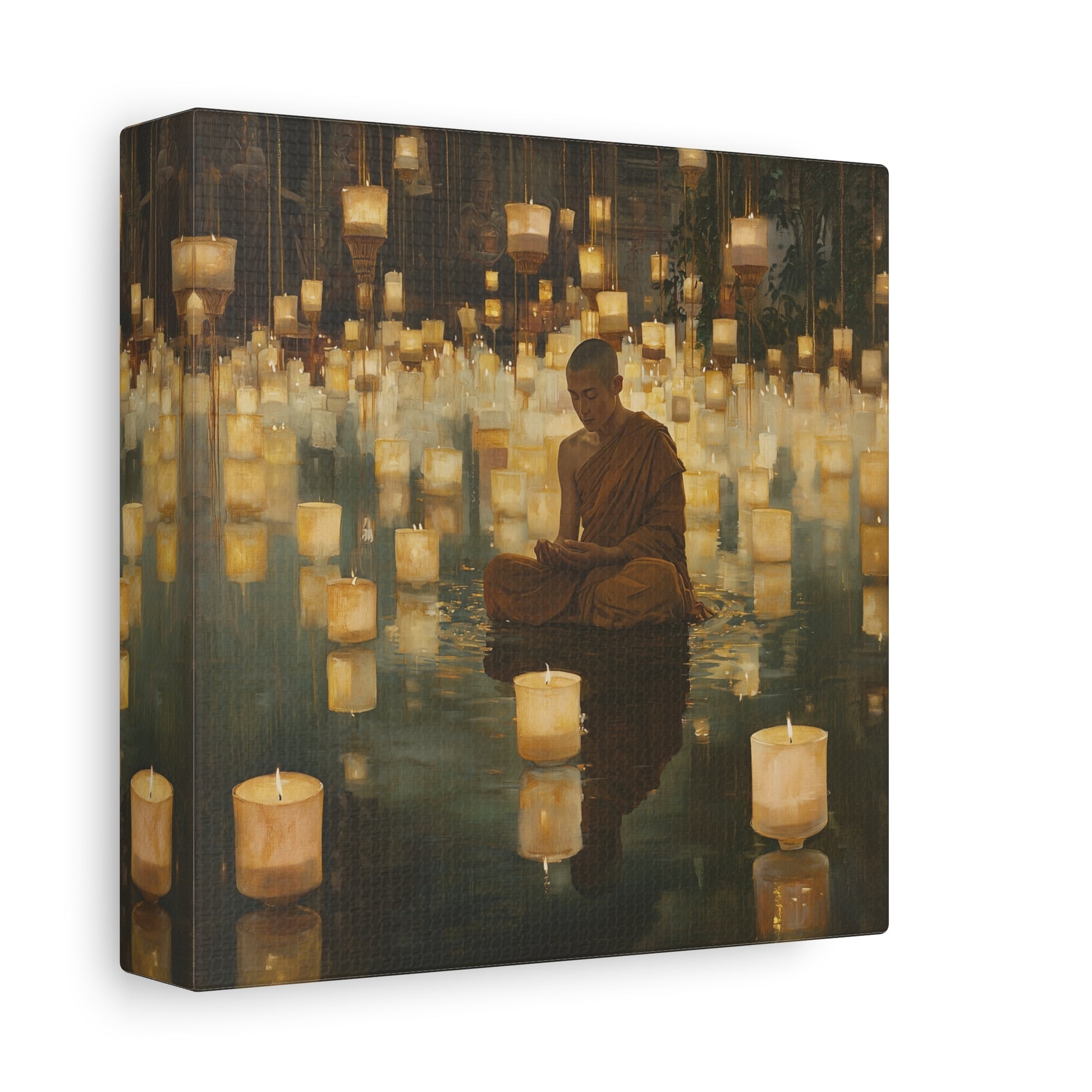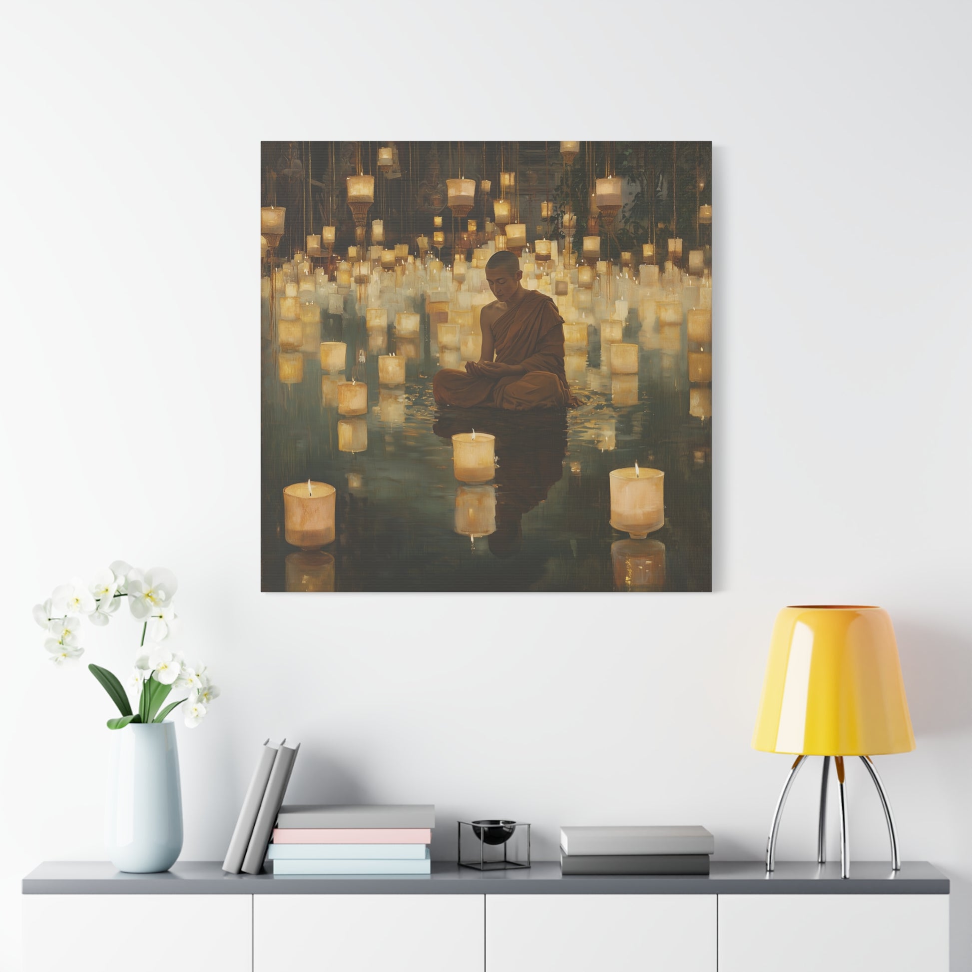 In a realm where light floats like whispered secrets, a monk finds peace amidst a sea of glowing lanterns. The gentle illumination reflects an inner journey, inviting contemplation and serenity within the heart's quiet depths.