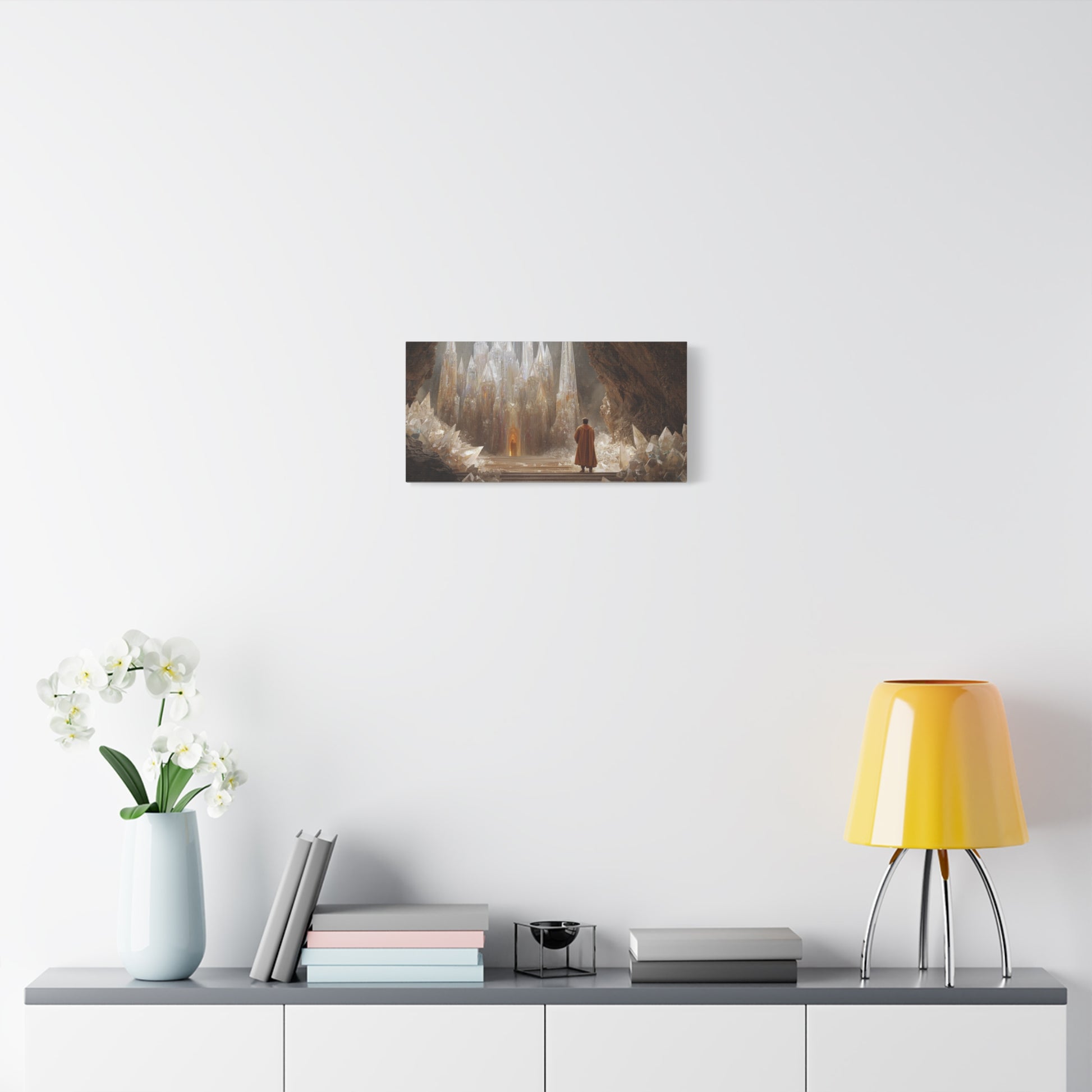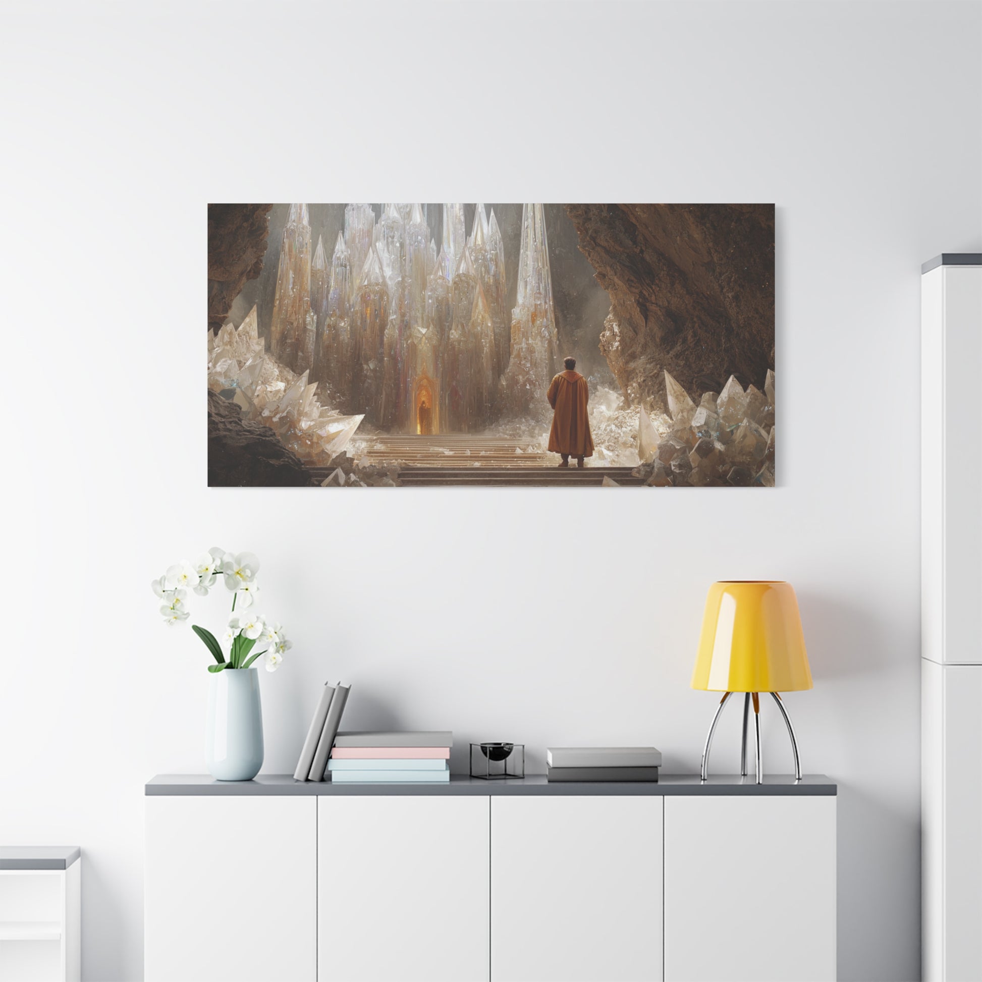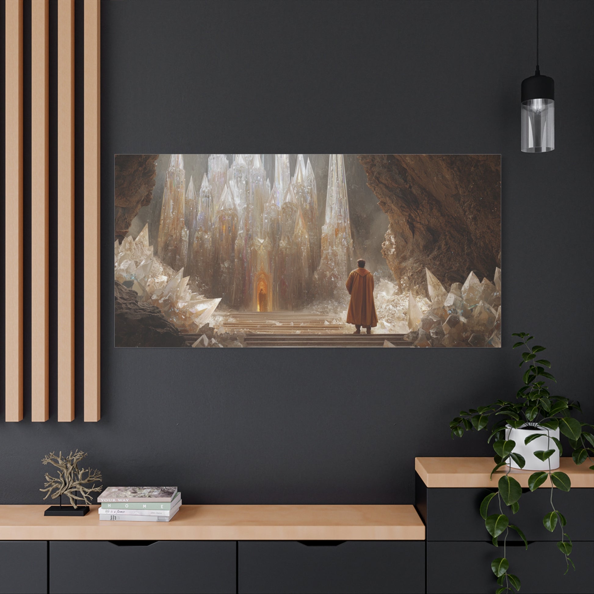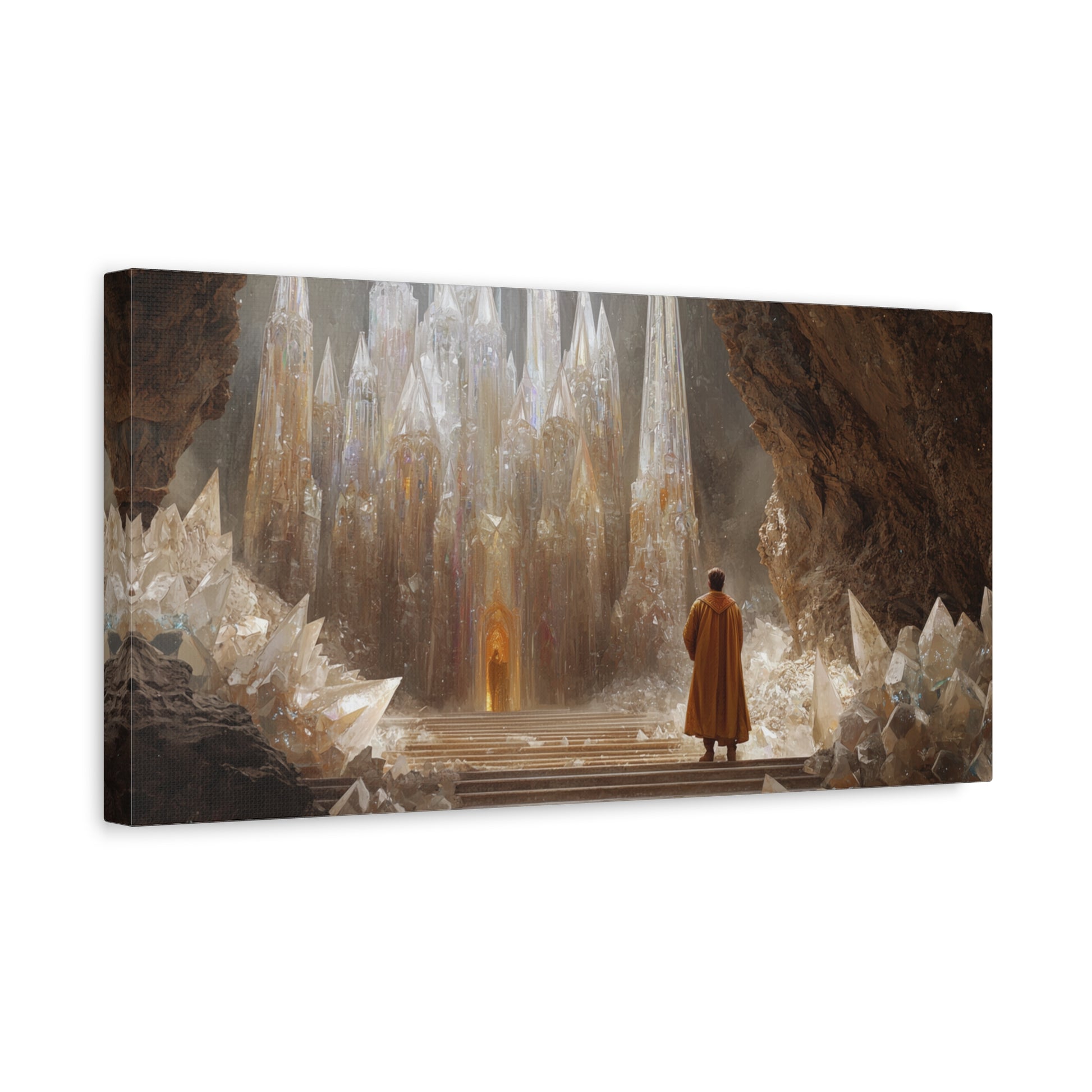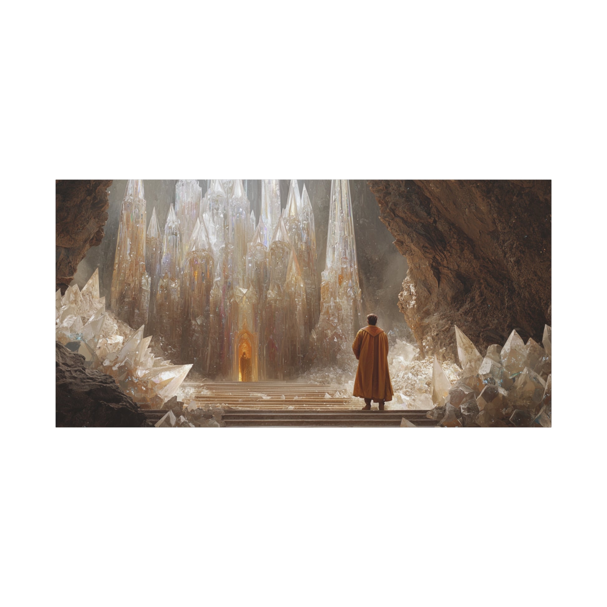Within the cavern's embrace, a crystalline fortress rises, shimmering with ancient light. The lone figure stands, poised on the threshold of wonder and discovery, where dreams and reality converge in luminous harmony.