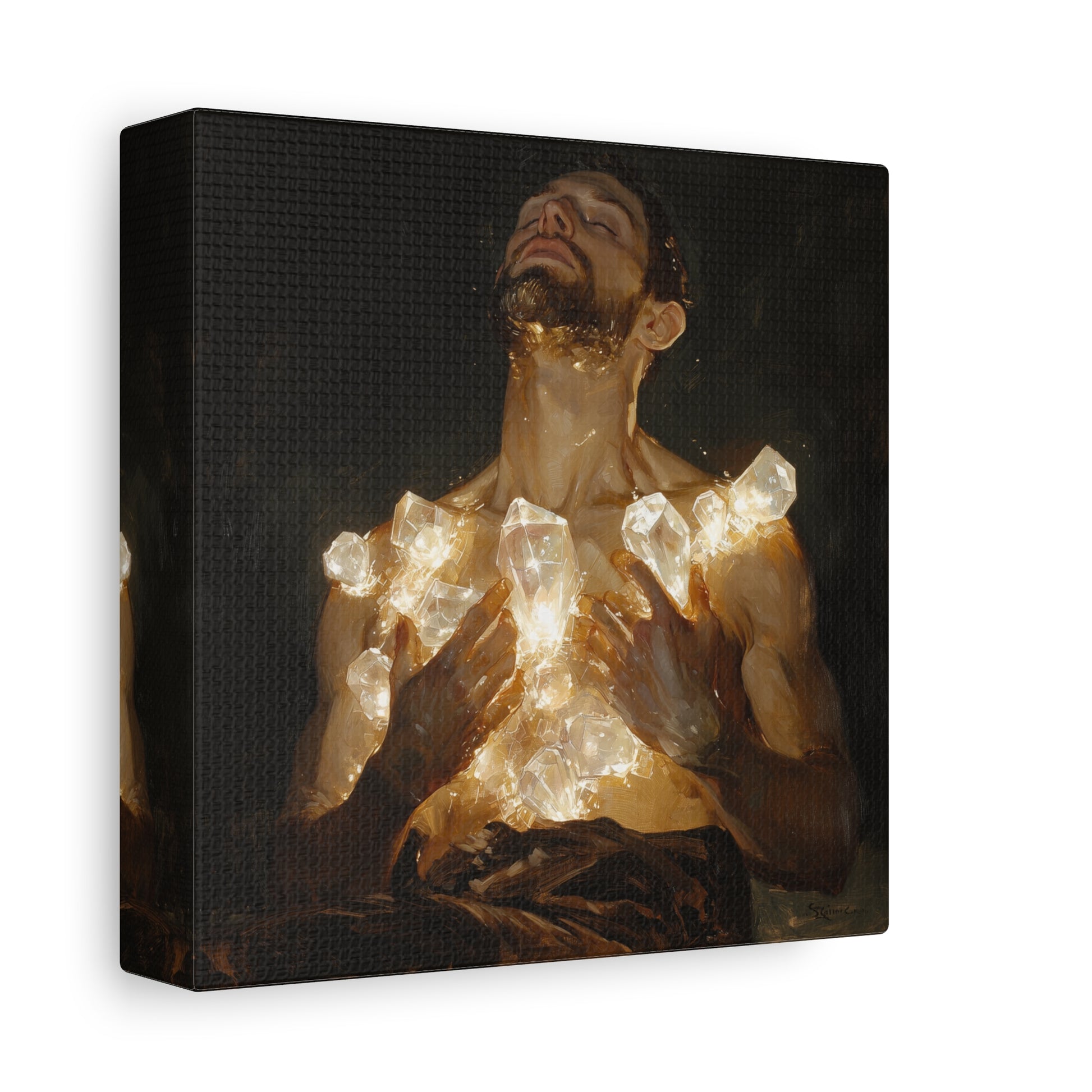 Bathed in ethereal light, the figure ascends within a cocoon of crystals, each facet capturing dreams and desires. An inner glow radiates outward, enveloping the soul in a dance of luminous serenity.