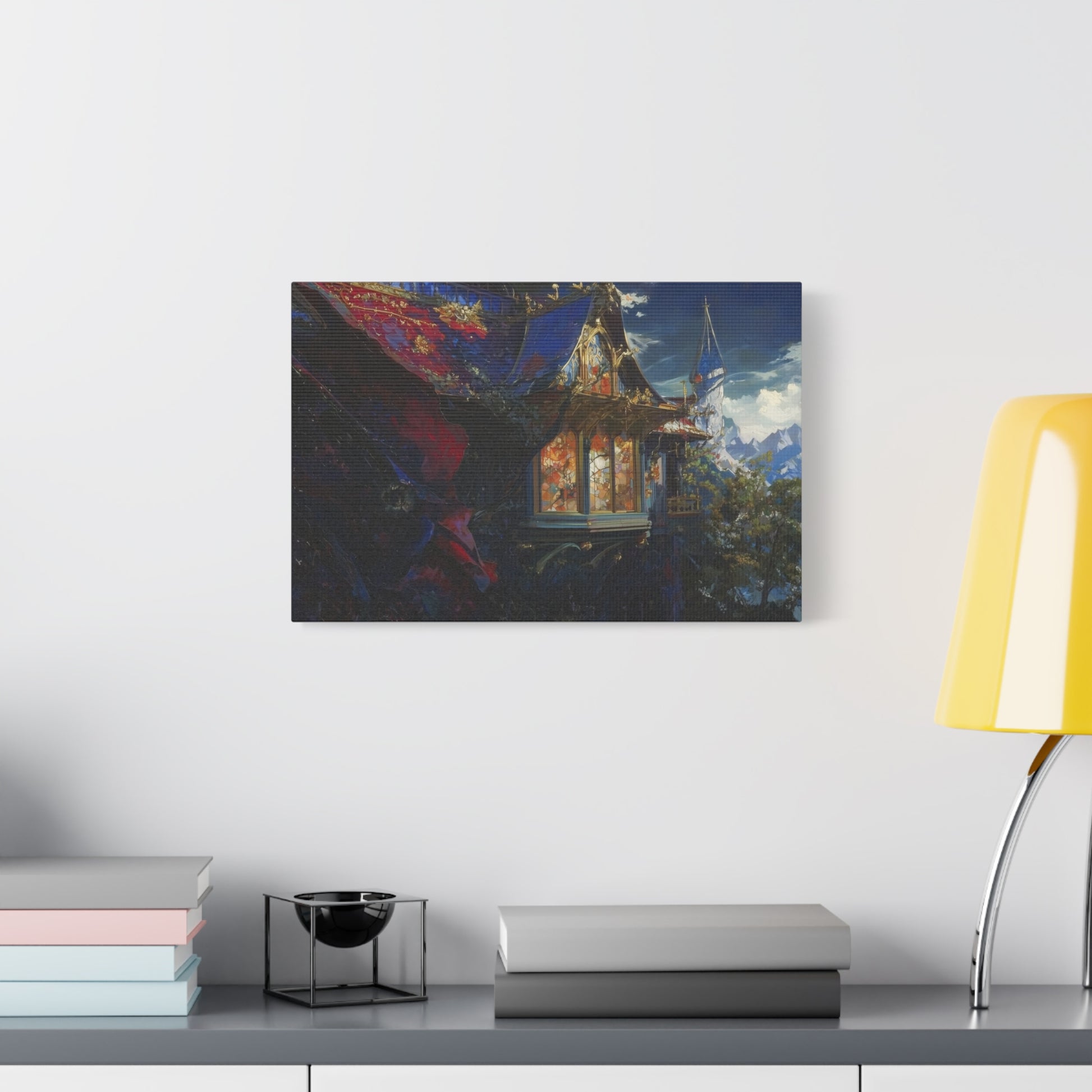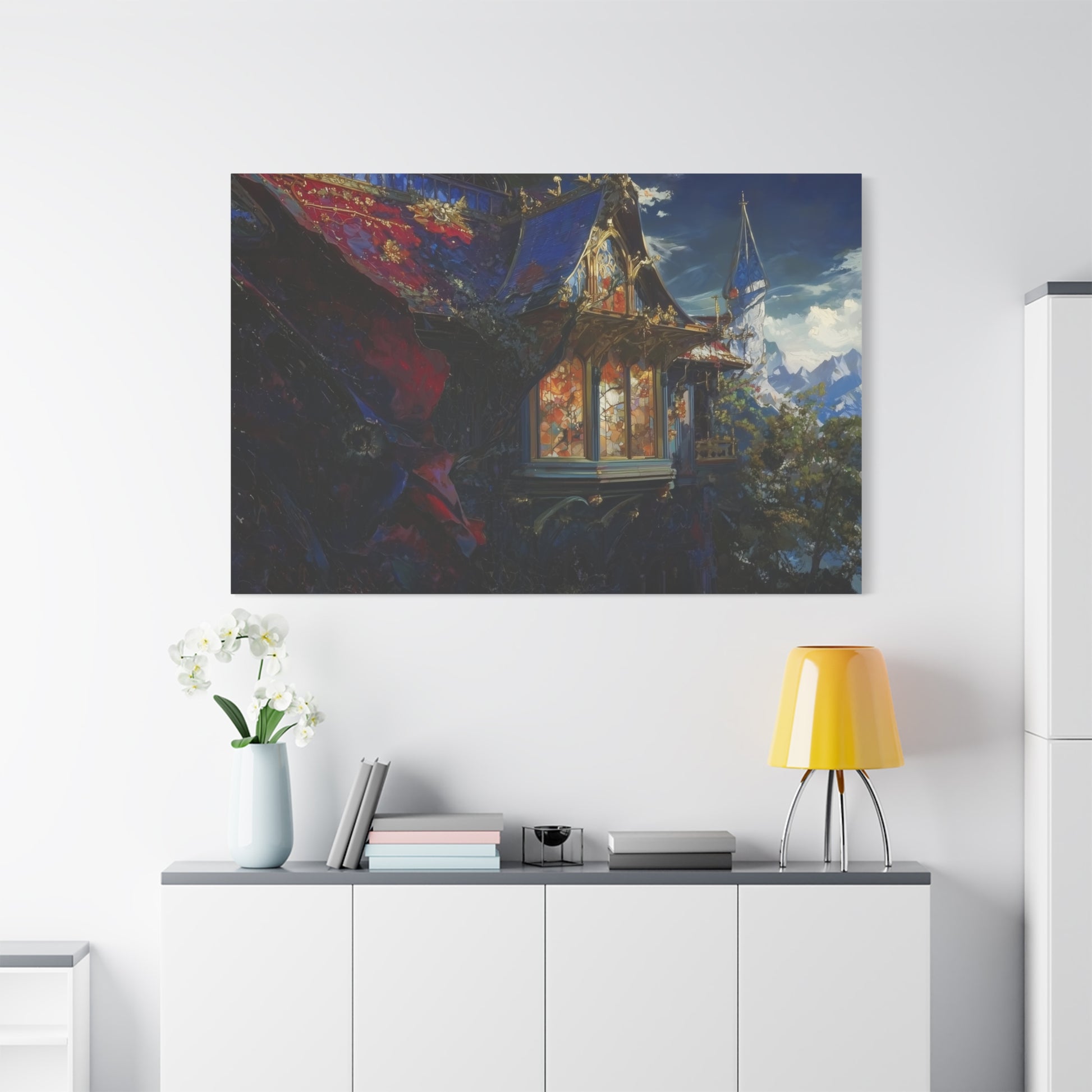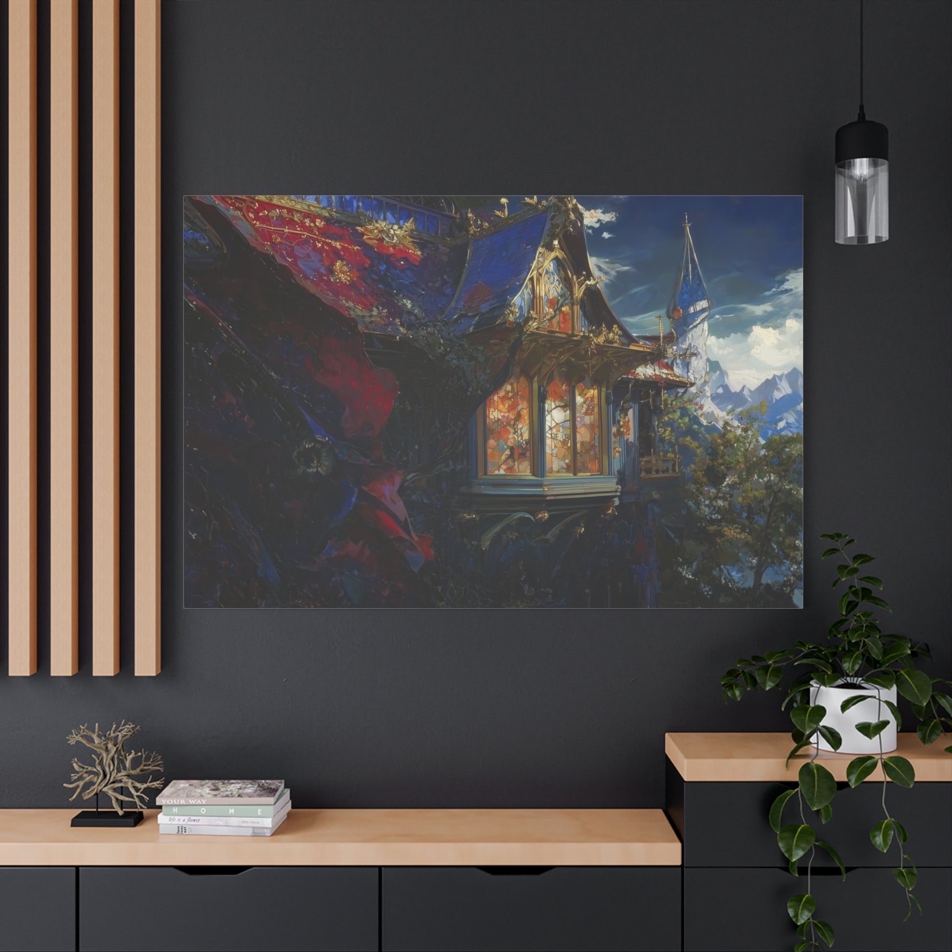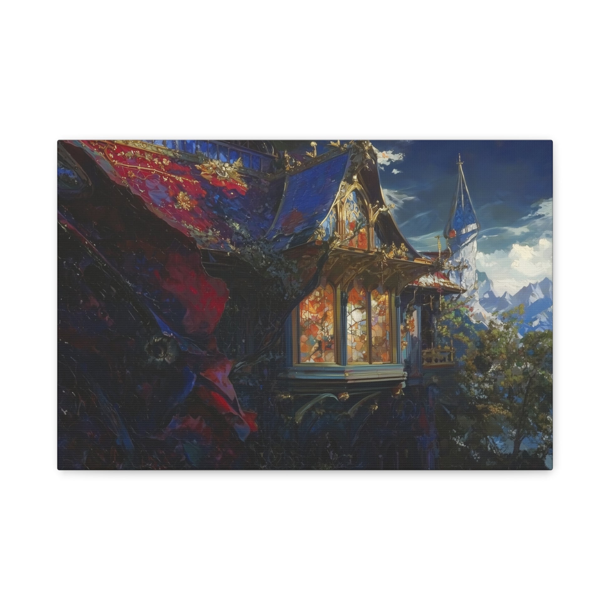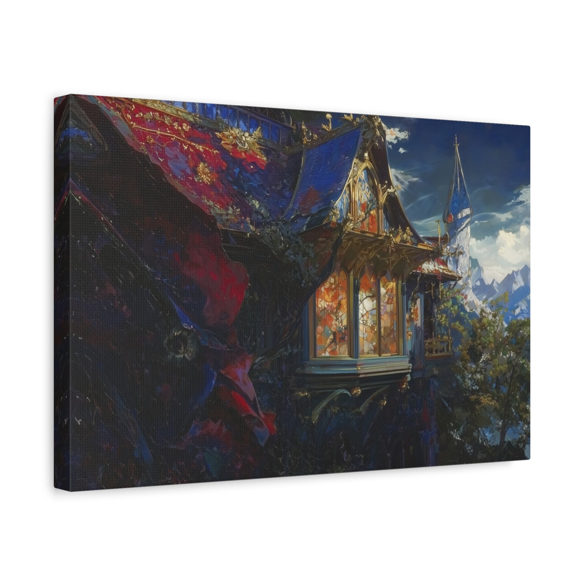 A mystical abode stands against a twilight sky, its stained glass whispering tales of forgotten worlds. The air shimmers with the promise of ancient secrets, beckoning the soul to wander through dreams and shadows.