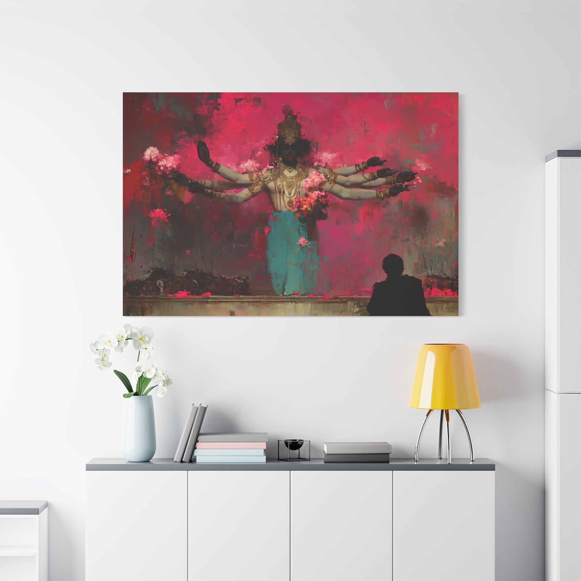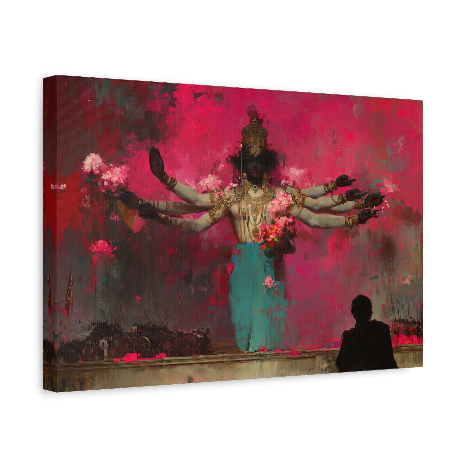 A deity shrouded in vivid hues, weaving tales of ancient grace and power. Each blossom whispers secrets of worlds unseen, inviting the soul to dance between realms of mystery and reverence.