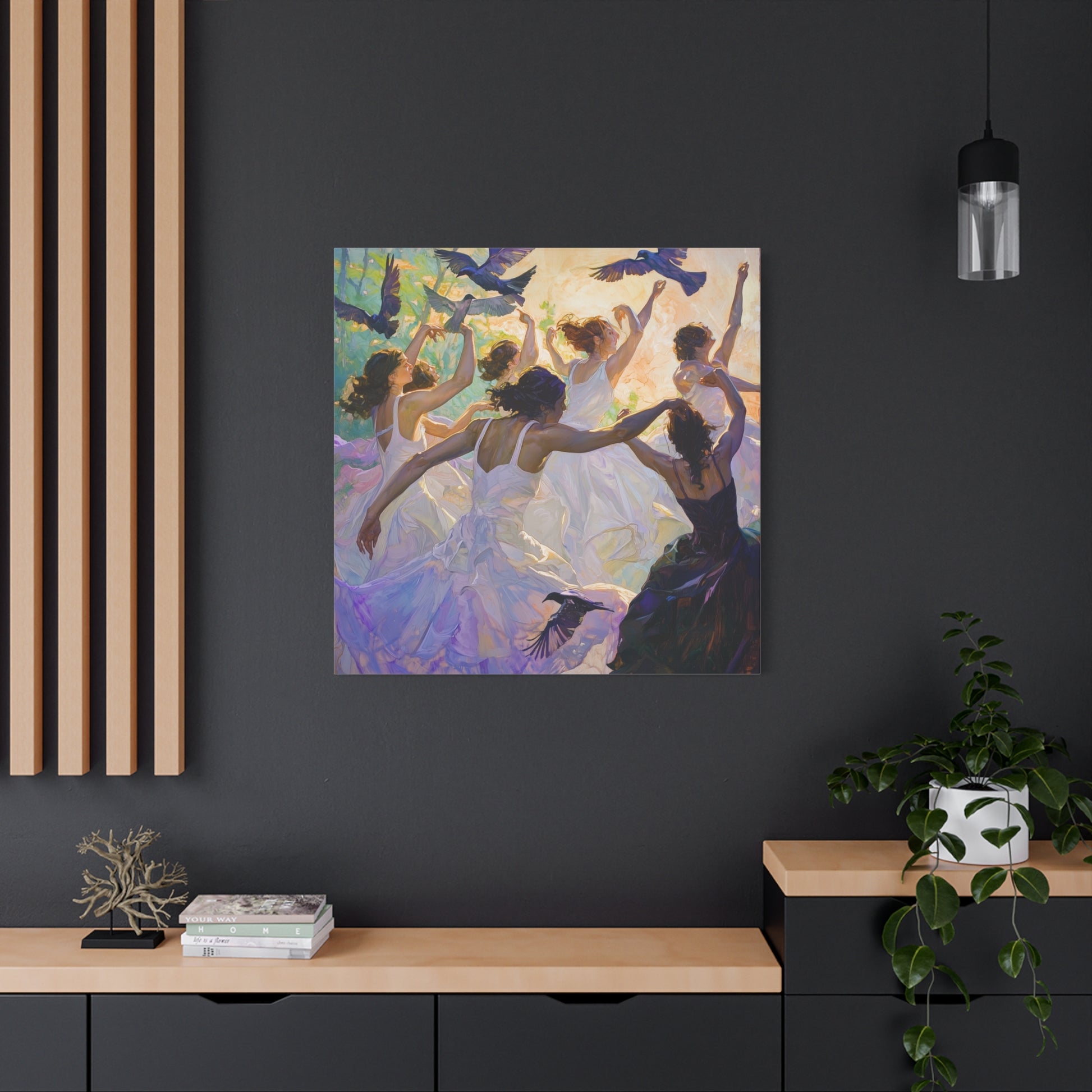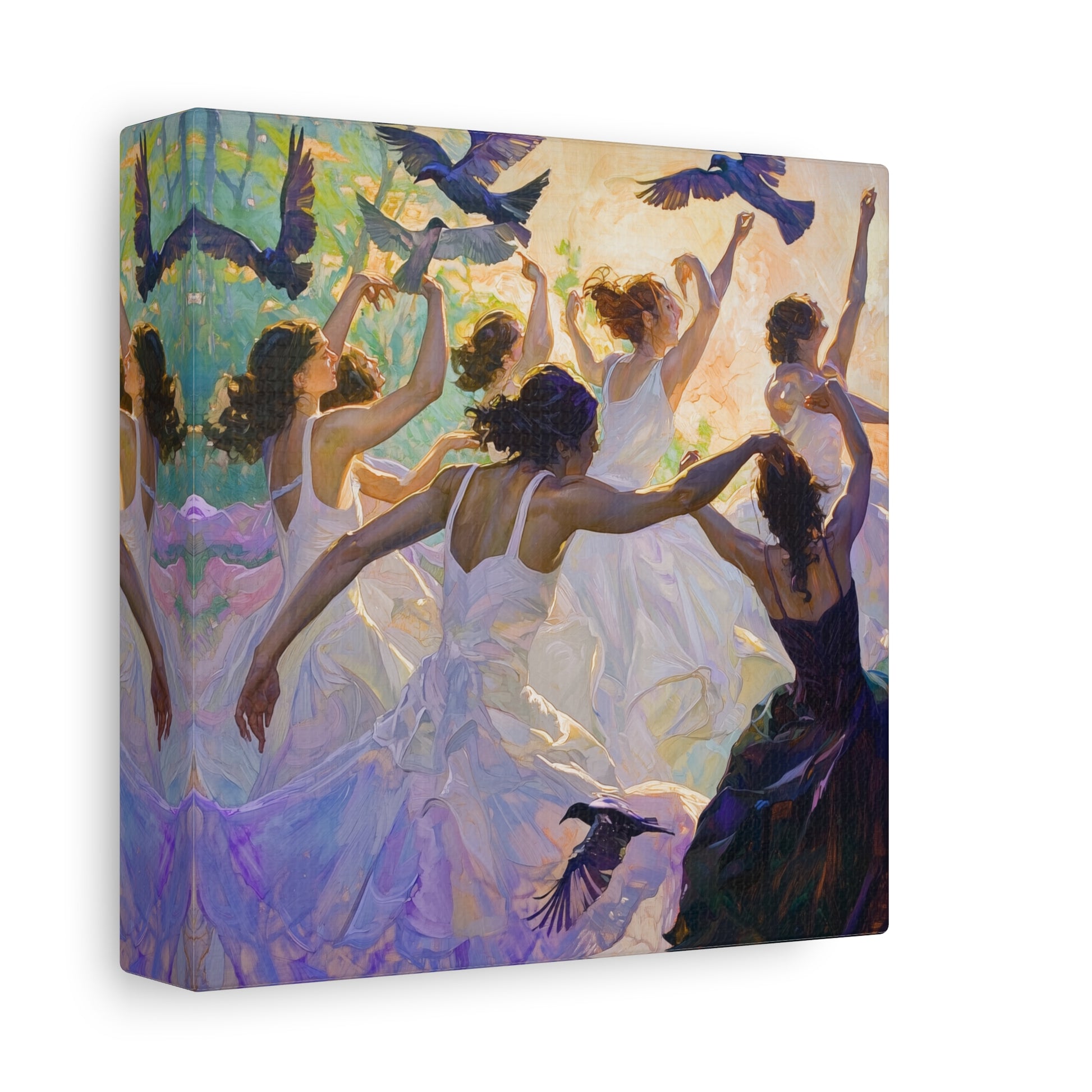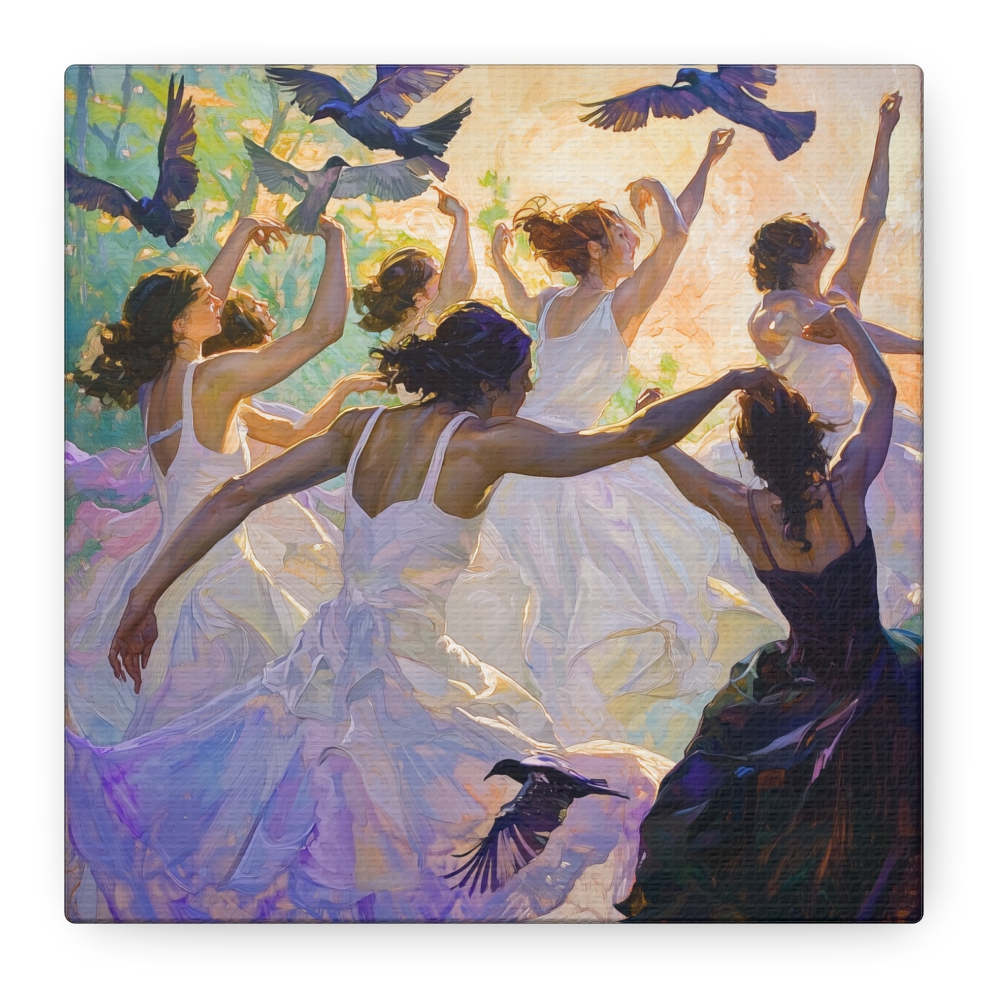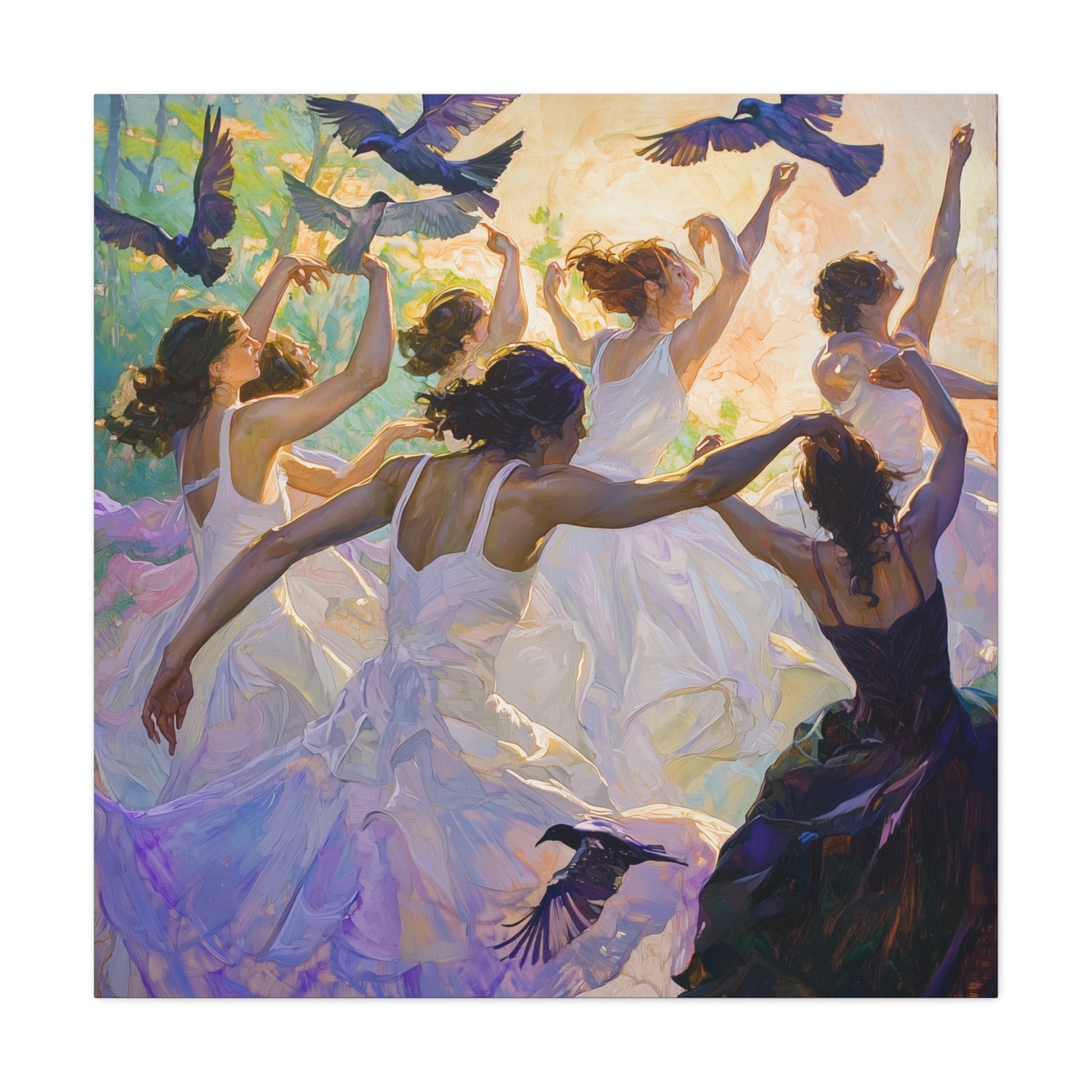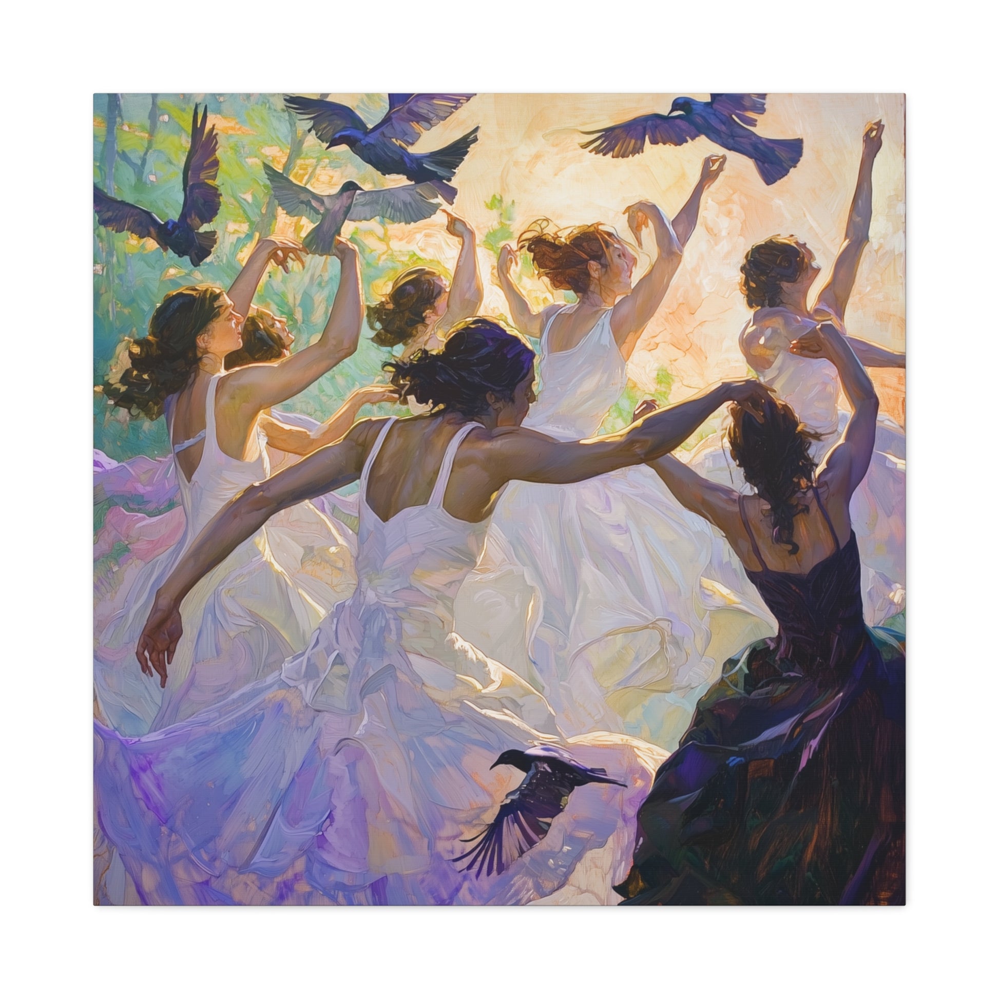 In a swirl of luminous elegance, figures and feathers entwine, celebrating an ethereal dance beneath the awakening sky. The moment is a symphony of freedom and grace, where movement becomes melody and light.