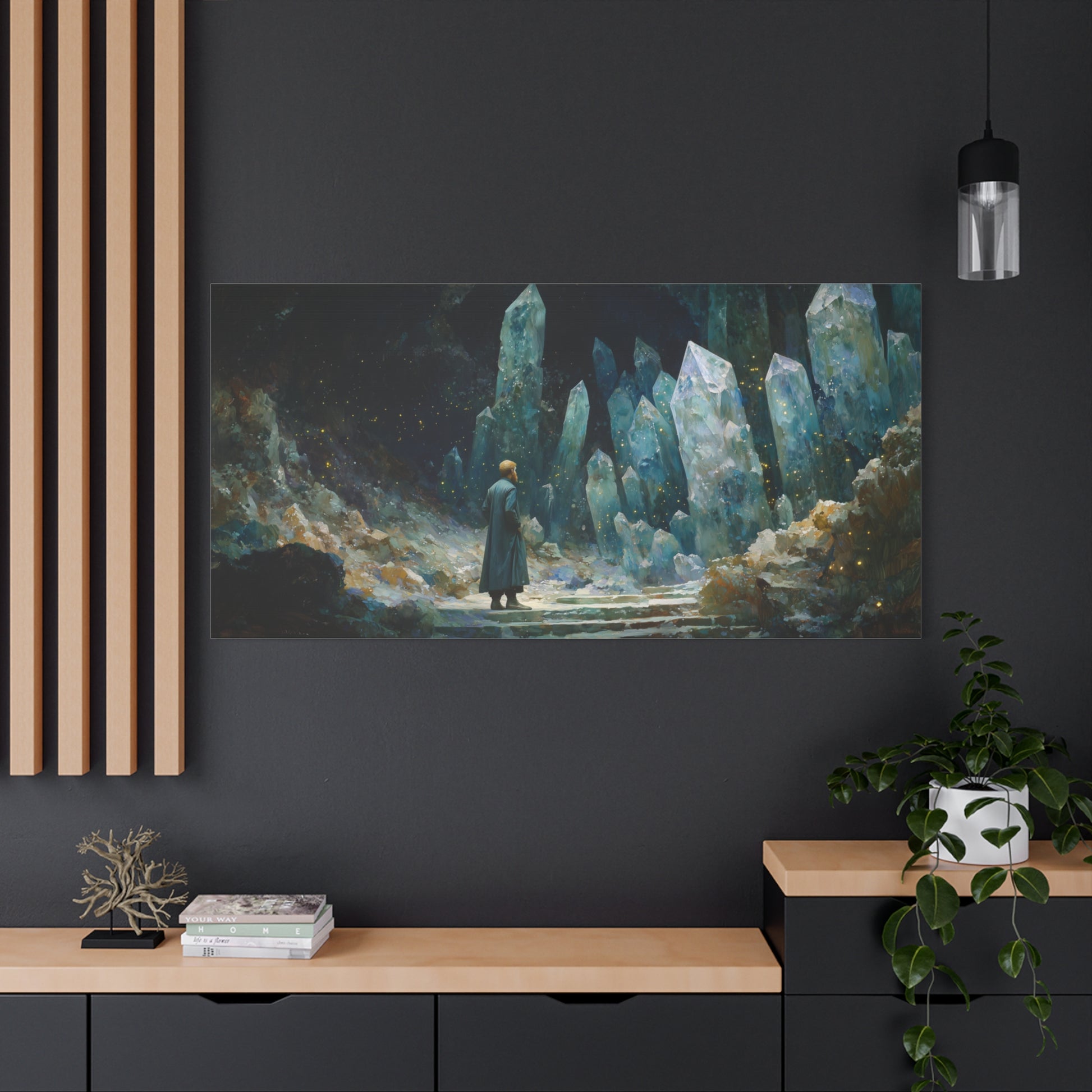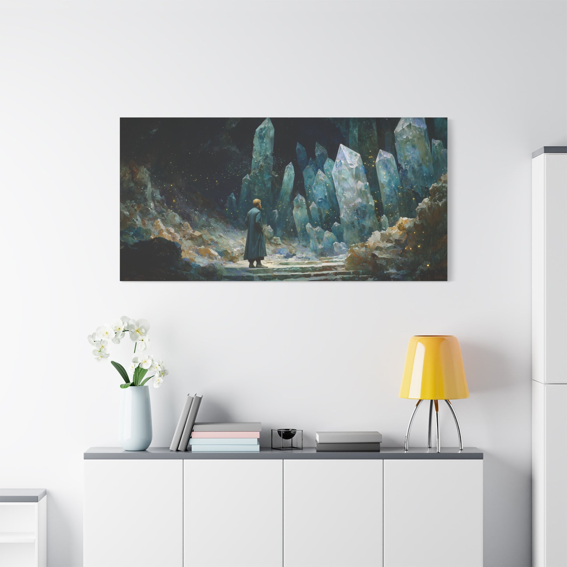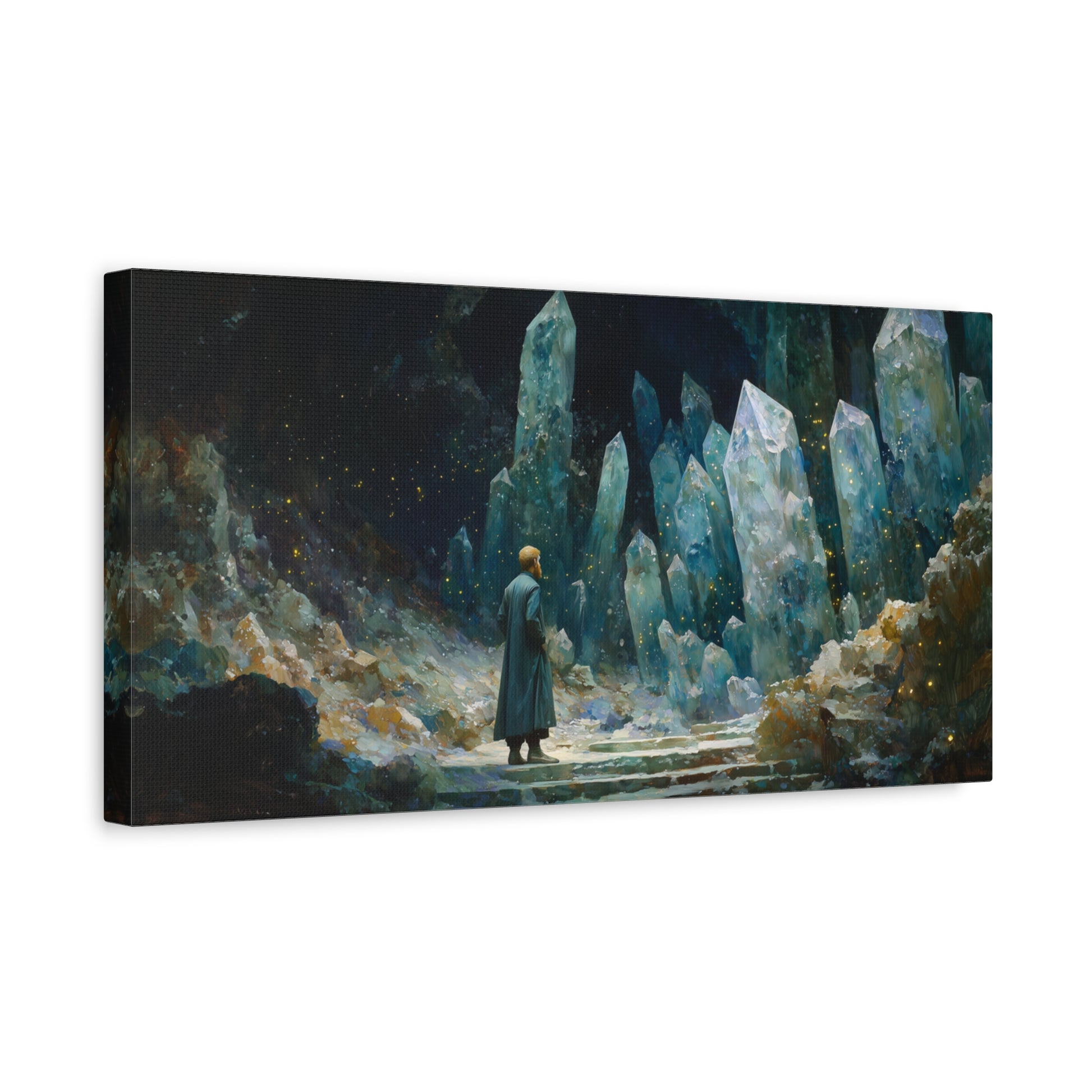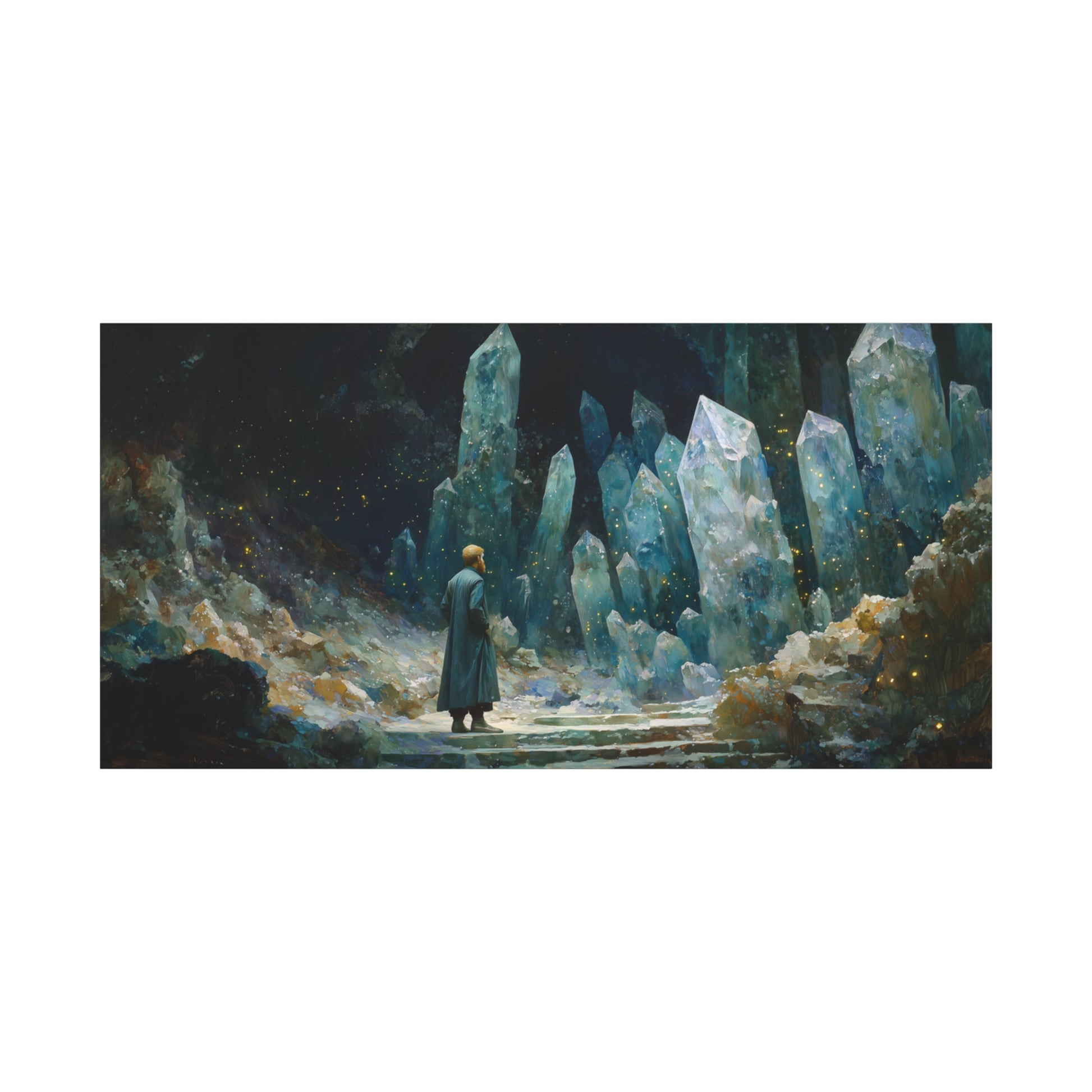 In a cavern of shimmering giants, a solitary figure stands amidst the ethereal glow. The crystalline pillars reach skyward, whispering secrets of time and space, inviting the wanderer to step beyond the known.