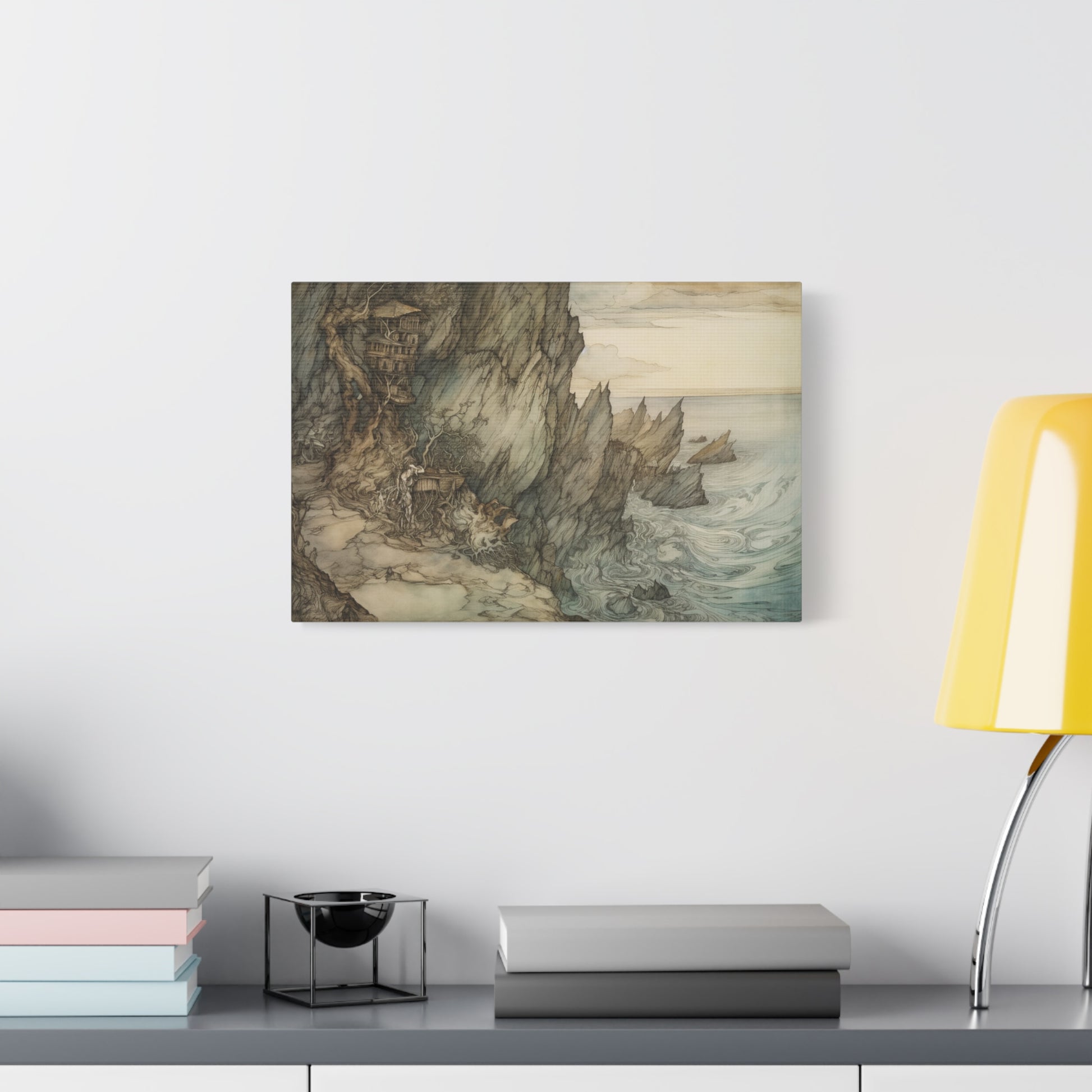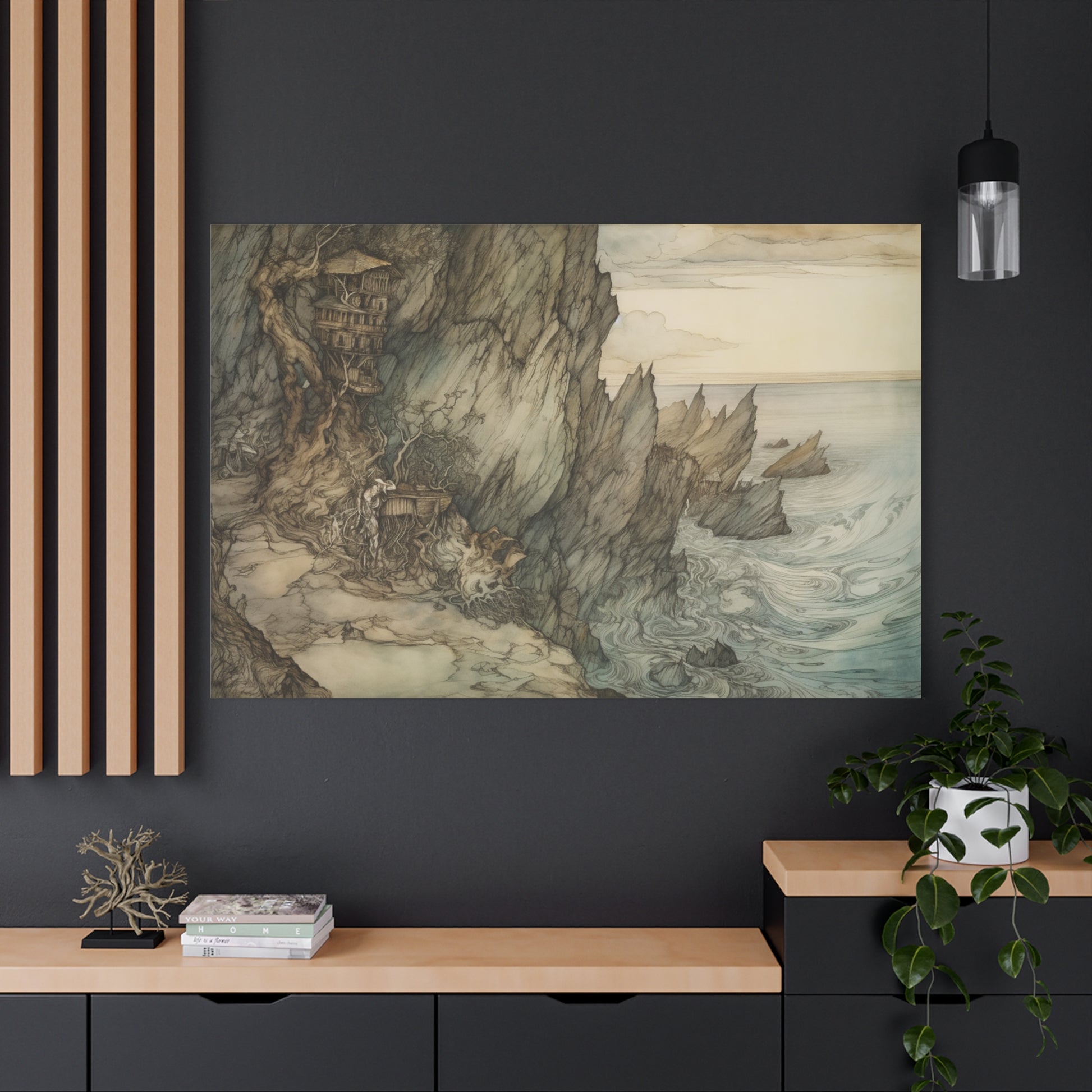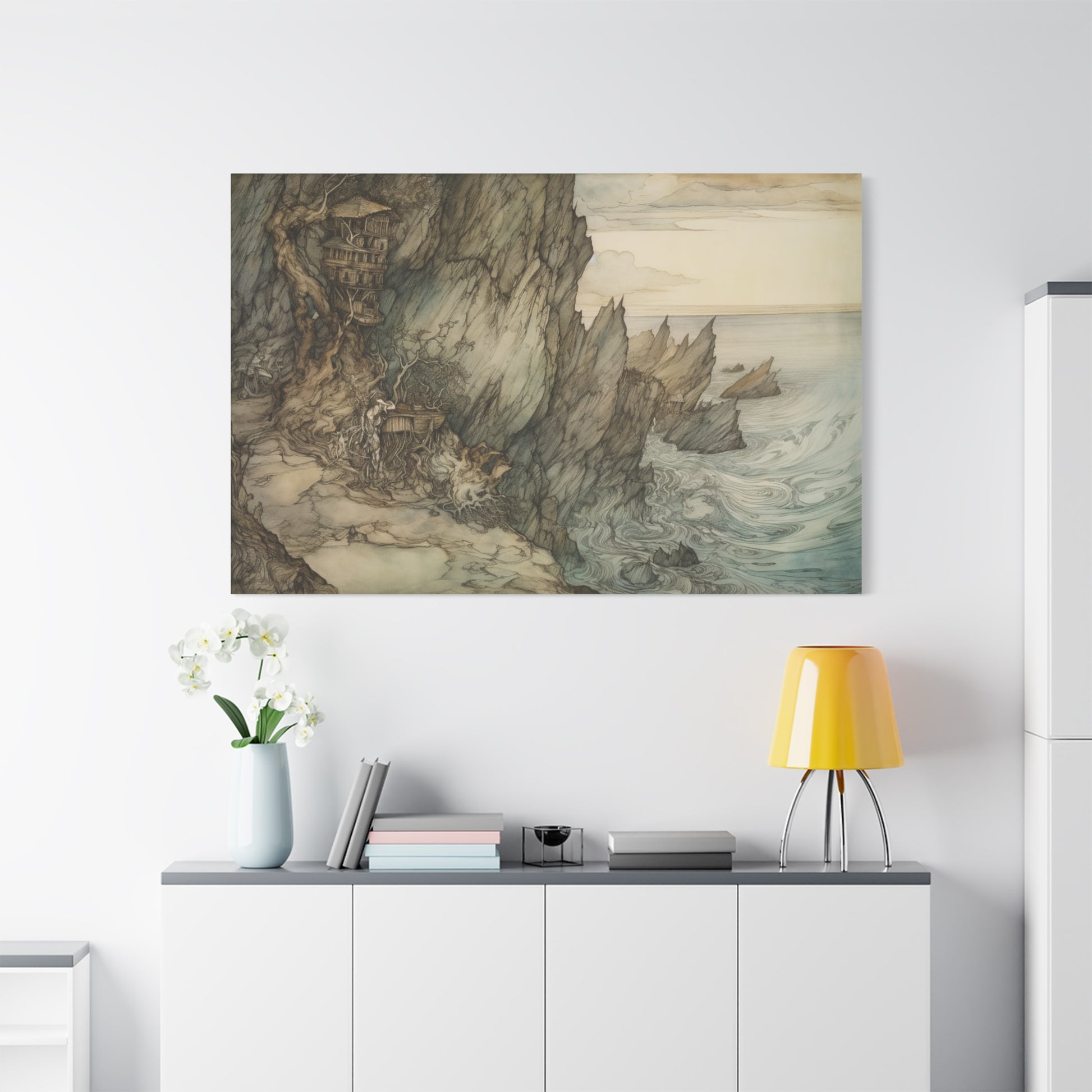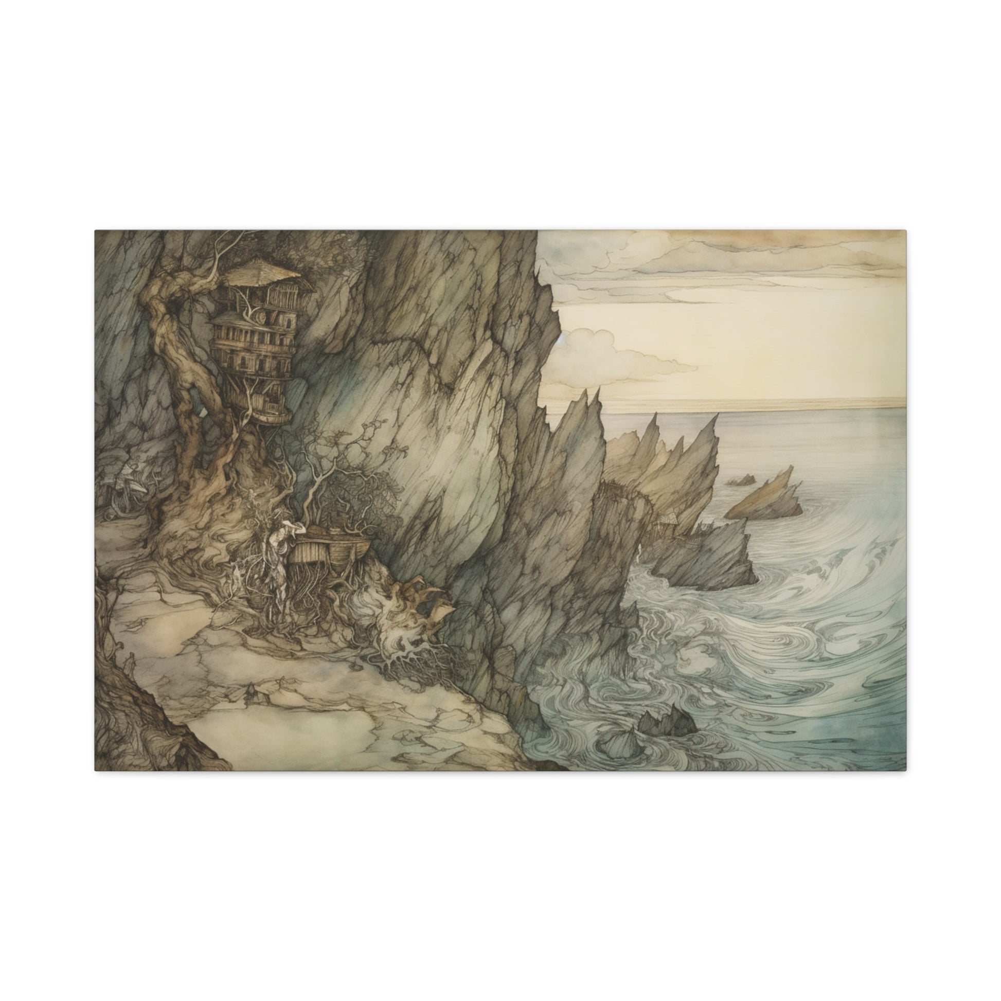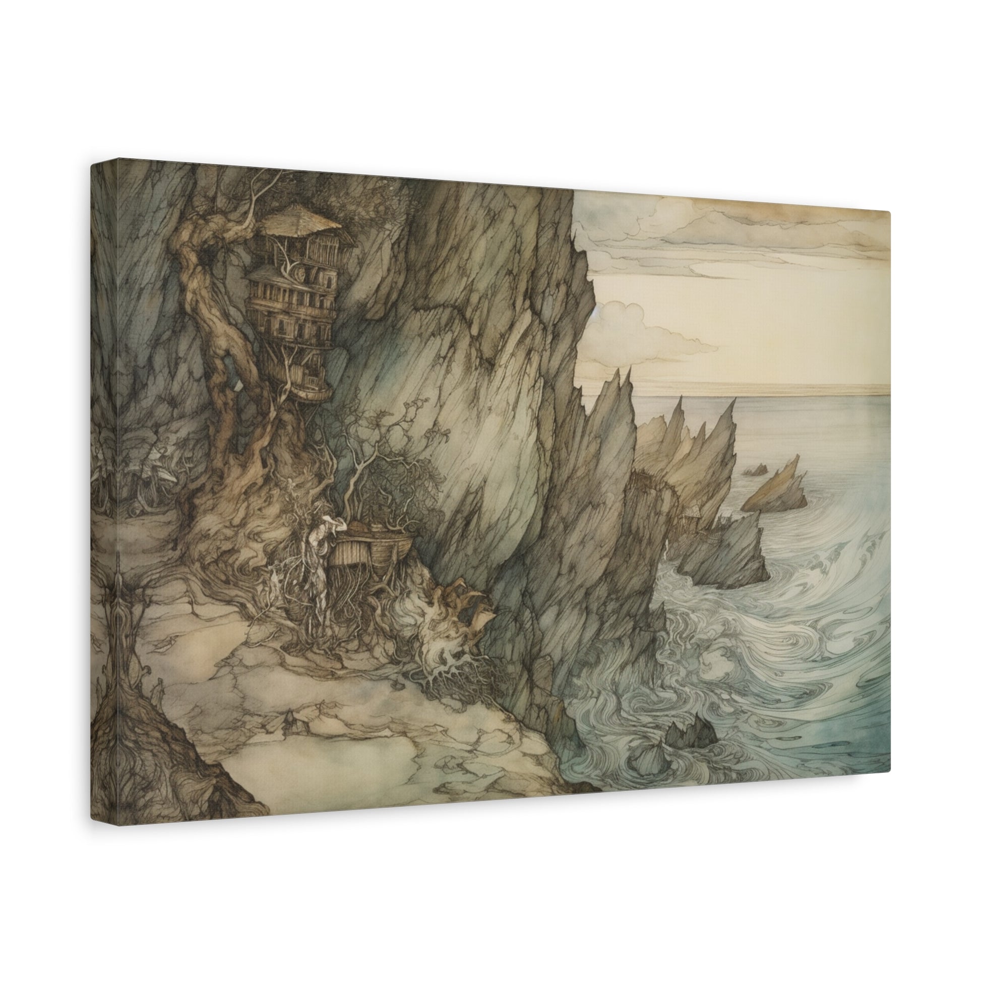 Perched on ancient cliffs, a sanctuary entwines with nature's roots, whispering secrets to the restless sea. The horizon blurs between worlds, inviting dreams and echoes from forgotten realms to dance upon the waves.