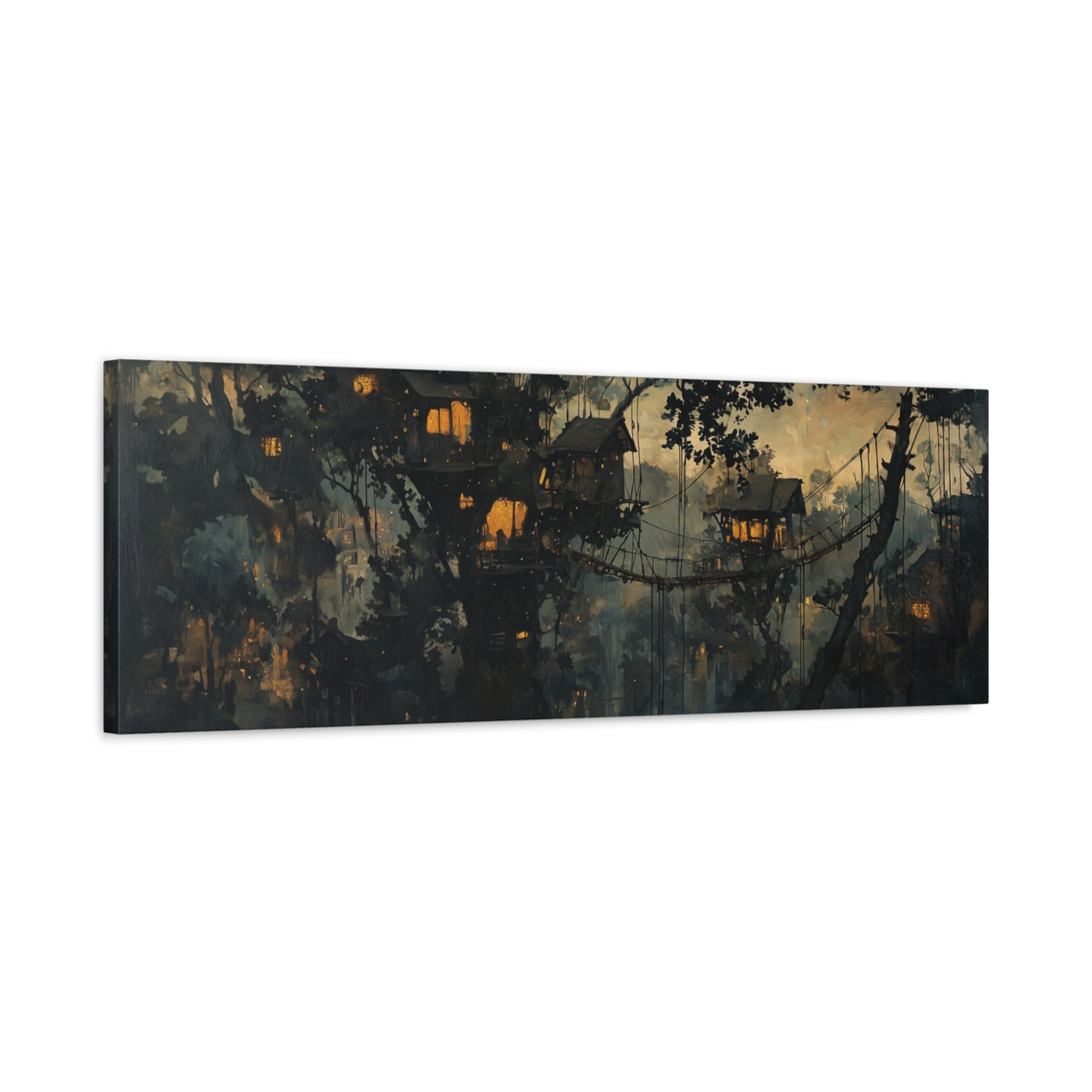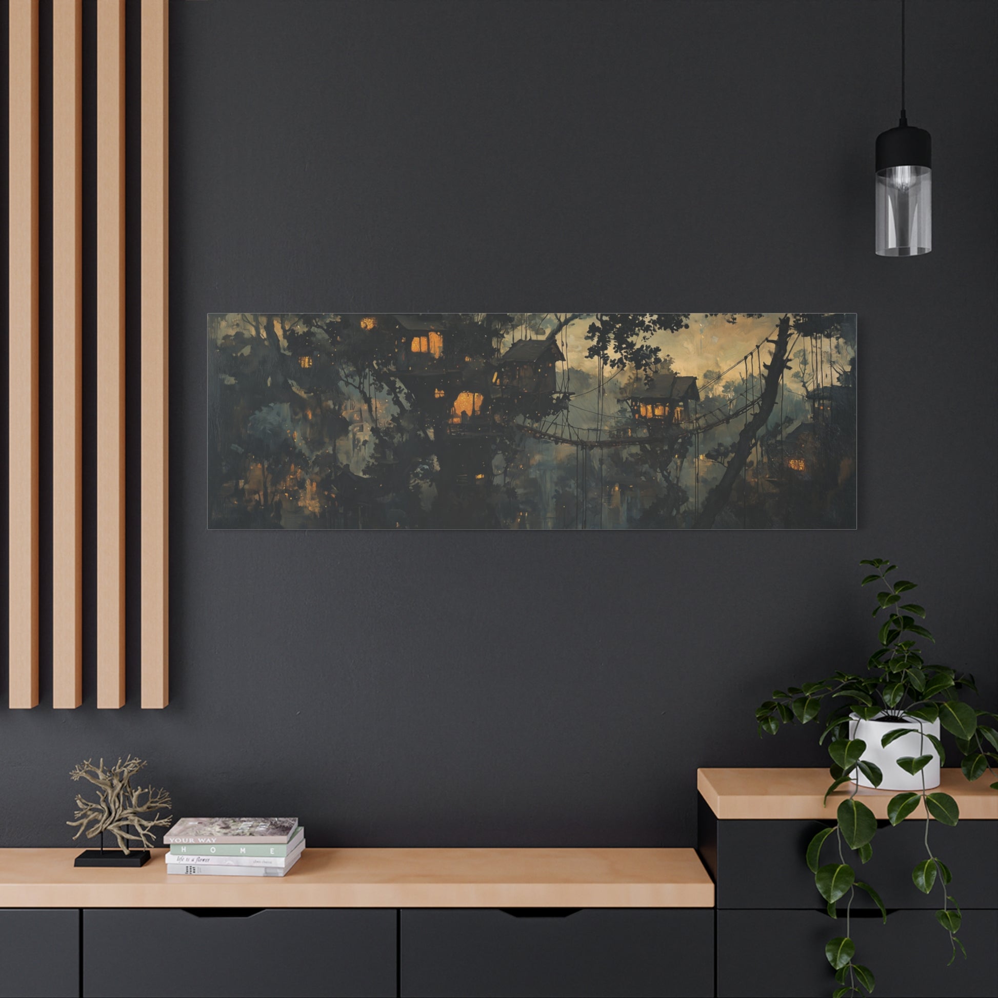 A hidden realm of glowing sanctuaries cradles the night, where the trees weave stories of old whispers. The soft glow of lanterns beckons with the promise of ancient secrets and tranquil dreams.