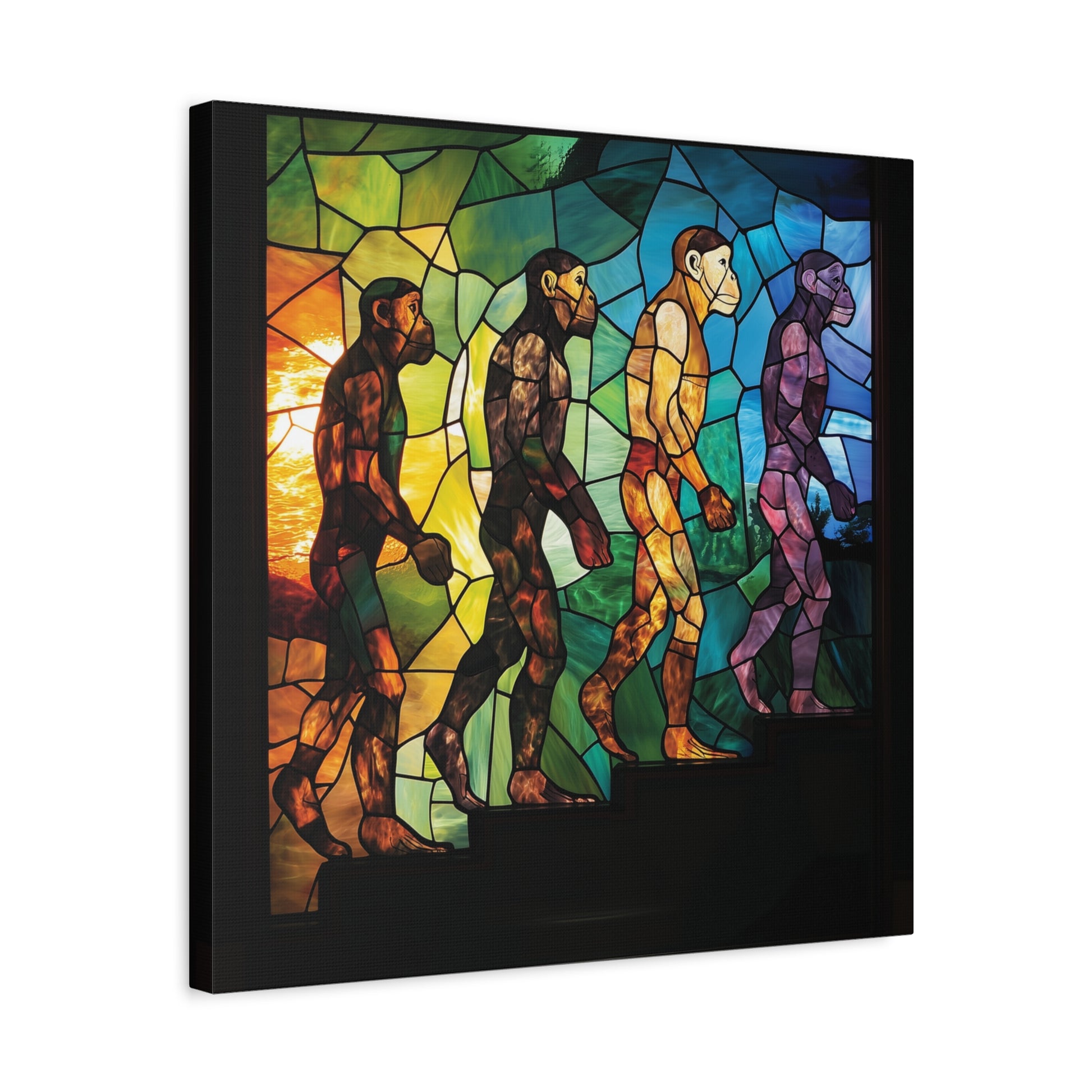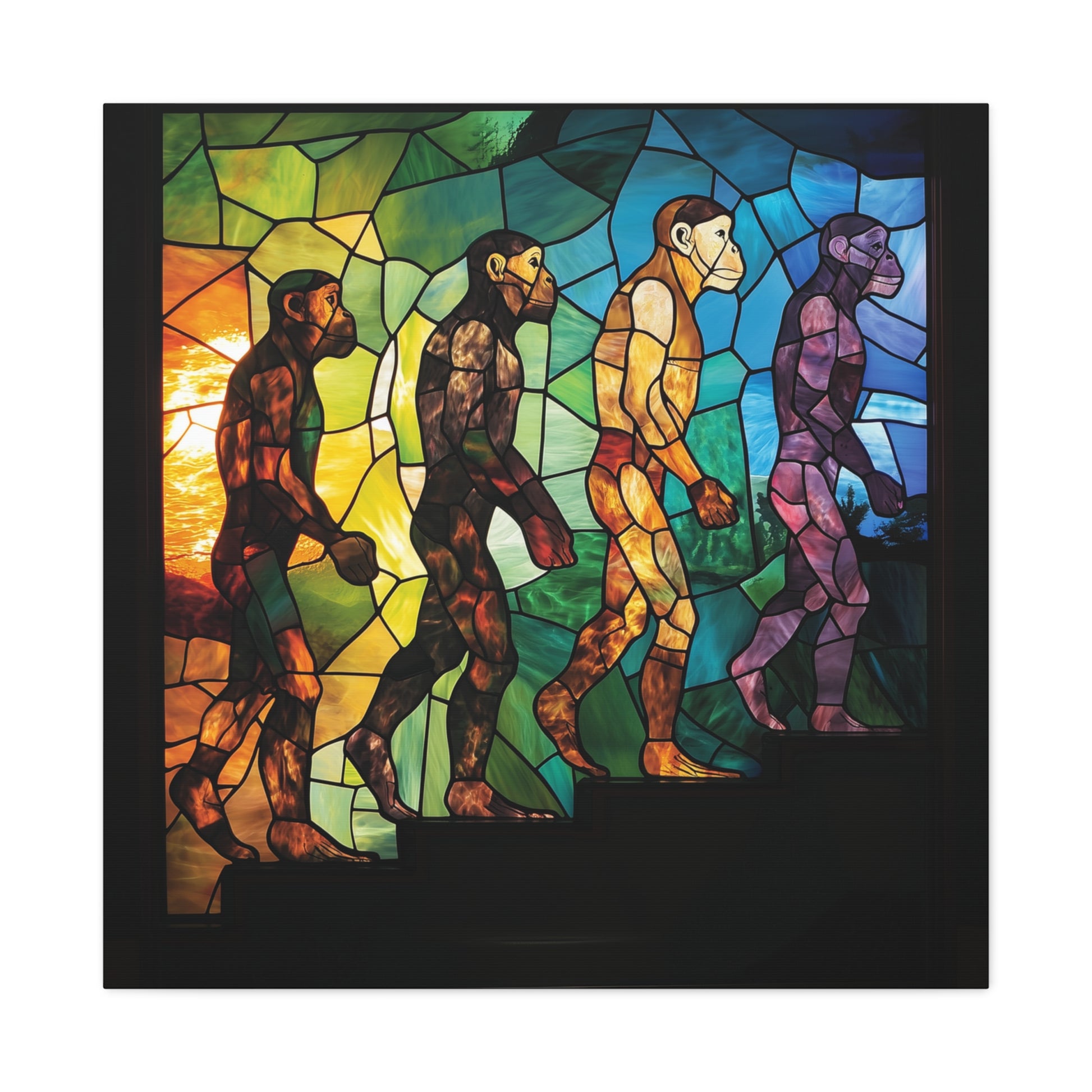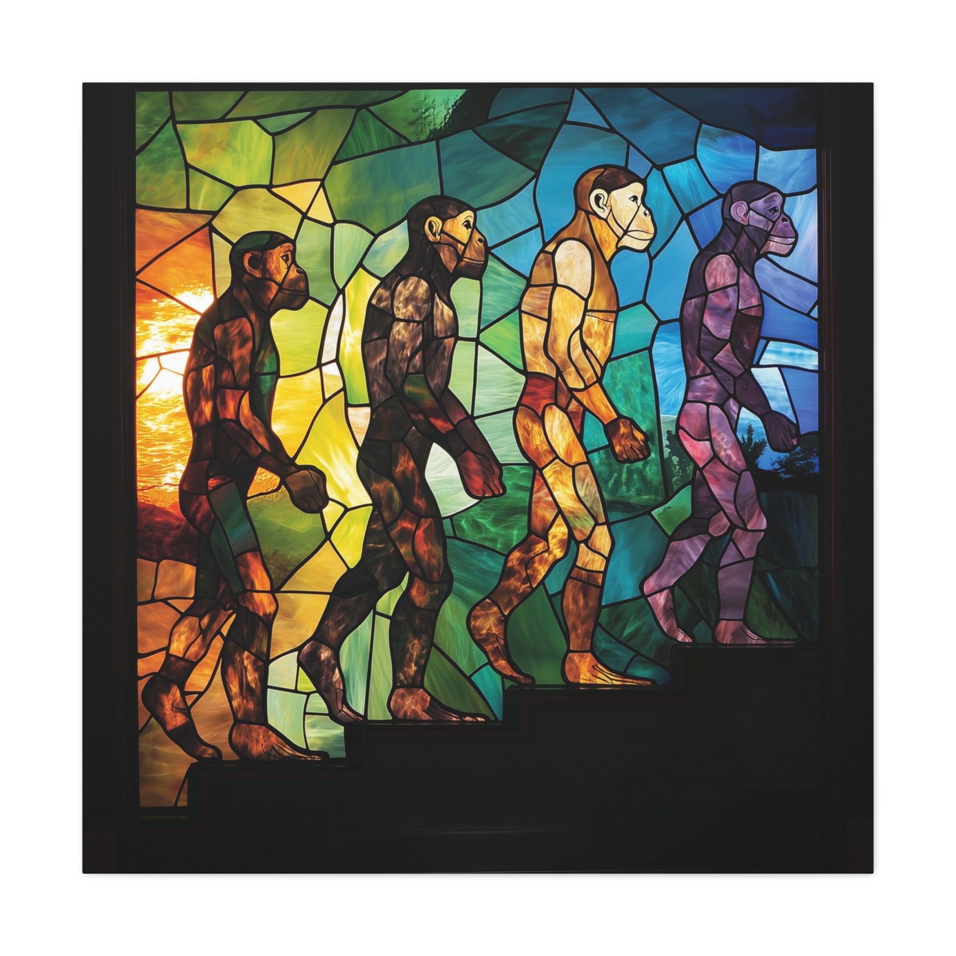 Bathed in vibrant hues, the figures stride through time's stained glass, embodying the dance of evolution. Their path, a mosaic of light and shadow, whispers the eternal song of transformation and progress.