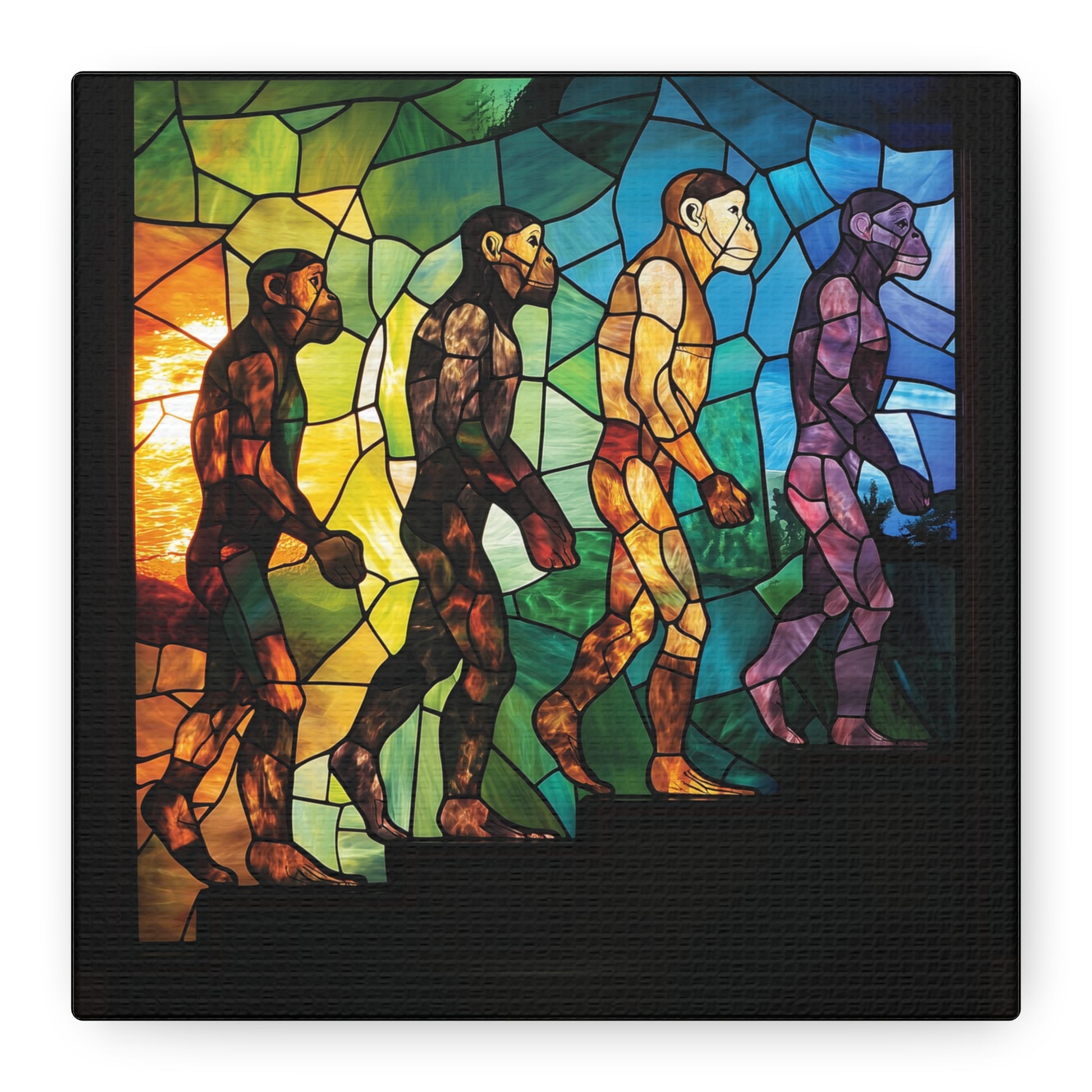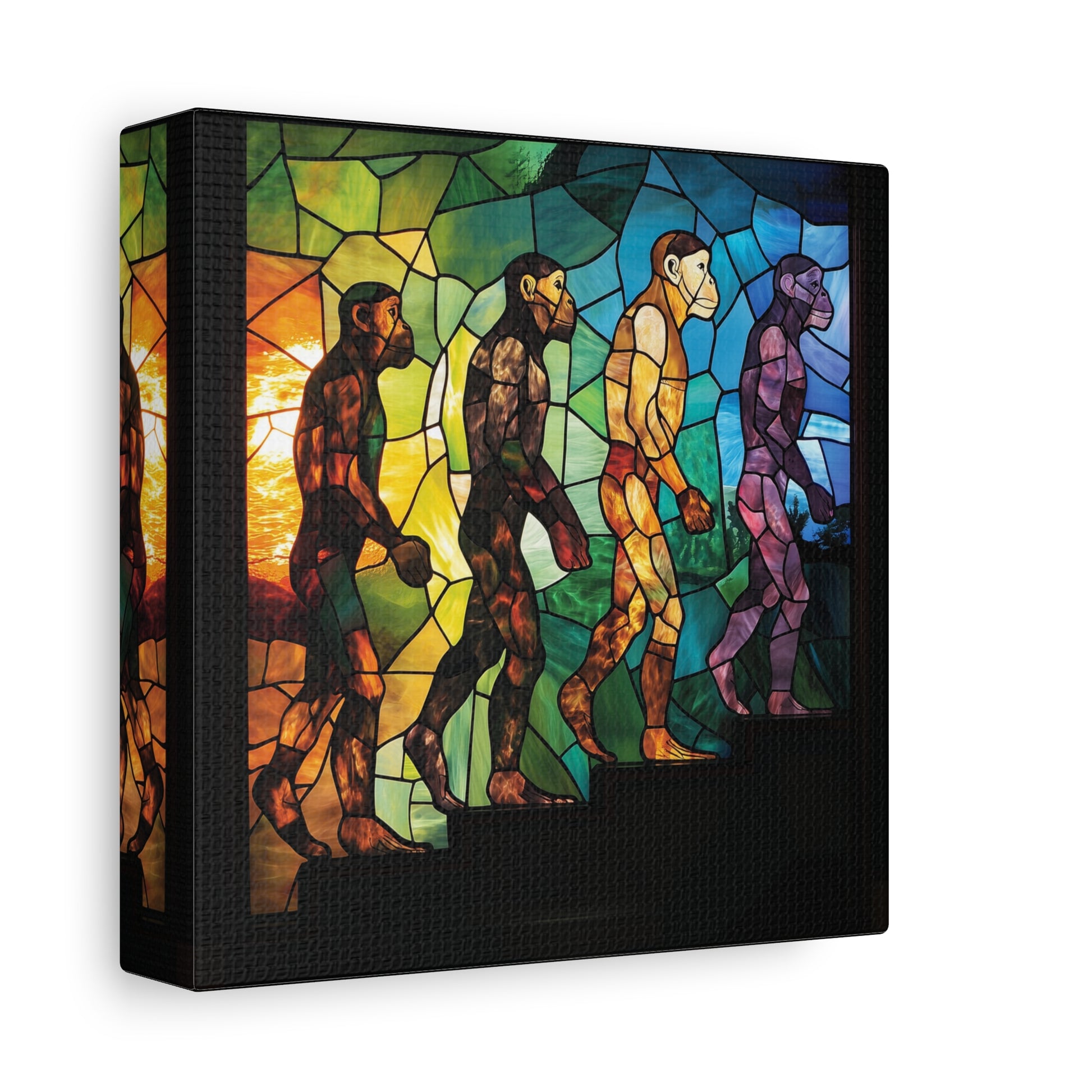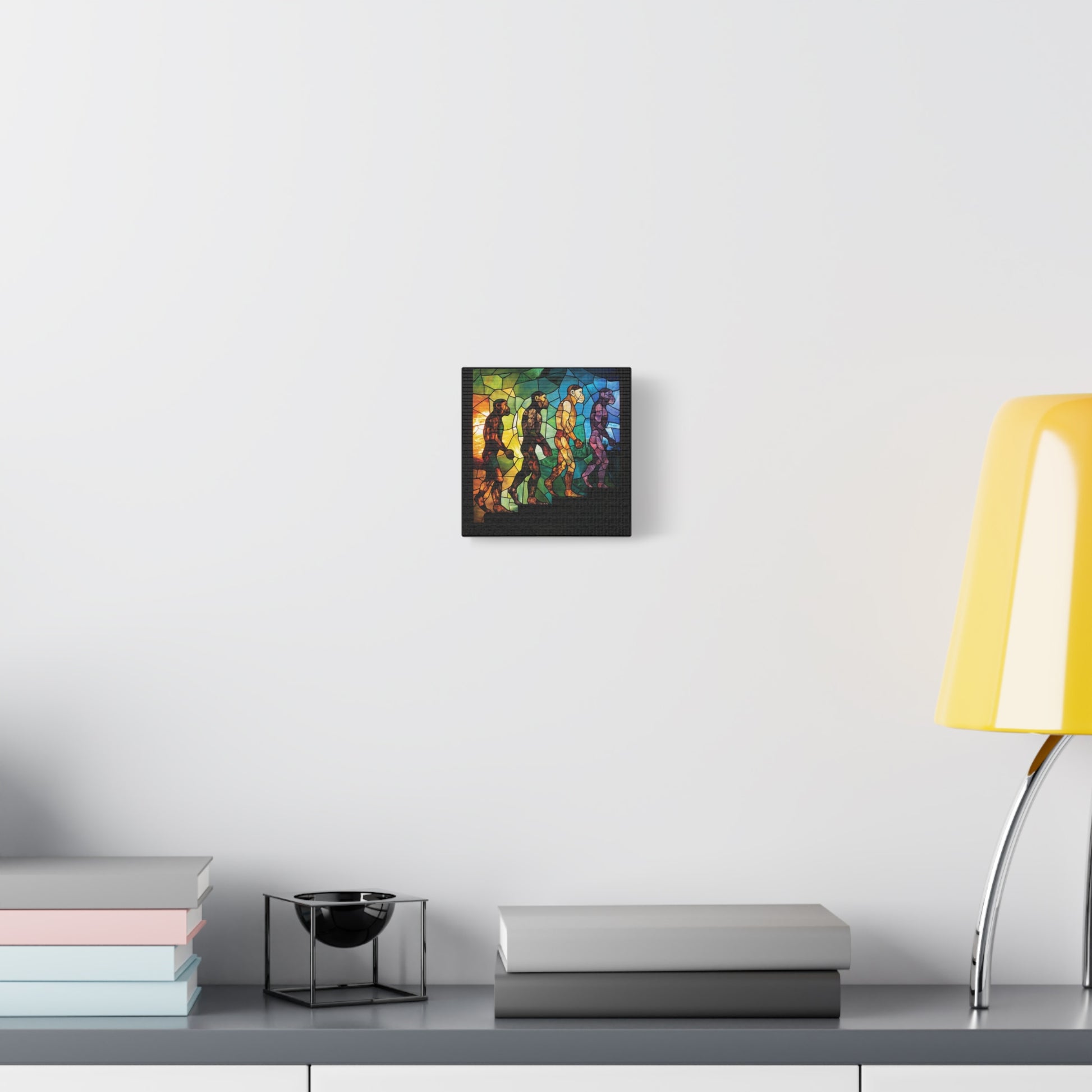 Bathed in vibrant hues, the figures stride through time's stained glass, embodying the dance of evolution. Their path, a mosaic of light and shadow, whispers the eternal song of transformation and progress.