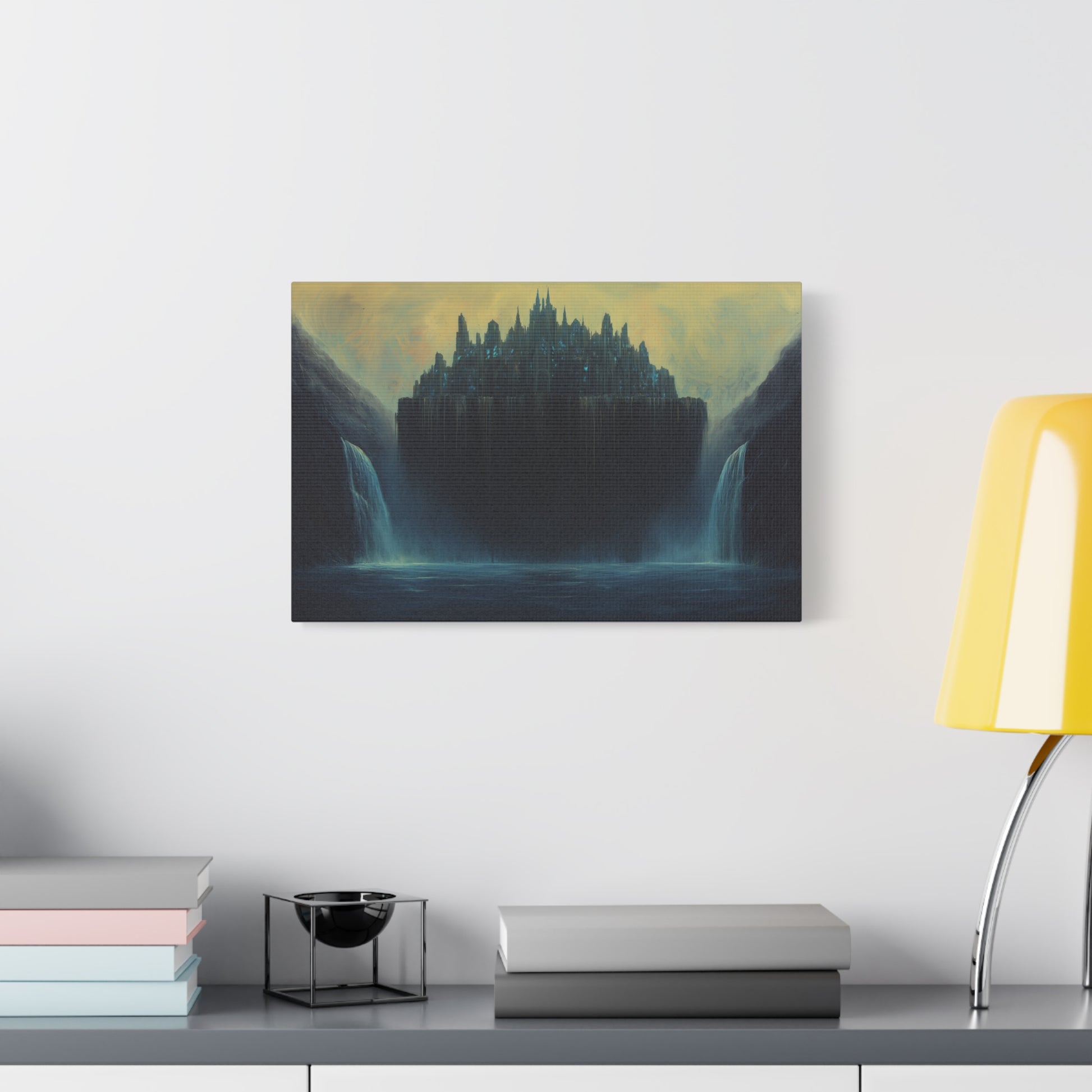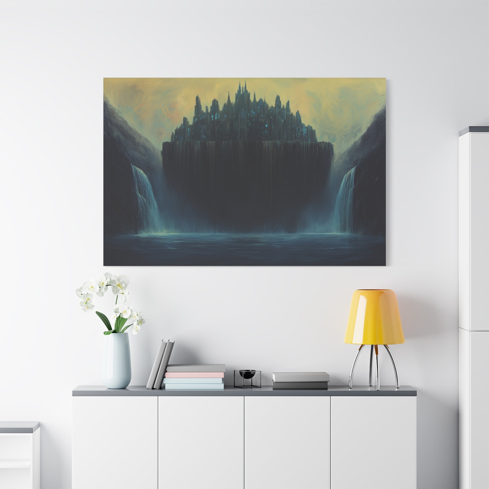 Rising from the depths, a fortress looms, veiled in cascading whispers of water and shadow. It stands as a testament to forgotten myths, where echoes of ancient tales linger in the misty air, inviting reverie and awe.