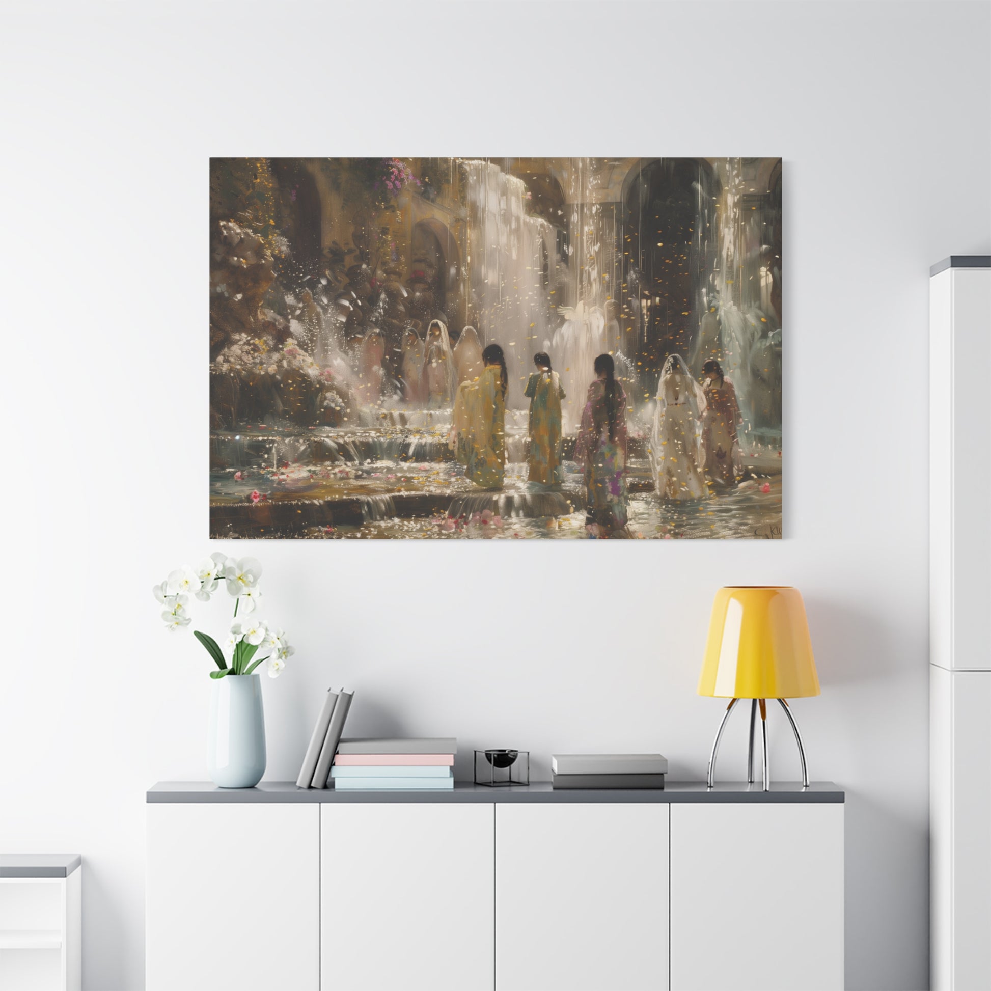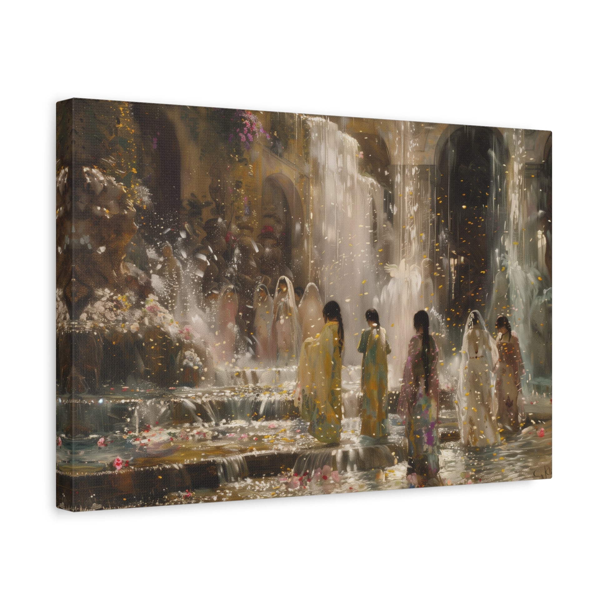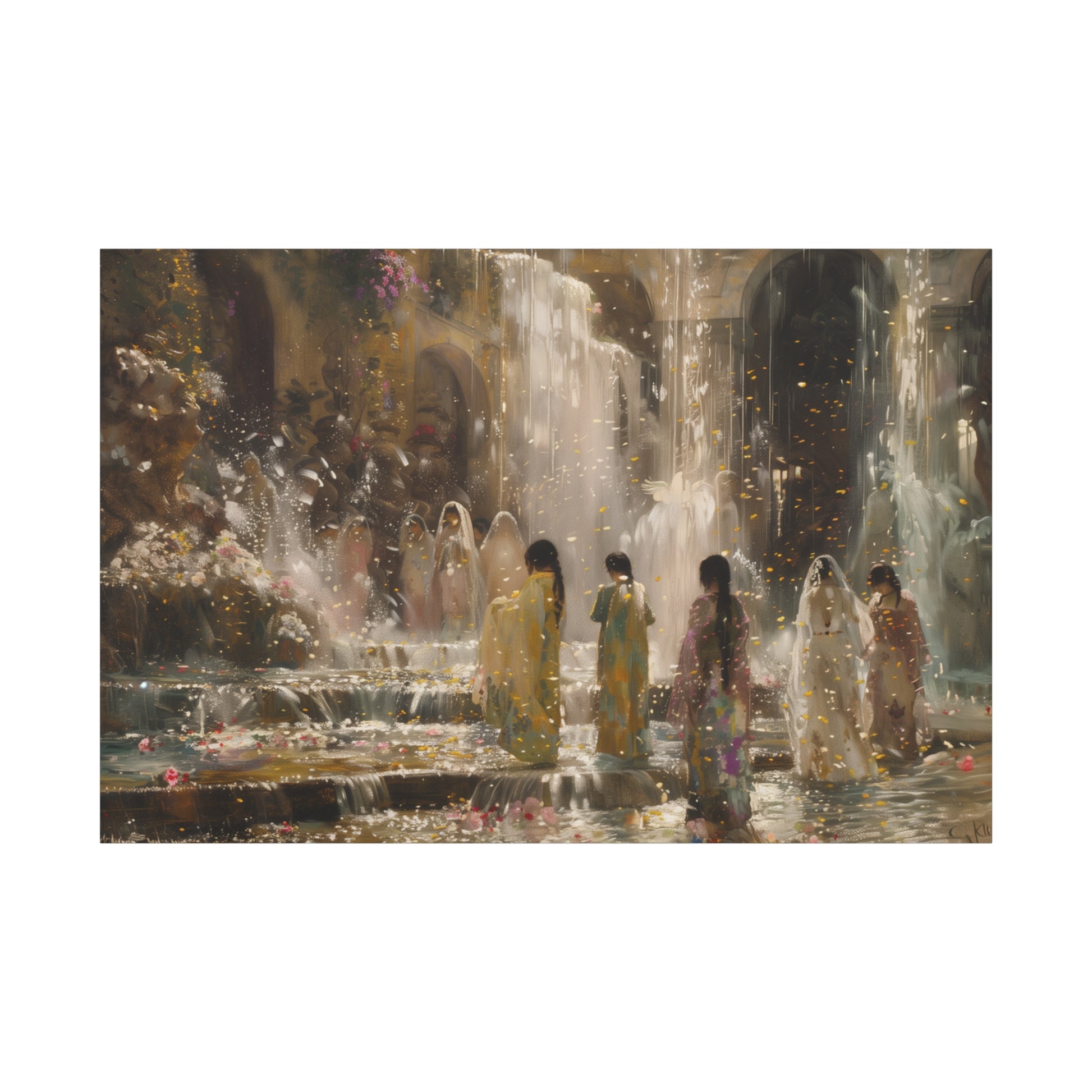 In a cascade of shimmering light and gentle whispers, veiled figures tread softly upon the waters. A realm where time stands still, inviting the heart to pause and the spirit to dance in quiet reverence.