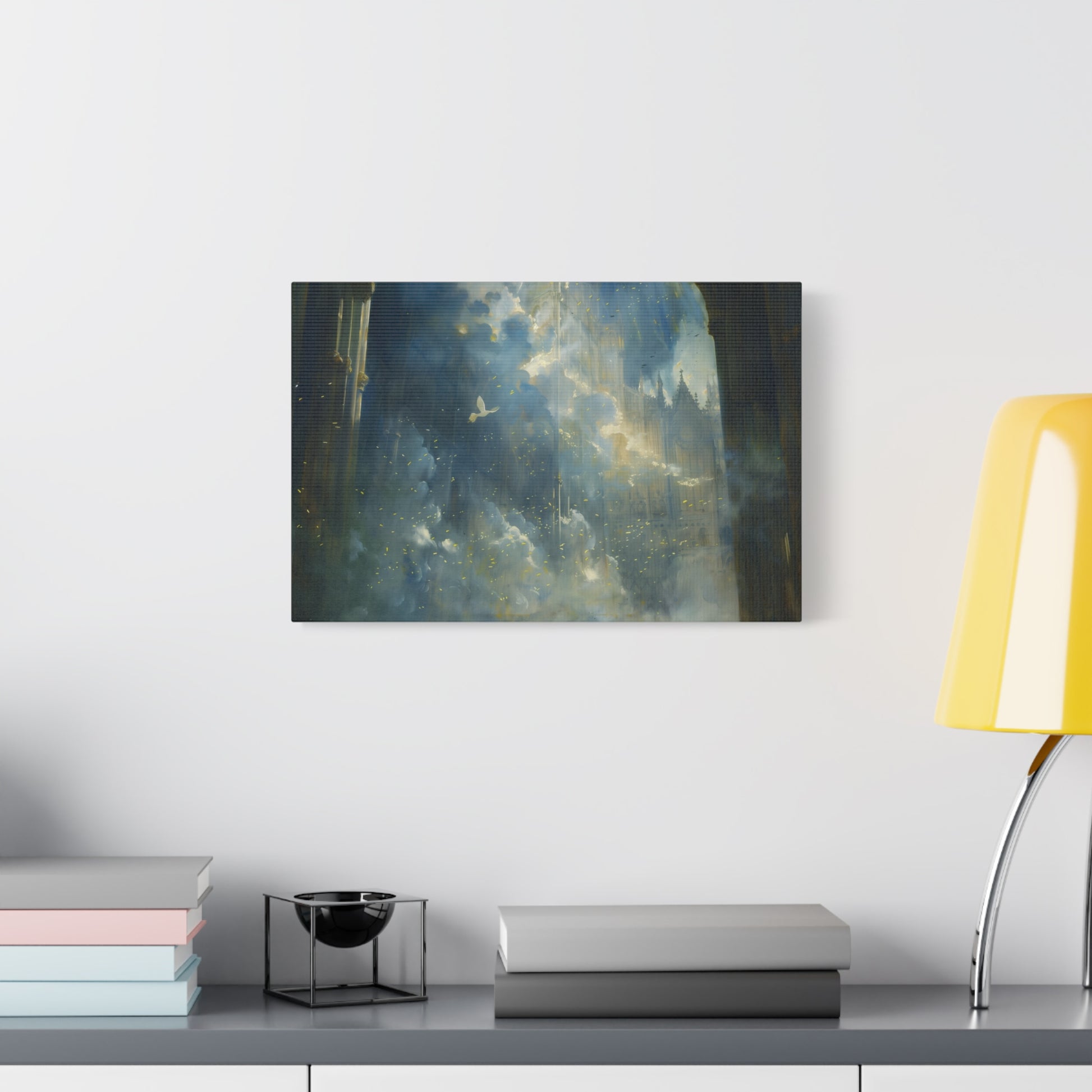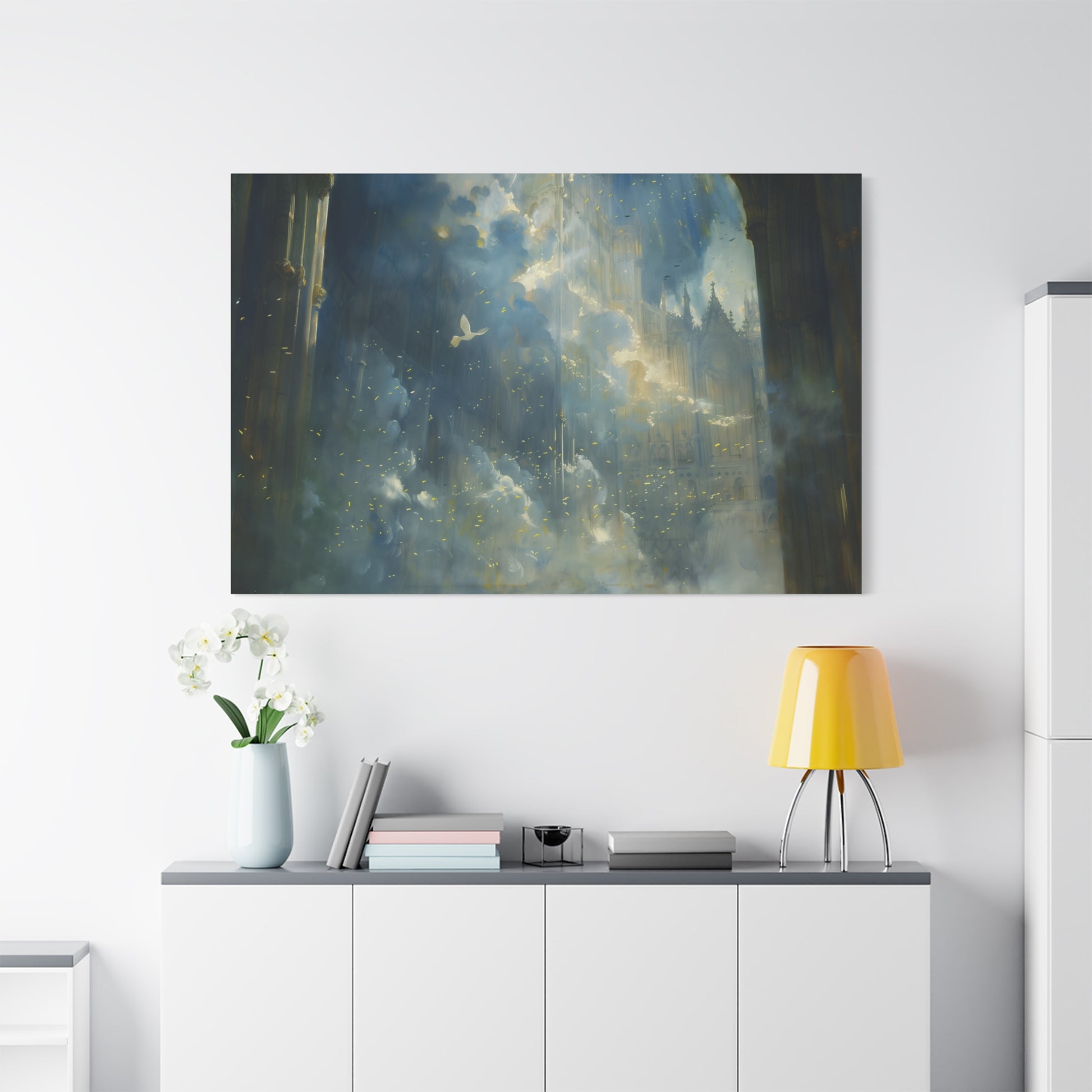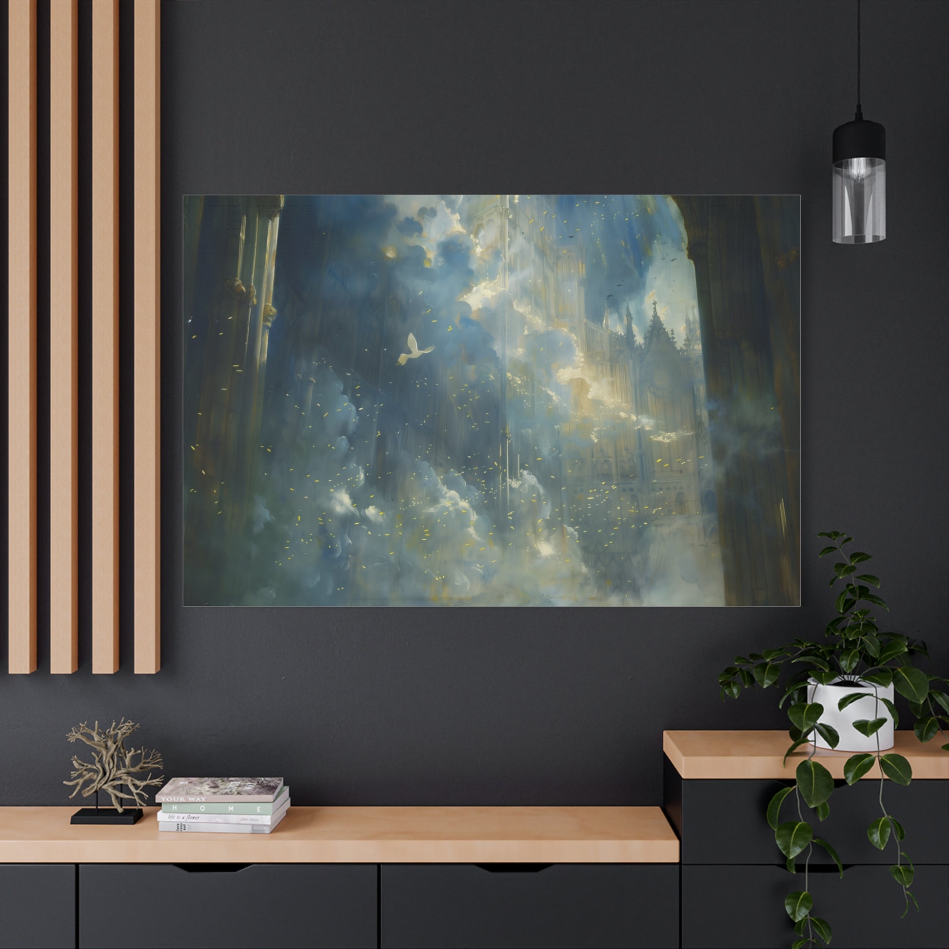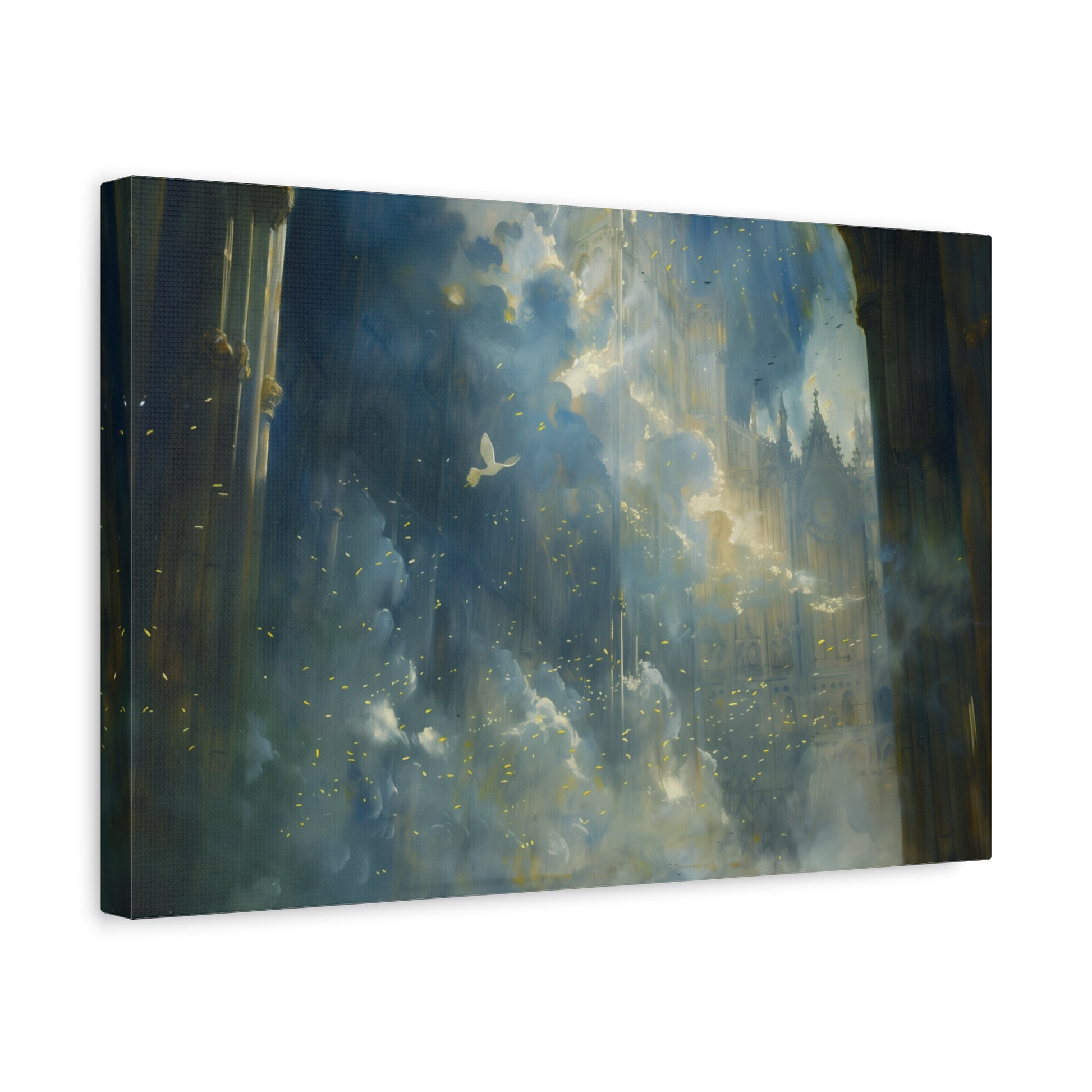Bathed in ethereal light, the cathedral rises amidst clouds, where whispers of peace and echoes of ancient hymns fill the air. A lone dove soars, embodying hope and transcendence within this serene realm.