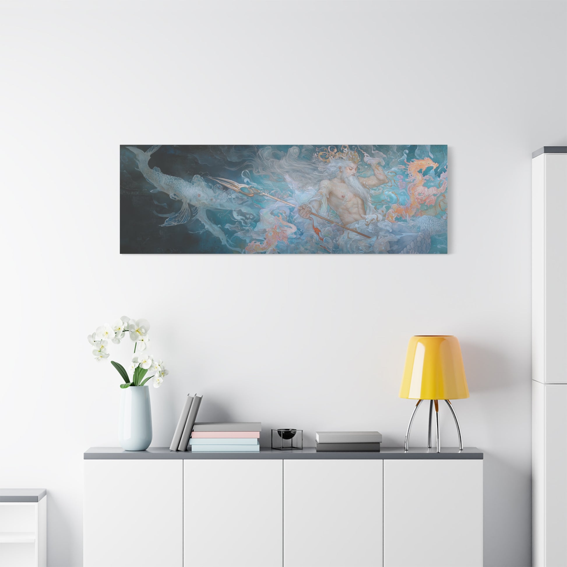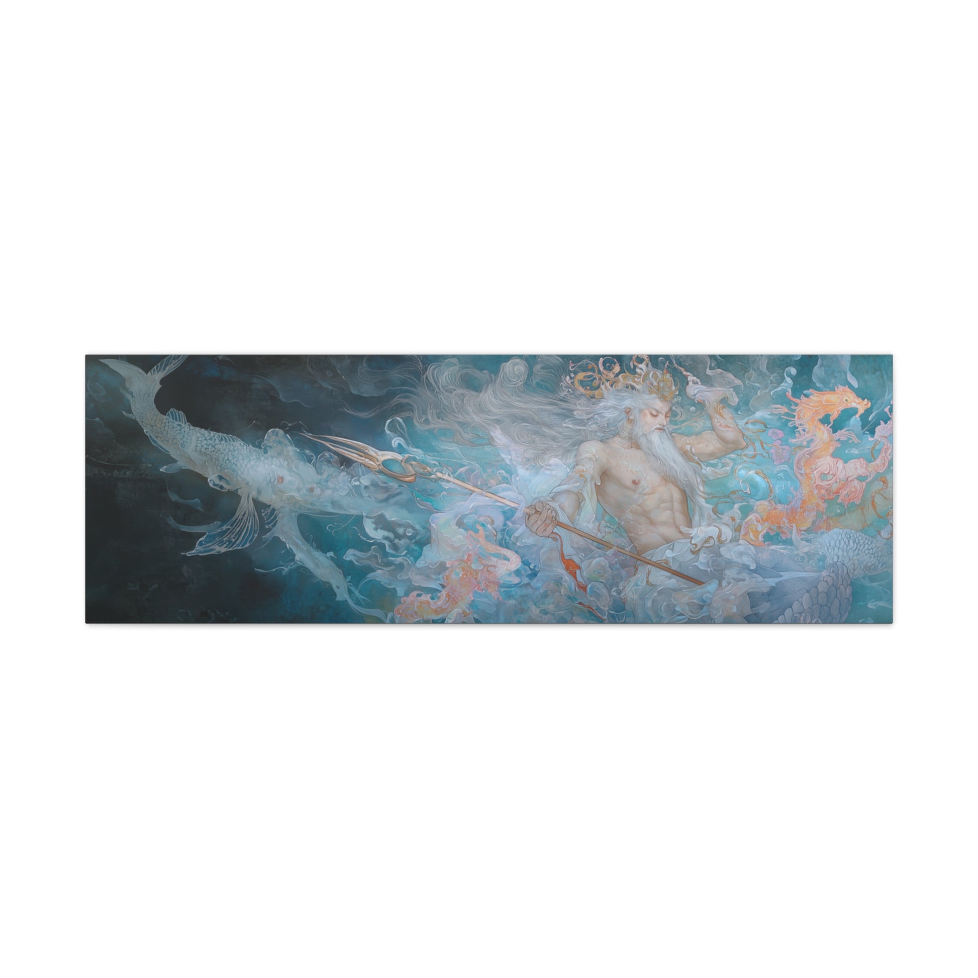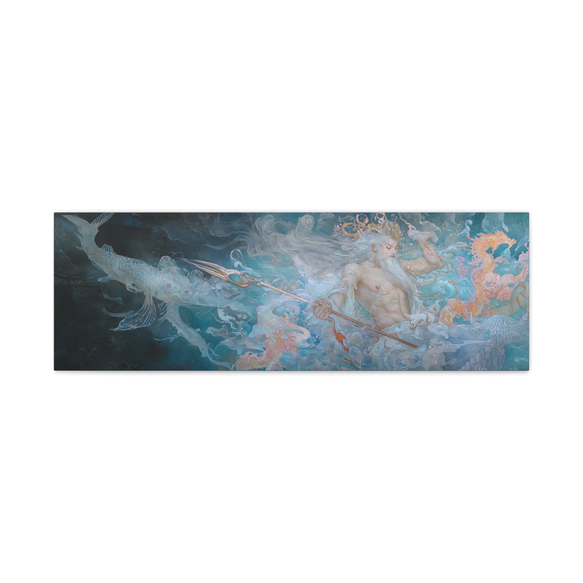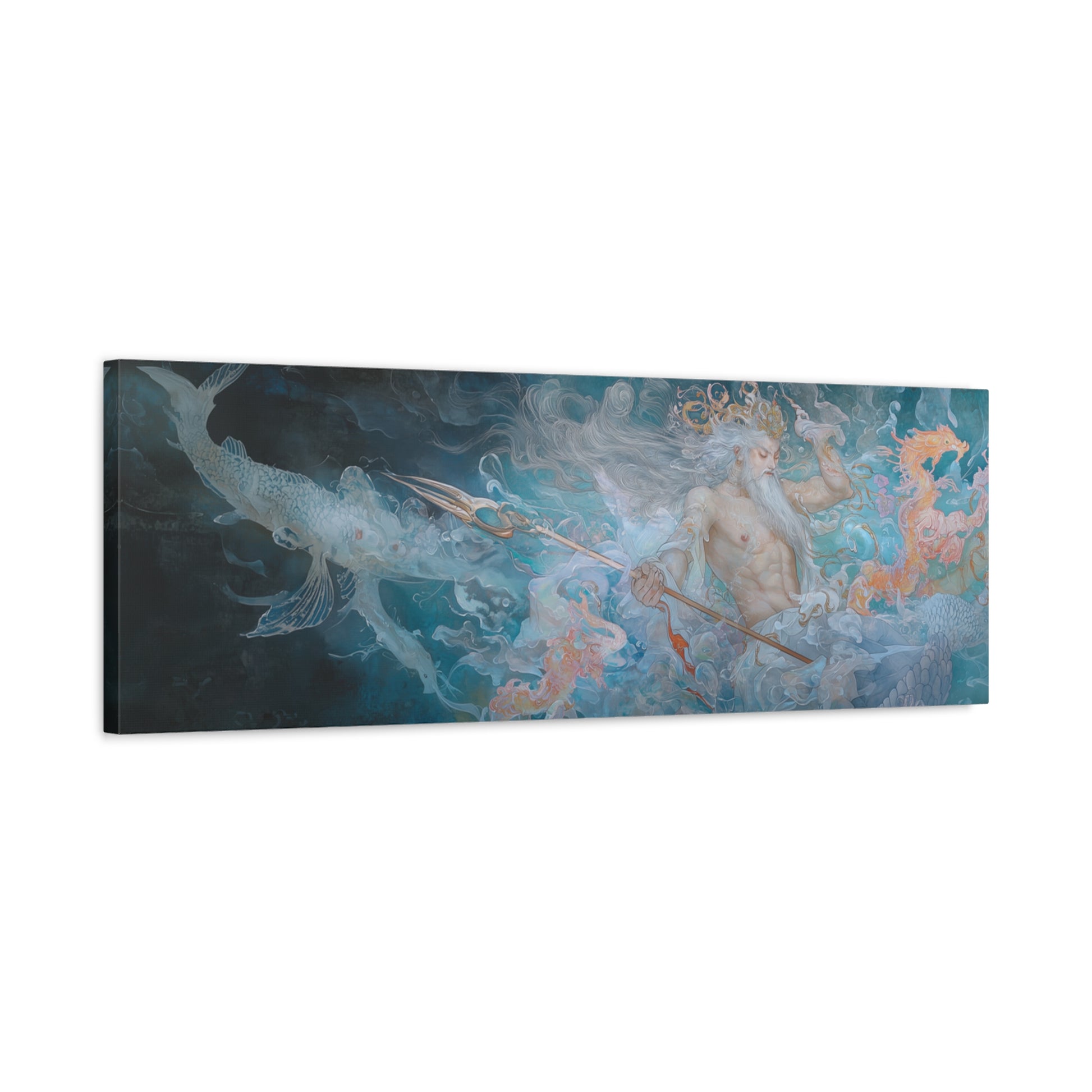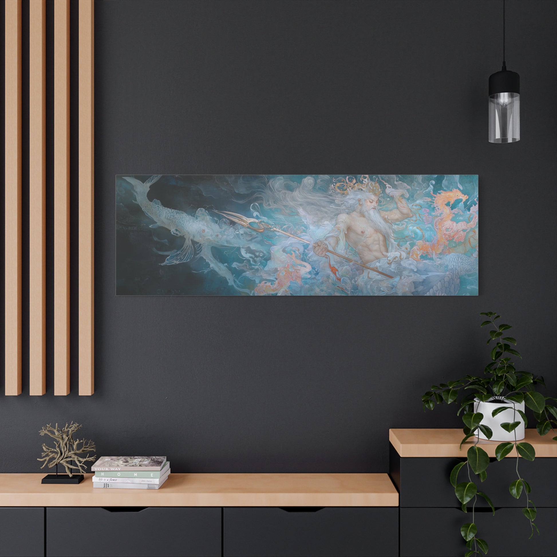 A majestic figure emerges, commanding the vibrant chaos of the ocean's depths. Swirling currents and mythical creatures weave a tapestry of power and grace, as the sea's eternal guardian orchestrates the dance of waves and whispers.