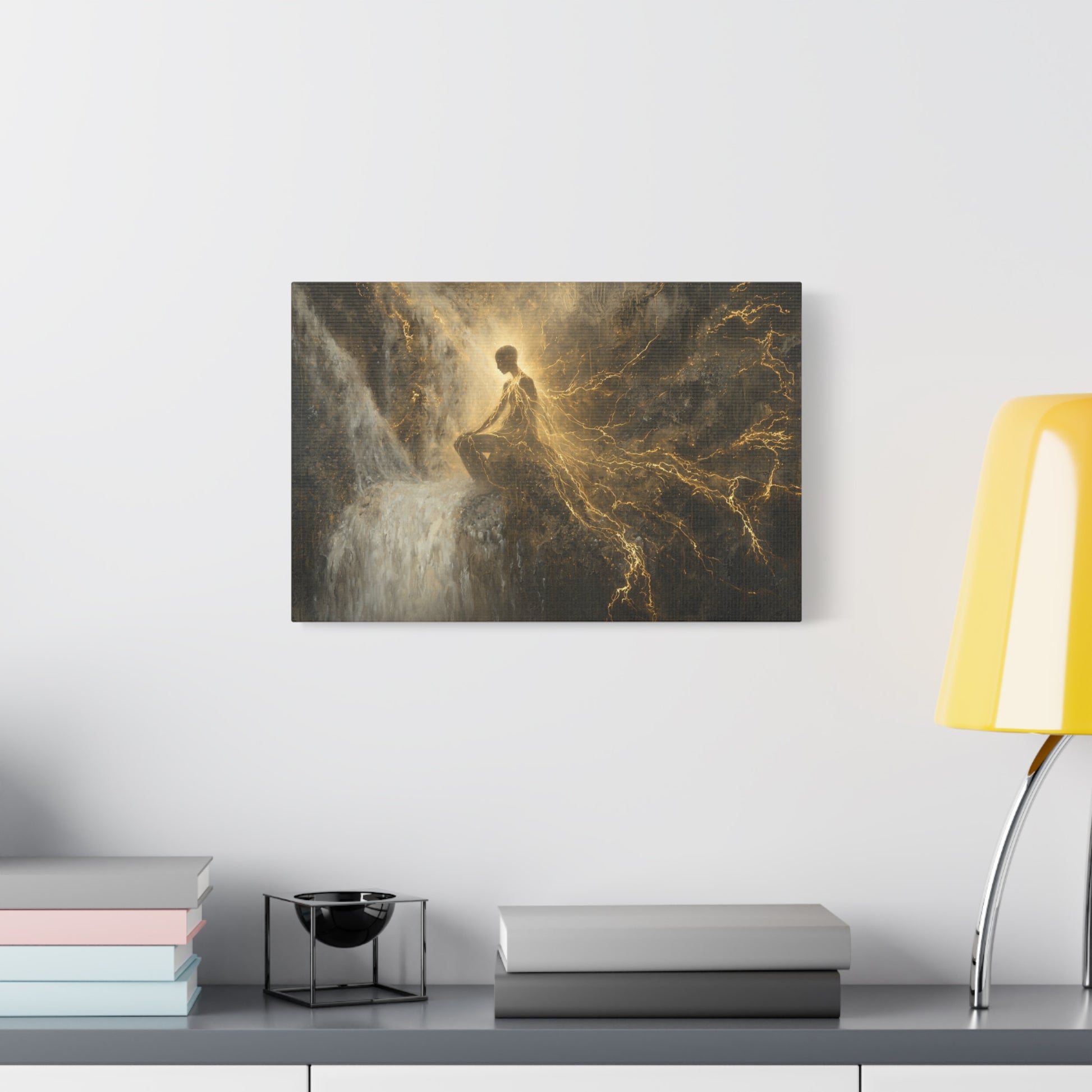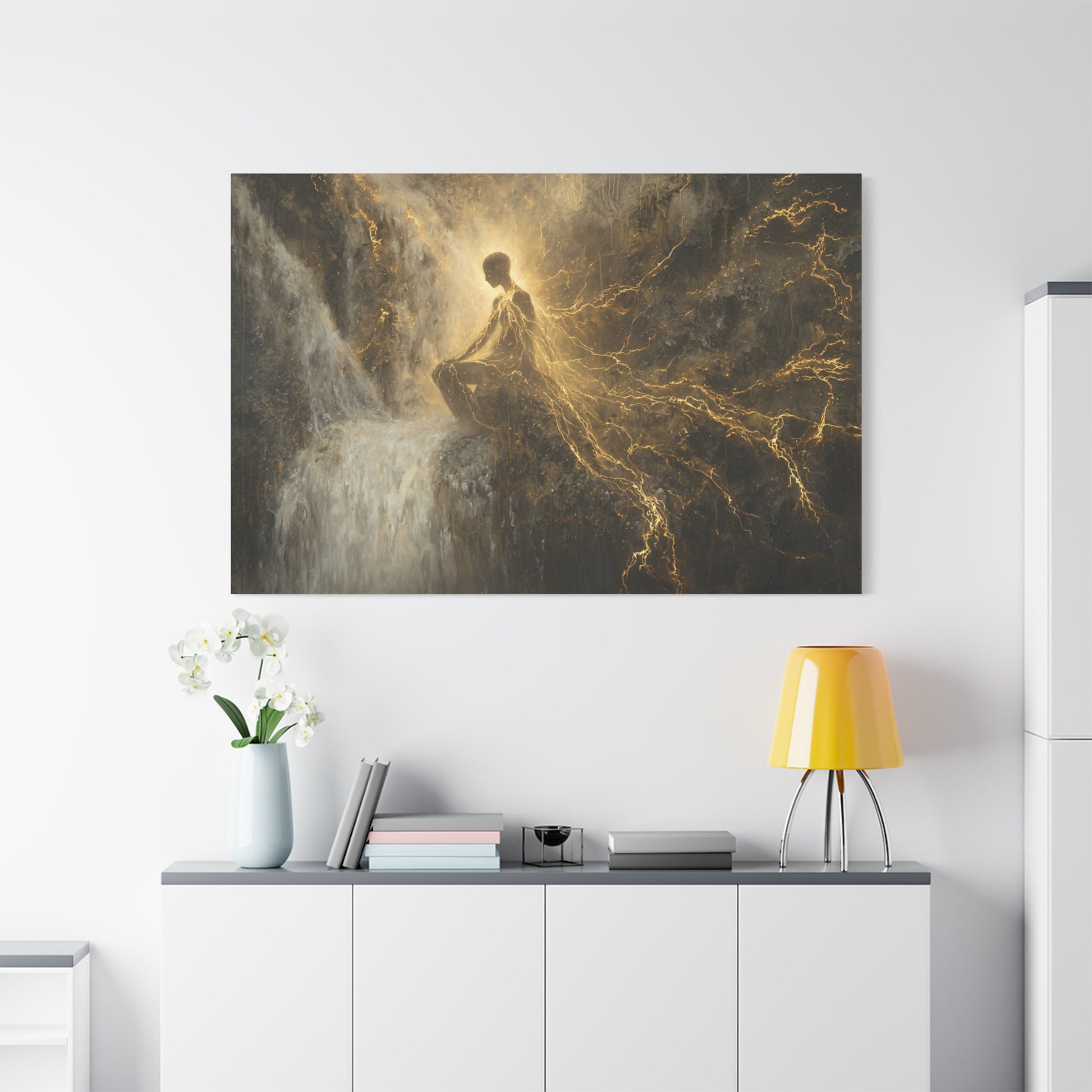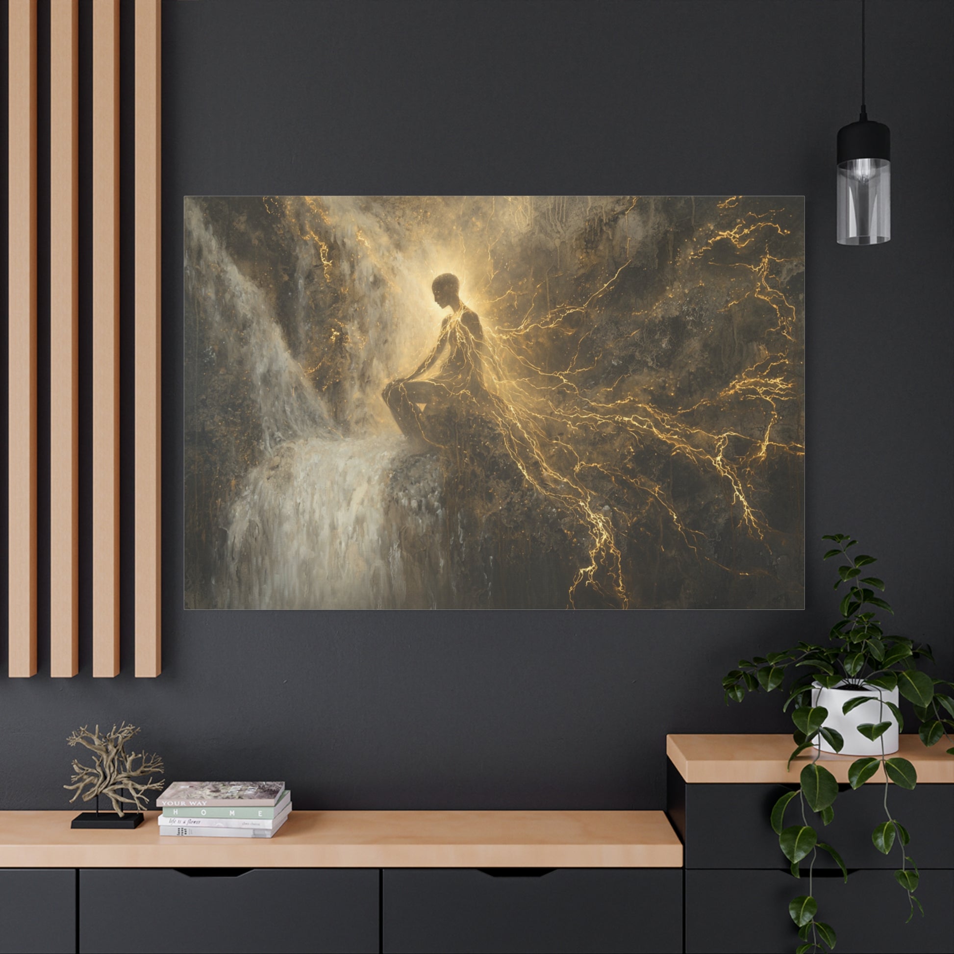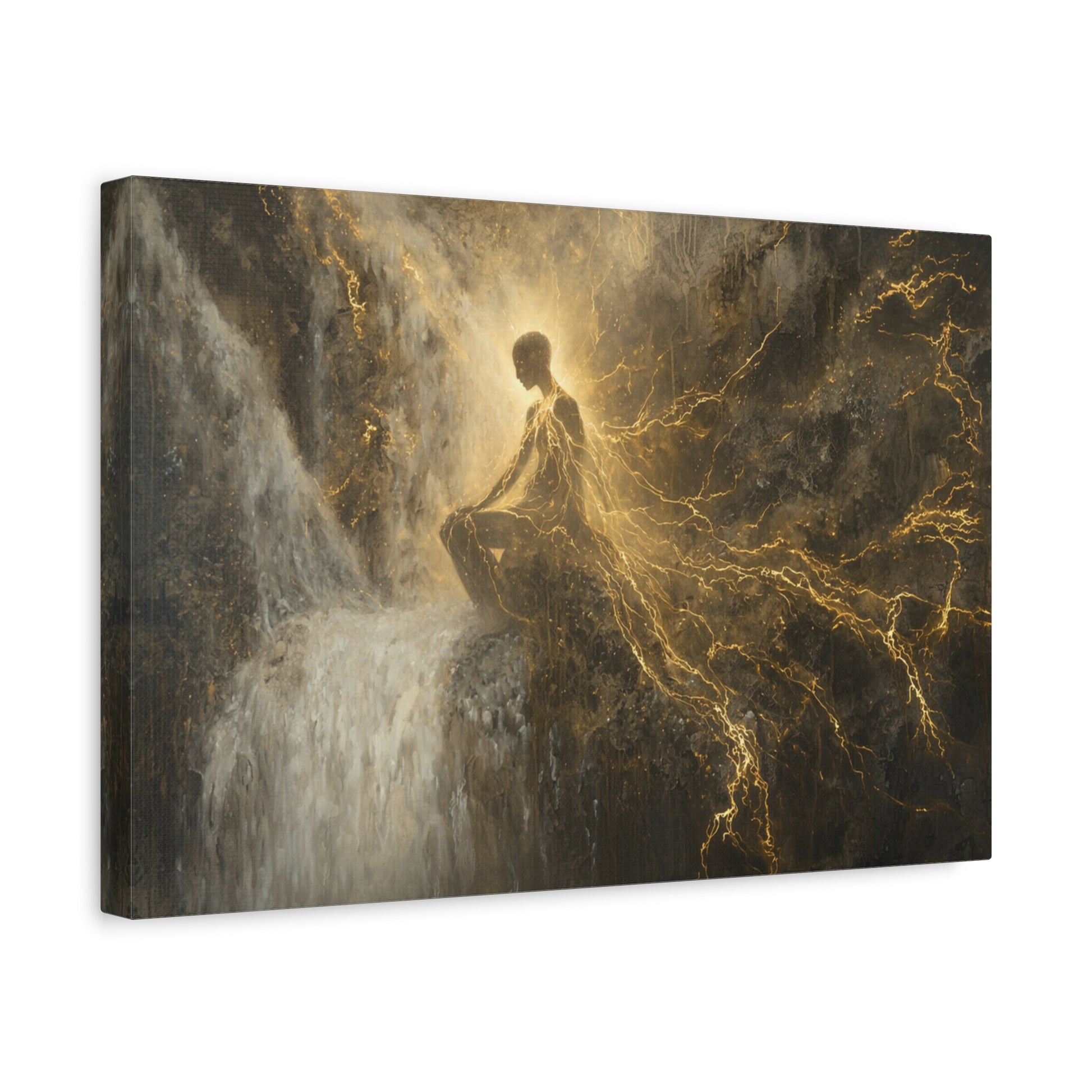 Bathed in ethereal light, the figure sits at the cusp of worlds, where darkness meets the golden flow. A quiet power emanates, whispering of ancient secrets and eternal balance.
