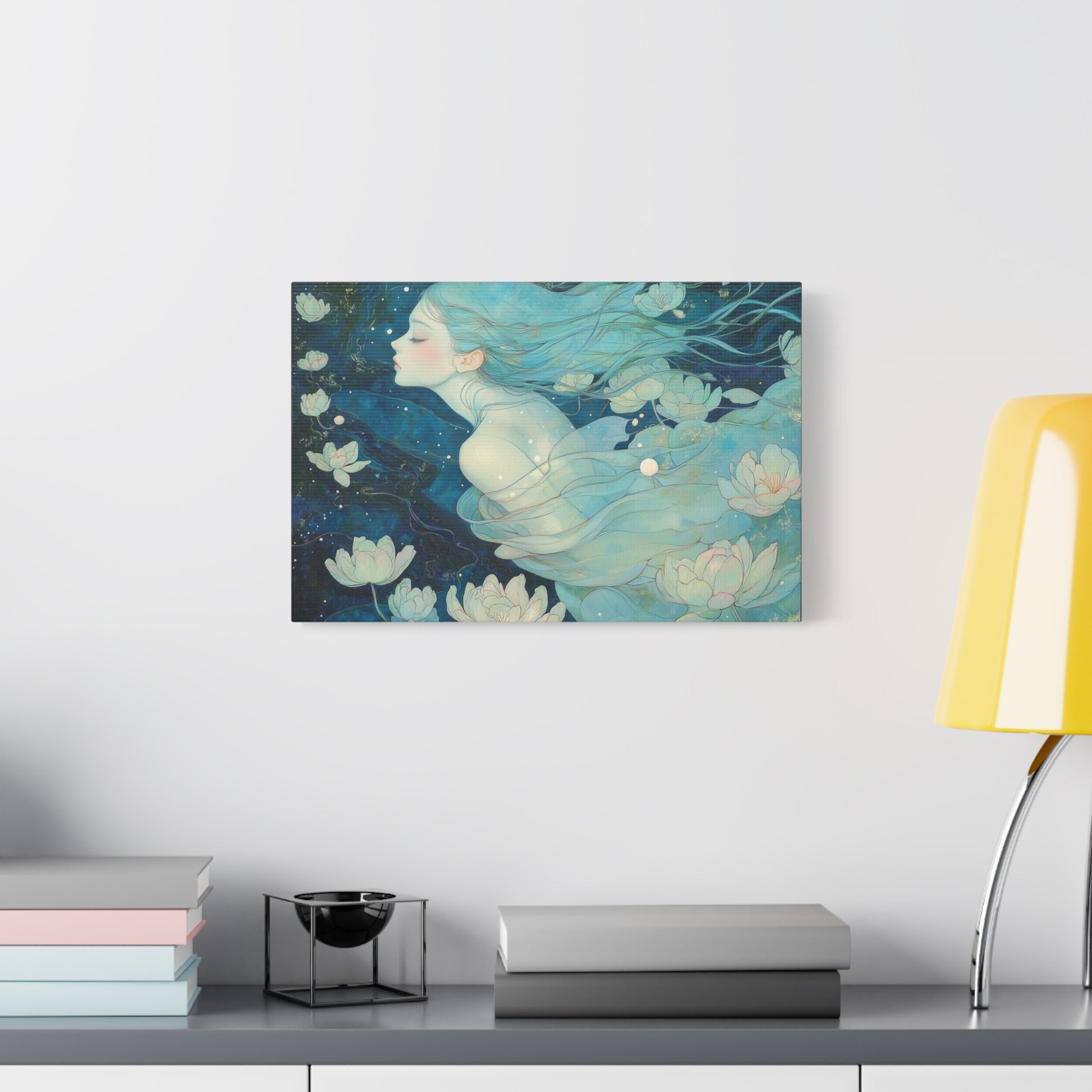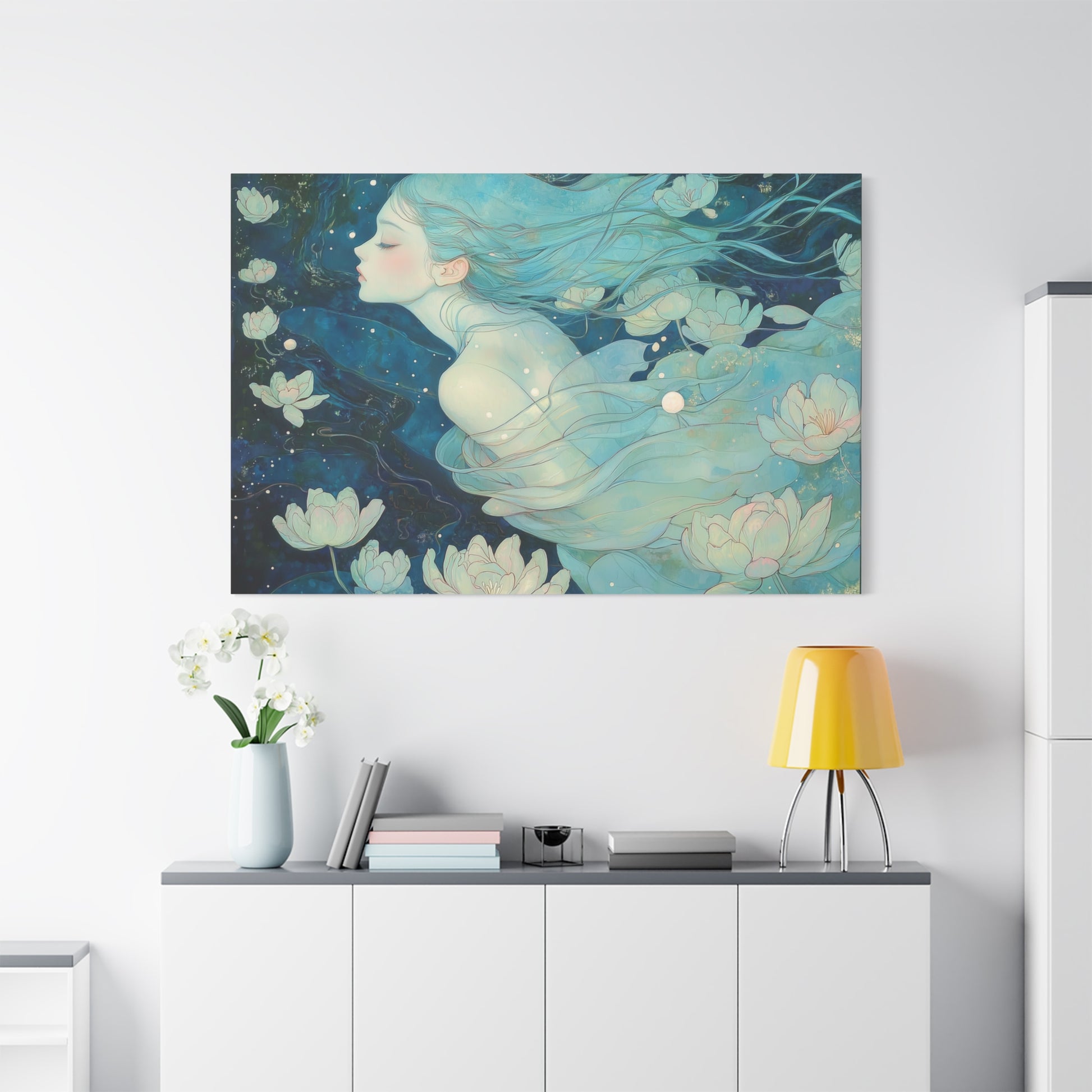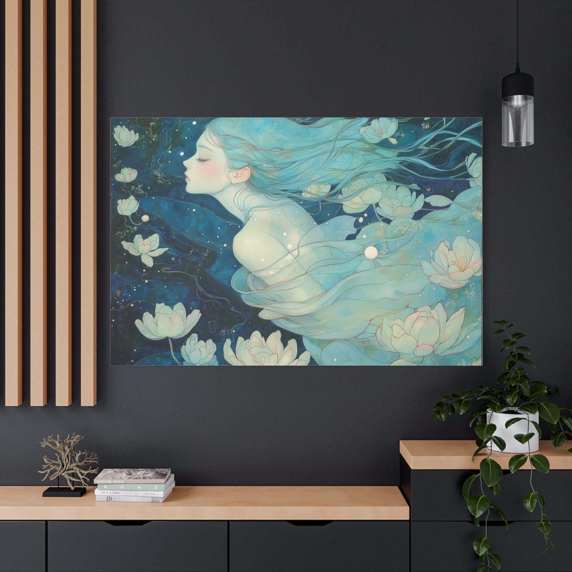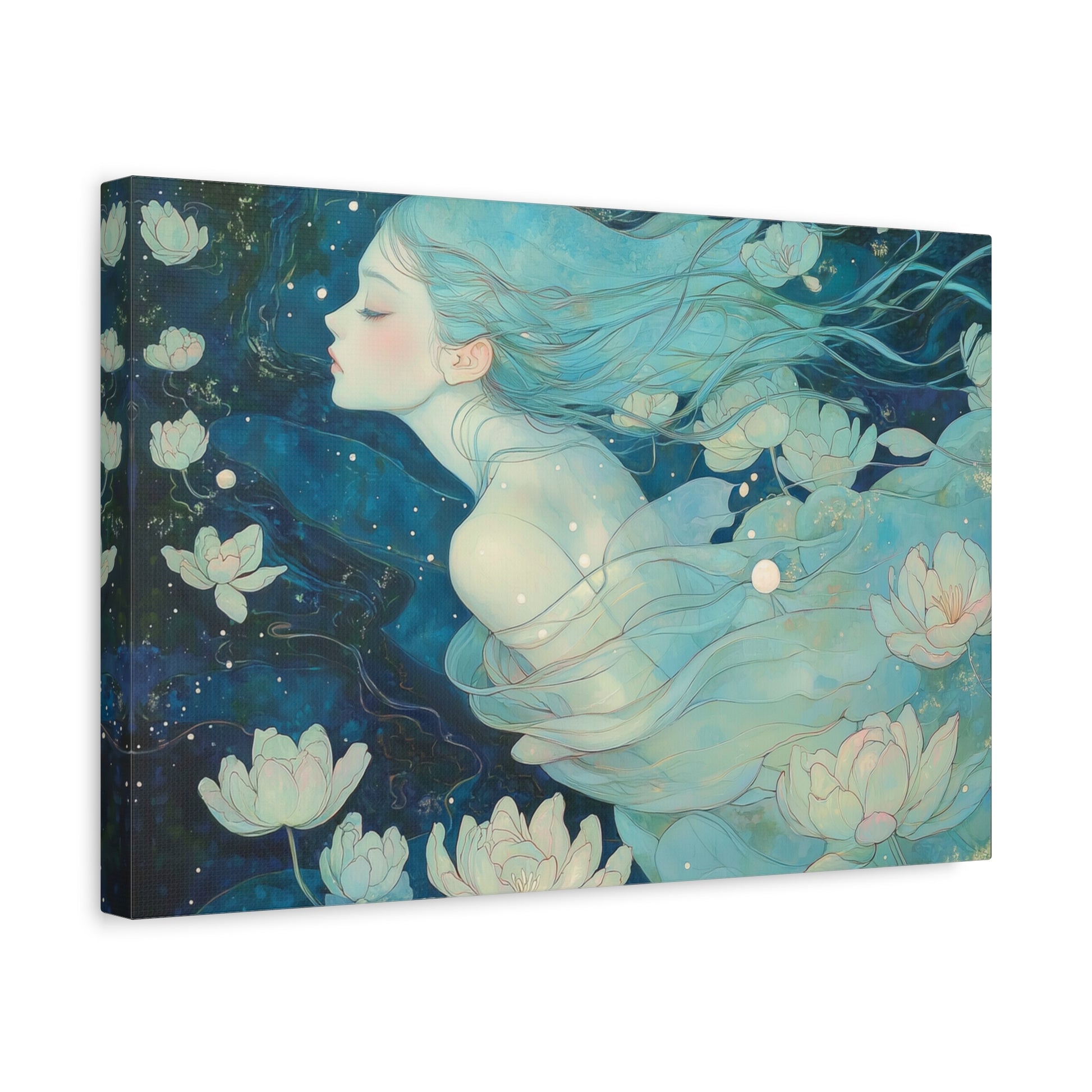A serene figure drifts through a sea of dreams, her essence entwined with the gentle currents and blooming lotus. The artwork invites contemplation, offering a glimpse into the tranquil dance of water and spirit.