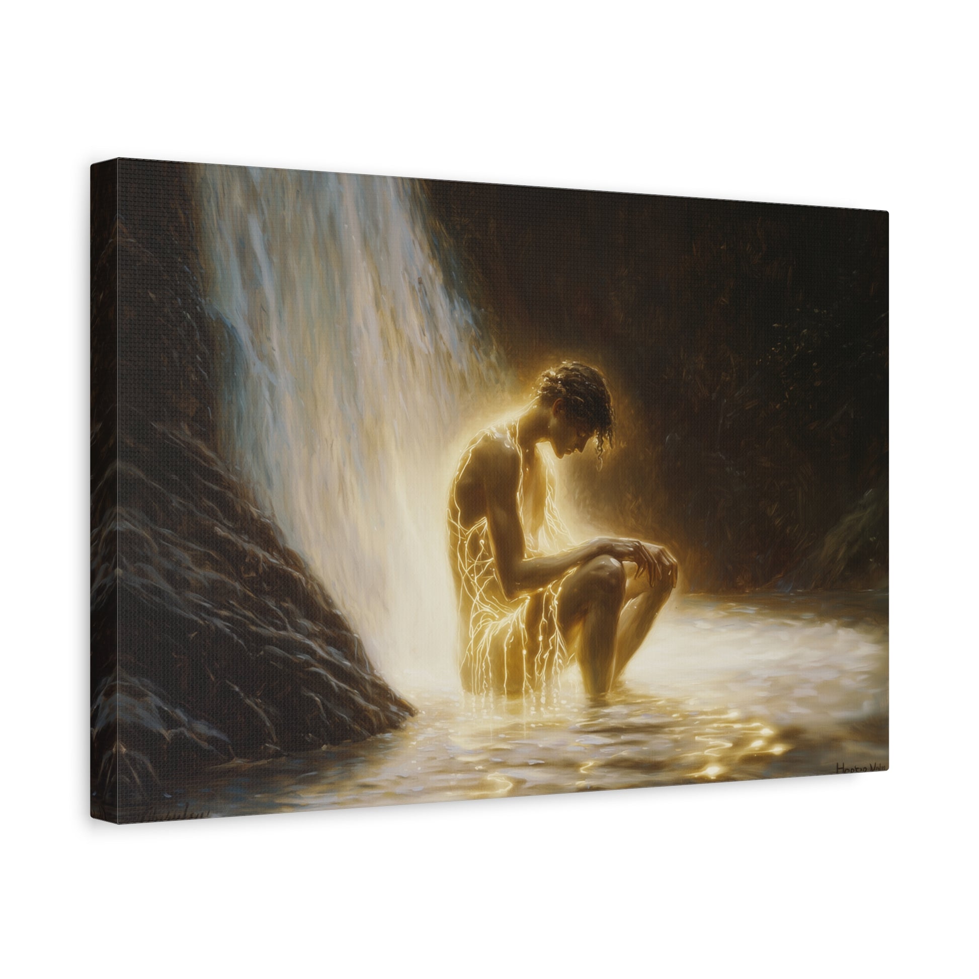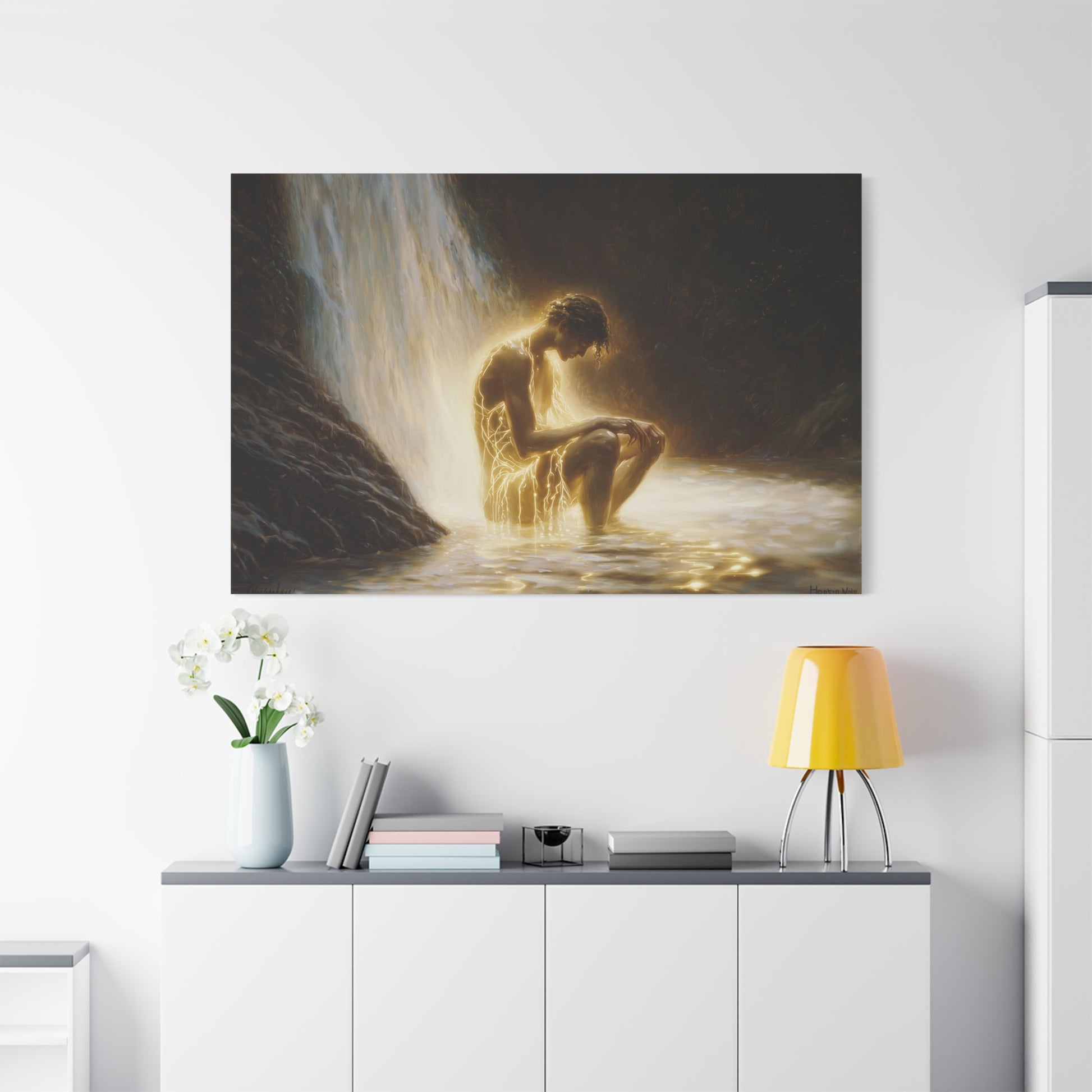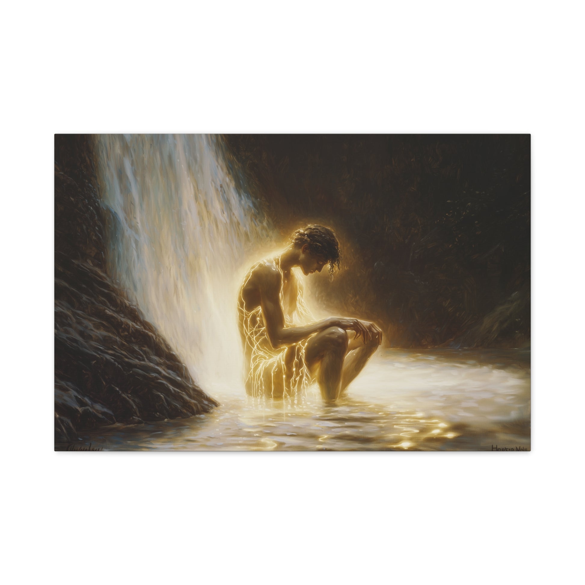 A figure emerges from the cascade, draped in threads of light, embodying a serene convergence of water and radiance. The scene evokes a moment of profound introspection and ethereal transformation.
