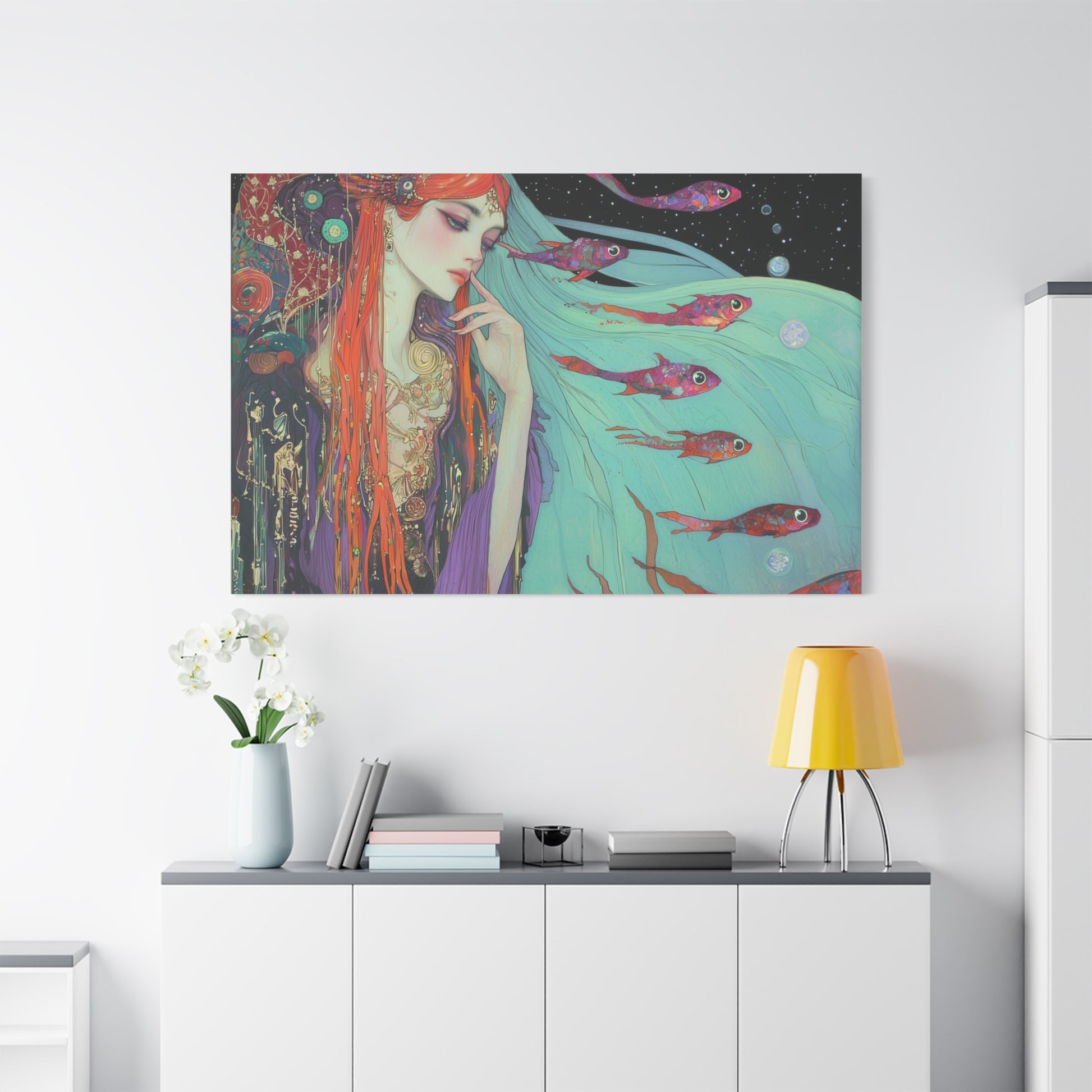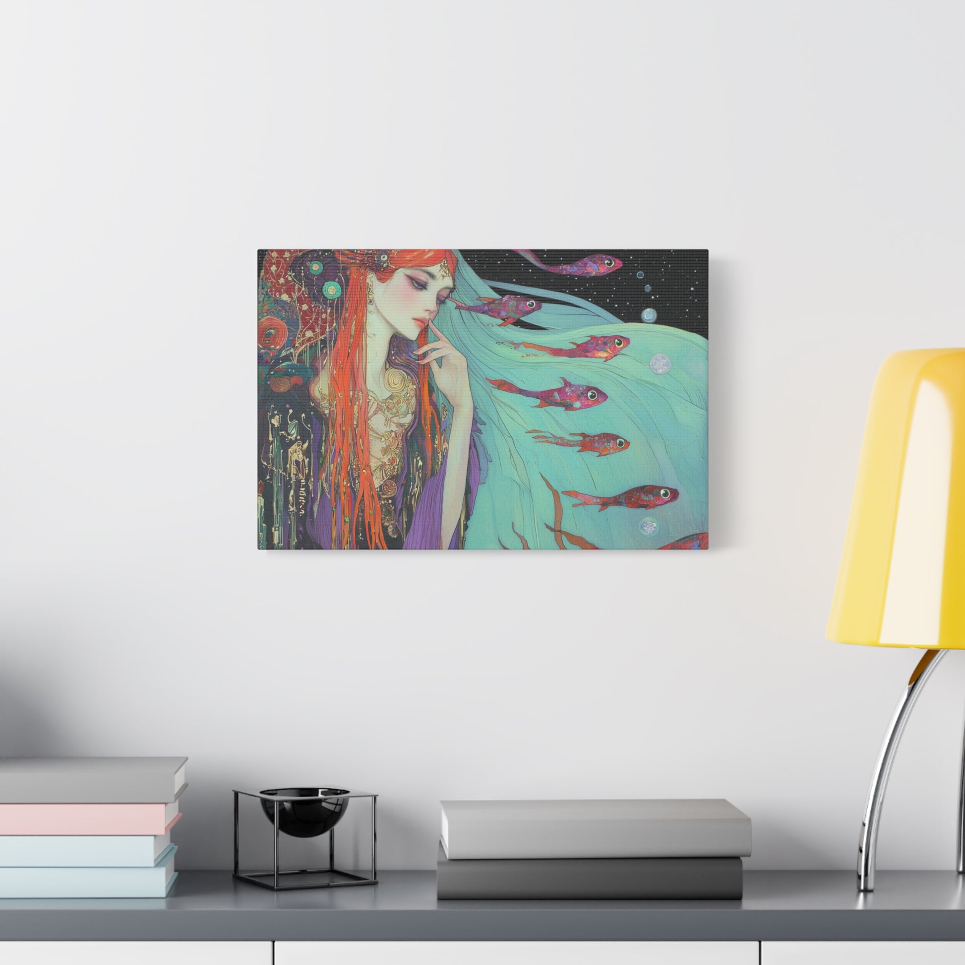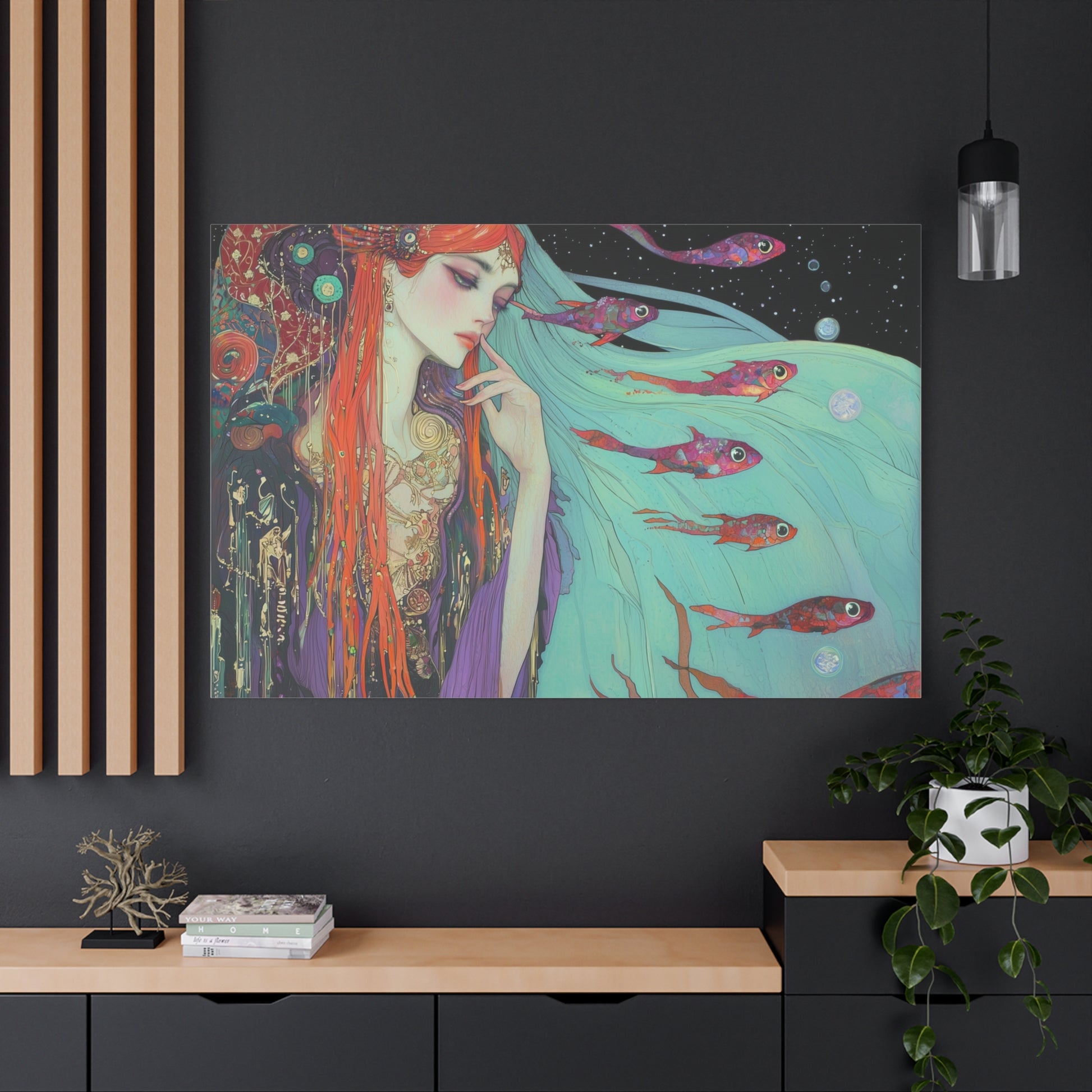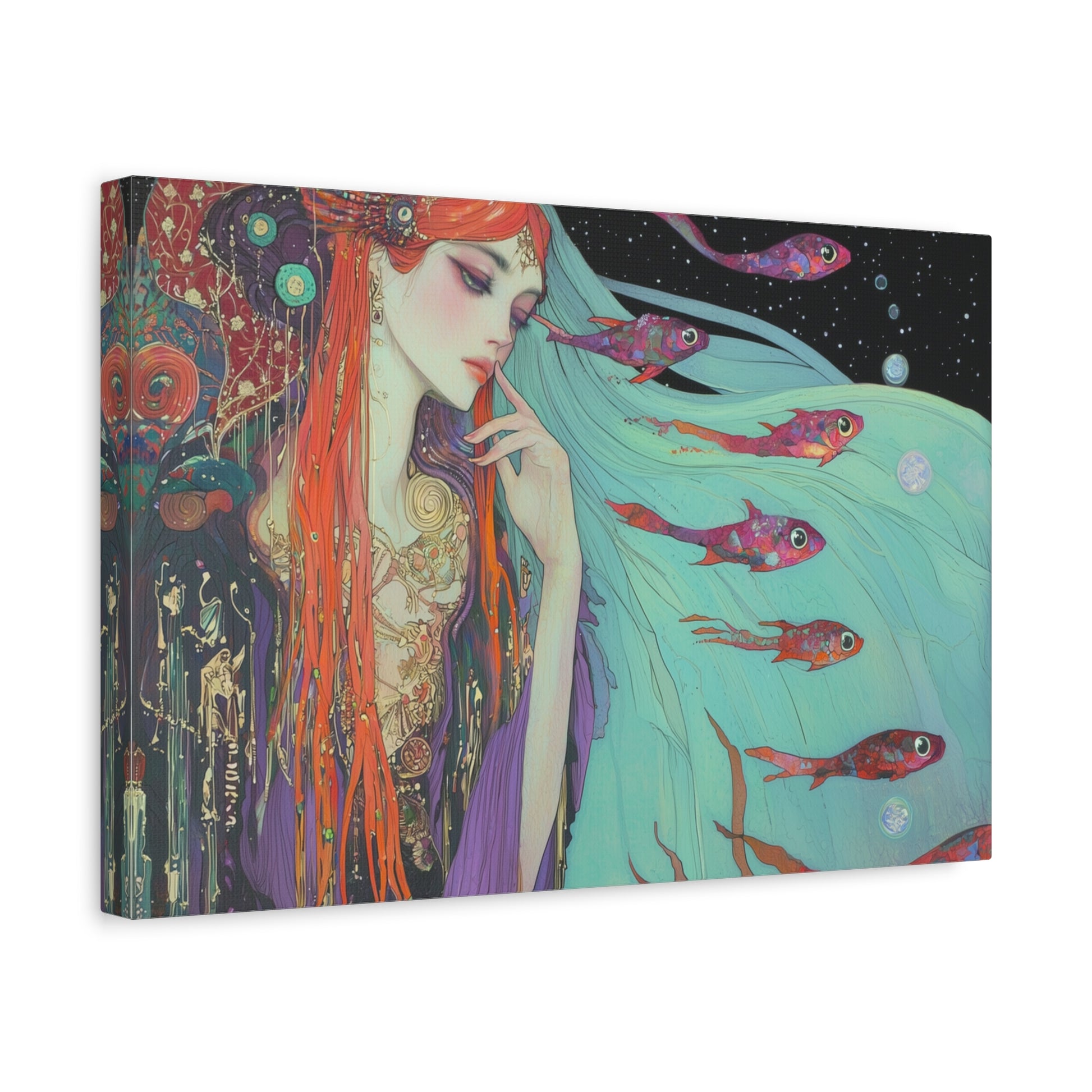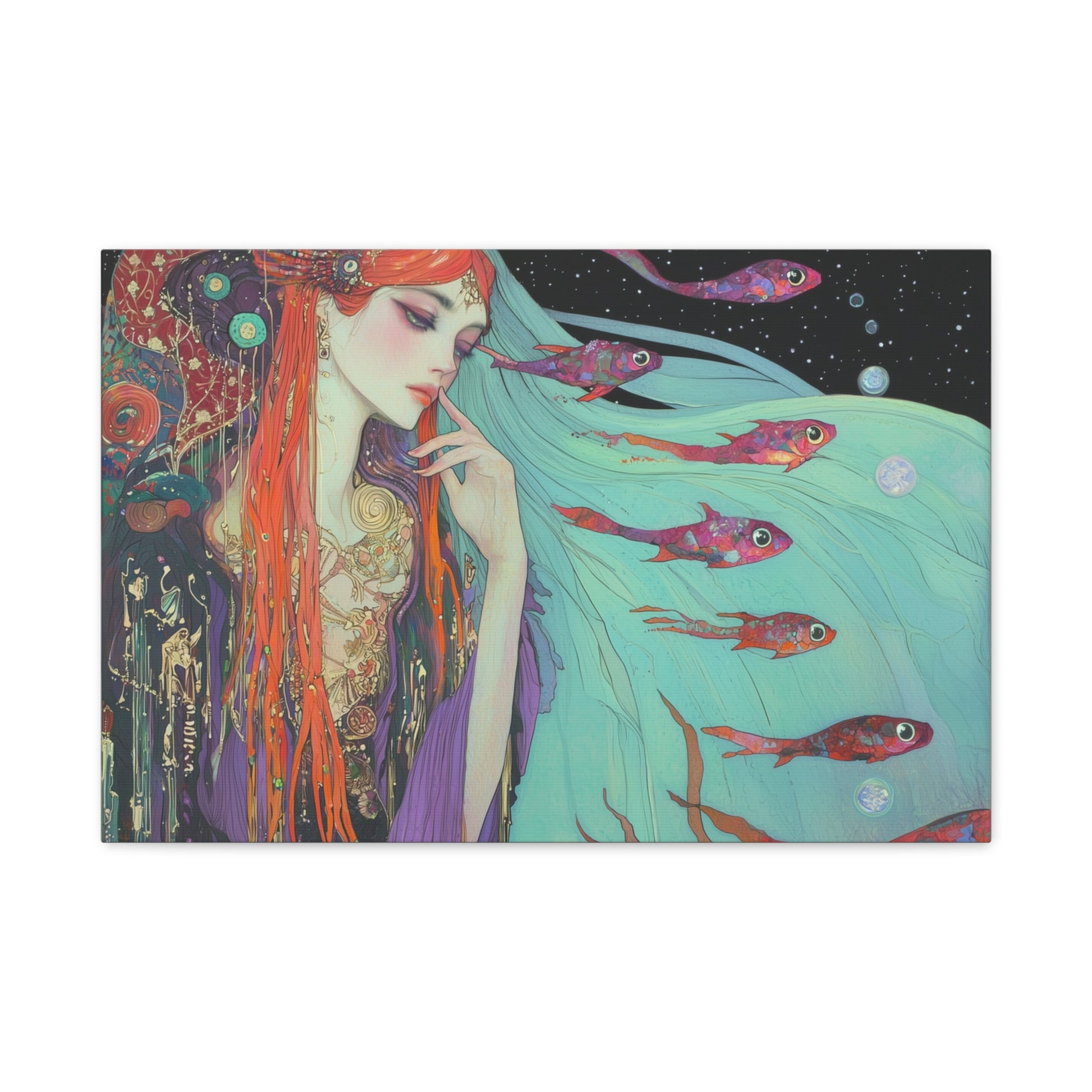 A siren of the deep dreams amidst celestial currents, her hair flowing like waves through the cosmic sea. Enchanted fish swim through her thoughts, weaving tales of forgotten oceans and starlit shores.