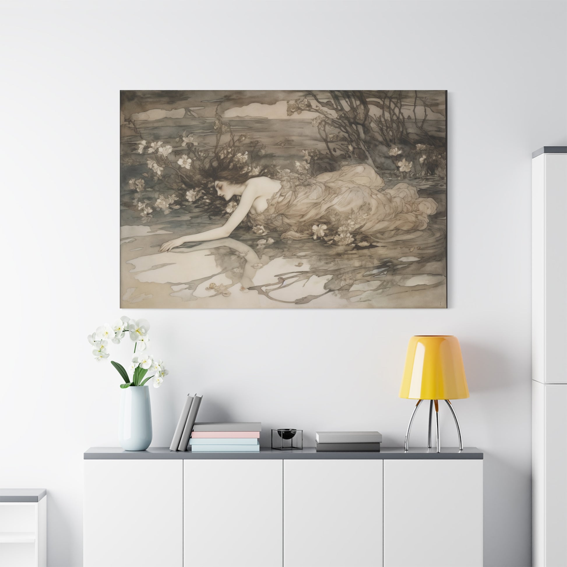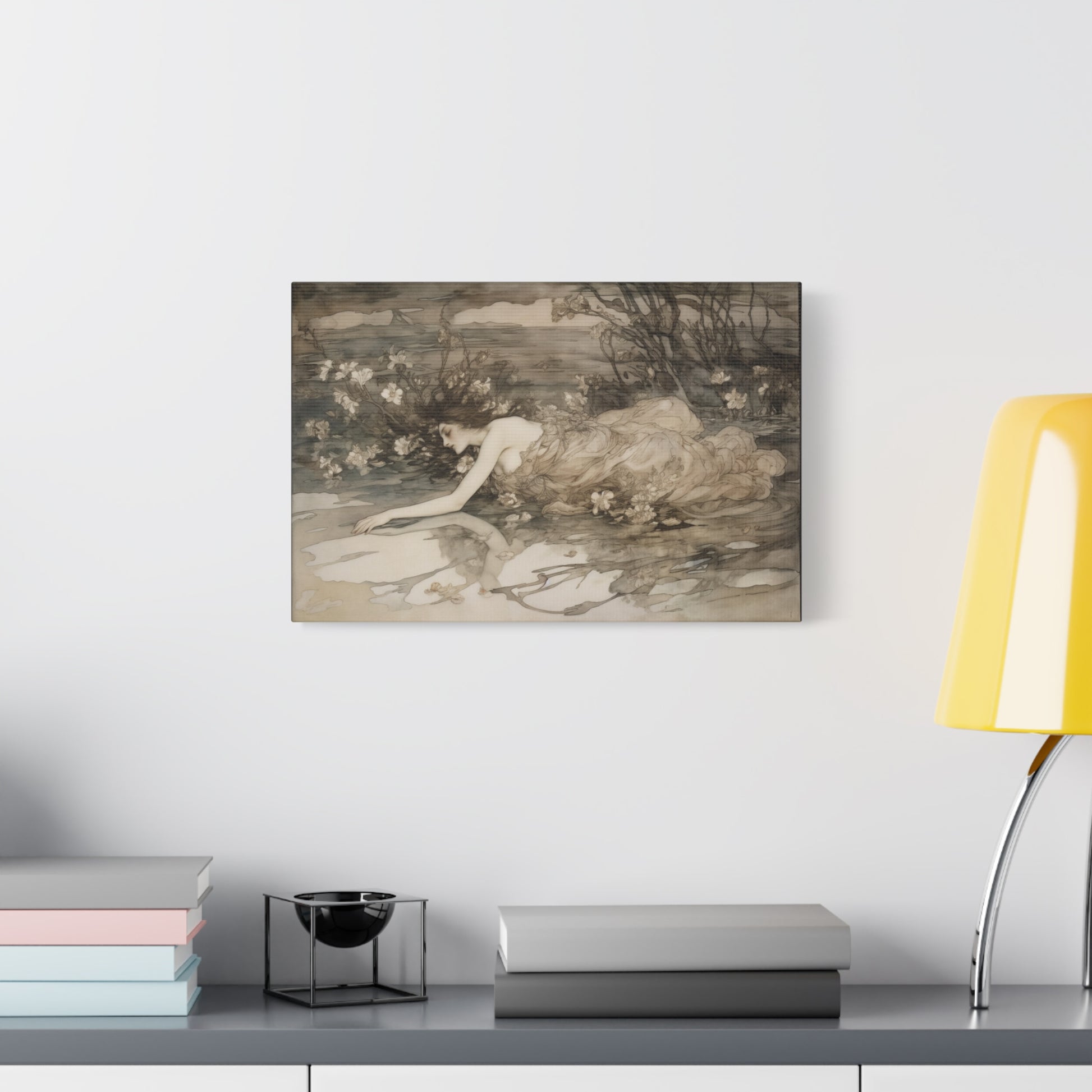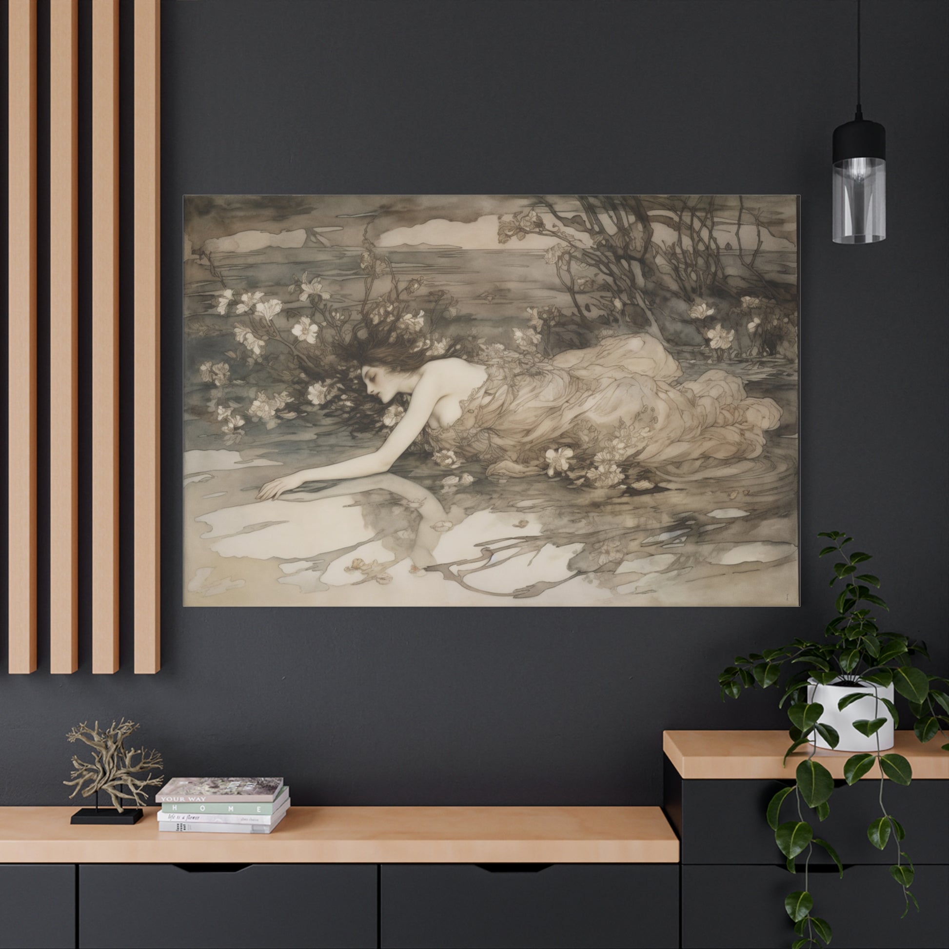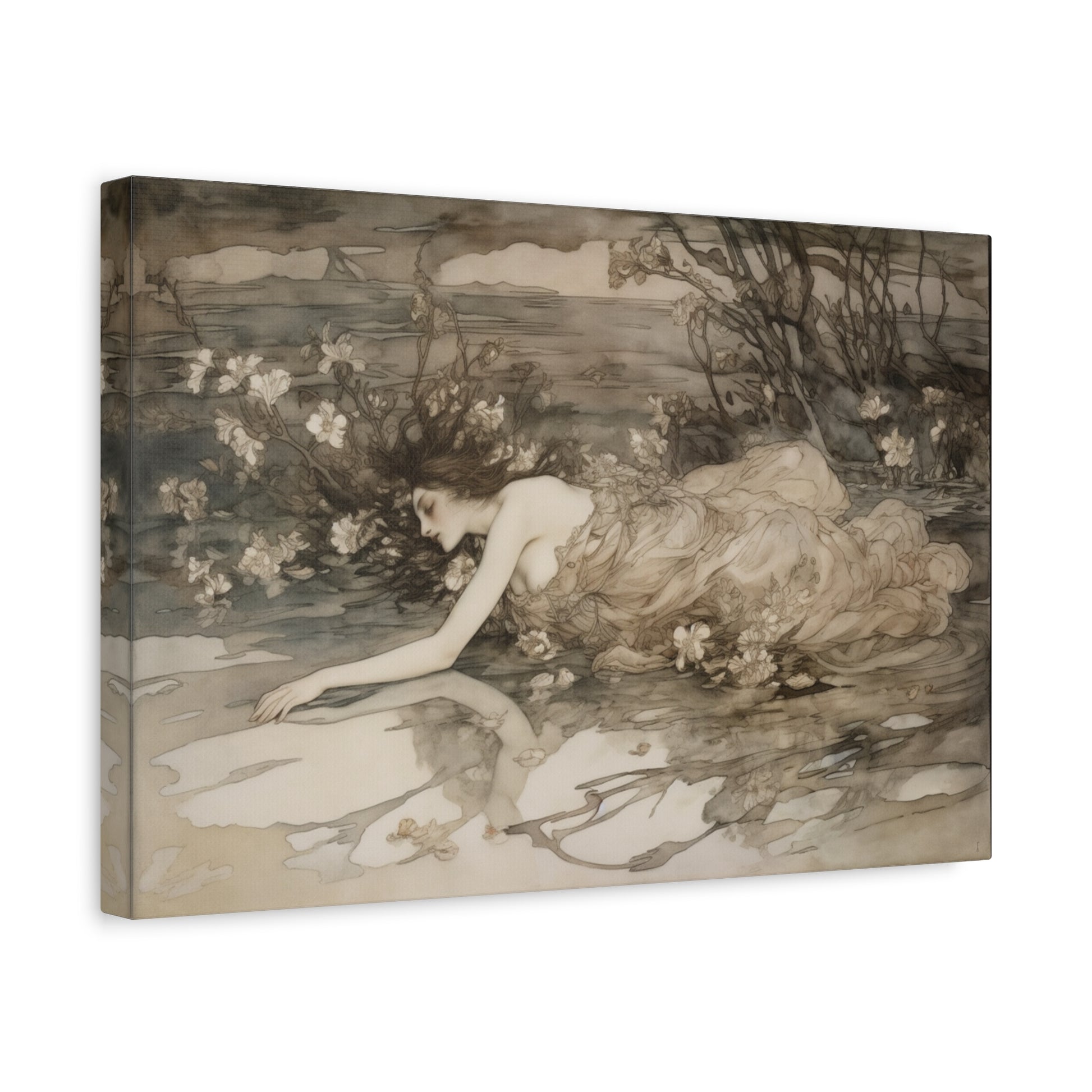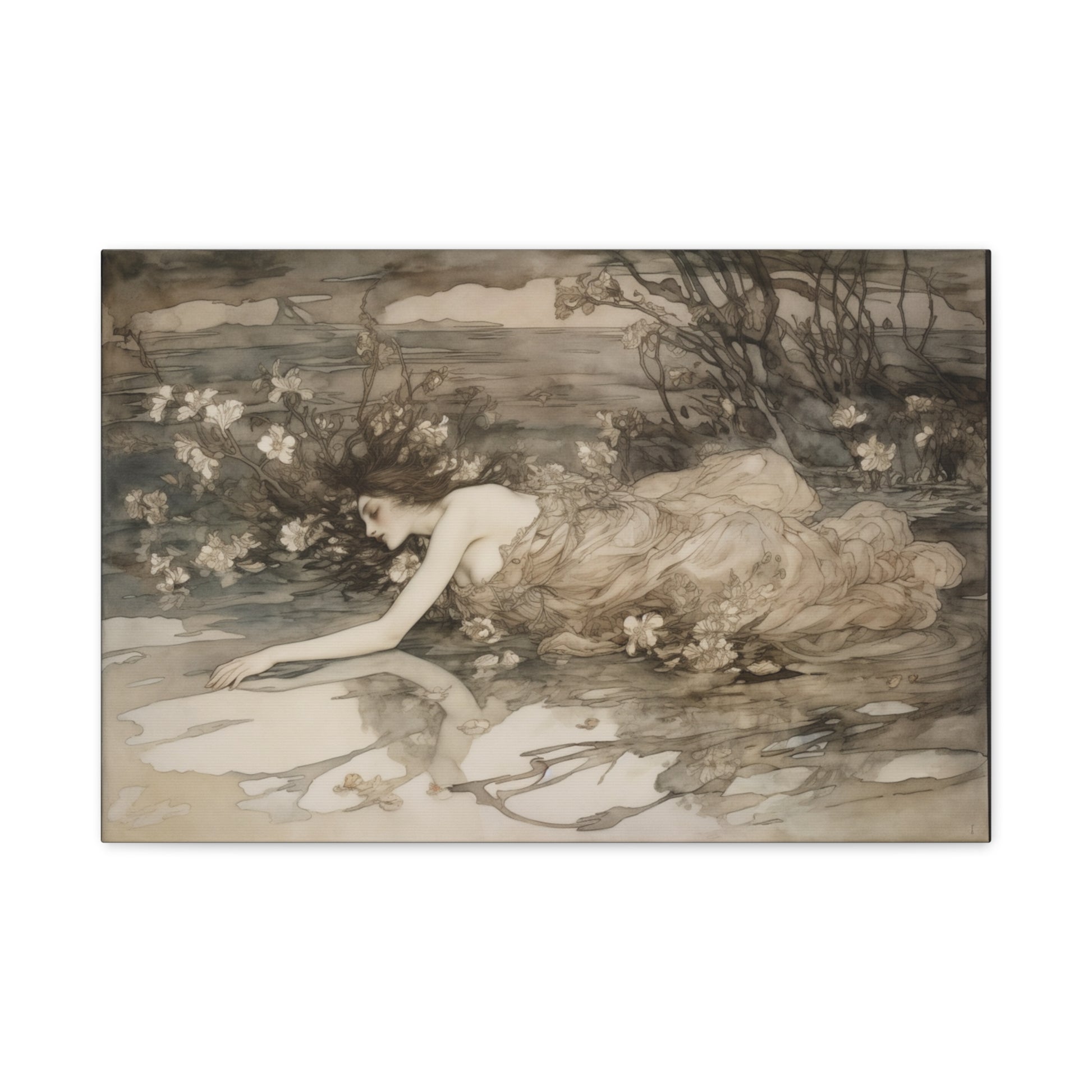 A serene figure drifts in a delicate embrace with nature, her form entwined with whispering shadows and soft blossoms. The tranquil waters mirror unspoken dreams, inviting a gentle introspection beneath the twilight’s tender gaze.