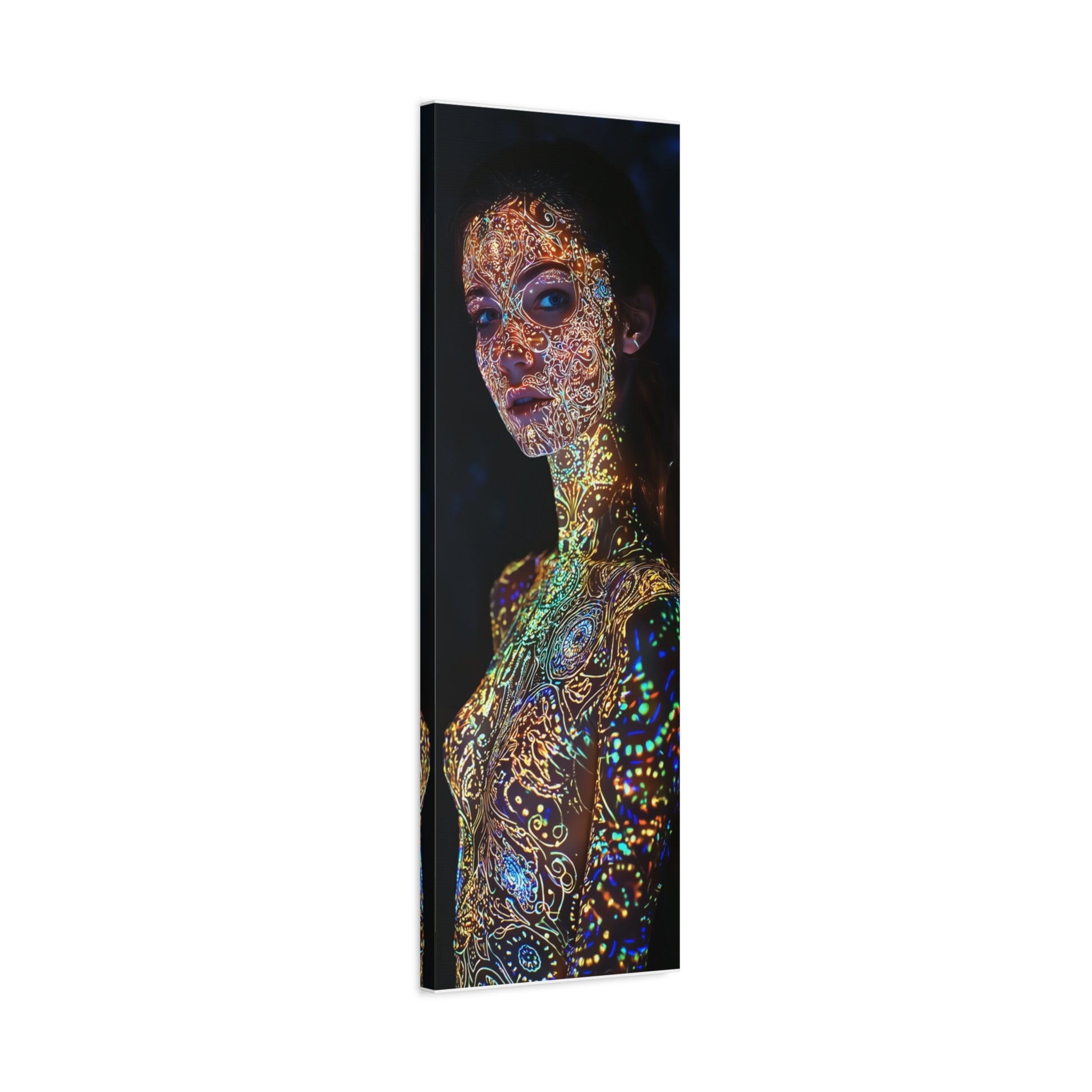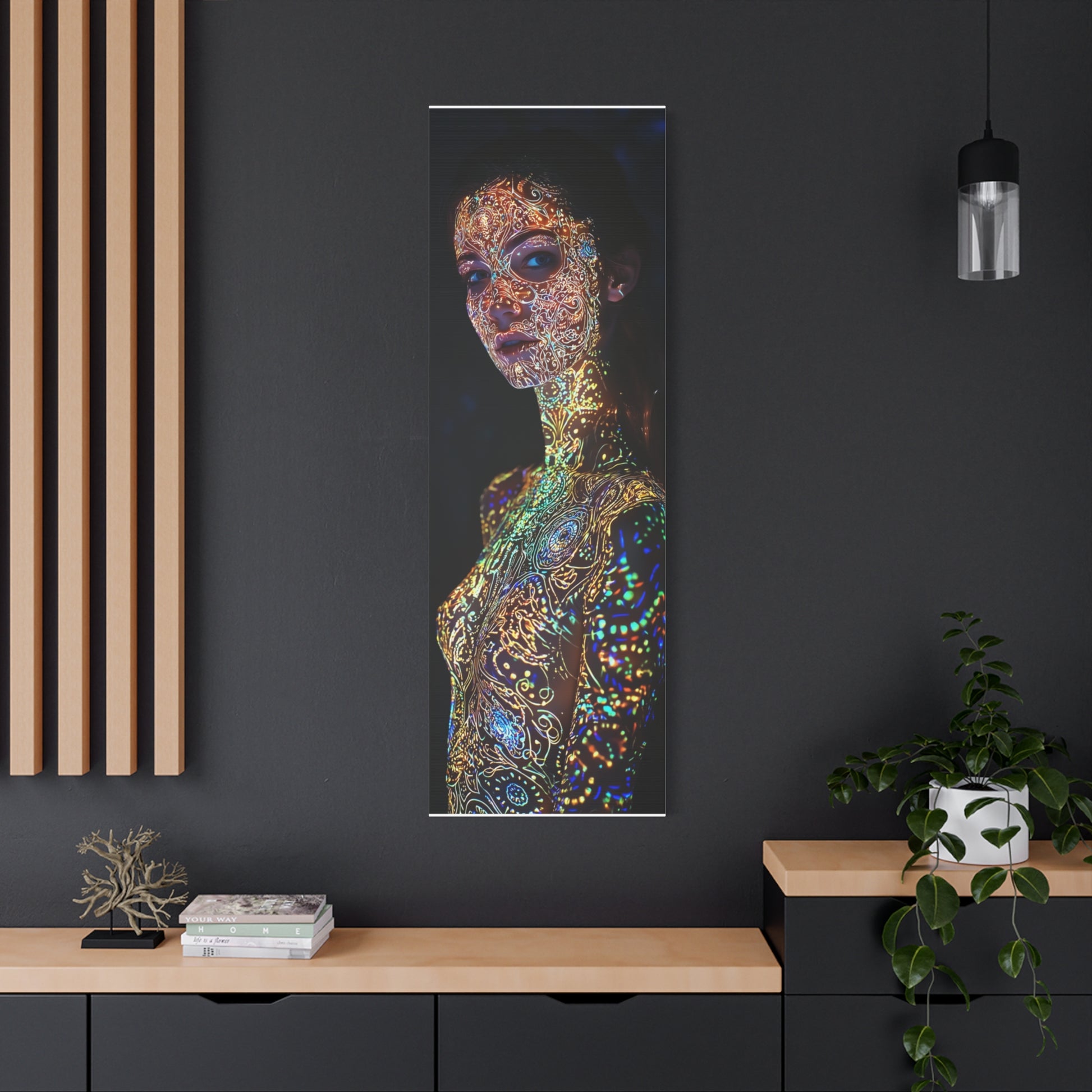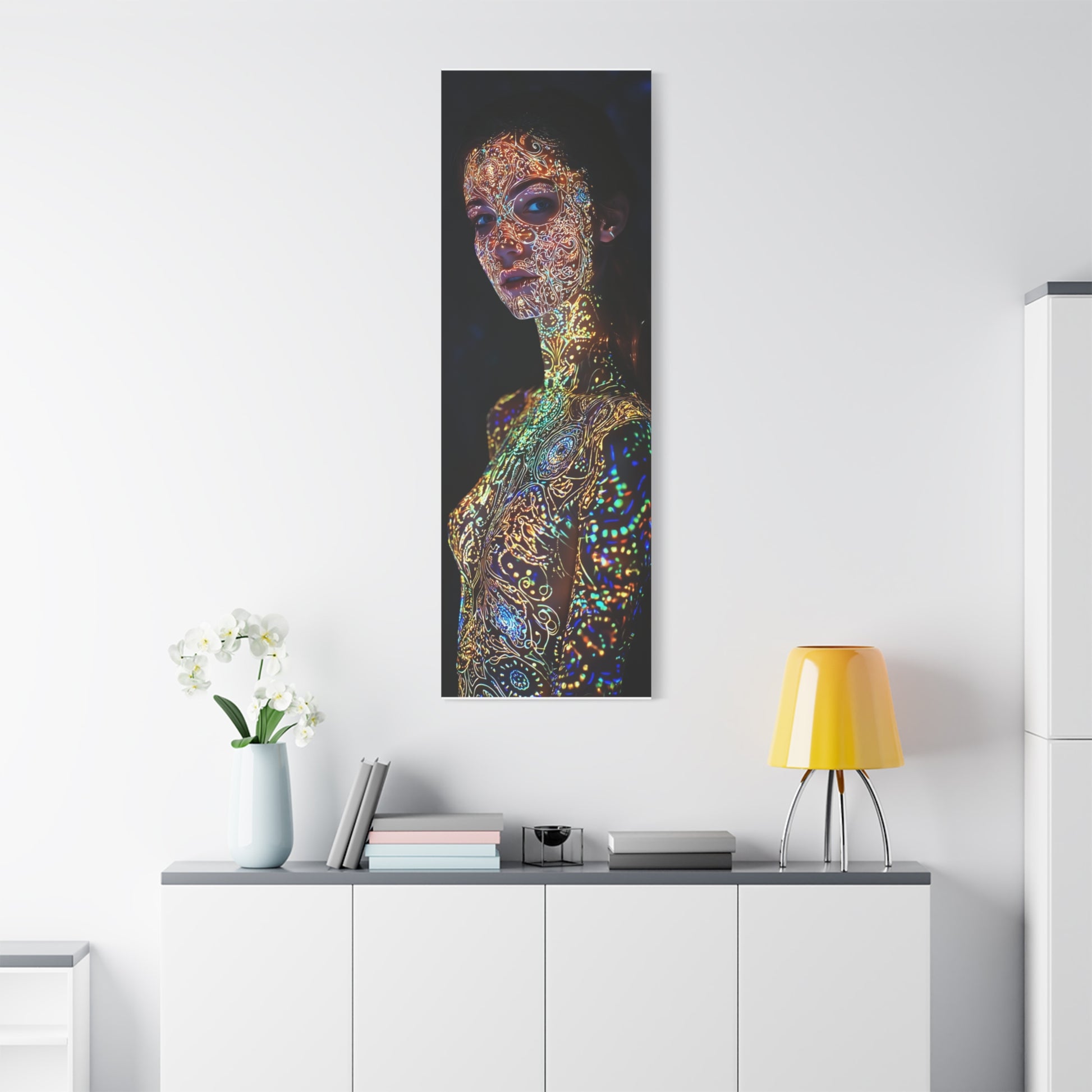 A tapestry of light dances across the skin, whispering tales of ancient constellations and forgotten dreams. The interplay of shadows and brilliance invites the soul to wander through realms of mystery and wonder.