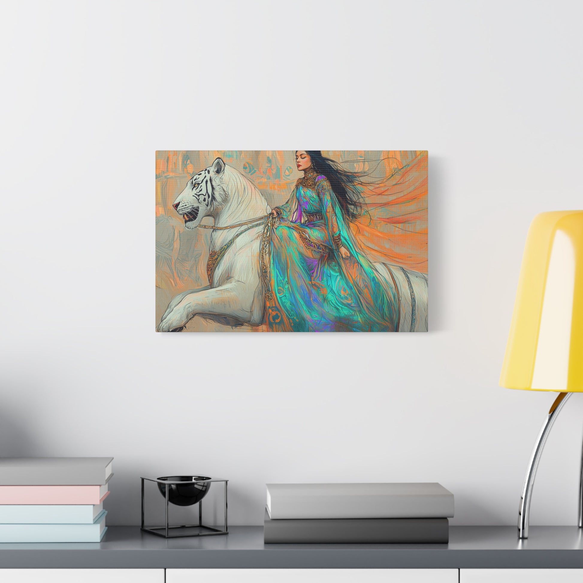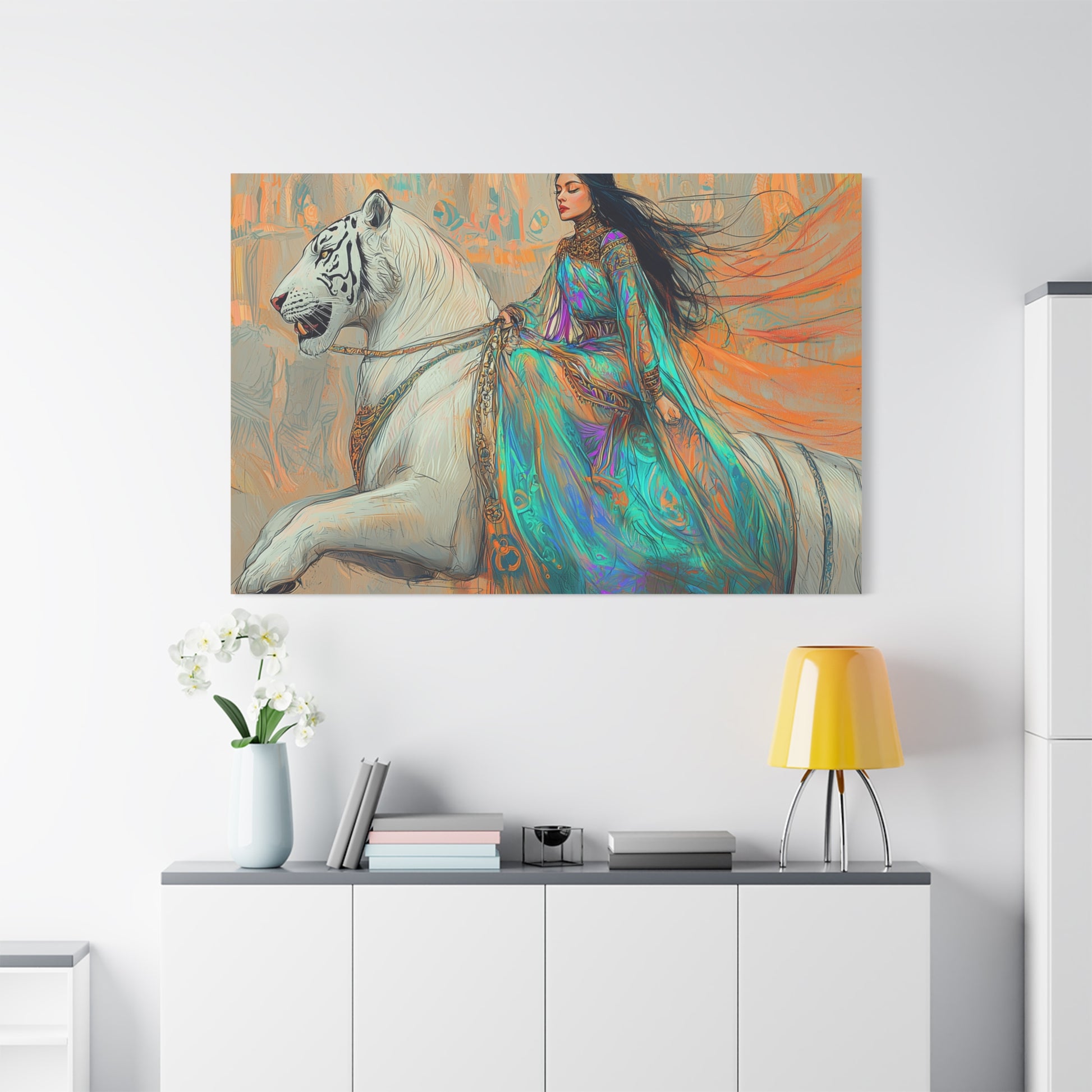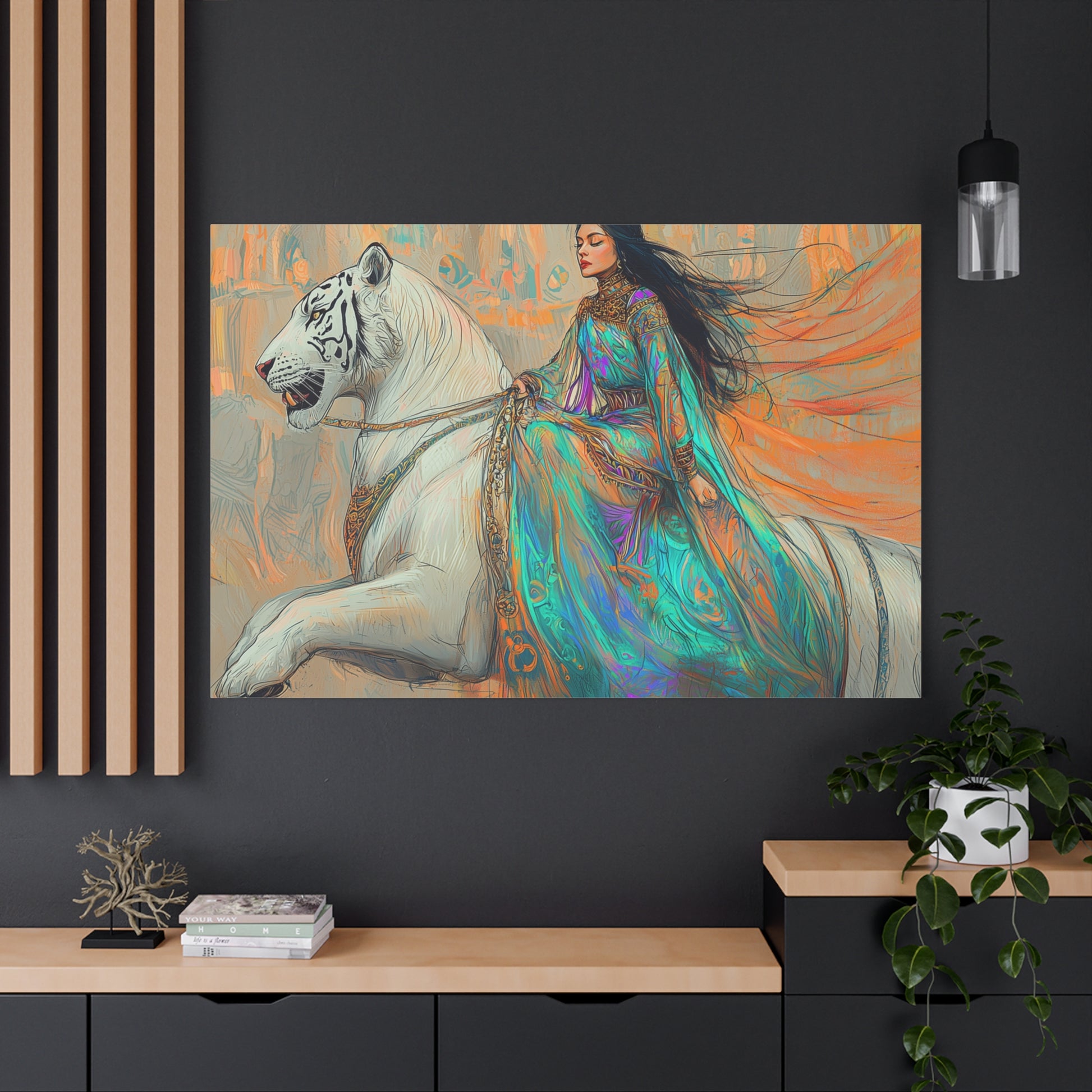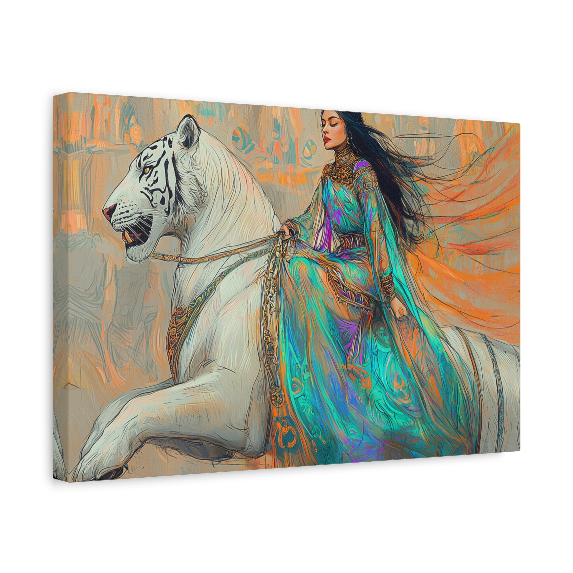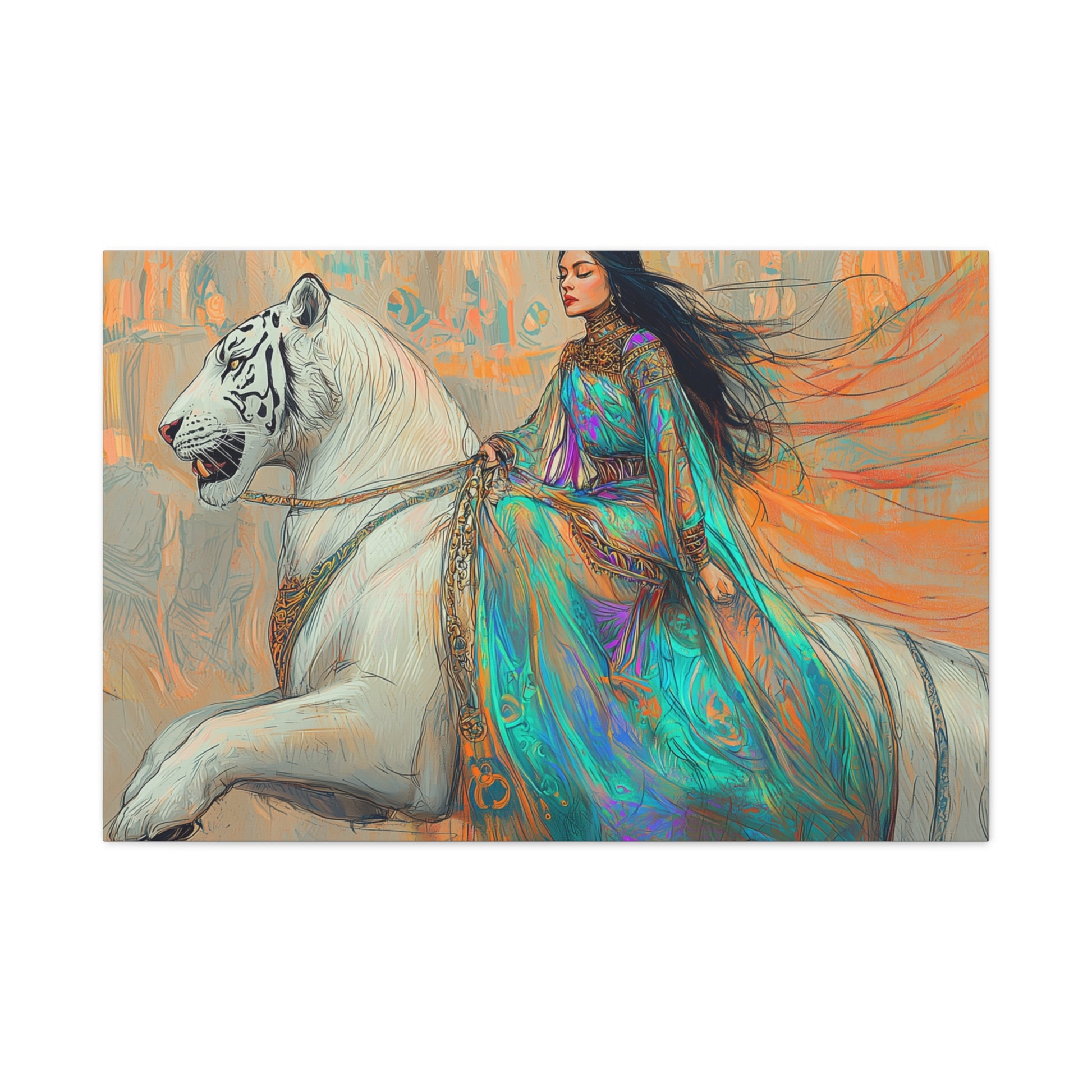 In a realm where dreams entwine with reality, a regal figure rides a spectral beast through the tapestry of twilight. Colors ripple like whispered secrets, illuminating an ancient bond between spirit and earth.