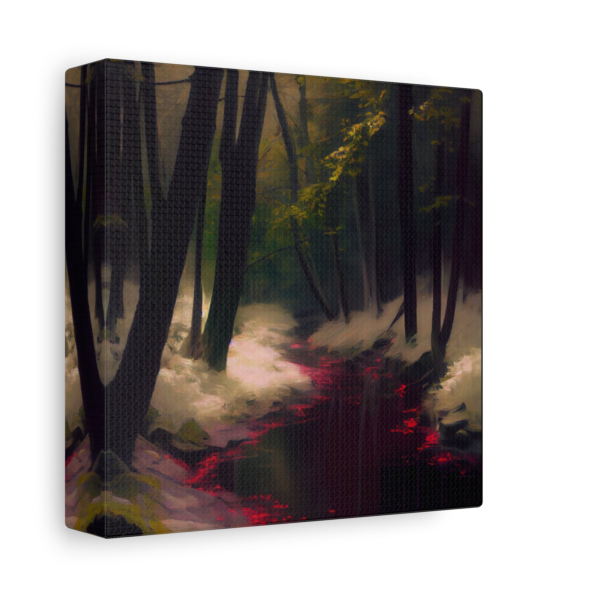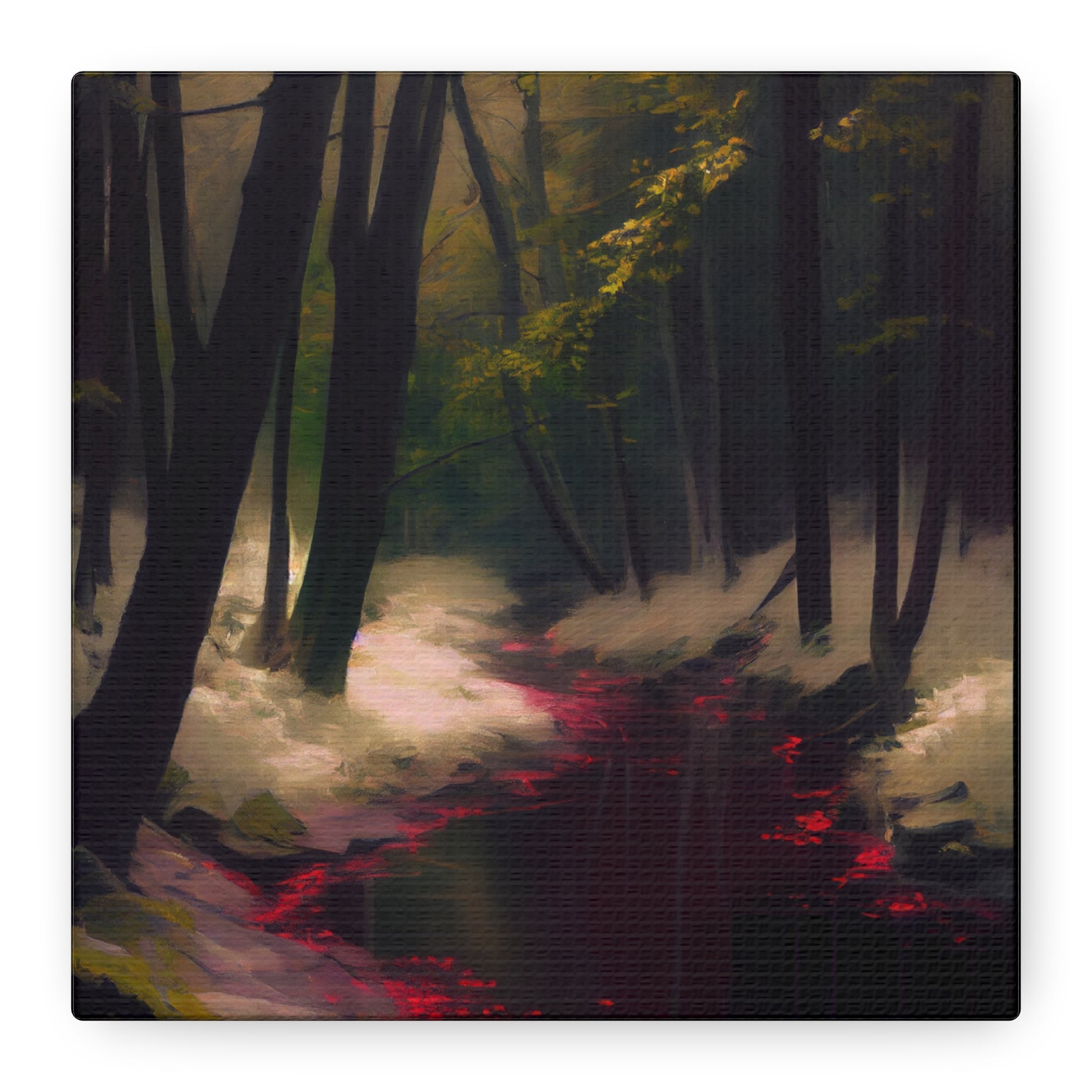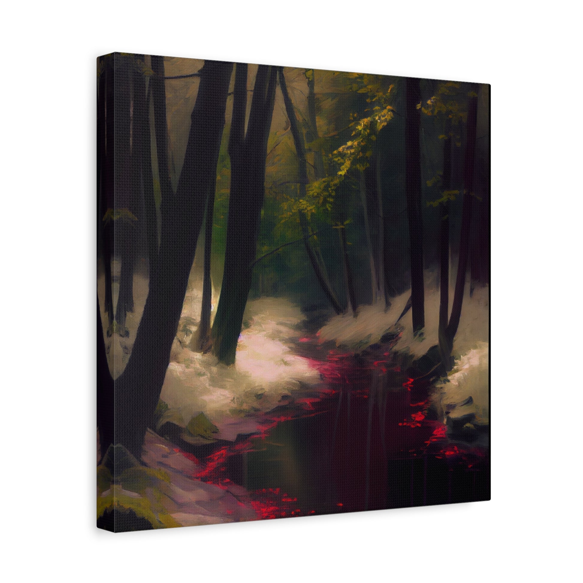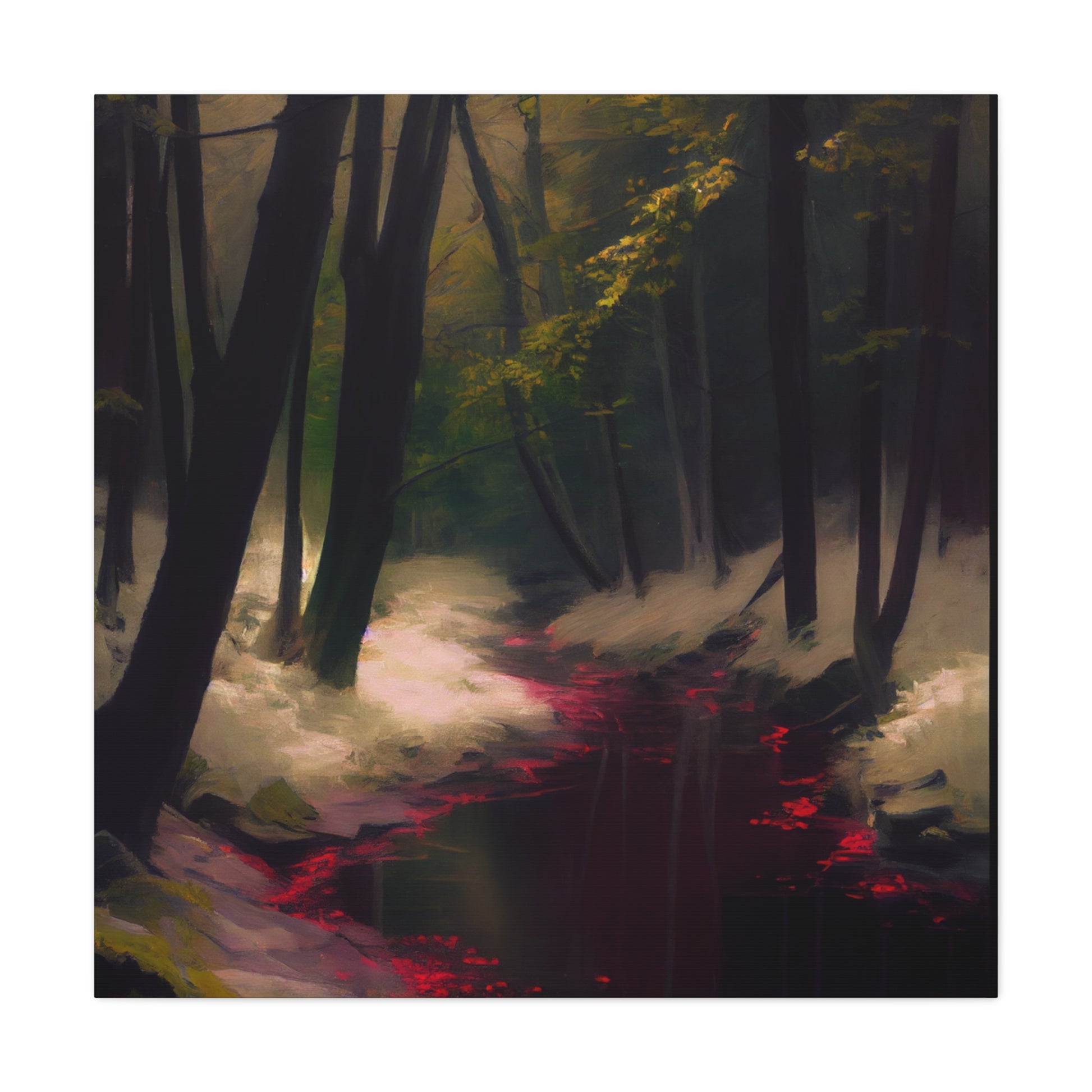 In this shadowed grove, a crimson river winds through whispered secrets of old. The interplay of light and darkness evokes a haunting serenity, drawing the viewer into a world where time stands still.