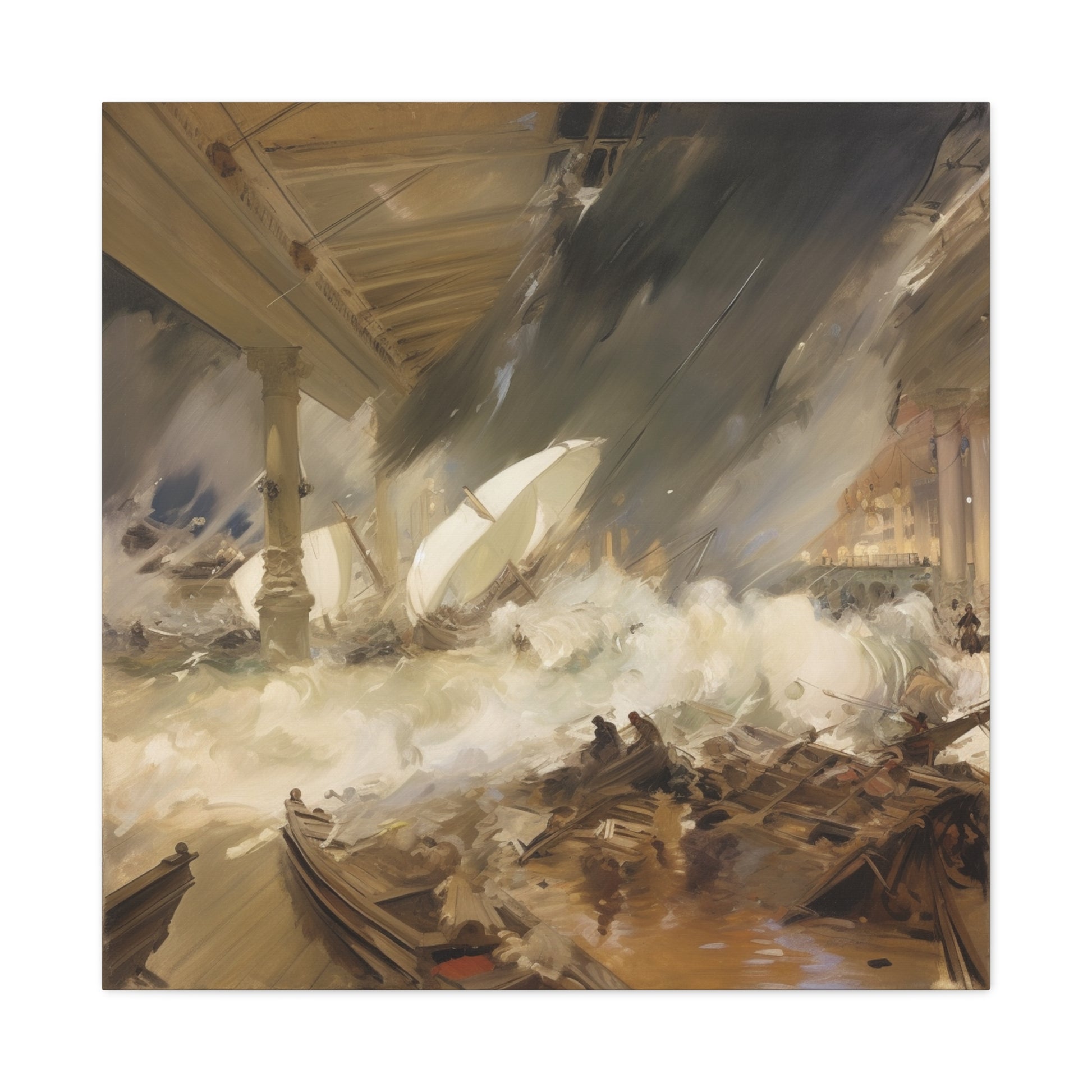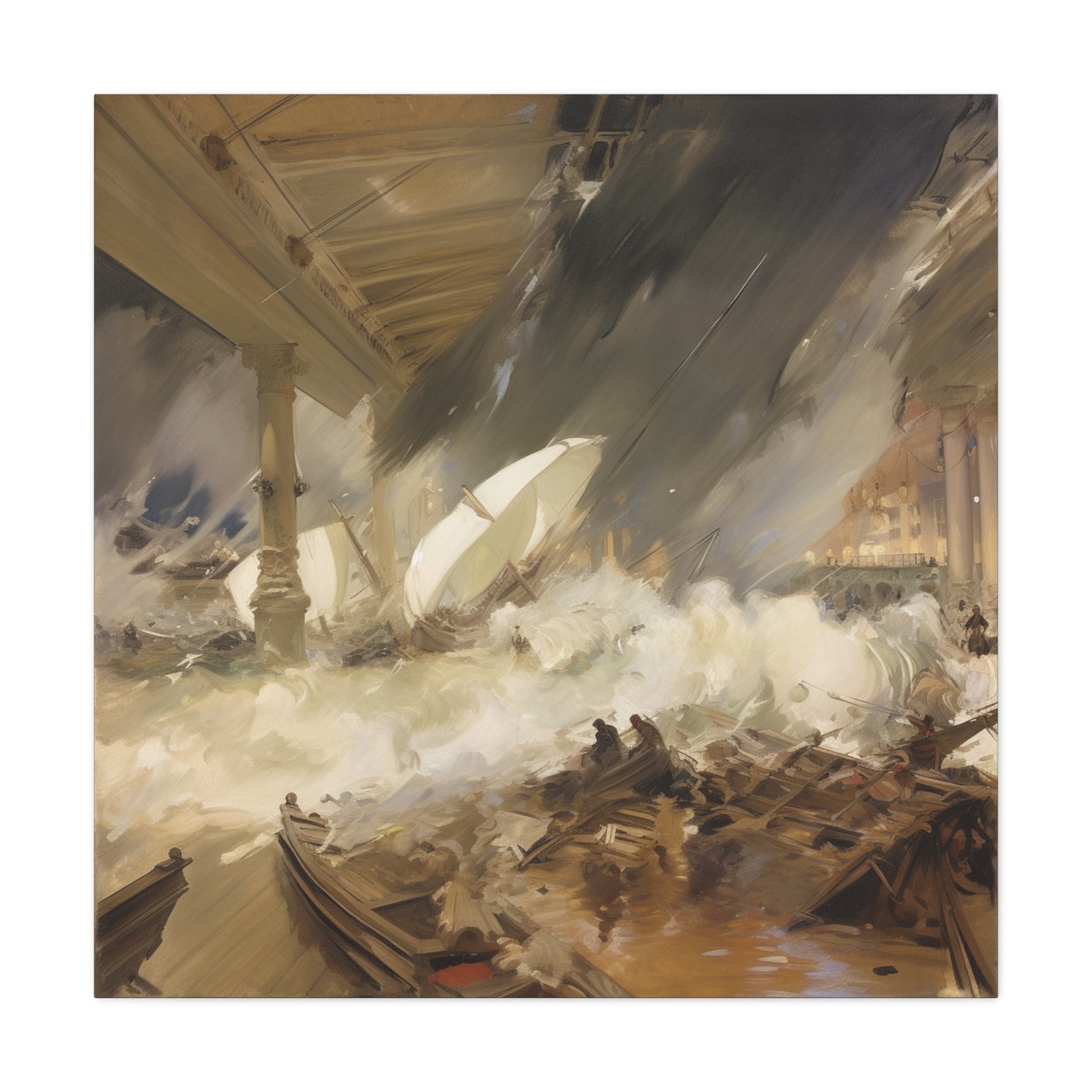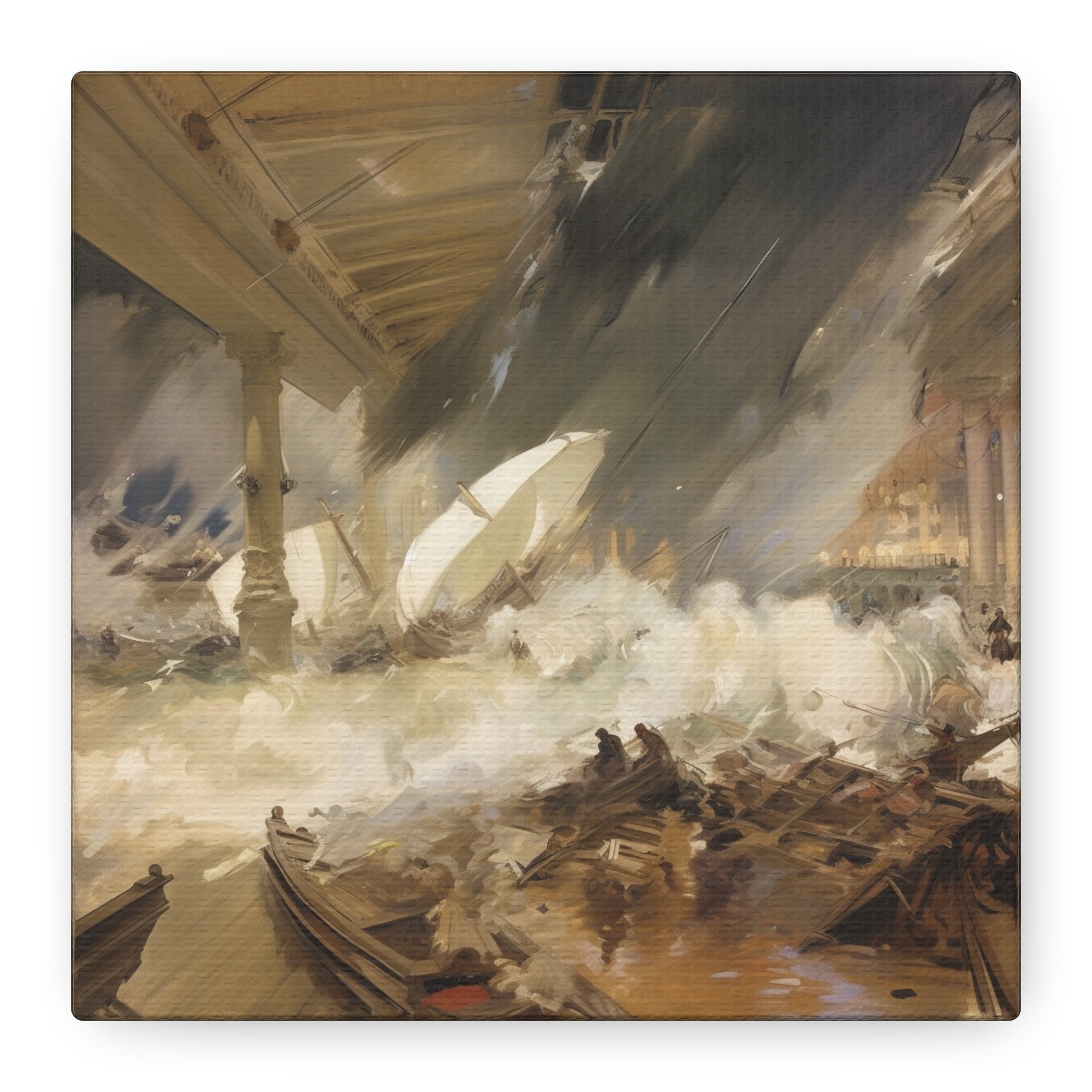 Amidst the swirling chaos of wind and wave, a fierce struggle unfolds beneath a celestial canopy. Boats grapple with nature’s fury, their sails straining against the storm's relentless dance, echoing the eternal clash of sea and sky.